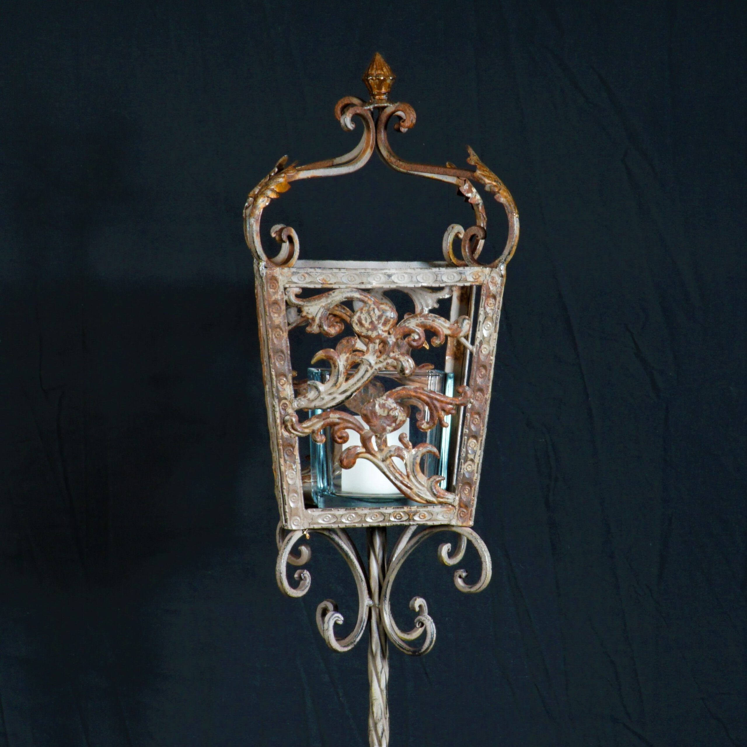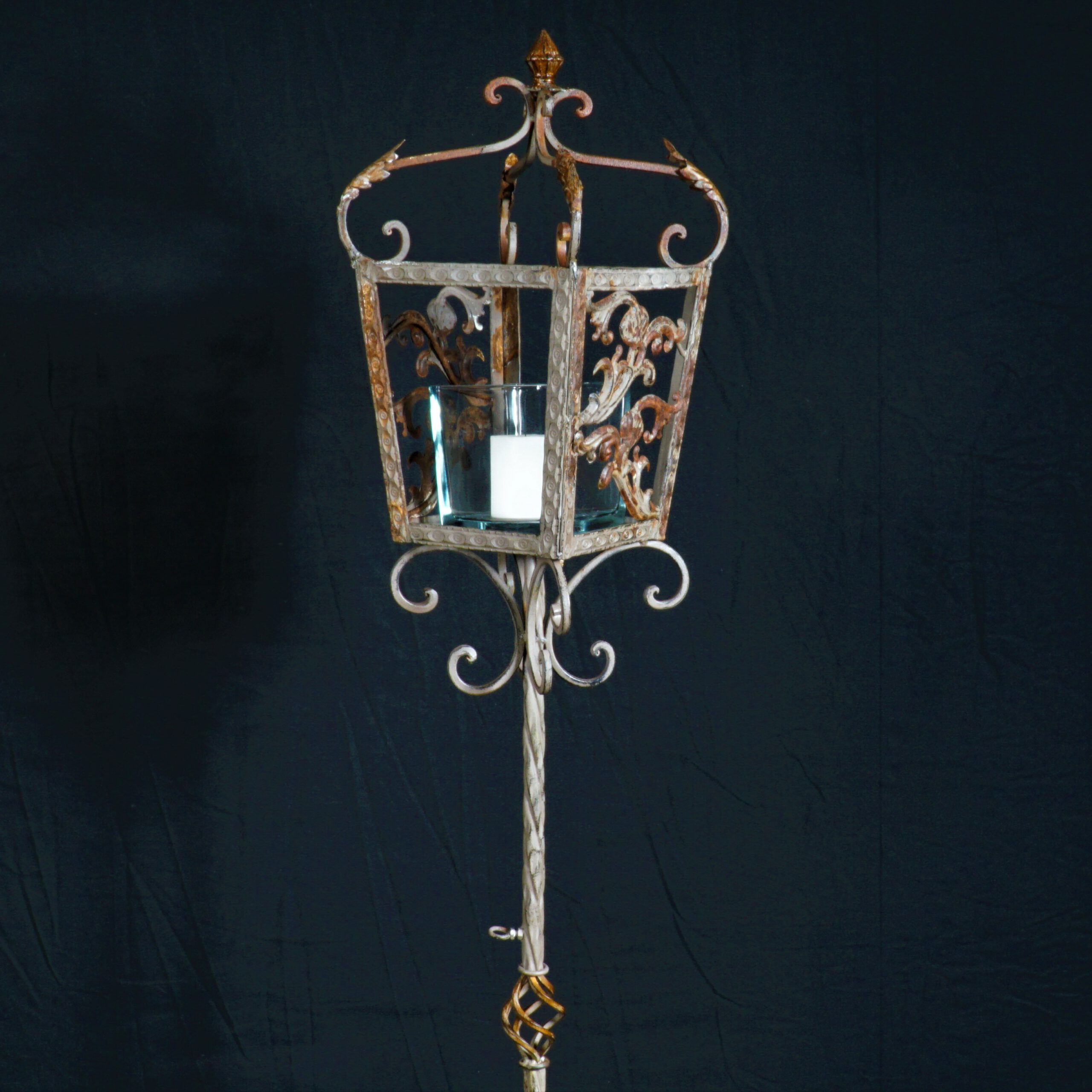 Wat een bijzondere eye-catchers! Deze oude metalen lantarenpalen zijn afkomstig uit Frankrijk. De windlichten zijn niet origineel, maar staan wel prachtig in de lantarens.