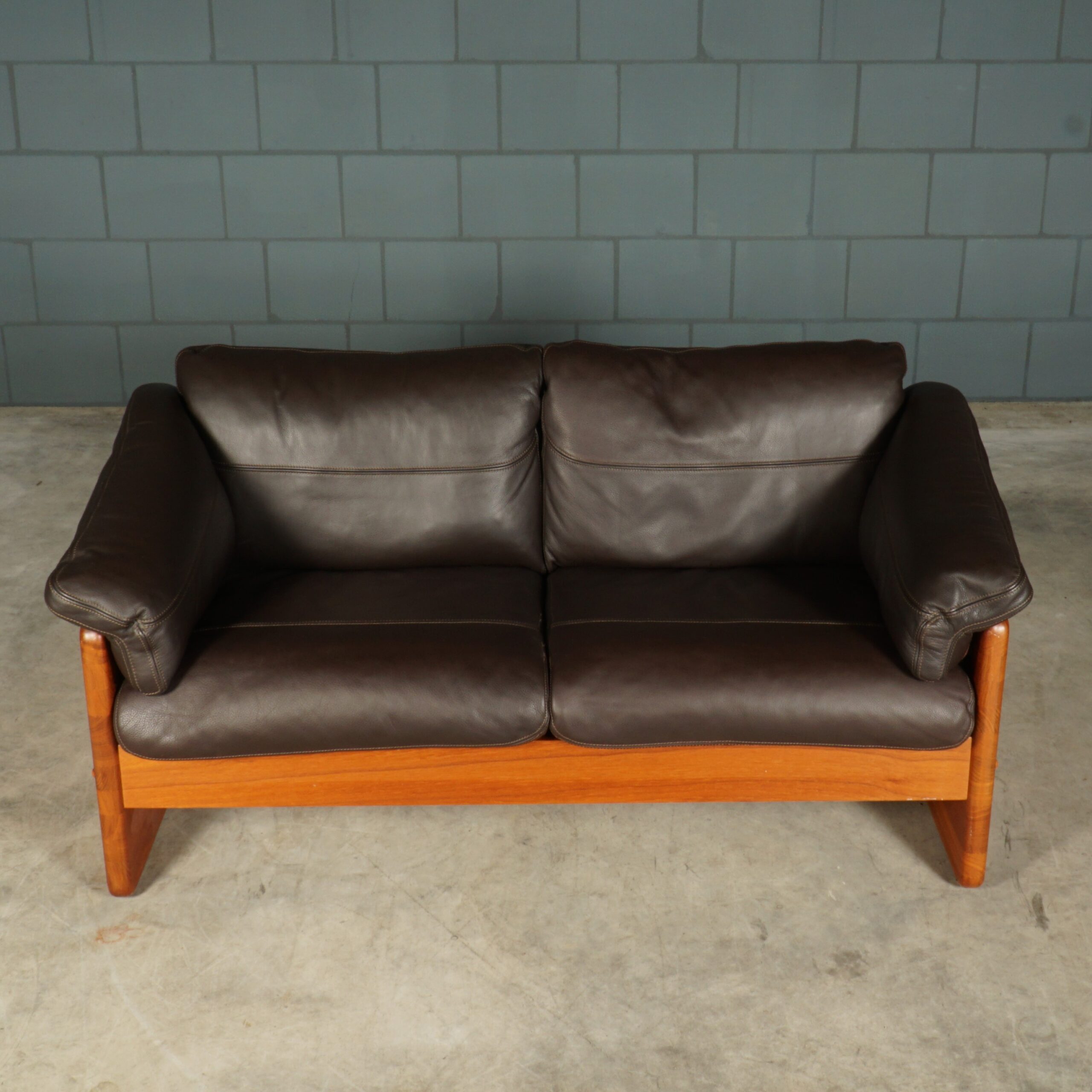 Deze prachtige bank is van de Deense ontwerper Mikael Laursen en dateert uit de jaren 60. Dit klassieke design heeft een hoogwaardig frame van massief teakhout met opvallende donkerbruin lederen bekleding. Een volmaakt ontwerp met perfecte proporties, aandacht voor detail en hoogwaardige afwerking met gebruik van eersteklas materialen. Echt een plaatje voor zowel in een vintage als in een modern interieur. De bank is demontabel. Zowel het hout al het leer in uitmuntende staat!