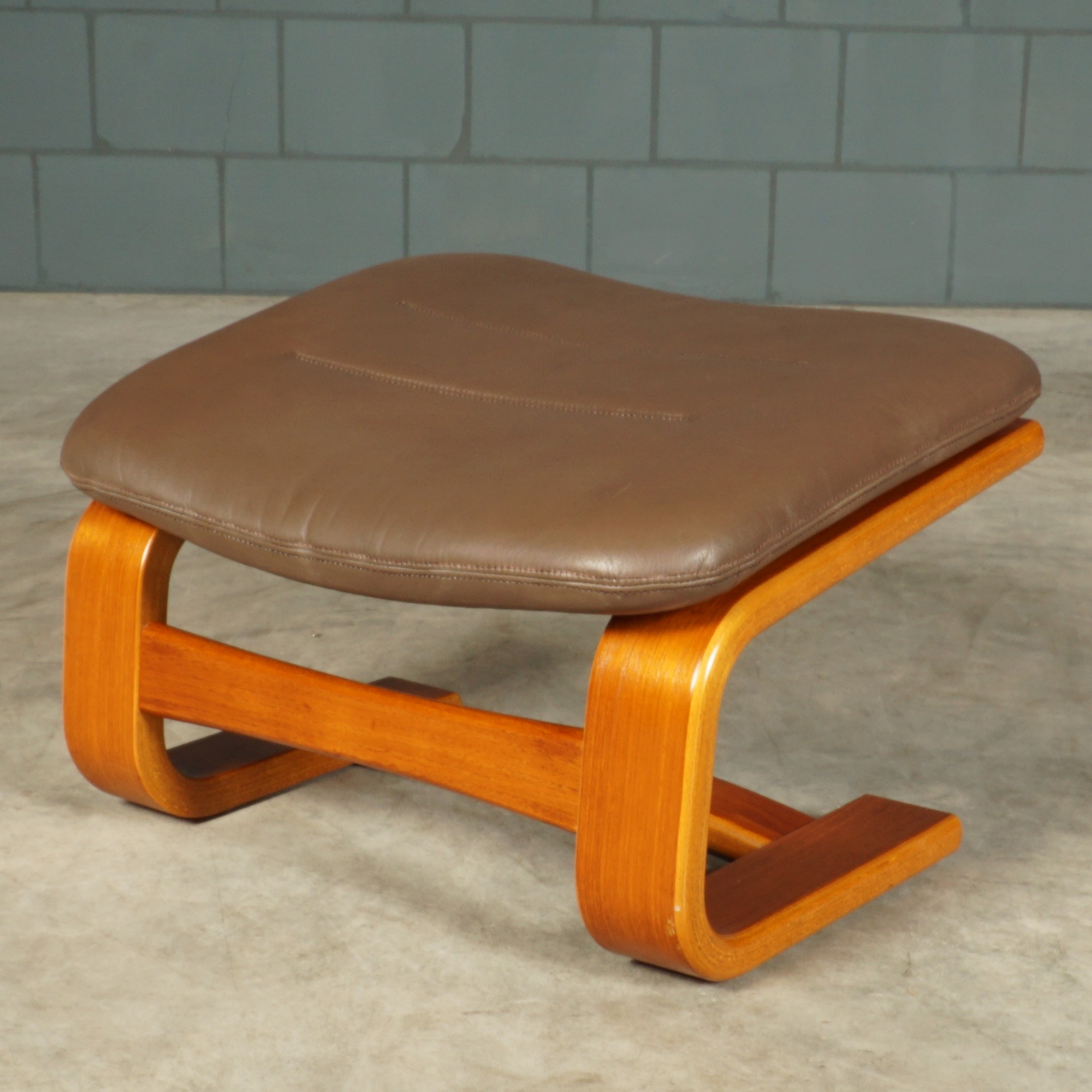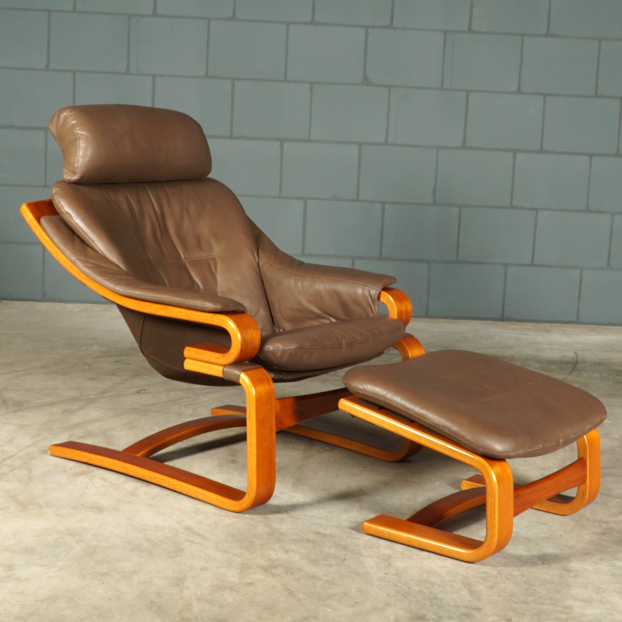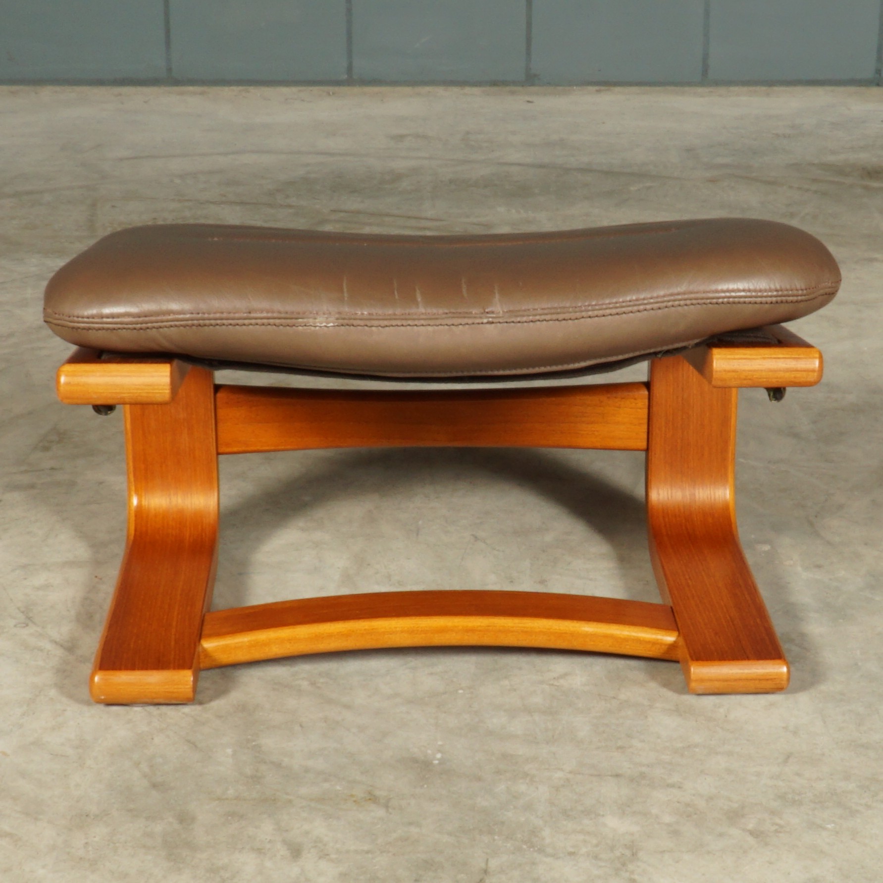 Dit zeer fraaie setje van een Deense fauteuil met hocker dateert uit de jaren 70. De fauteuil model ‘Apollo’ is ontworpen door de Deense designer Svend Skipper voor Skipper Møbler A/S Durup. De fauteuil heeft een prachtig gebogen teakhouten frame met een canvas zitkuip en taupe/bruin lederen kussens. Niet alleen een plaatje om te zien maar ook een heel hoog zitcomfort met een lichte vering en een heerlijke hoofdsteun en voetsteun erbij. De fauteuil en hocker zijn in uitmuntende staat met amper sporen van gebruik. Het leer is nog mooi soepel en in rijke staat en de houten frames zijn nagenoeg zonder krassen. Merklabel is aanwezig.