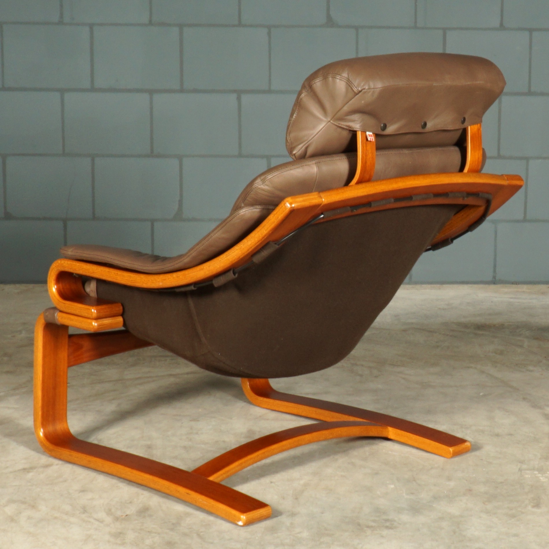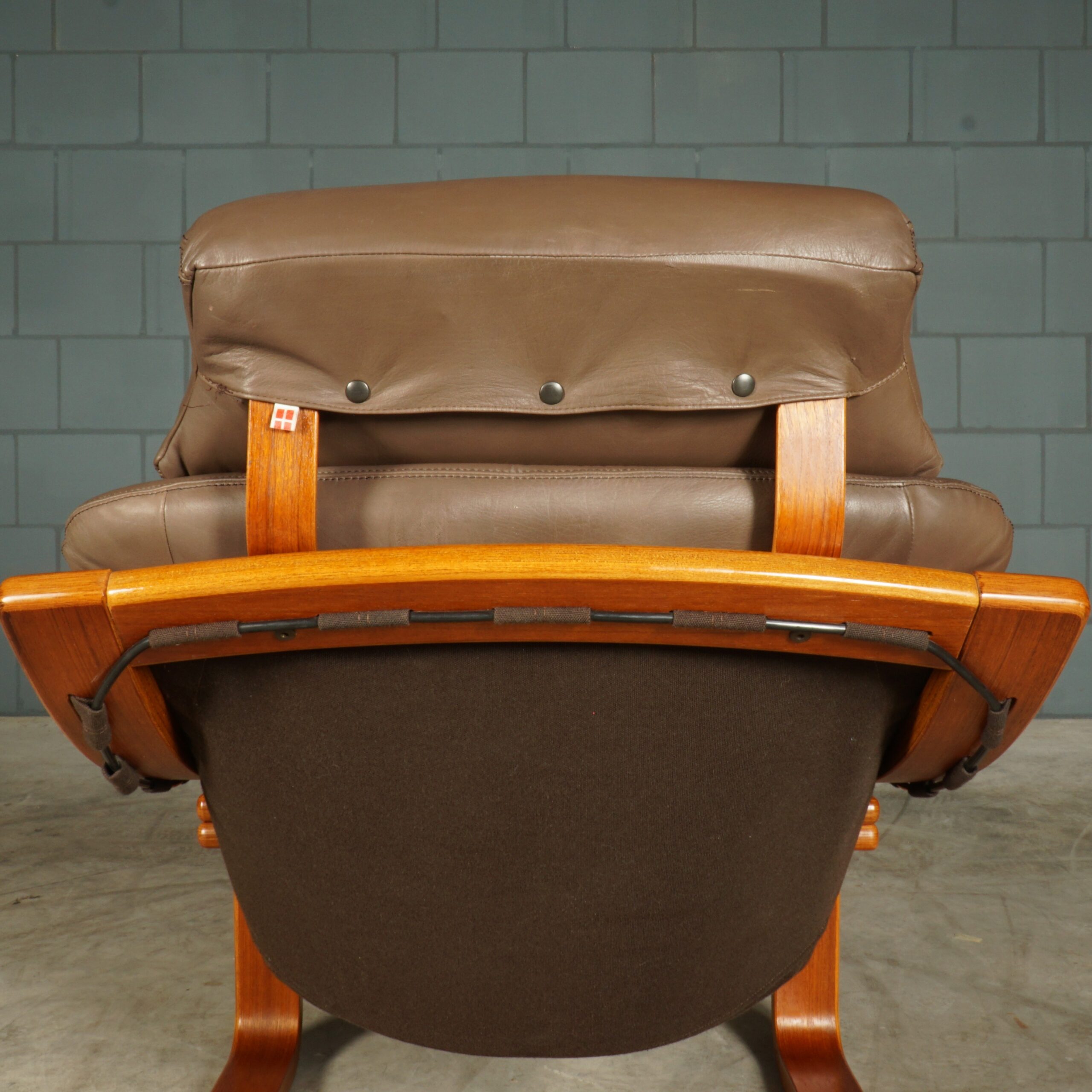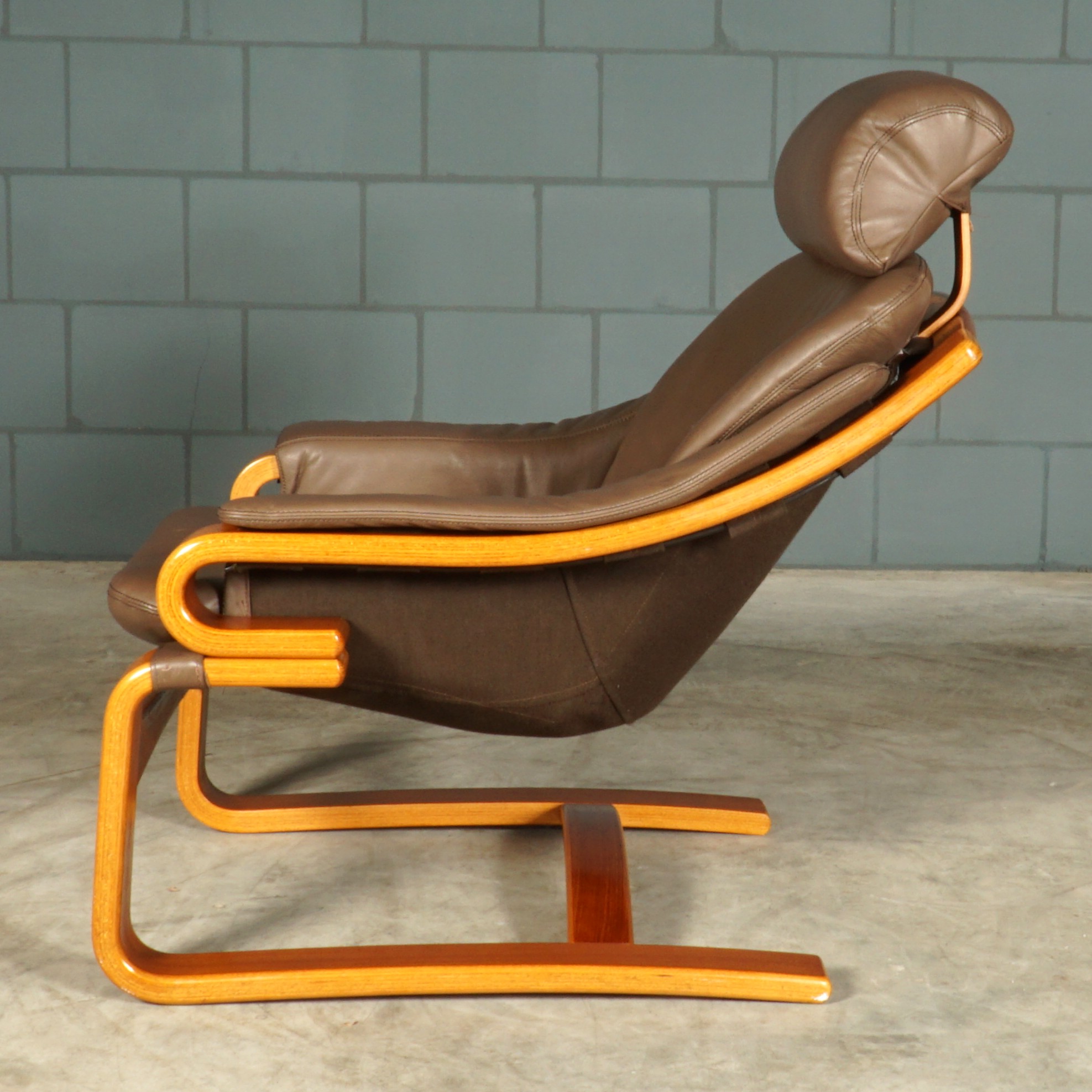 Dit zeer fraaie setje van een Deense fauteuil met hocker dateert uit de jaren 70. De fauteuil model ‘Apollo’ is ontworpen door de Deense designer Svend Skipper voor Skipper Møbler A/S Durup. De fauteuil heeft een prachtig gebogen teakhouten frame met een canvas zitkuip en taupe/bruin lederen kussens. Niet alleen een plaatje om te zien maar ook een heel hoog zitcomfort met een lichte vering en een heerlijke hoofdsteun en voetsteun erbij. De fauteuil en hocker zijn in uitmuntende staat met amper sporen van gebruik. Het leer is nog mooi soepel en in rijke staat en de houten frames zijn nagenoeg zonder krassen. Merklabel is aanwezig.