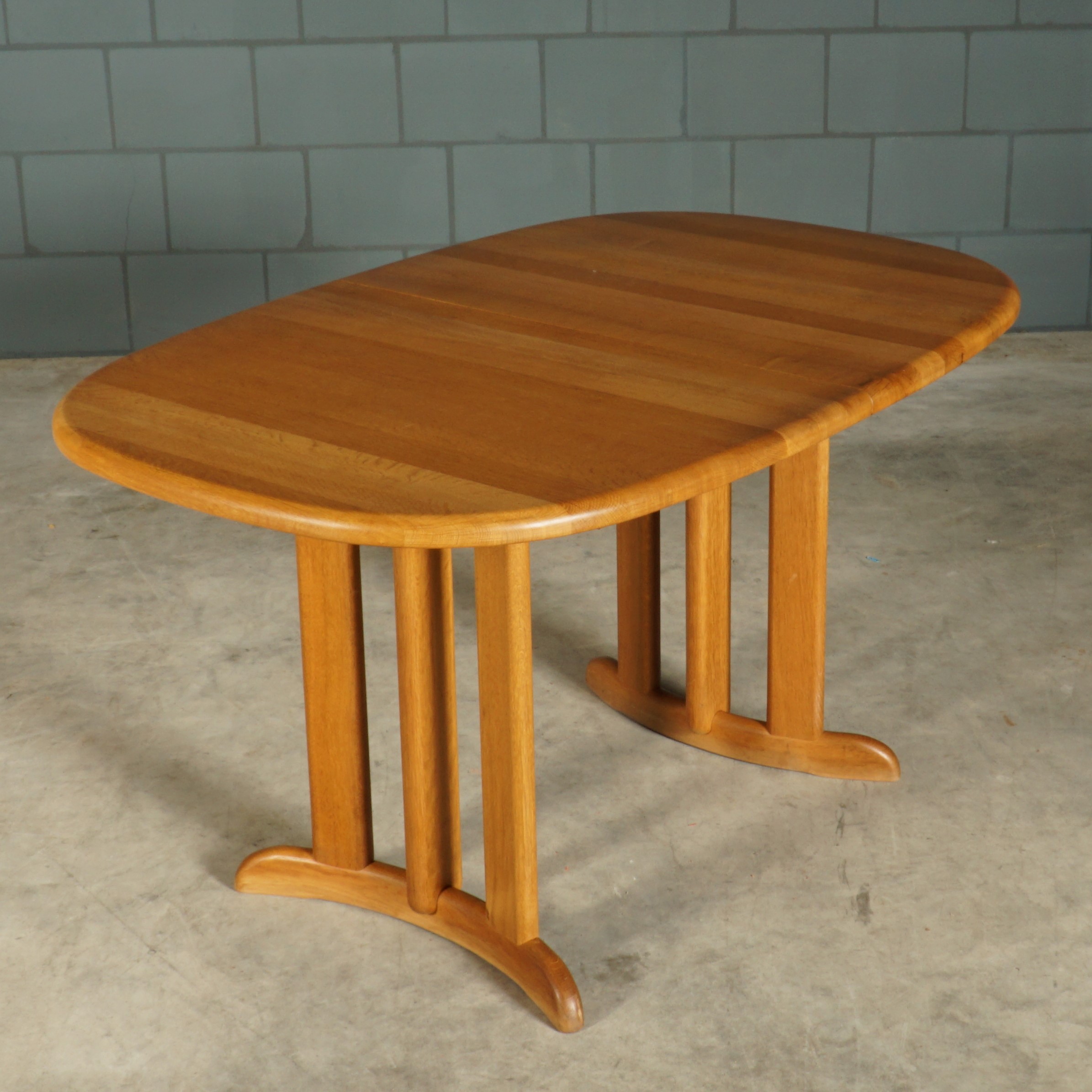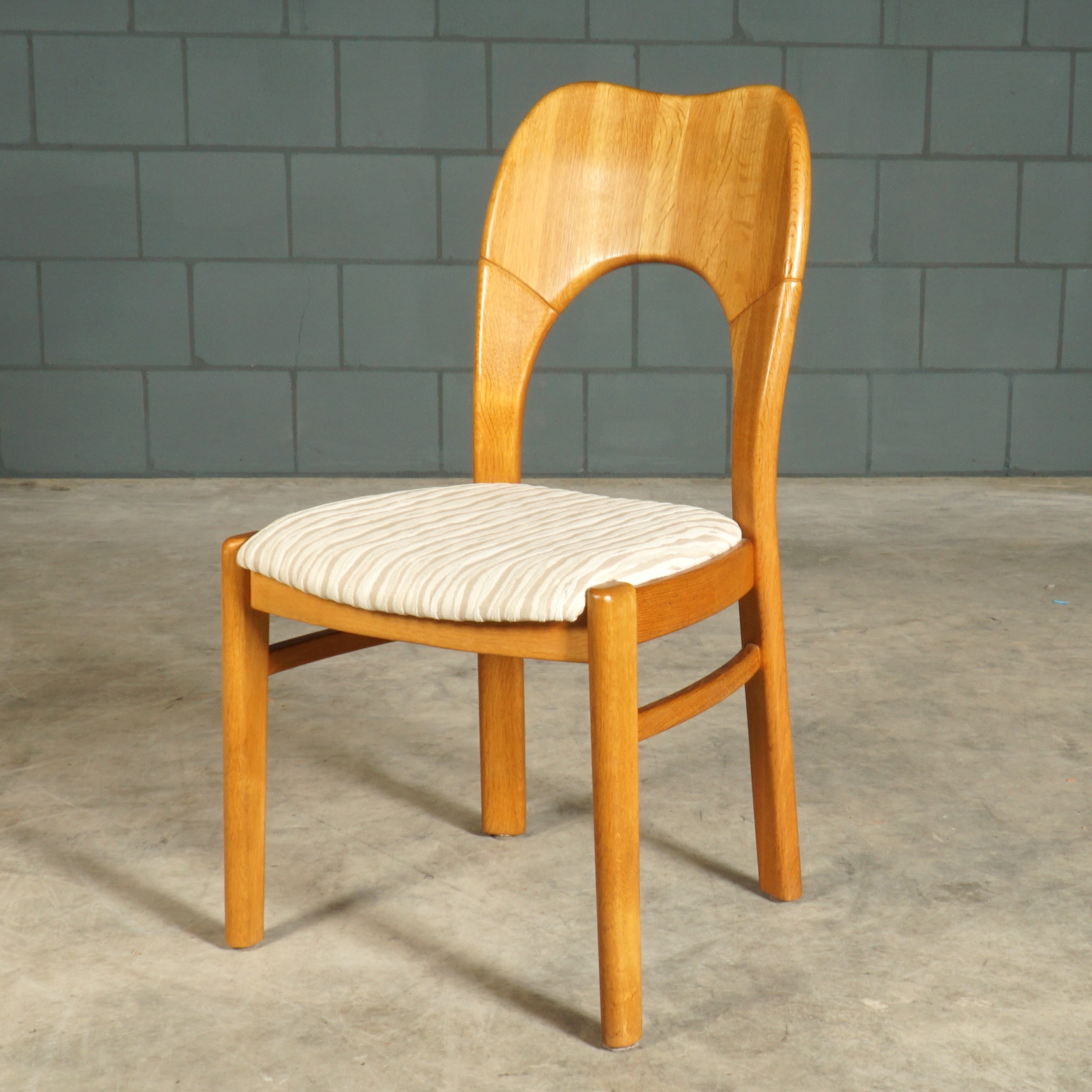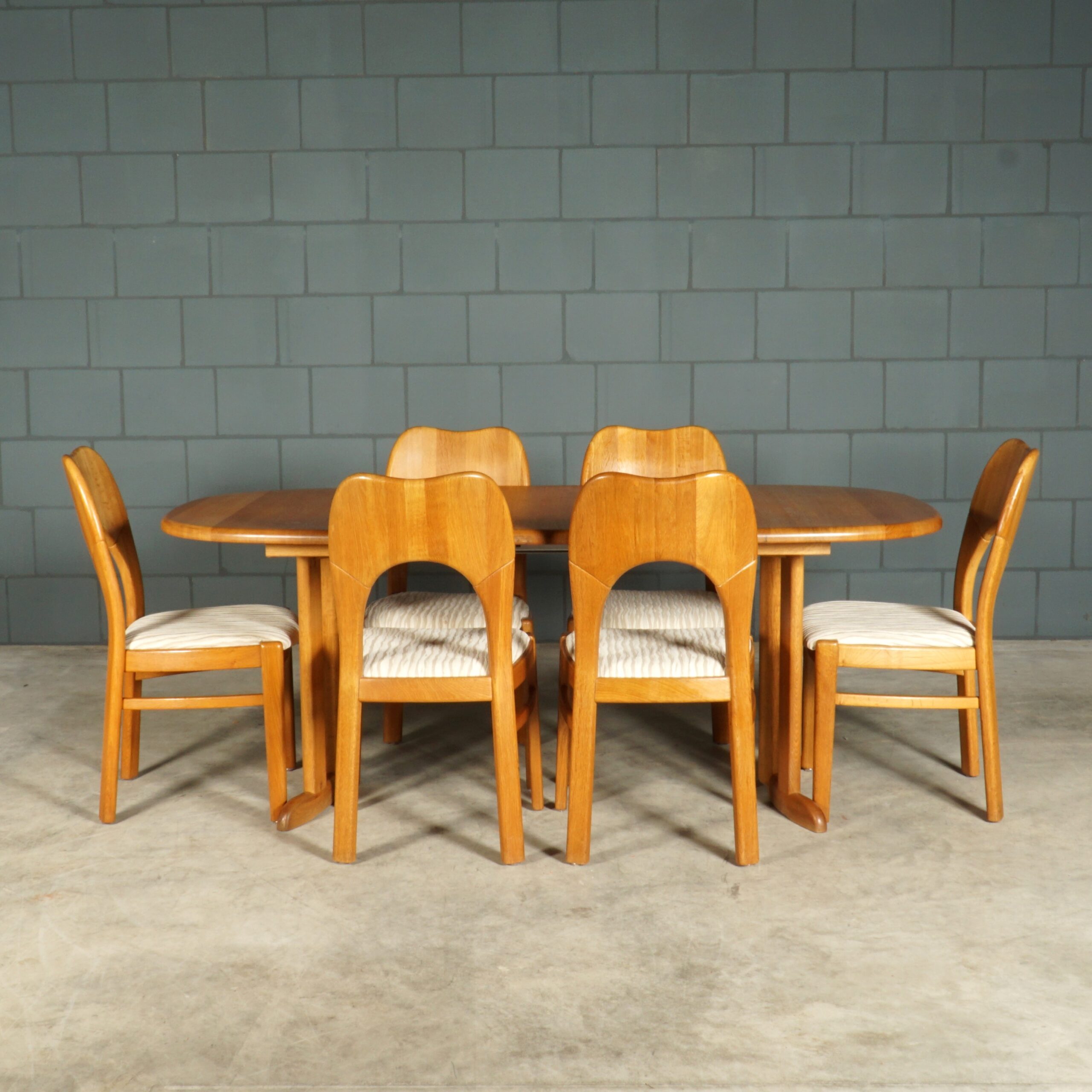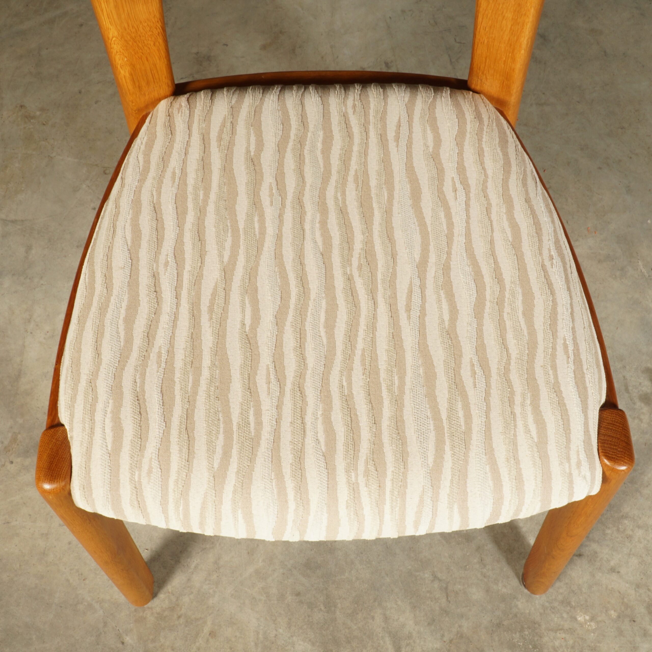 Deze geweldige eetkamerset is een jaren 60 design in de stijl van de Deense ontwerper Niels Koefoed voor Koefoeds Hornslet Mobelfabrik. De set bestaat uit een massief eikenhouten uitschuifbare eettafel en zes bijpassende stoelen. De tafel heeft twee lossen inzetstukken, waardoor de tafel stapsgewijs kan worden verlengd van 140 naar 190 naar 240 cm. De eikenhouten stoelen hebben een prachtige rugleuning en zijn bekleed met een mooie kwalitatieve stof in beigetinten. Ze zijn niet alleen prachtig, maar ze zitten ook nog eens erg comfortabel. Een set waar je met gemak met 8 tot 10 personen aan kunt dineren. In uitmuntende staat, meer slechts zeer lichte gebruikssporen. Een absoluut pronkstuk voor de echte liefhebber van midcentury Deens design!