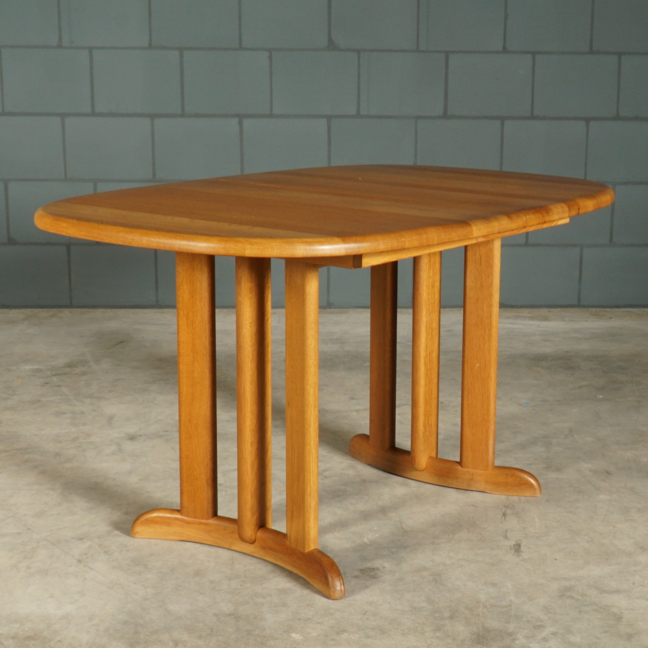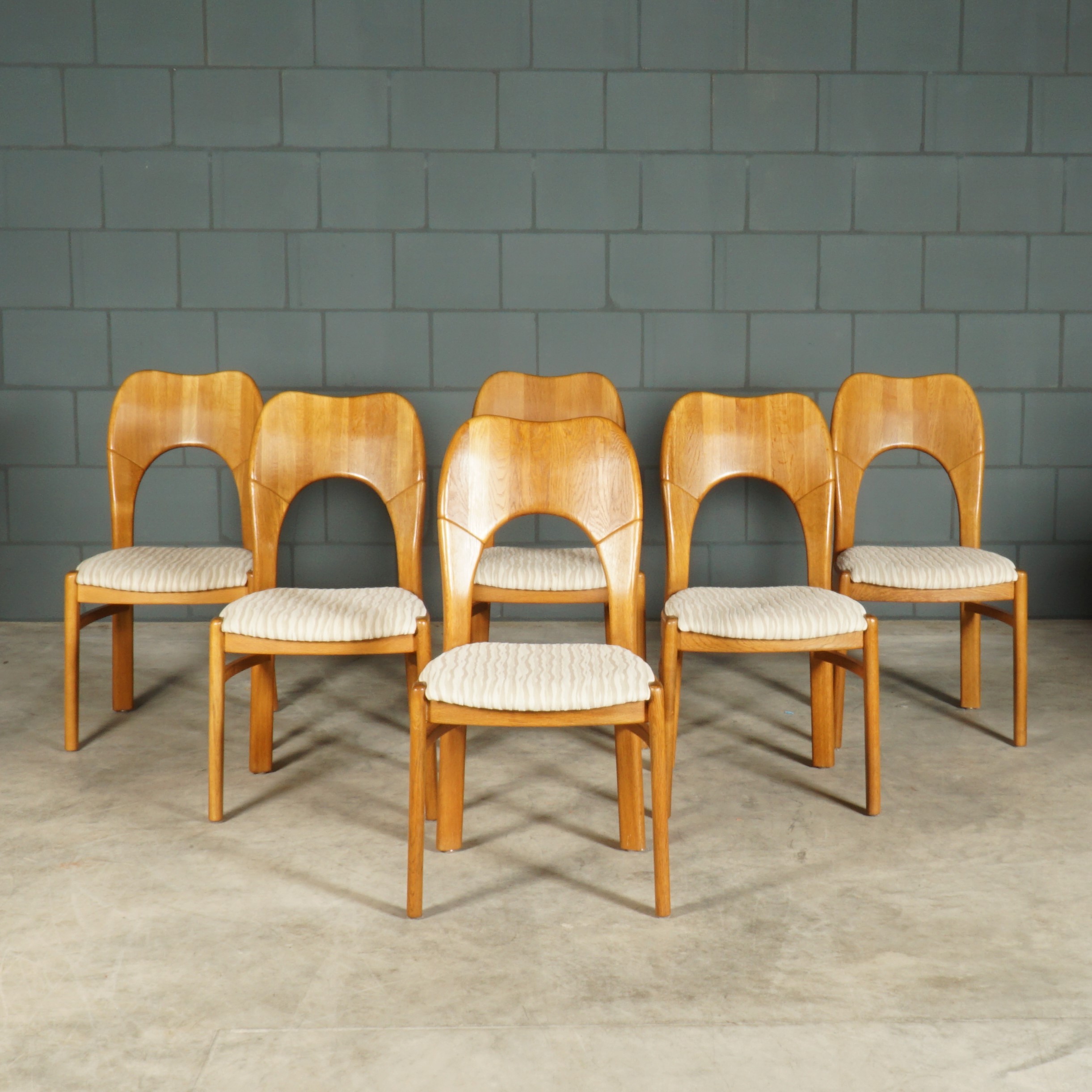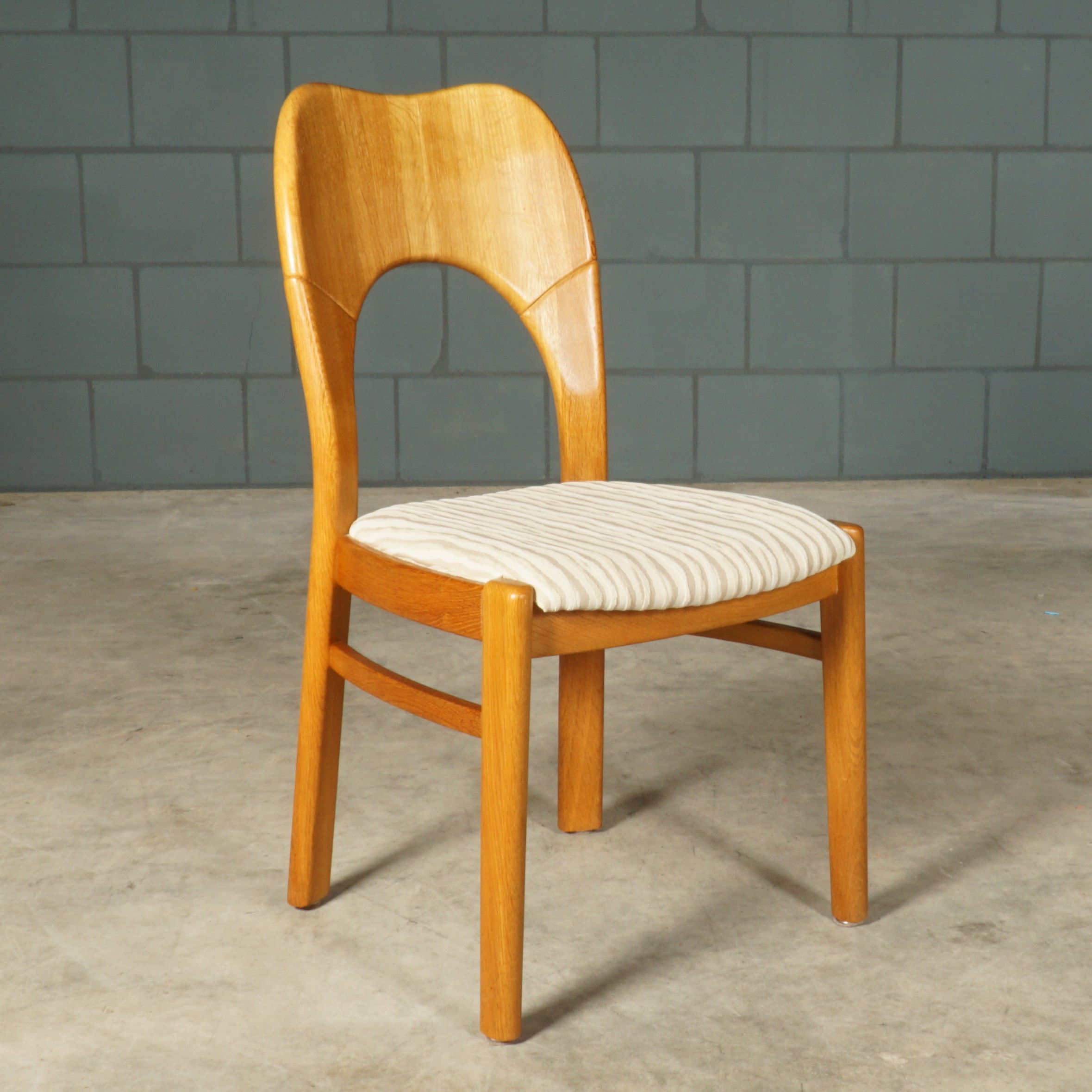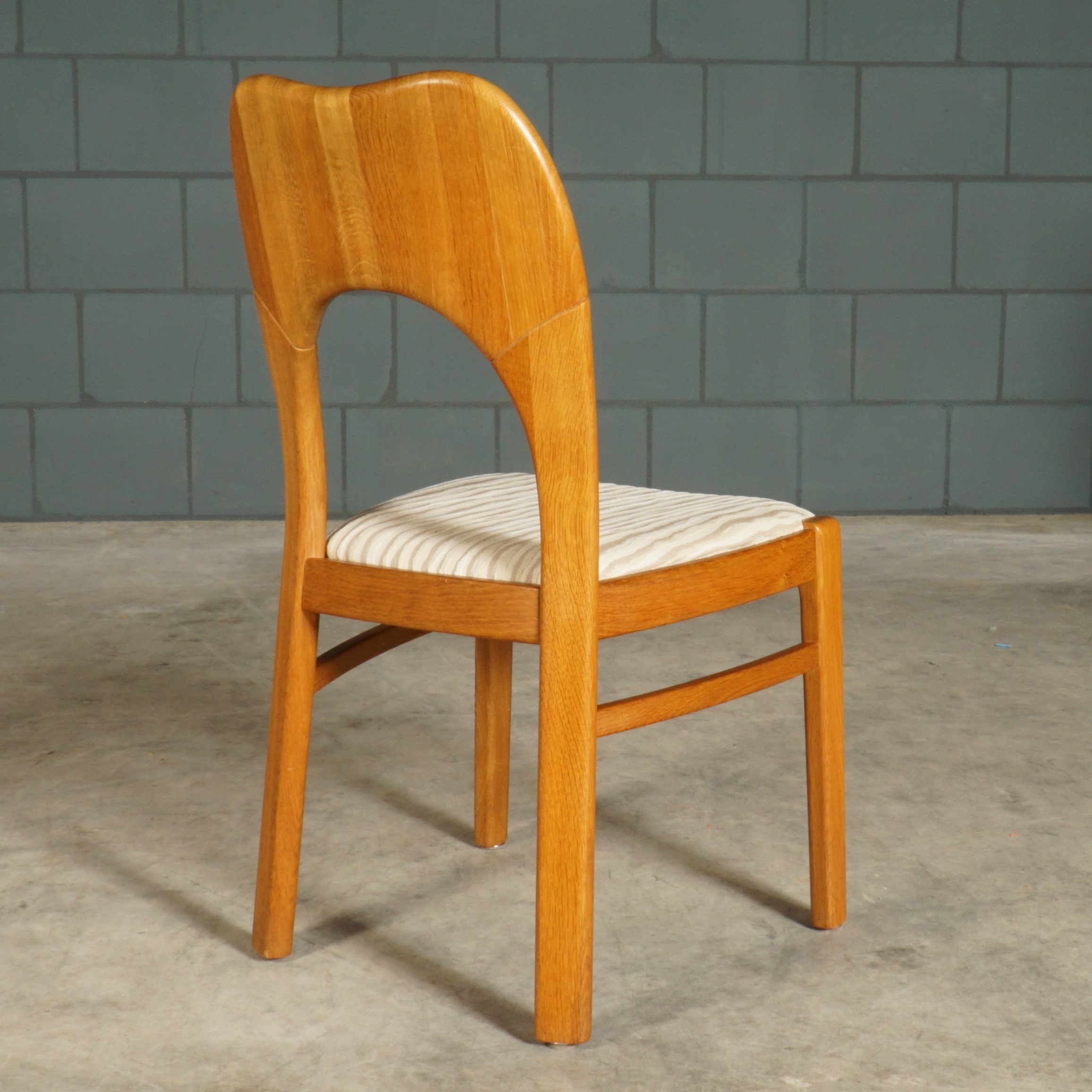 Deze geweldige eetkamerset is een jaren 60 design in de stijl van de Deense ontwerper Niels Koefoed voor Koefoeds Hornslet Mobelfabrik. De set bestaat uit een massief eikenhouten uitschuifbare eettafel en zes bijpassende stoelen. De tafel heeft twee lossen inzetstukken, waardoor de tafel stapsgewijs kan worden verlengd van 140 naar 190 naar 240 cm. De eikenhouten stoelen hebben een prachtige rugleuning en zijn bekleed met een mooie kwalitatieve stof in beigetinten. Ze zijn niet alleen prachtig, maar ze zitten ook nog eens erg comfortabel. Een set waar je met gemak met 8 tot 10 personen aan kunt dineren. In uitmuntende staat, meer slechts zeer lichte gebruikssporen. Een absoluut pronkstuk voor de echte liefhebber van midcentury Deens design!