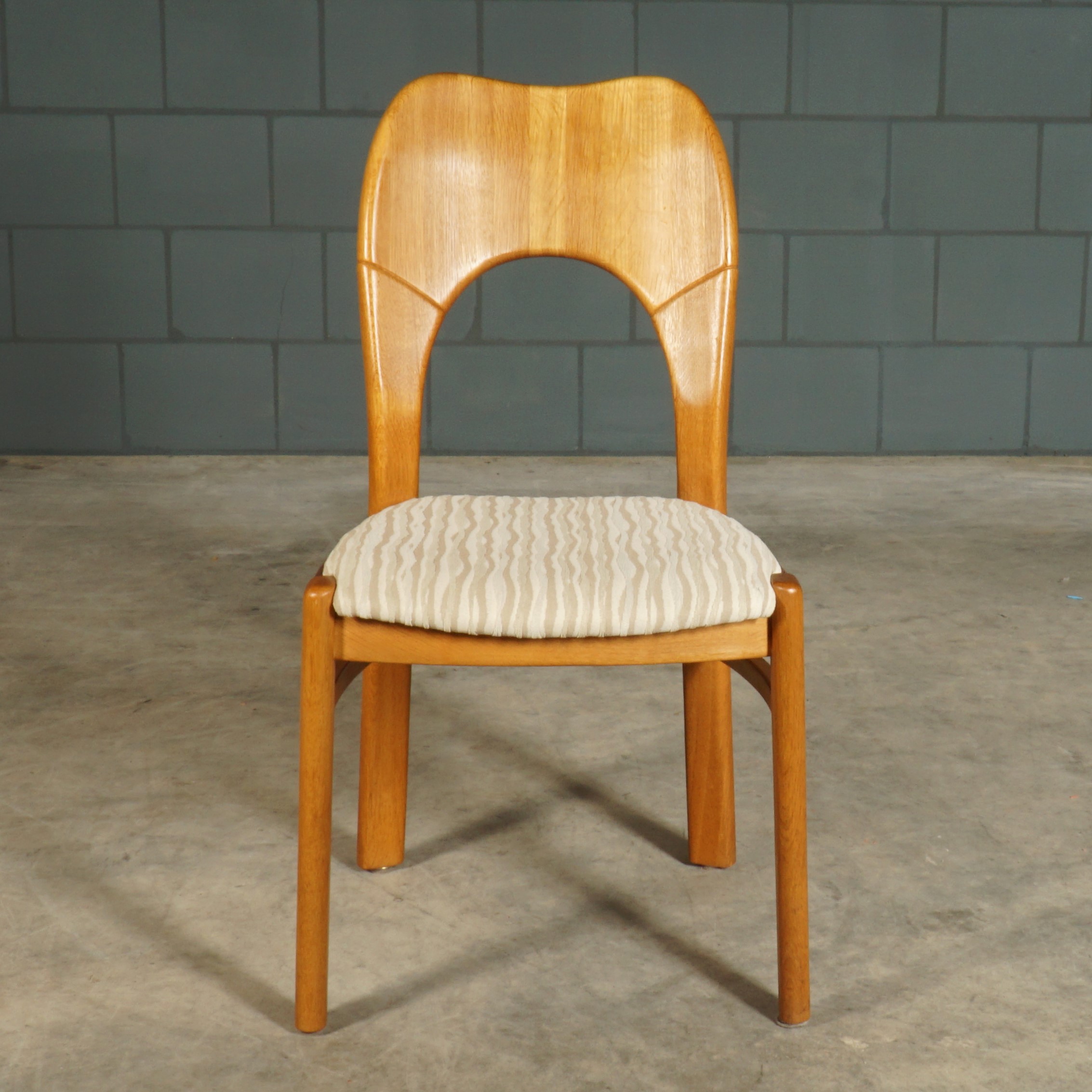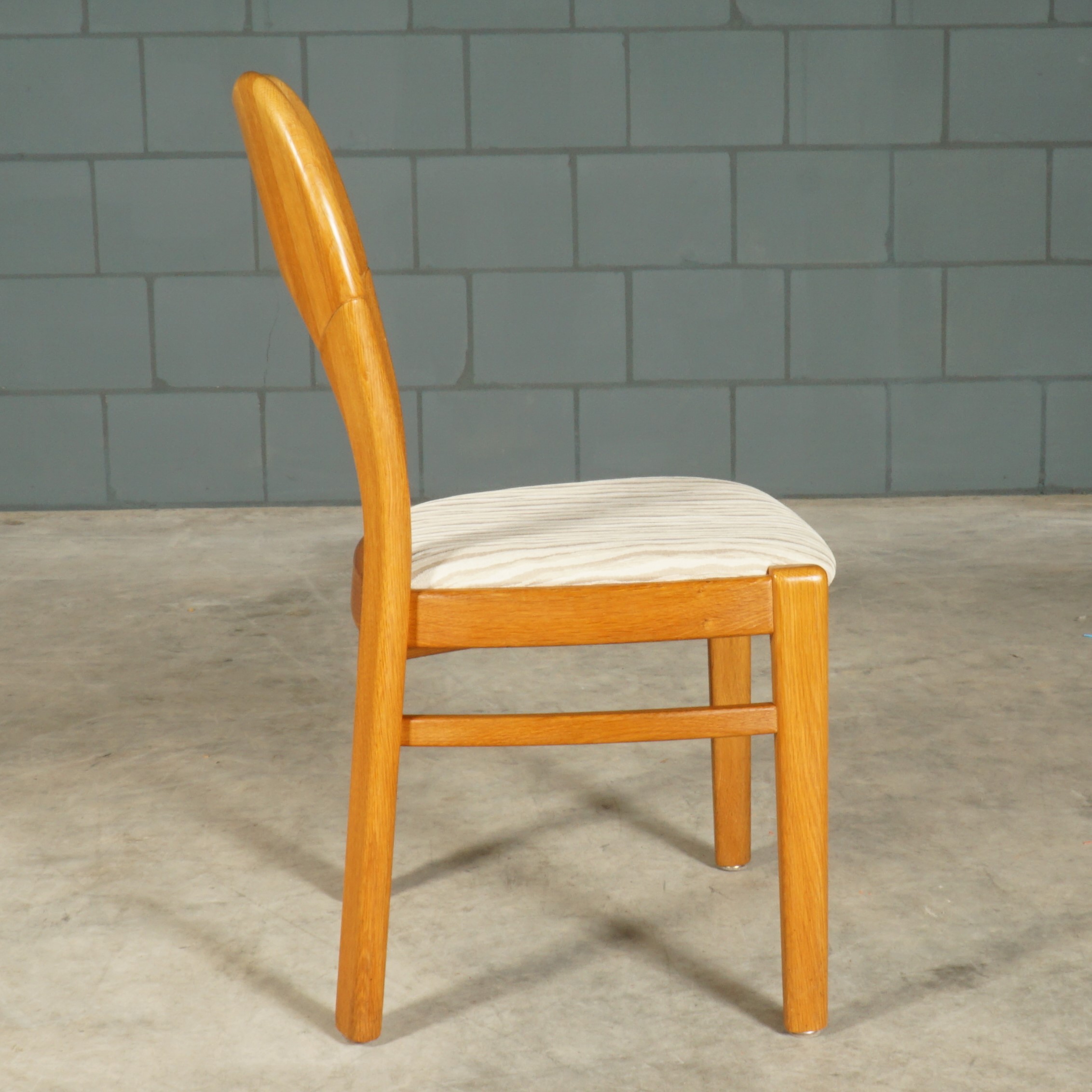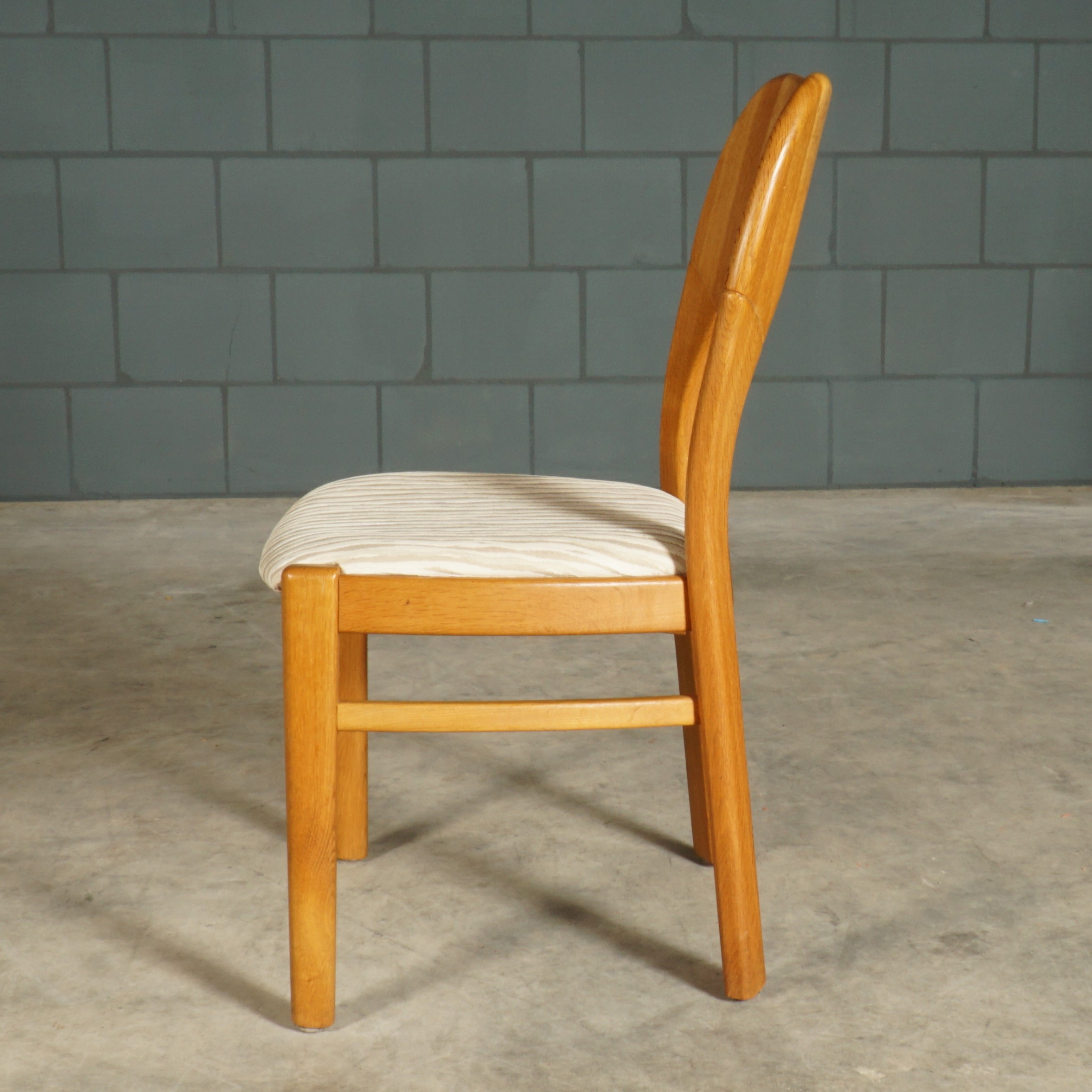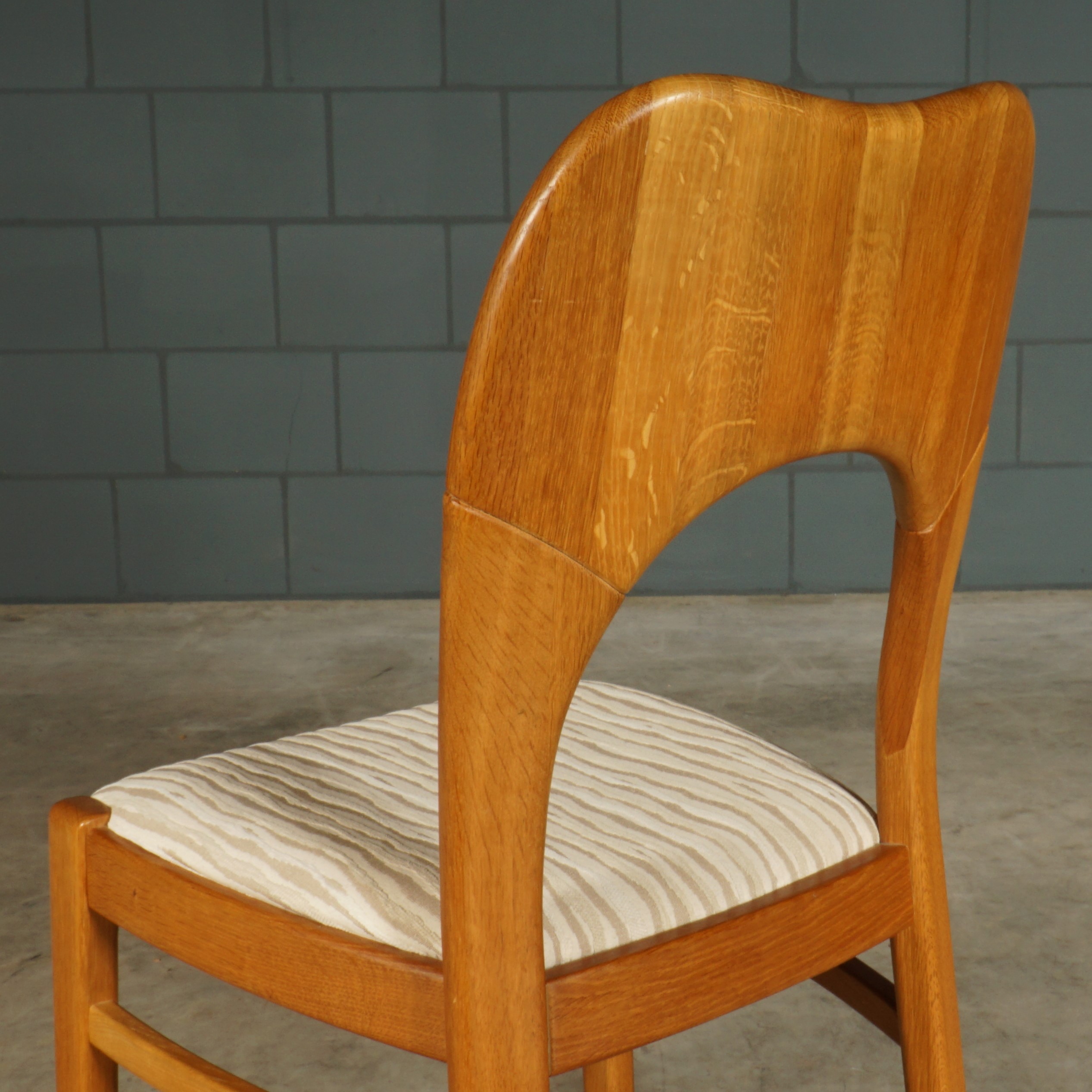Deze geweldige eetkamerset is een jaren 60 design in de stijl van de Deense ontwerper Niels Koefoed voor Koefoeds Hornslet Mobelfabrik. De set bestaat uit een massief eikenhouten uitschuifbare eettafel en zes bijpassende stoelen. De tafel heeft twee lossen inzetstukken, waardoor de tafel stapsgewijs kan worden verlengd van 140 naar 190 naar 240 cm. De eikenhouten stoelen hebben een prachtige rugleuning en zijn bekleed met een mooie kwalitatieve stof in beigetinten. Ze zijn niet alleen prachtig, maar ze zitten ook nog eens erg comfortabel. Een set waar je met gemak met 8 tot 10 personen aan kunt dineren. In uitmuntende staat, meer slechts zeer lichte gebruikssporen. Een absoluut pronkstuk voor de echte liefhebber van midcentury Deens design!