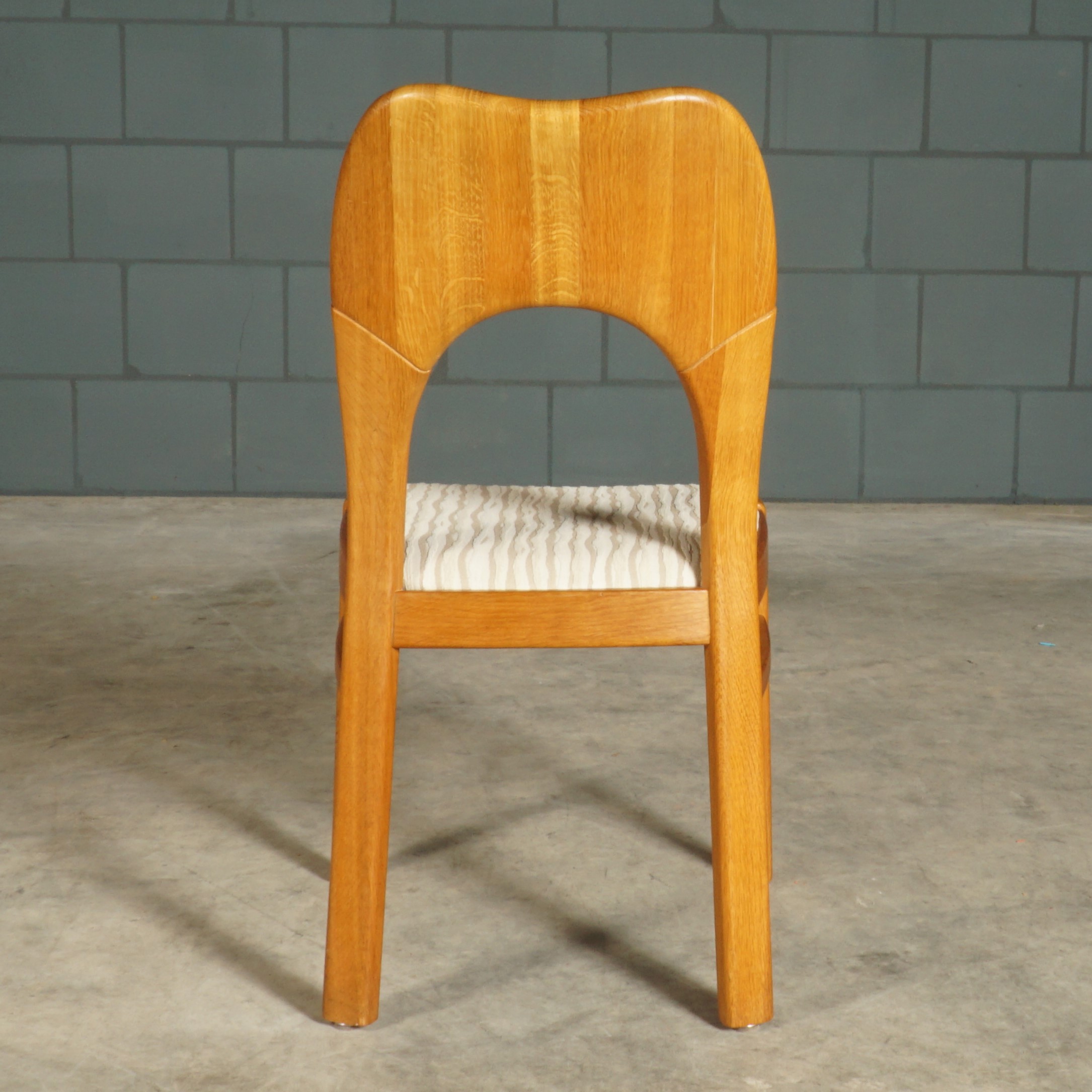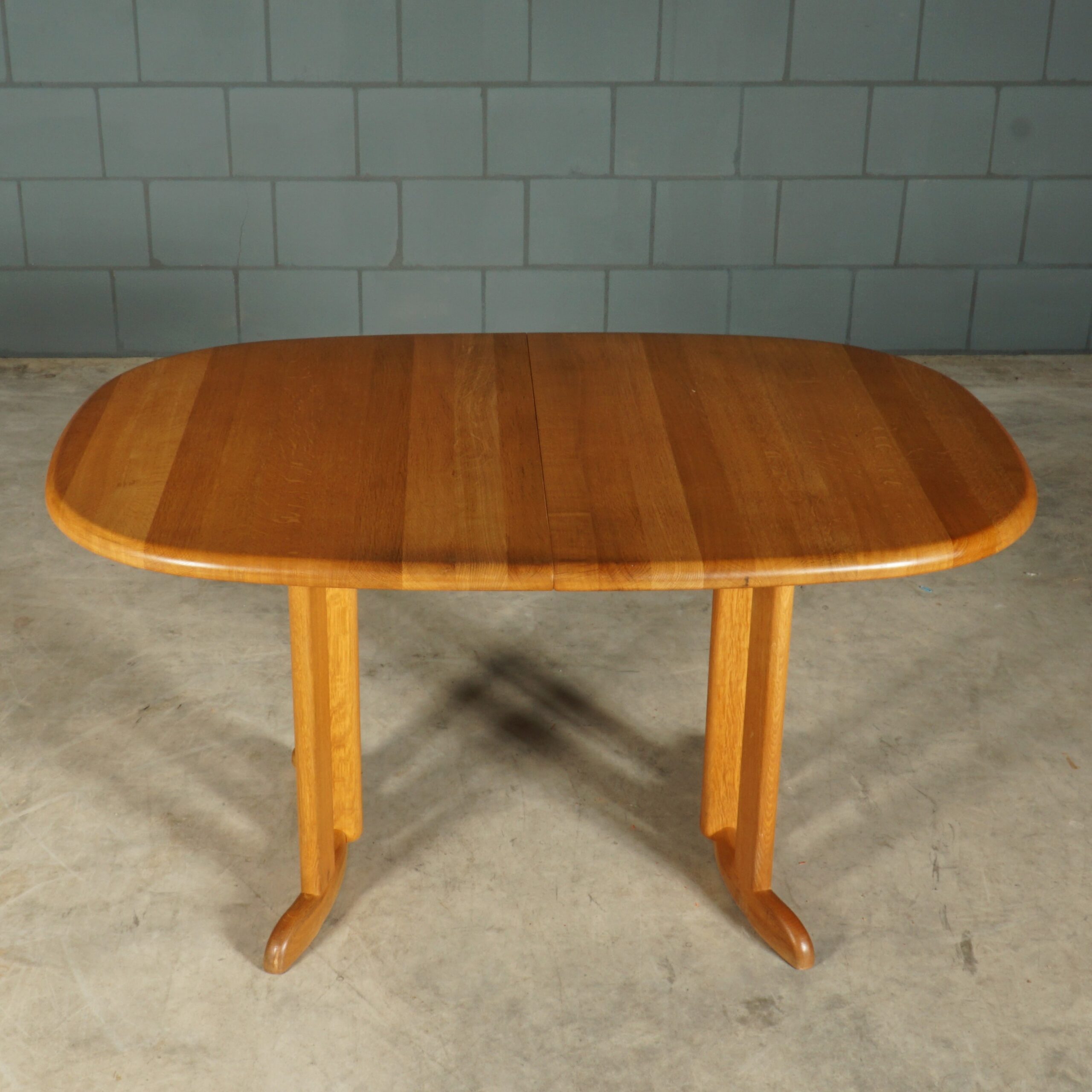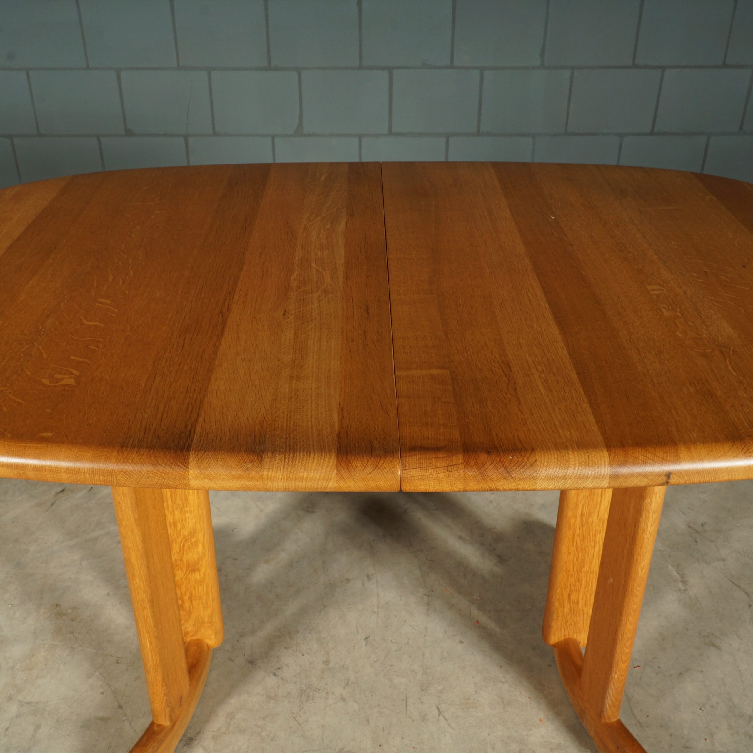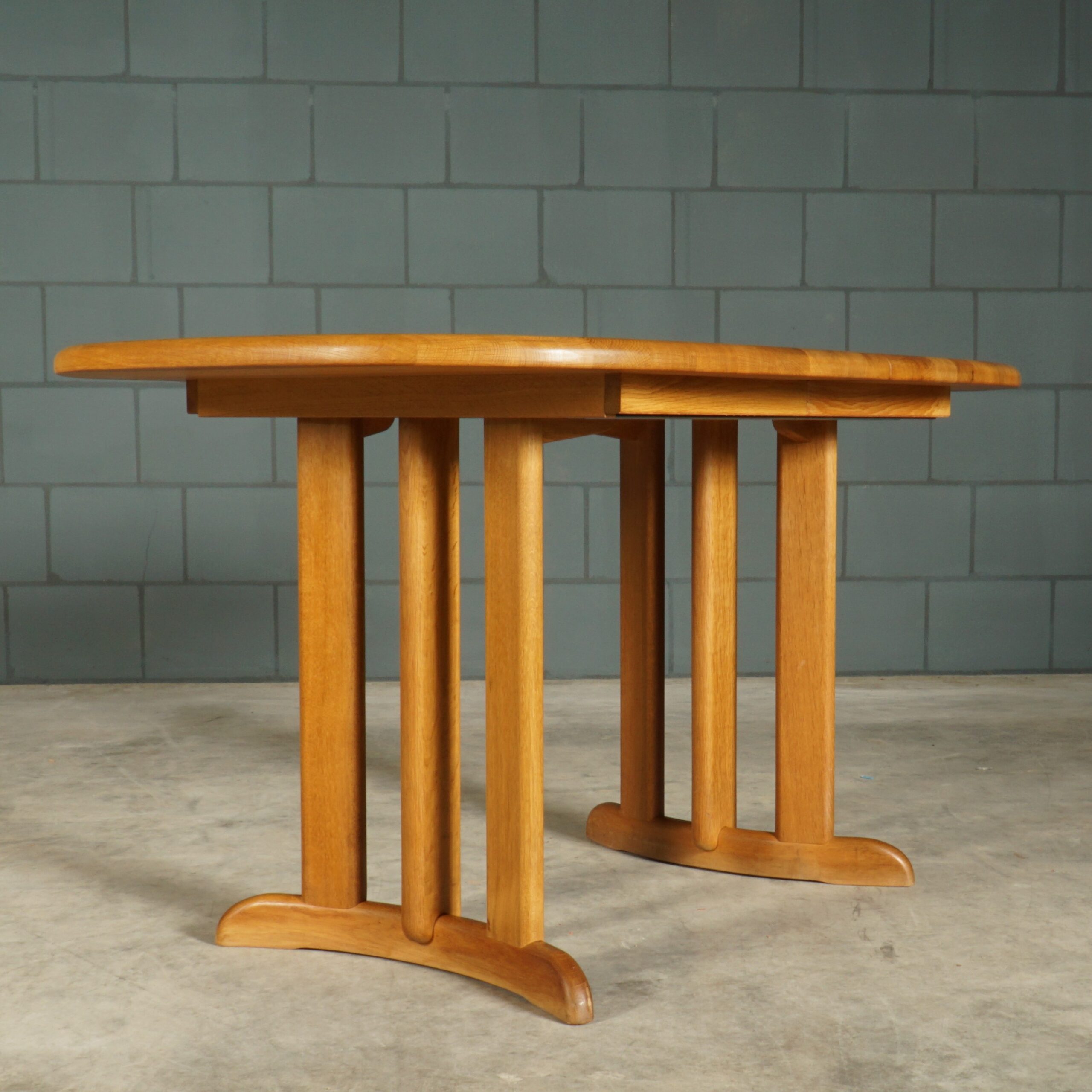 Deze geweldige eetkamerset is een jaren 60 design in de stijl van de Deense ontwerper Niels Koefoed voor Koefoeds Hornslet Mobelfabrik. De set bestaat uit een massief eikenhouten uitschuifbare eettafel en zes bijpassende stoelen. De tafel heeft twee lossen inzetstukken, waardoor de tafel stapsgewijs kan worden verlengd van 140 naar 190 naar 240 cm. De eikenhouten stoelen hebben een prachtige rugleuning en zijn bekleed met een mooie kwalitatieve stof in beigetinten. Ze zijn niet alleen prachtig, maar ze zitten ook nog eens erg comfortabel. Een set waar je met gemak met 8 tot 10 personen aan kunt dineren. In uitmuntende staat, meer slechts zeer lichte gebruikssporen. Een absoluut pronkstuk voor de echte liefhebber van midcentury Deens design!