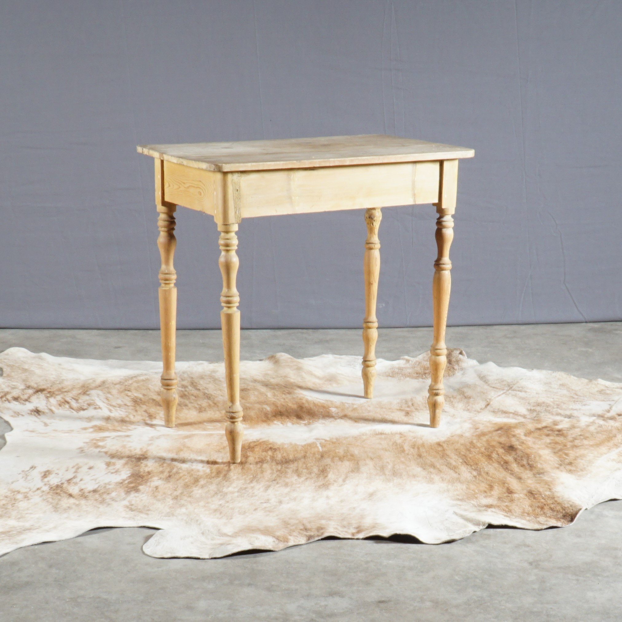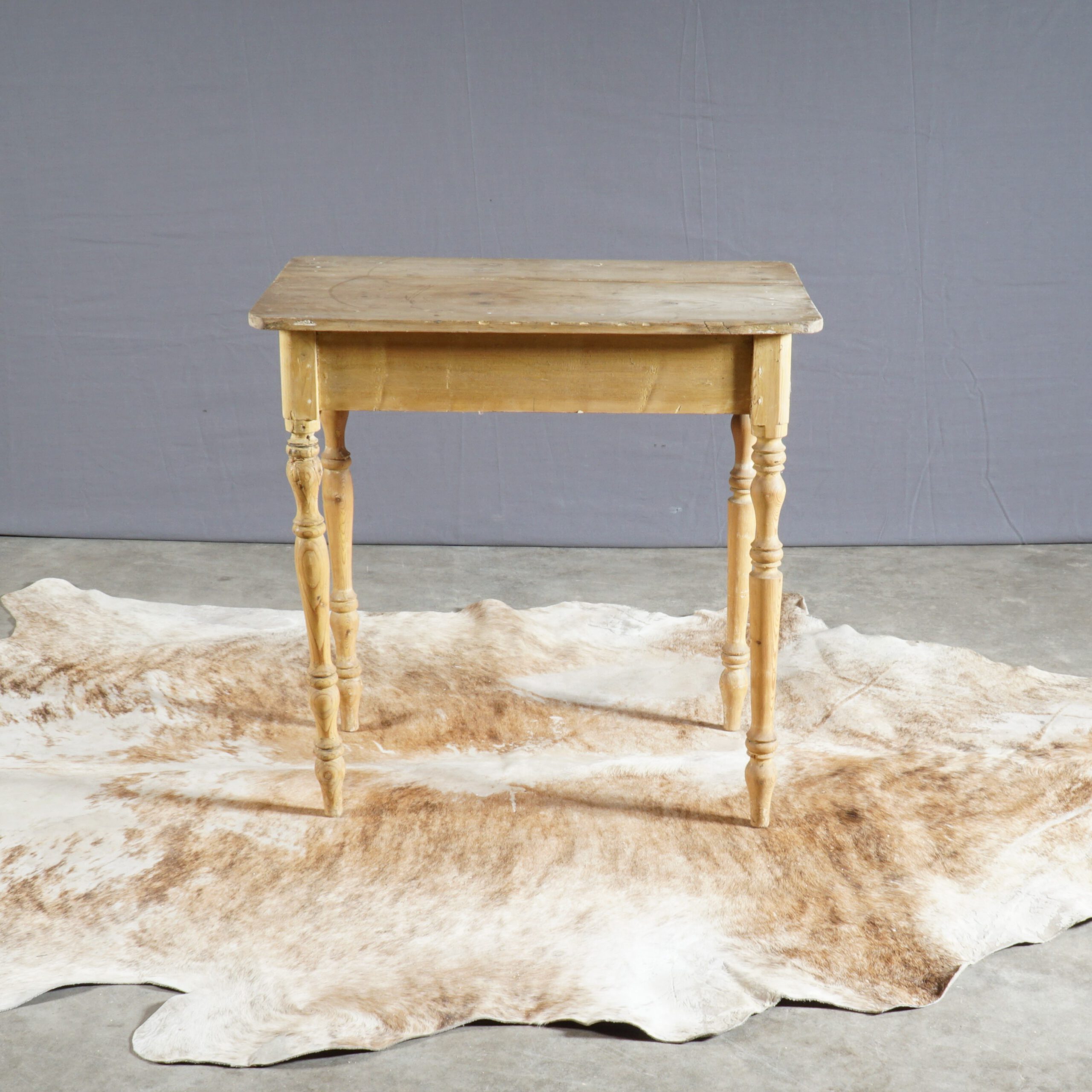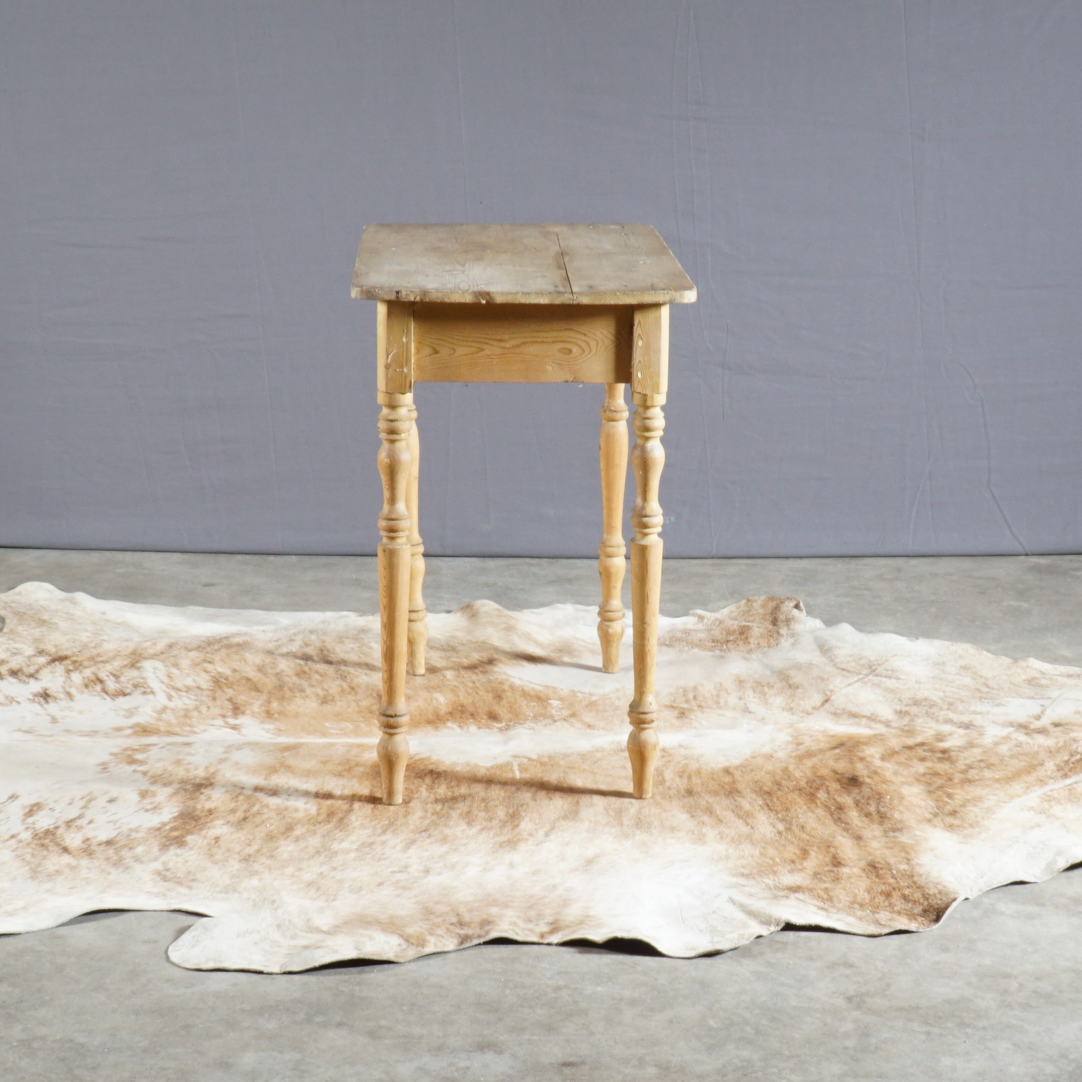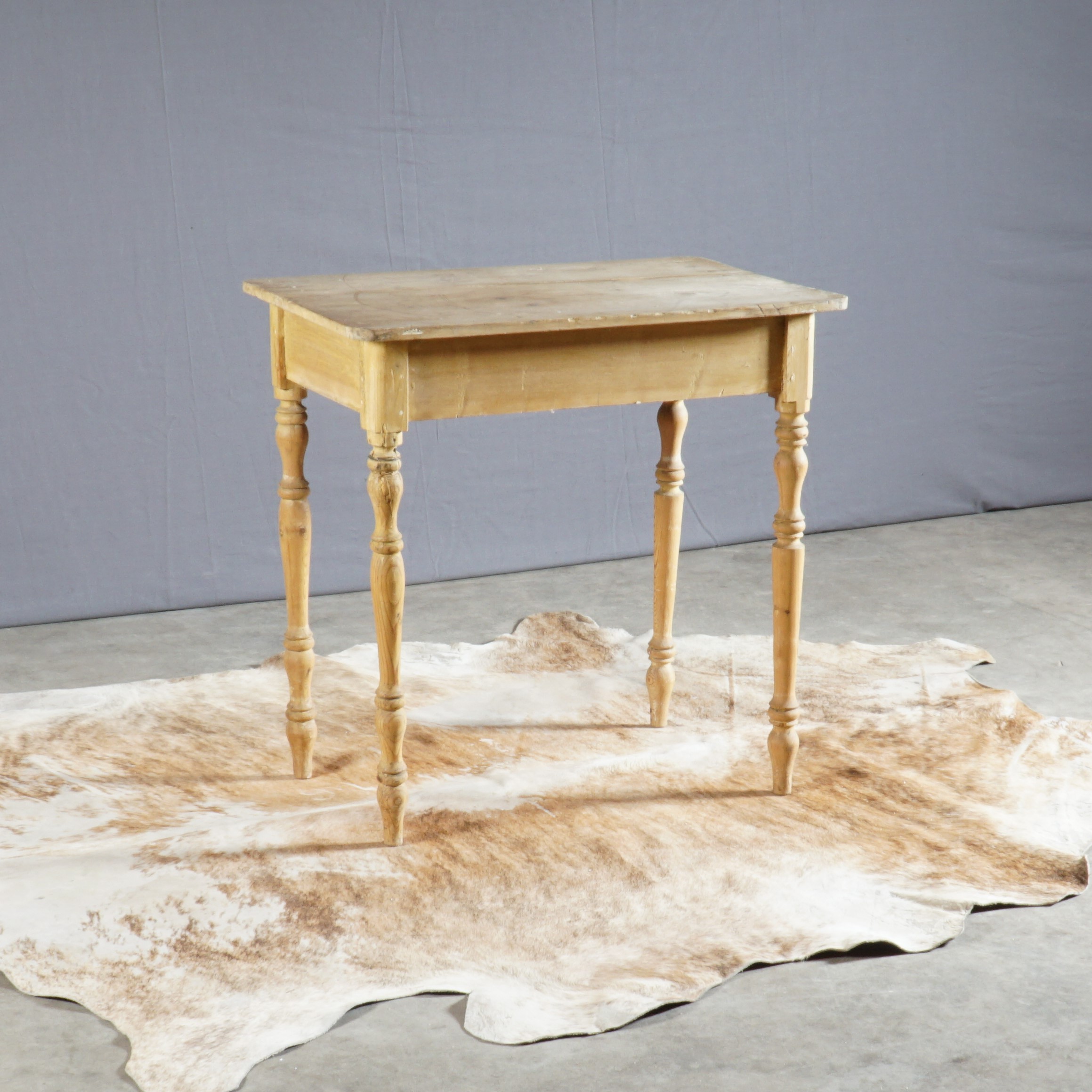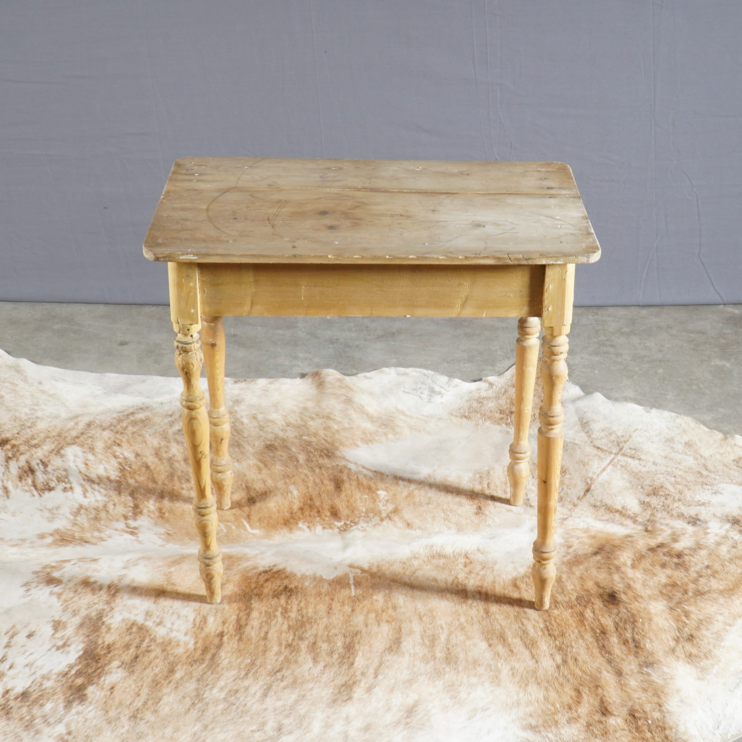 Oud, maar zo mooi! Dit Wabi Sabi tafeltje is afkomstig uit Frankrijk. Het grenenhout is wat verweerd en een poot staat na een reparatie ietsjes naar binnen, maar daar zie je bijna niks van en het doet niets af aan de stevigheid van de tafel.