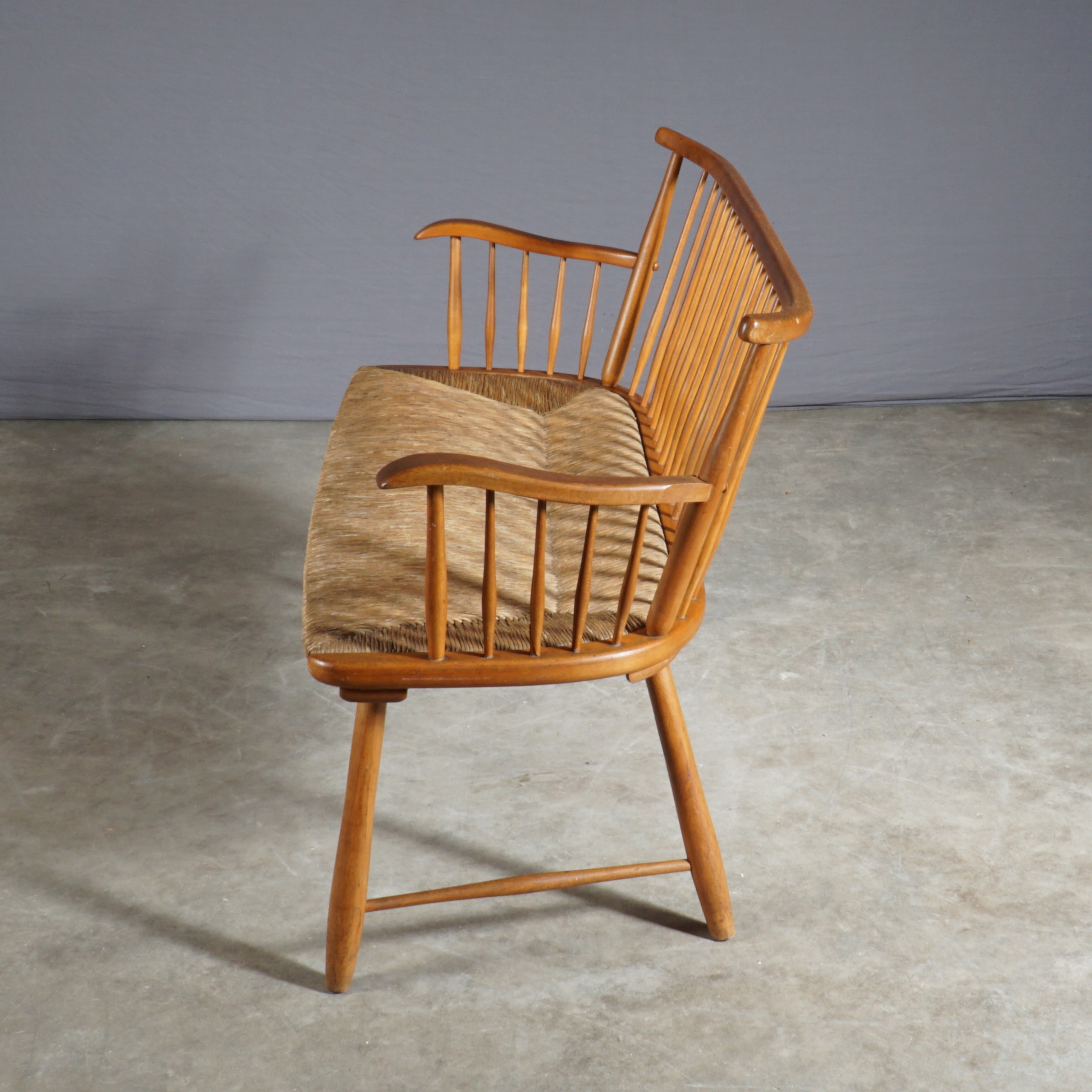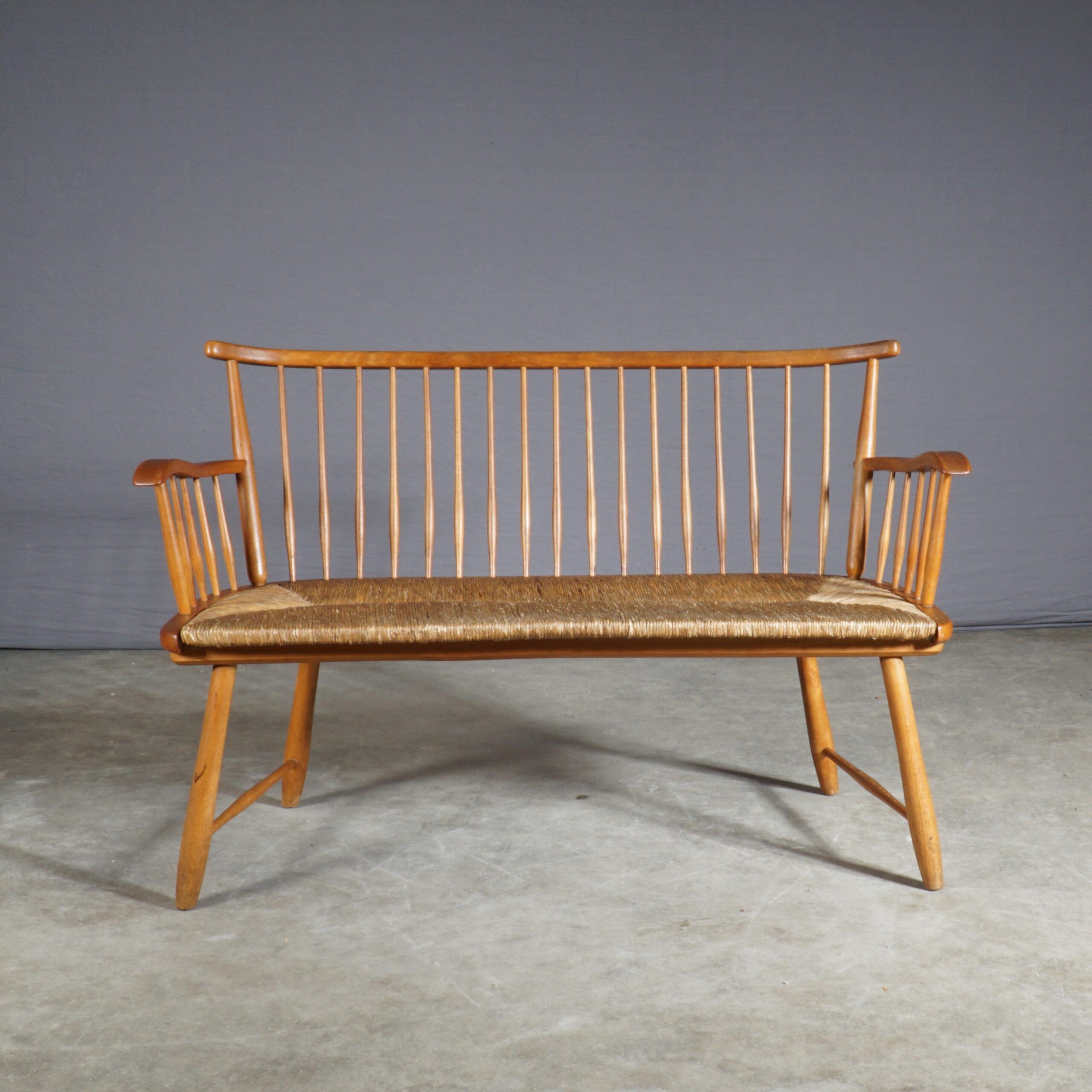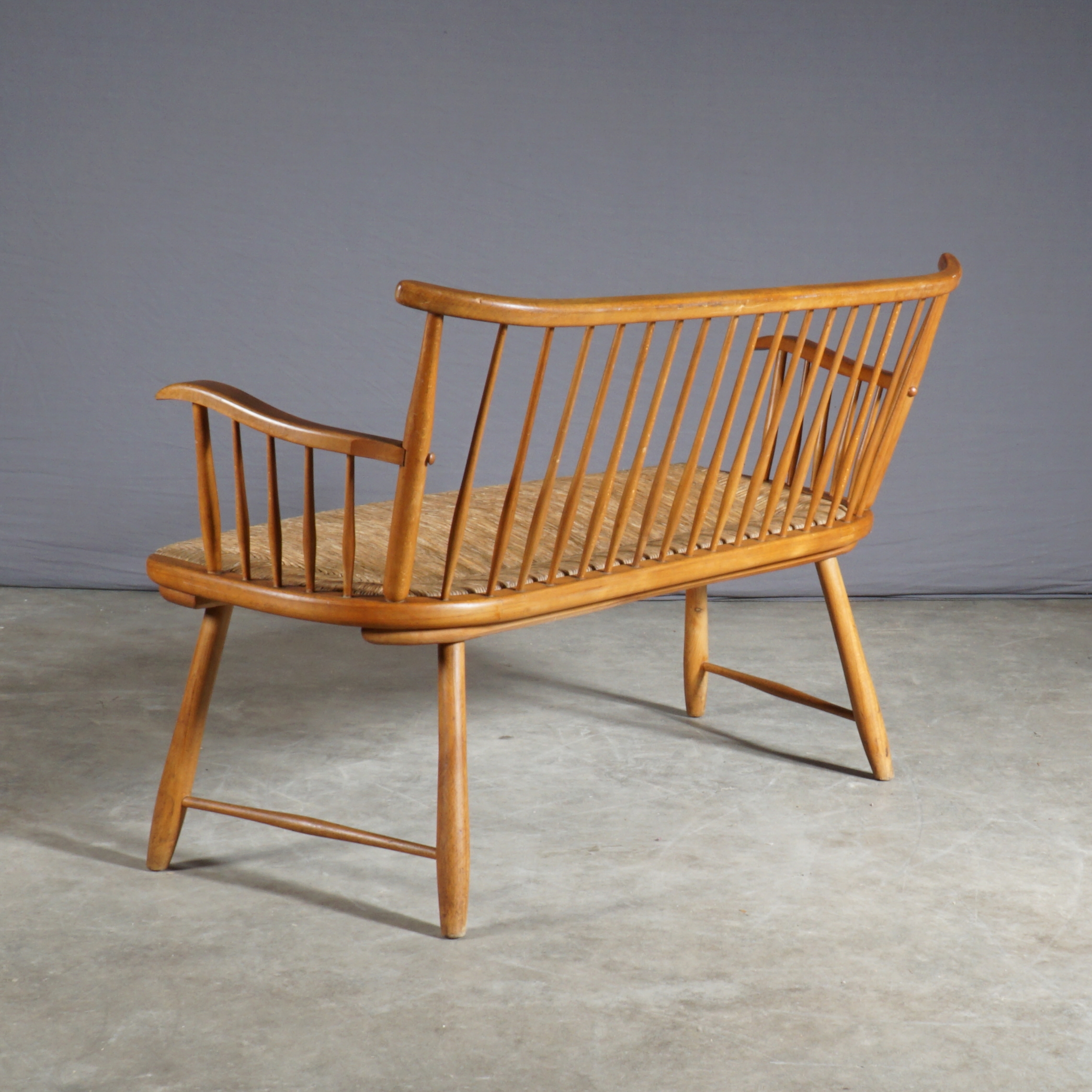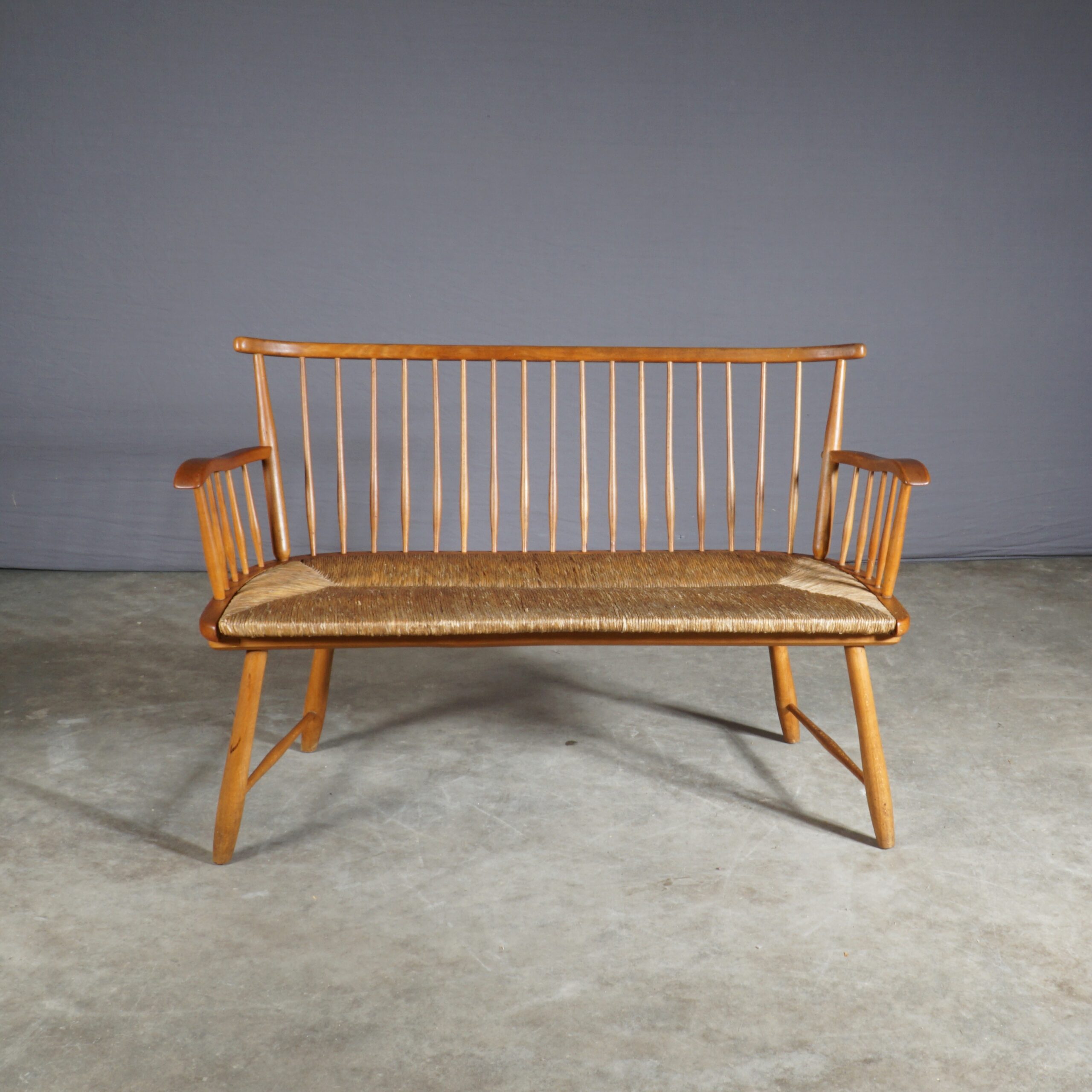 Dit prachtige en zeldzame ontwerp is van architect en ontwerper Arno Lambrecht voor de serie WKS van de firma WK-Möbel in Stuttgart en dateert uit 1955. Het stabiele frame met de knotsvormige poten is gemaakt van massief beukenhout en de zitting is van gevlochten riet. Het bankje heeft slechts wat lichte gebruikssporen, wat bijzonder is gelet op de leeftijd. Dit bankje heeft de tand des tijds fantastisch doorstaan, wat een uitstraling en wat een patina!