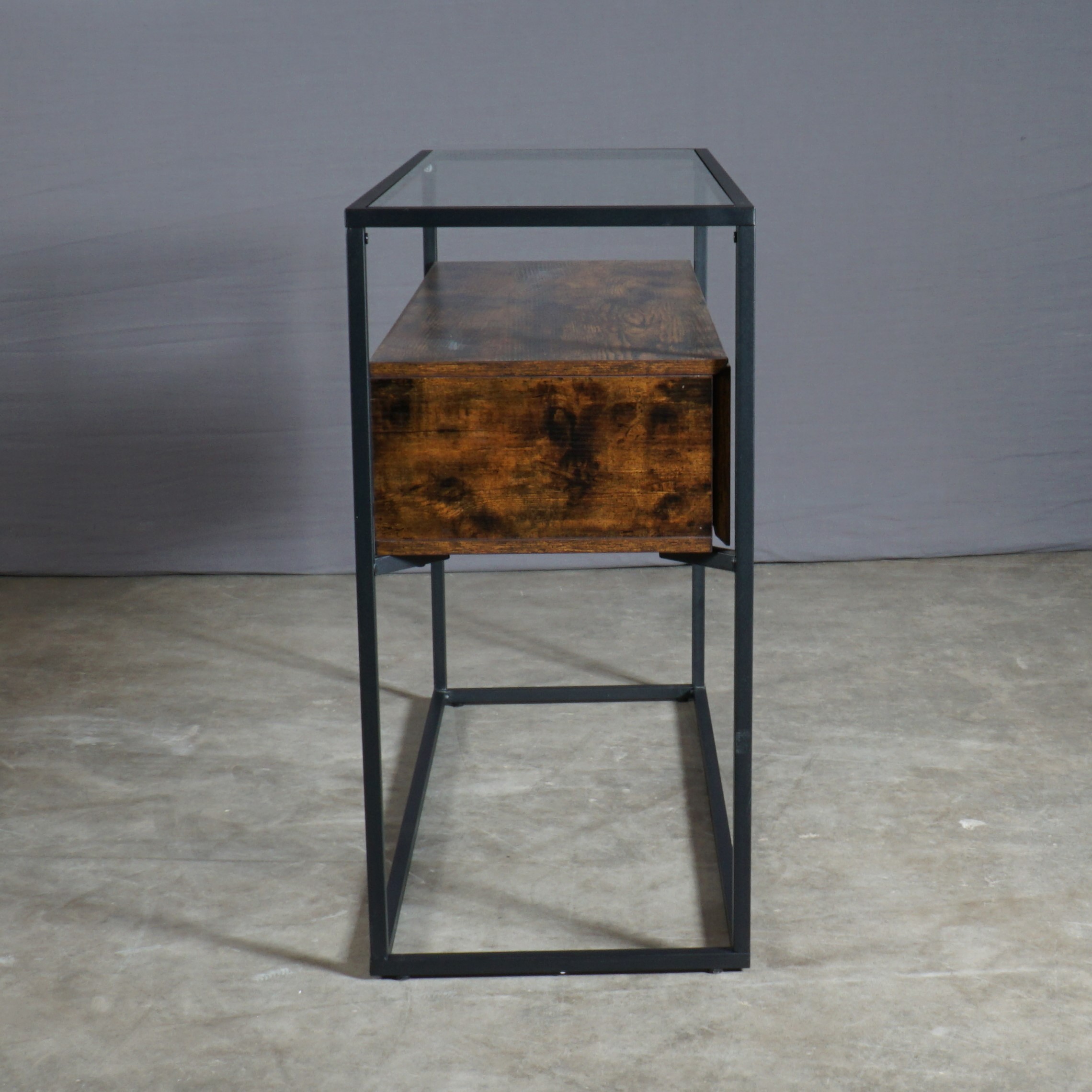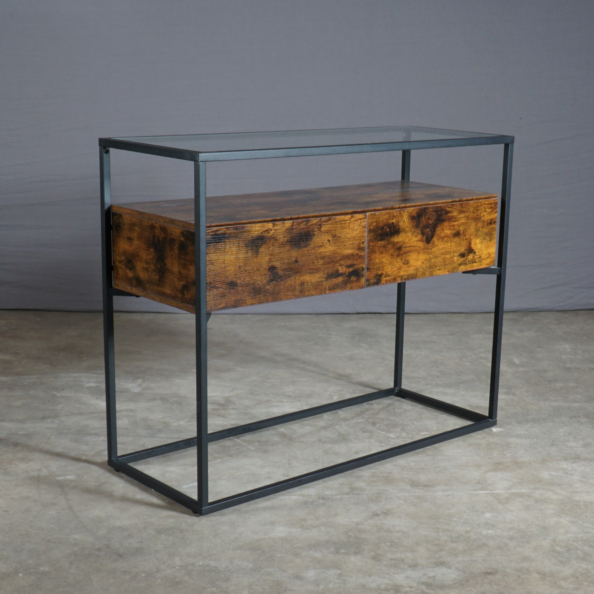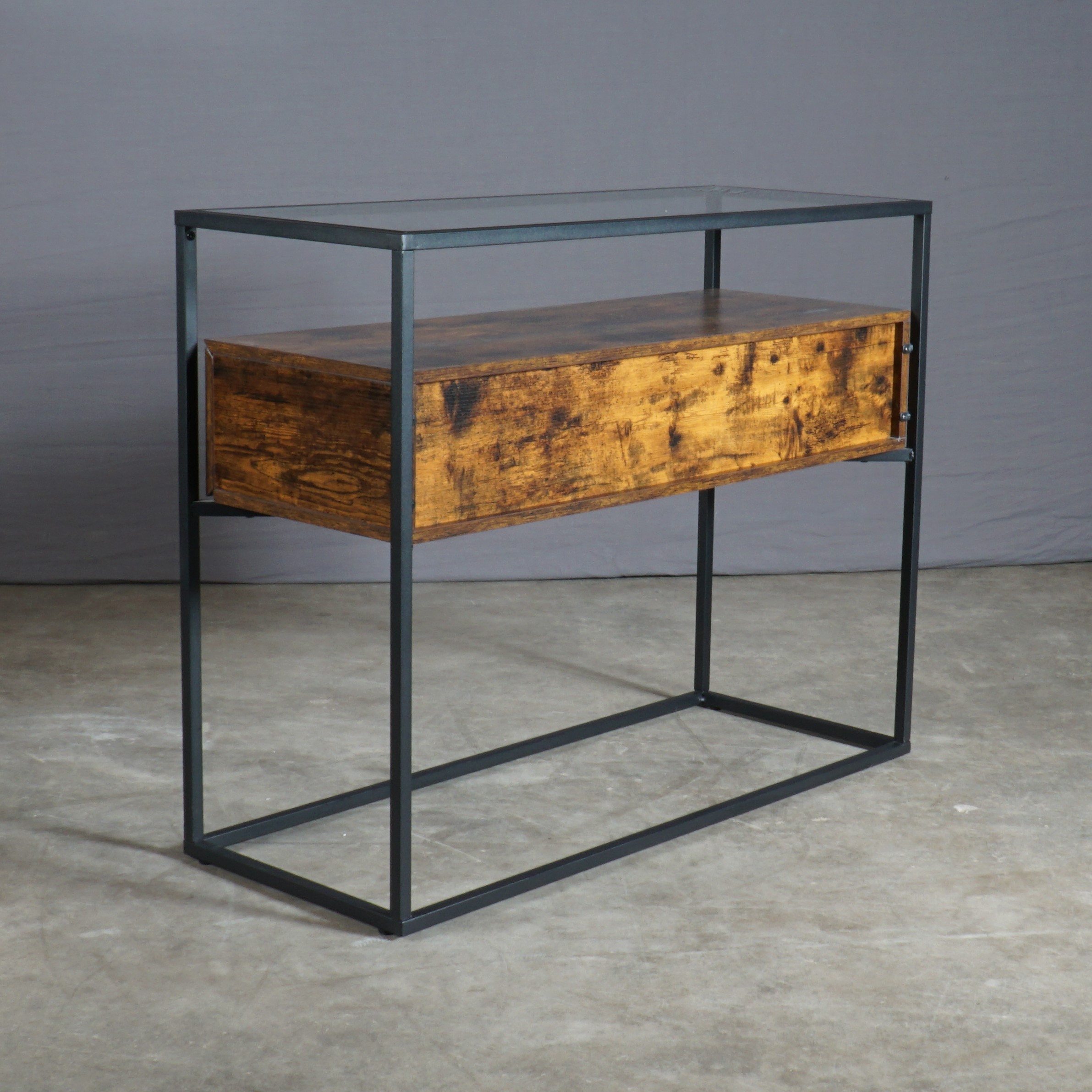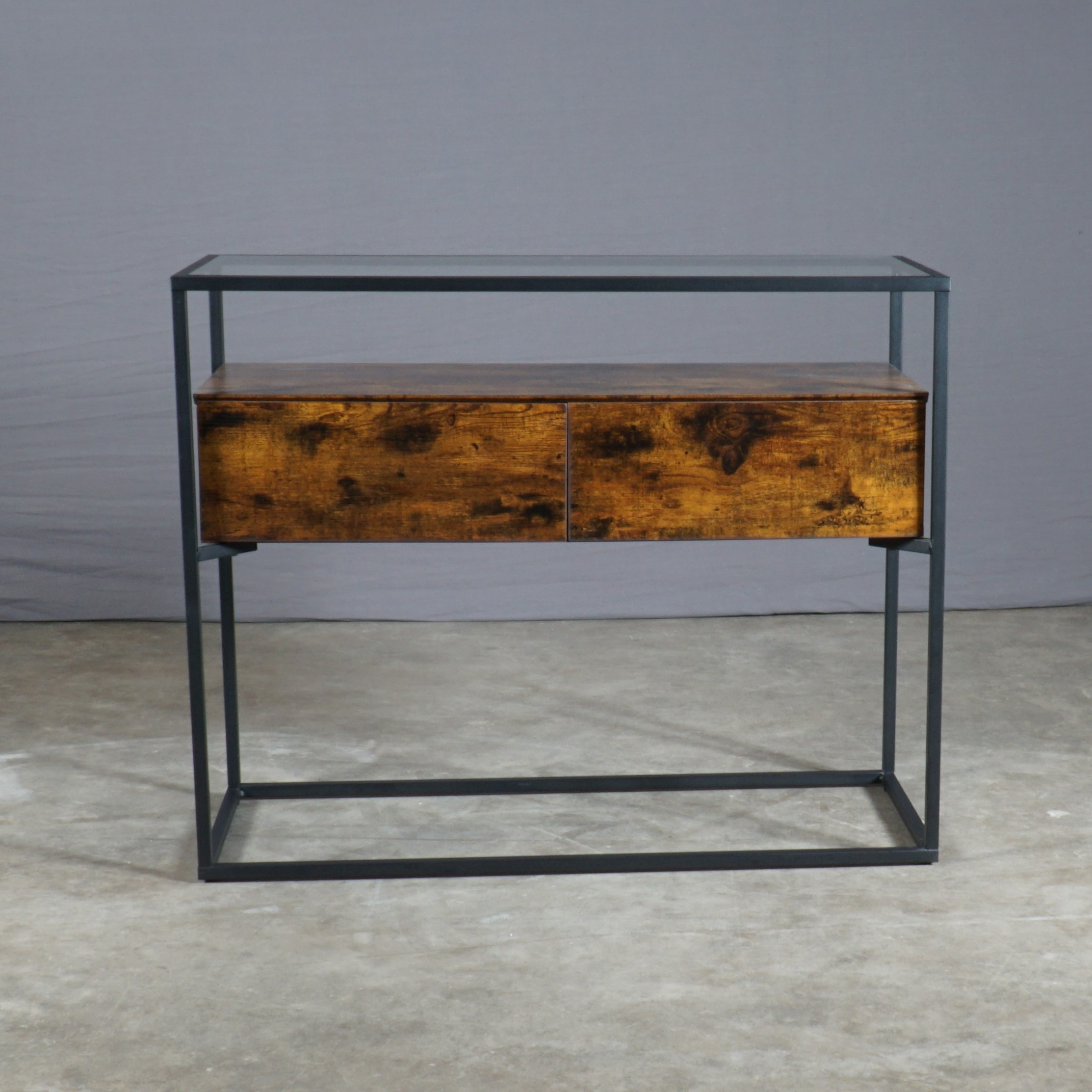 Deze prachtige industriële bijzettafel heeft een zwarte ijzeren frame, een elegant glazen oppervlak en twee rustieke houten lades ertussenin – een harmonieus samenspel van verschillende materialen dat deze bijzettafel een uniek uiterlijk geeft. Deze bijzettafel biedt niet alleen een ruim oppervlak om spullen op te zetten, er zijn ook twee bijna onzichtbaar geïntegreerde laden voor nog meer opslagruimte direct onder het glasblad.