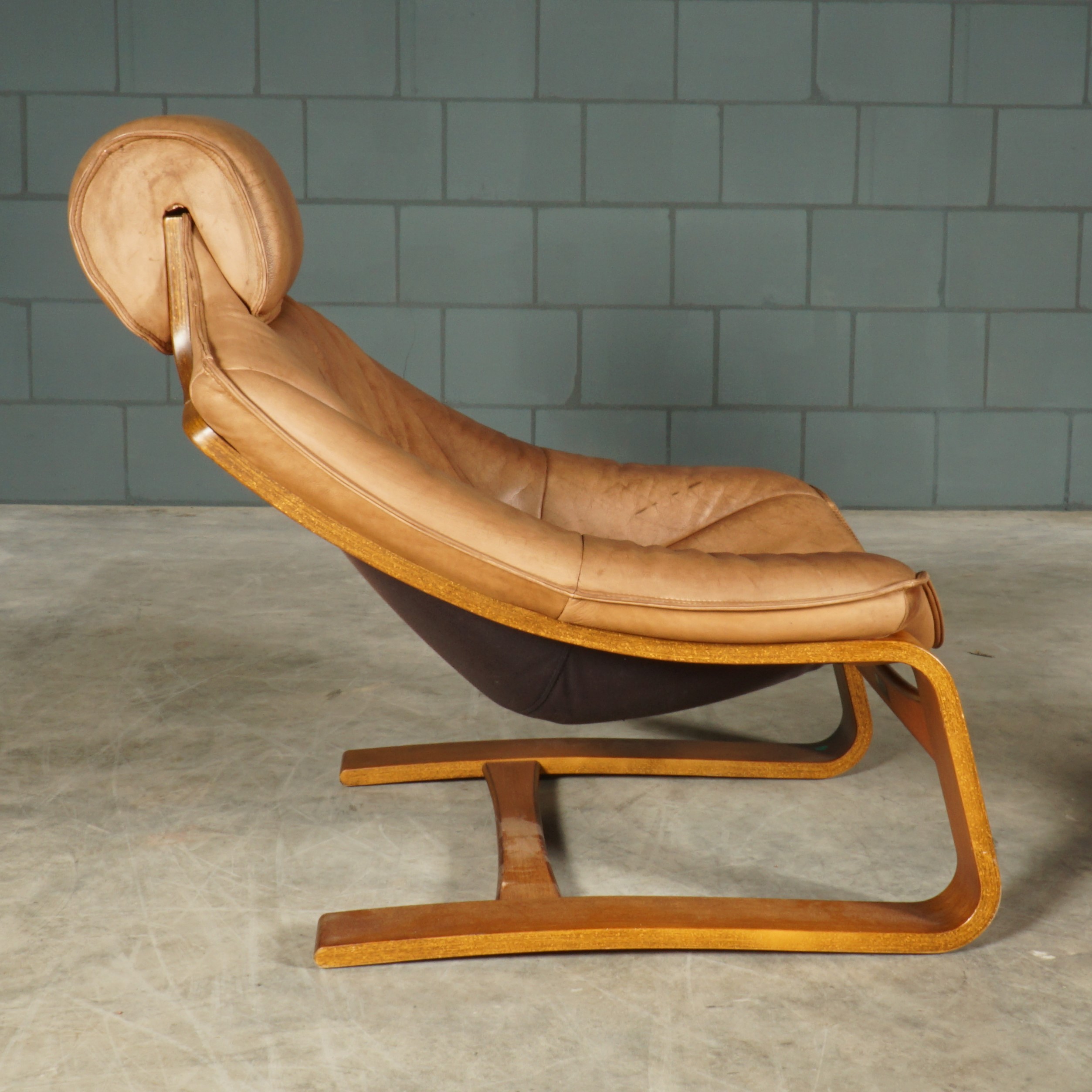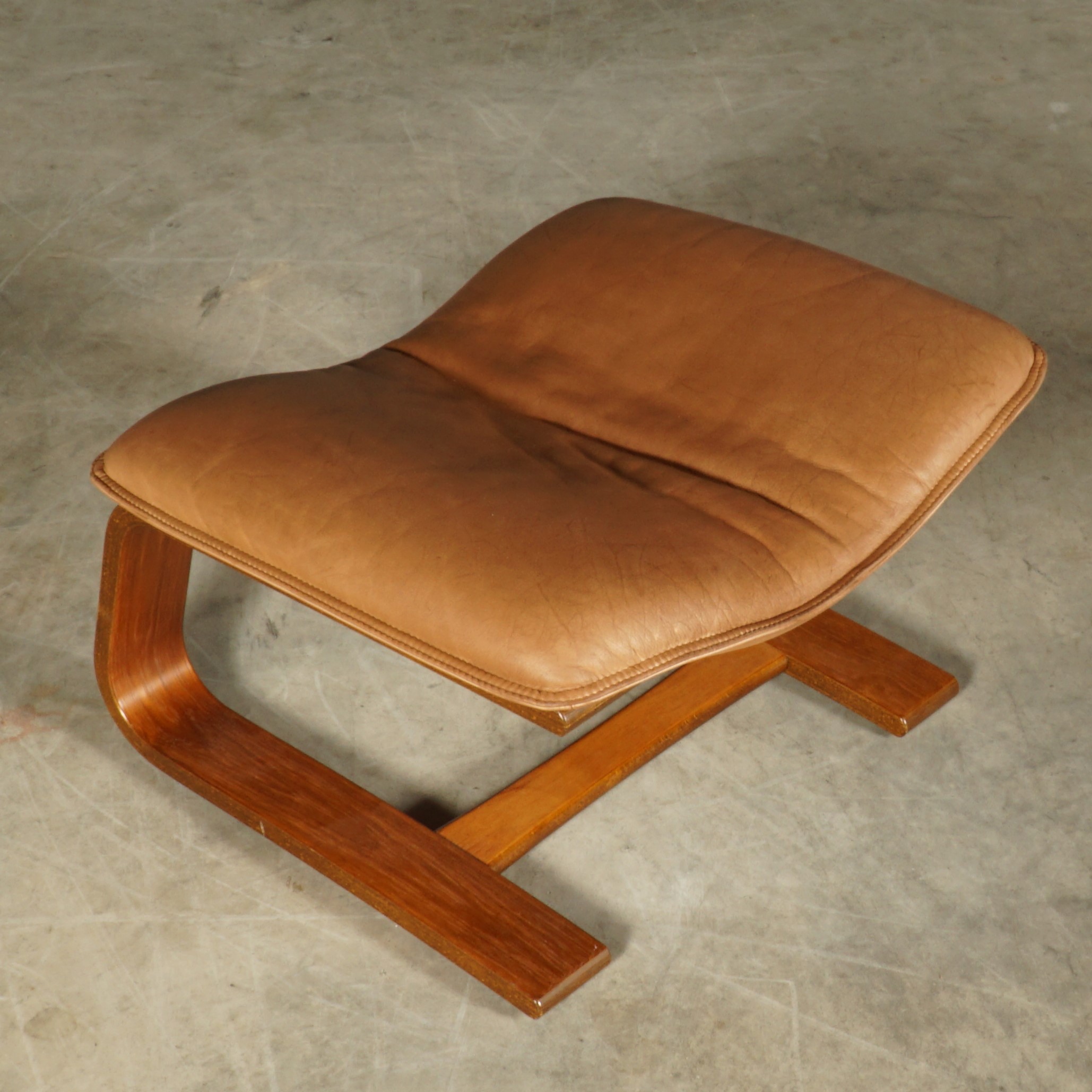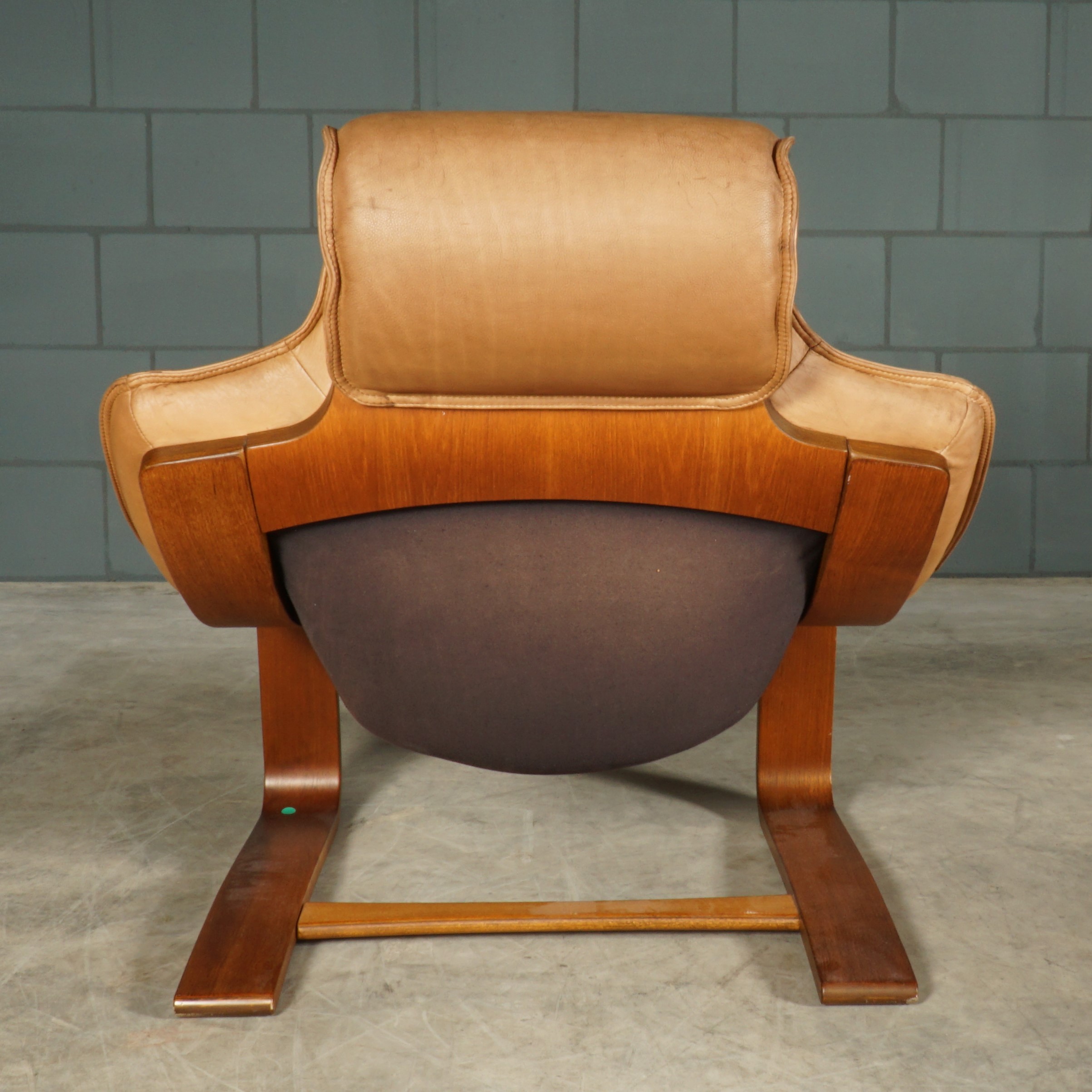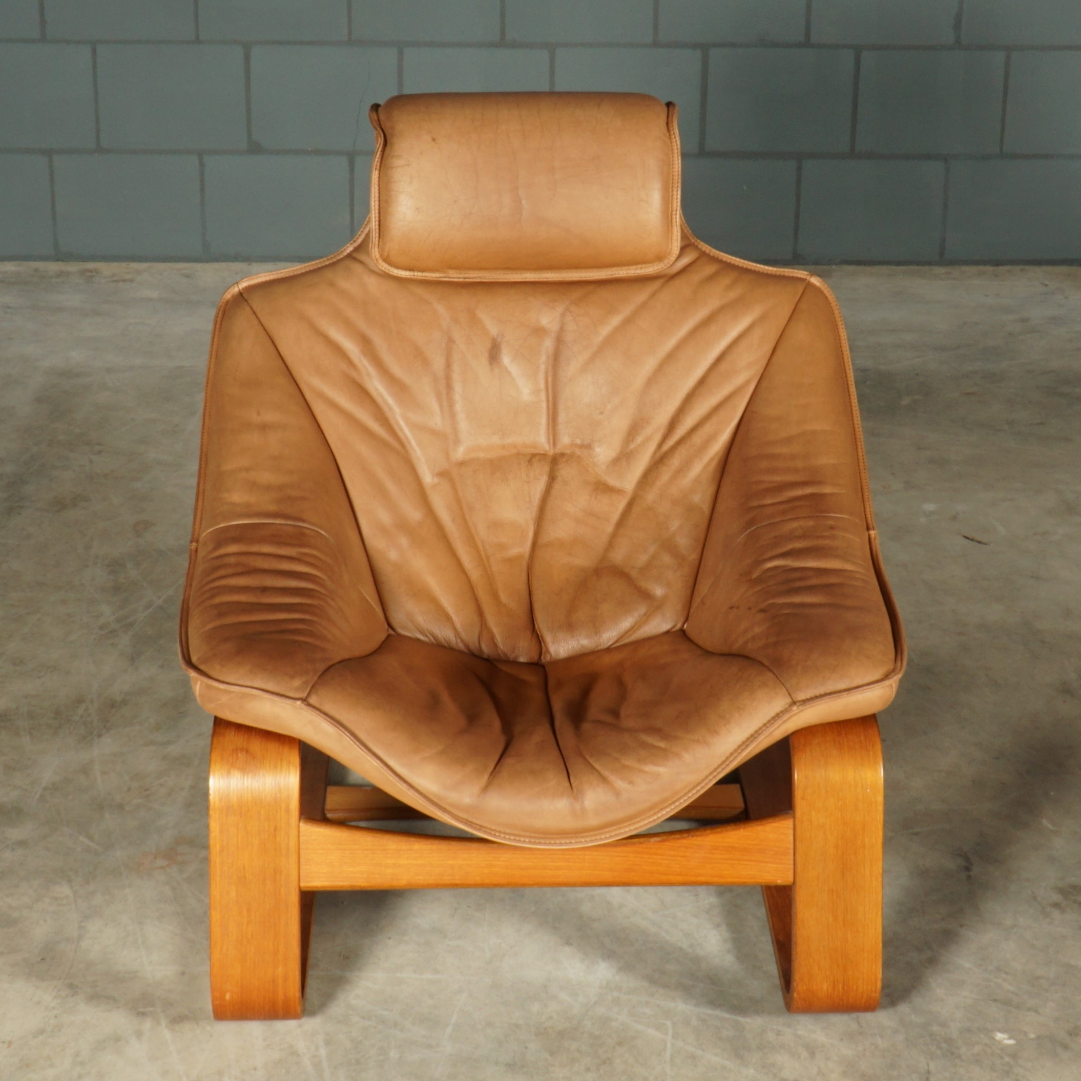 Deze “Kroken” fauteuil is geproduceerd door het bekende Zweedse bedrijf Nelo Möbel en is ontworpen door ontwerper Ake Fribyter. De fauteuil heeft een flexibel teakhouten gebogen frame met lichtbruine/beige lederen bekleding. Door het onmiskenbare ontwerp valt de Kroken-fauteuil op in comfort en design. De fauteuil past zowel in een vintage als in moderne omgeving. De fauteuil is extra luxe vanwege de bijpassende hocker. De fauteuil is in goede vintage staat, met enige vlekken en gebruikssporen (verkleuring) op het leder.