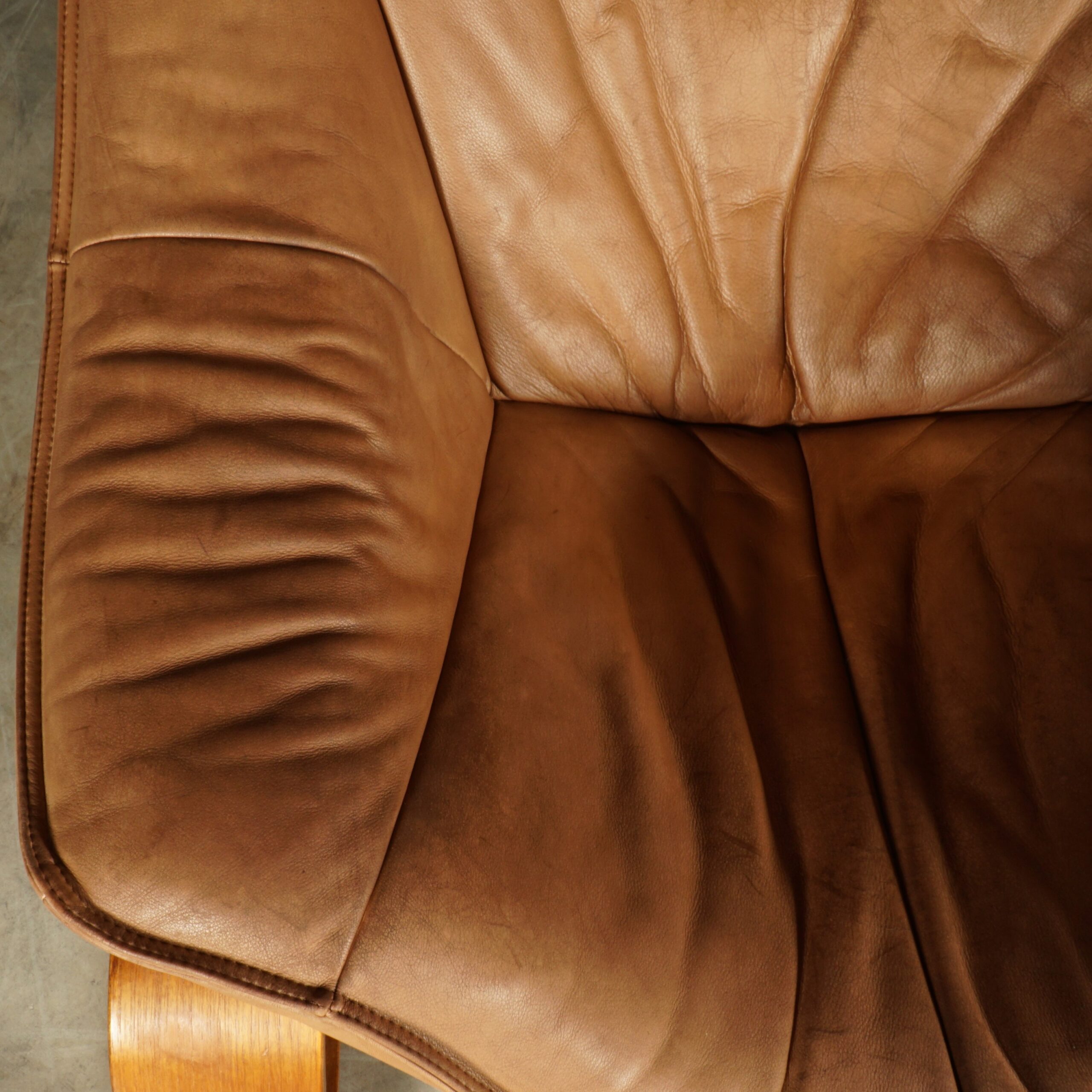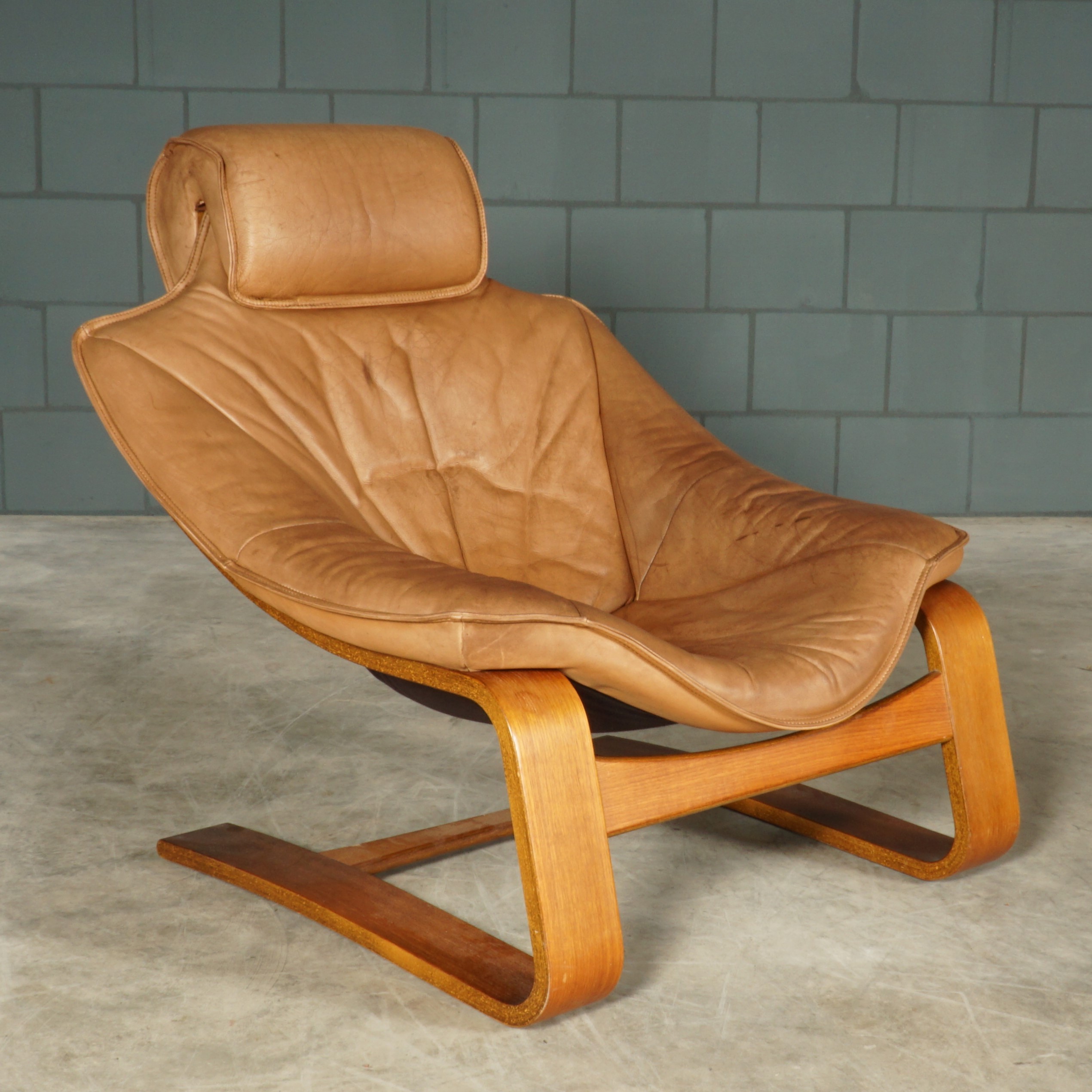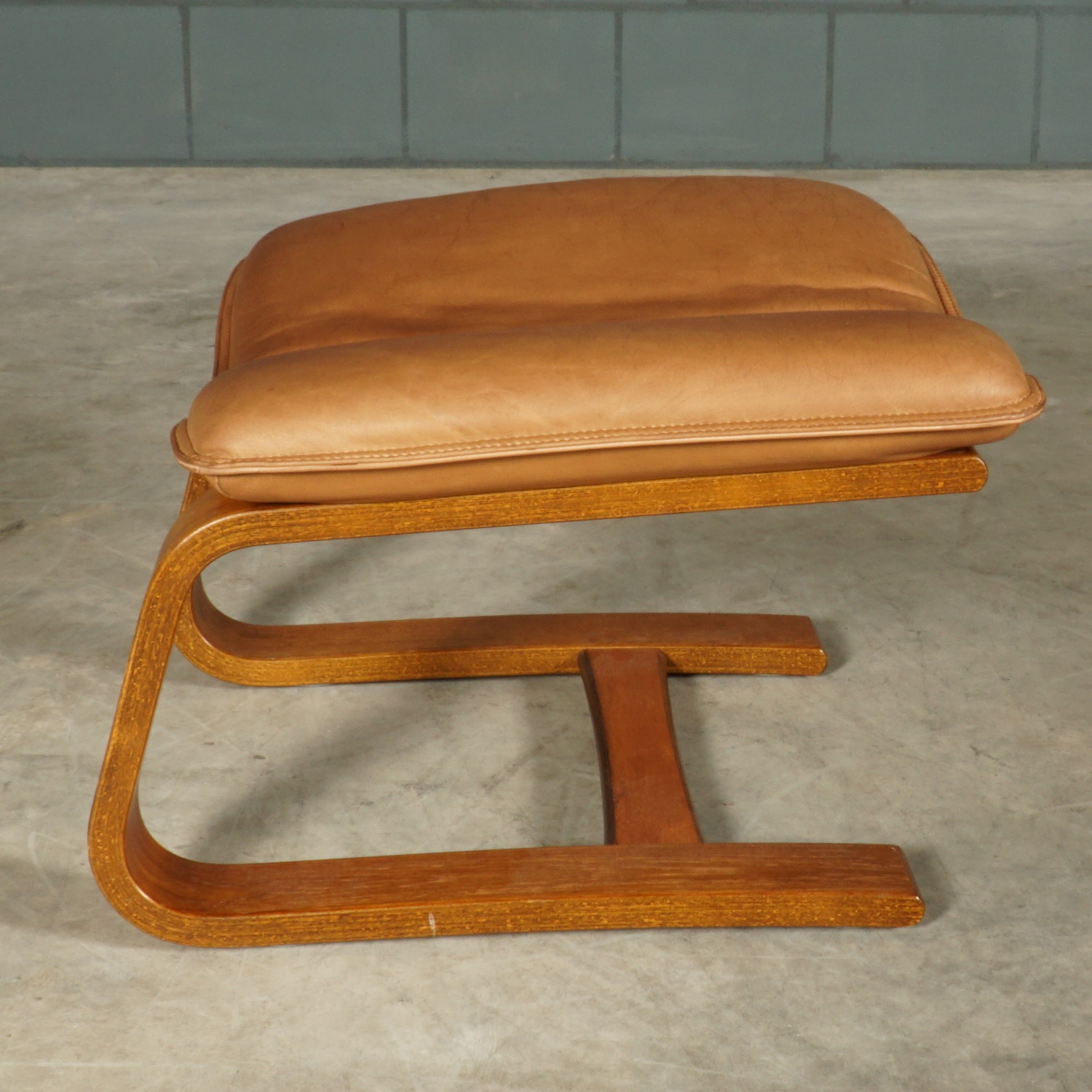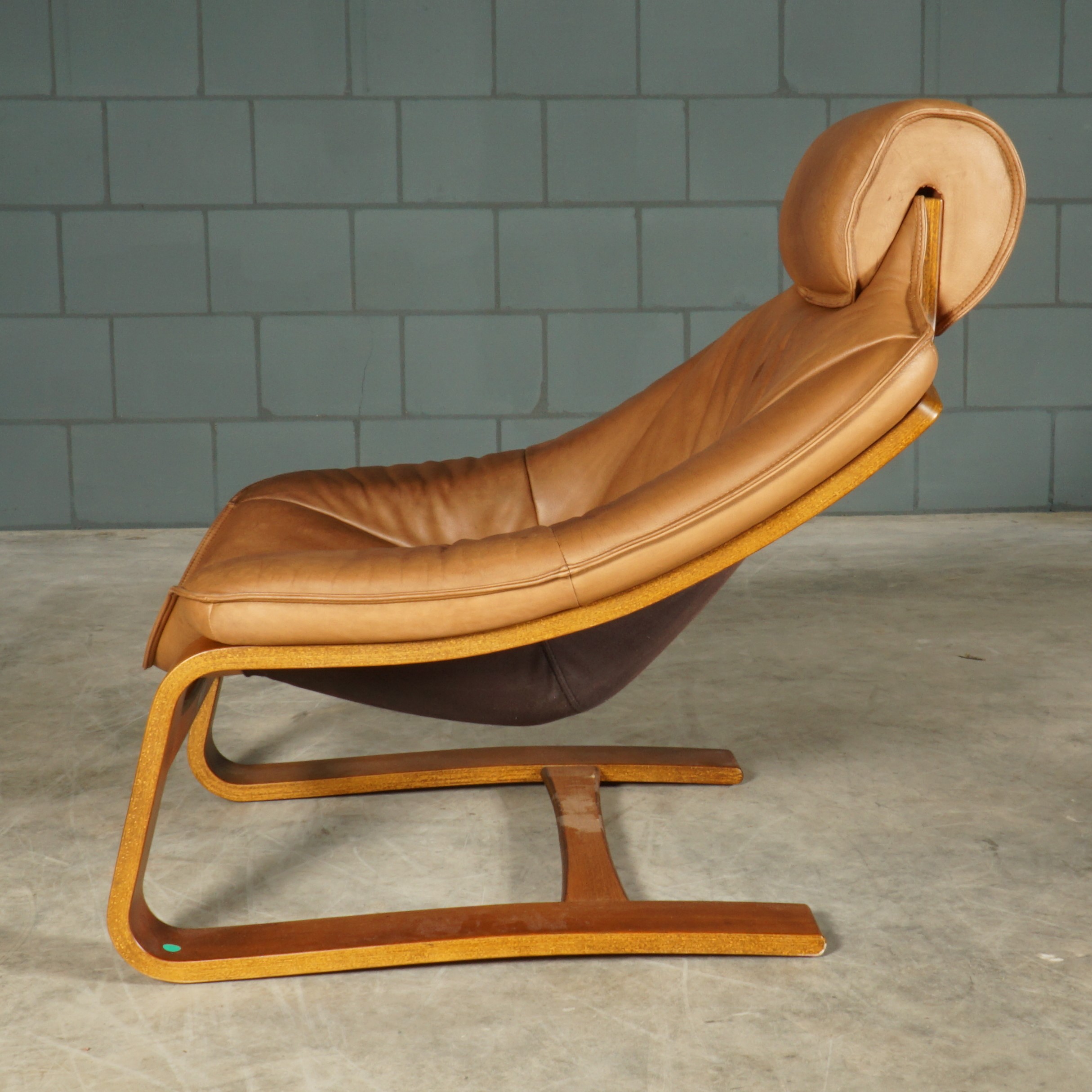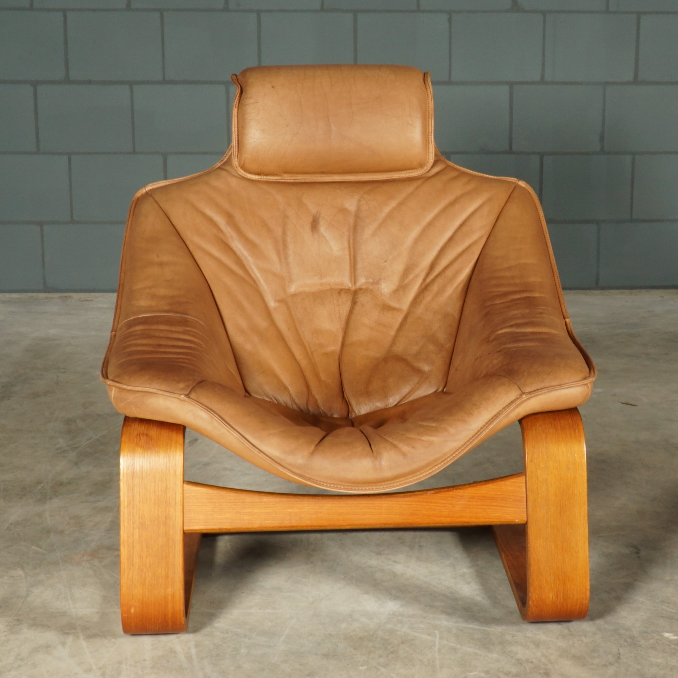 Deze “Kroken” fauteuil is geproduceerd door het bekende Zweedse bedrijf Nelo Möbel en is ontworpen door ontwerper Ake Fribyter. De fauteuil heeft een flexibel teakhouten gebogen frame met lichtbruine/beige lederen bekleding. Door het onmiskenbare ontwerp valt de Kroken-fauteuil op in comfort en design. De fauteuil past zowel in een vintage als in moderne omgeving. De fauteuil is extra luxe vanwege de bijpassende hocker. De fauteuil is in goede vintage staat, met enige vlekken en gebruikssporen (verkleuring) op het leder.