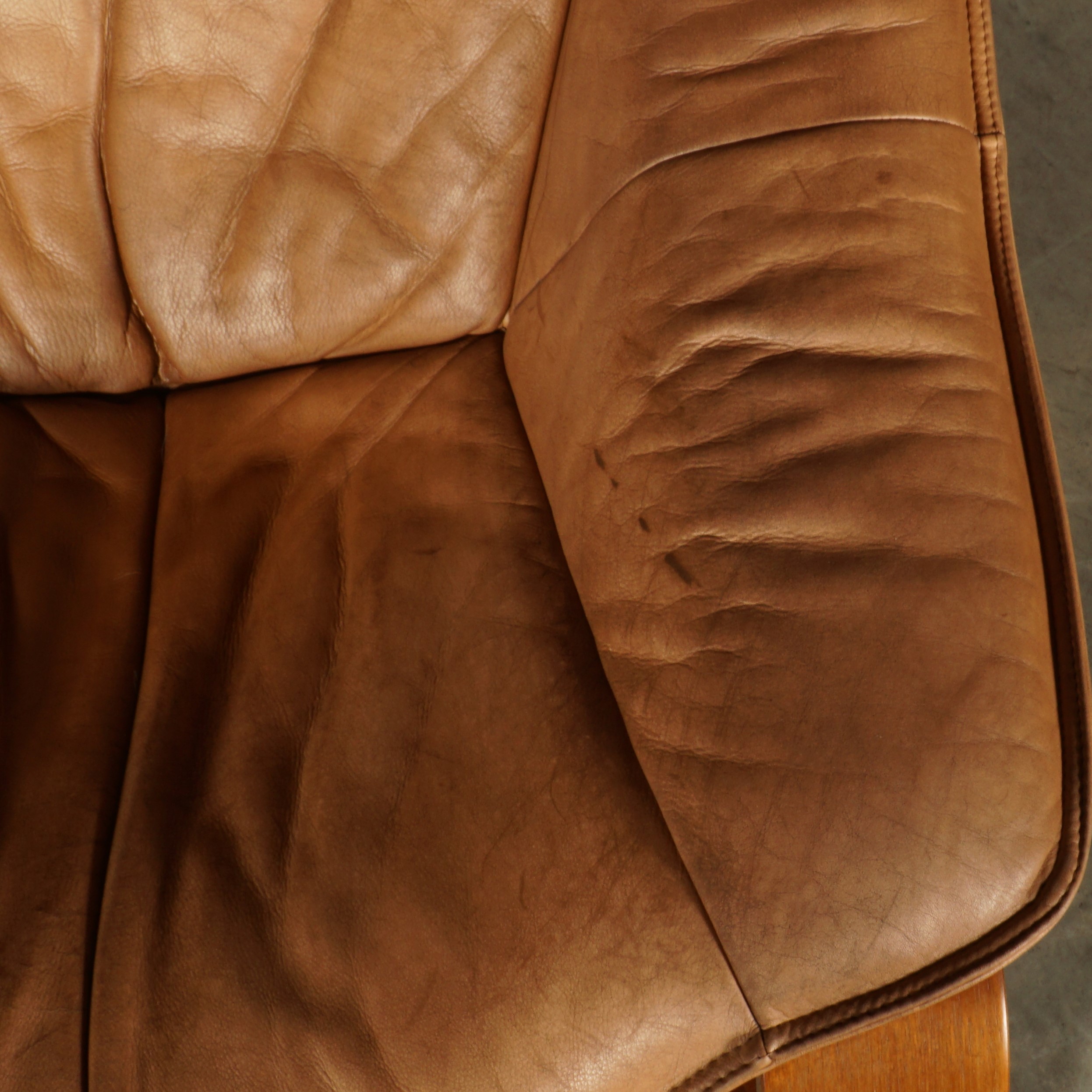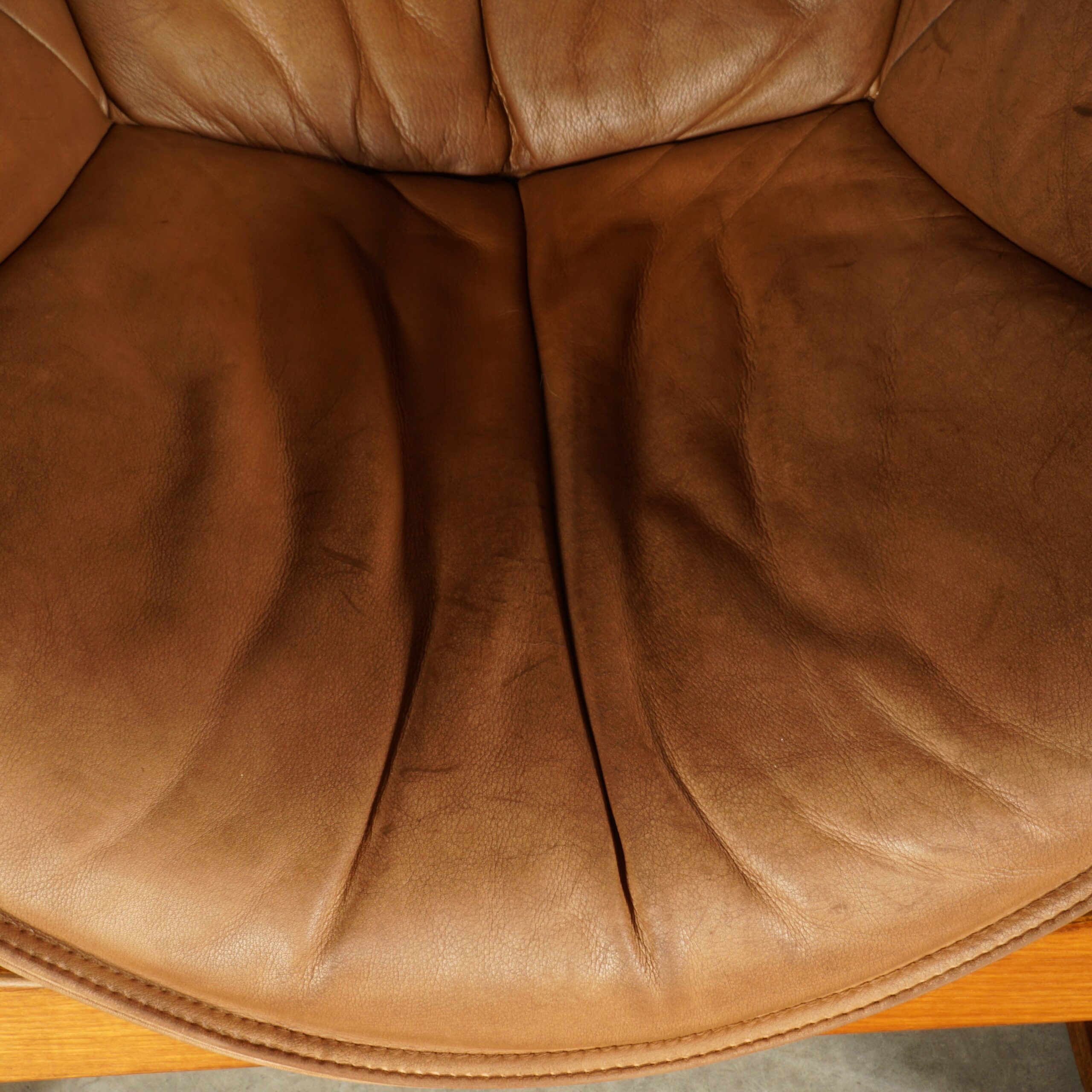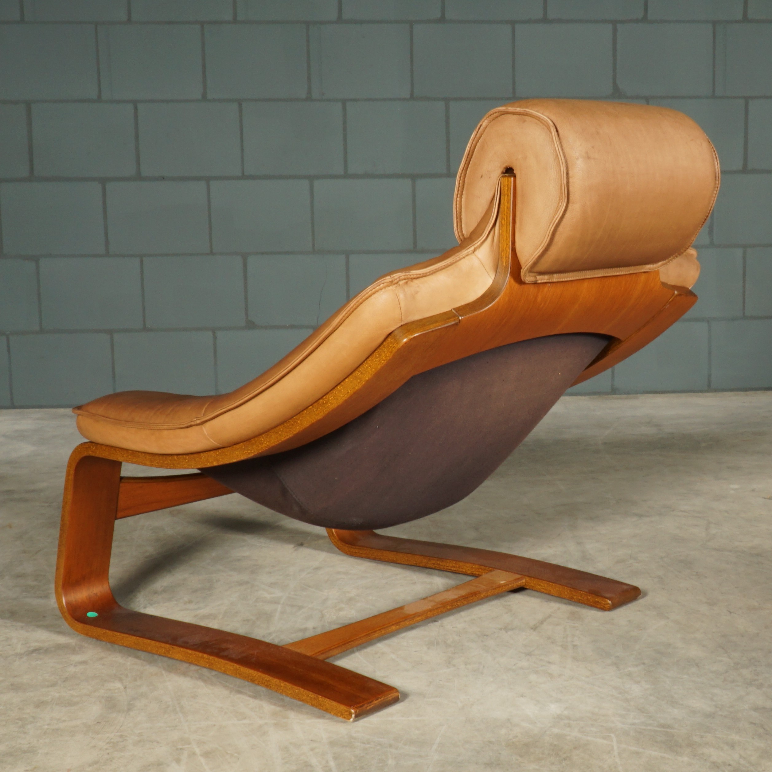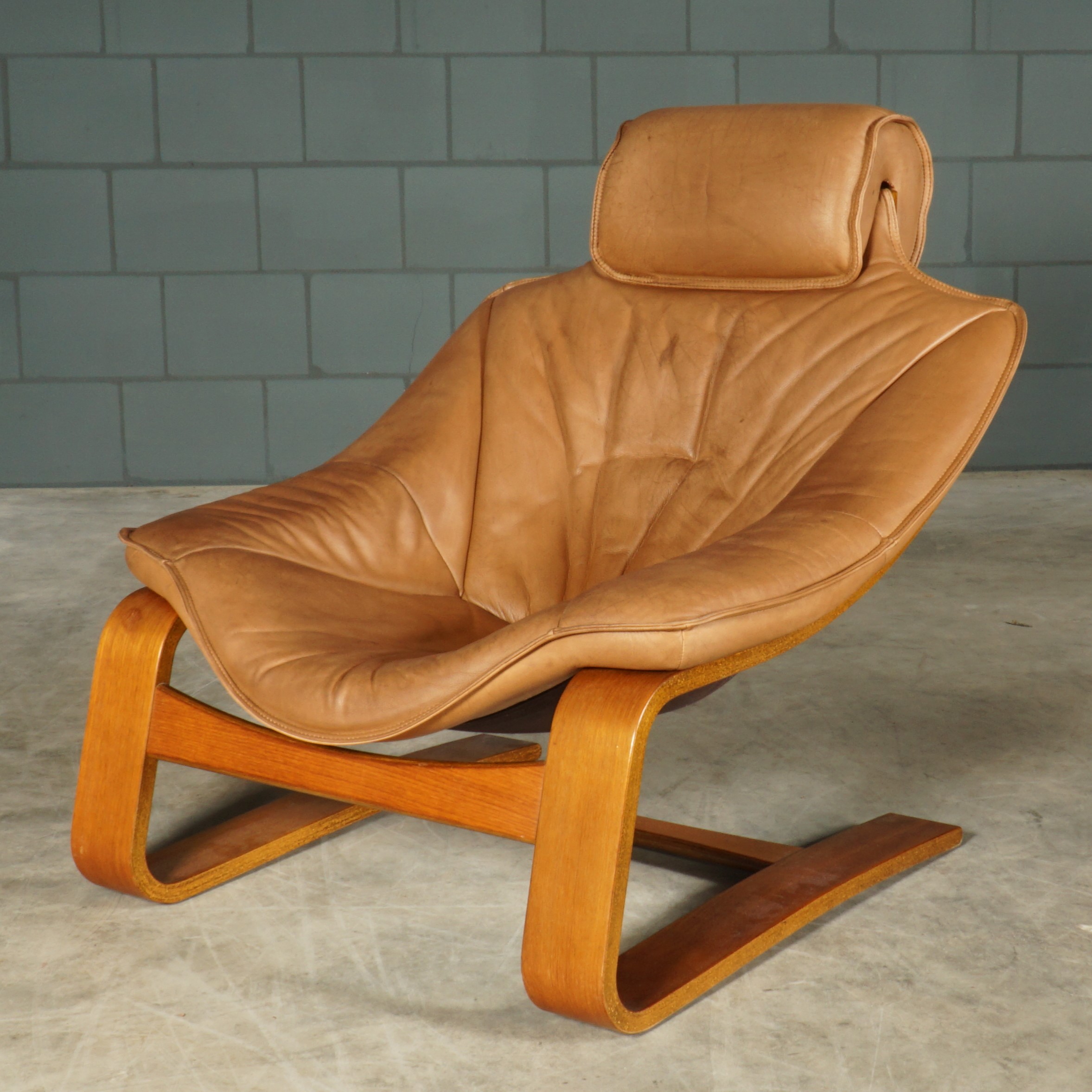 Deze “Kroken” fauteuil is geproduceerd door het bekende Zweedse bedrijf Nelo Möbel en is ontworpen door ontwerper Ake Fribyter. De fauteuil heeft een flexibel teakhouten gebogen frame met lichtbruine/beige lederen bekleding. Door het onmiskenbare ontwerp valt de Kroken-fauteuil op in comfort en design. De fauteuil past zowel in een vintage als in moderne omgeving. De fauteuil is extra luxe vanwege de bijpassende hocker. De fauteuil is in goede vintage staat, met enige vlekken en gebruikssporen (verkleuring) op het leder.
