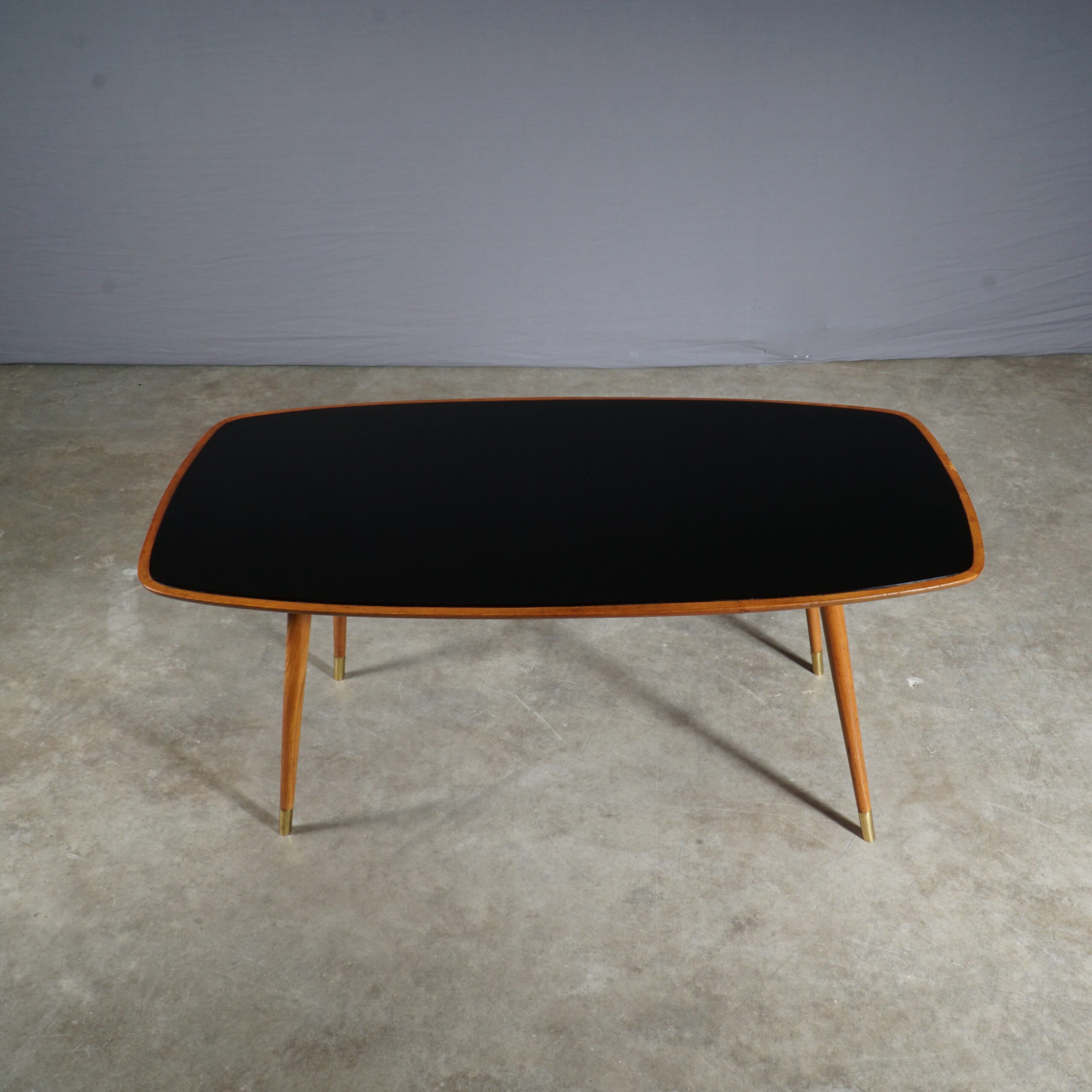 Mooie grote houten salontafel met een zwart glazen bovenblad en schuine poten met koperen voetjes, zo typisch jaren 50! Een elegant vormgegeven salontafel, waarbij het blad in het midden iets breder is en naar de uiteindes iets afloopt. Het hout van het onderstel heeft een mooi warm eiken kleur. De tafel verkeert in mooie vintage staat met slechts lichte gebruikssporen op het blad.