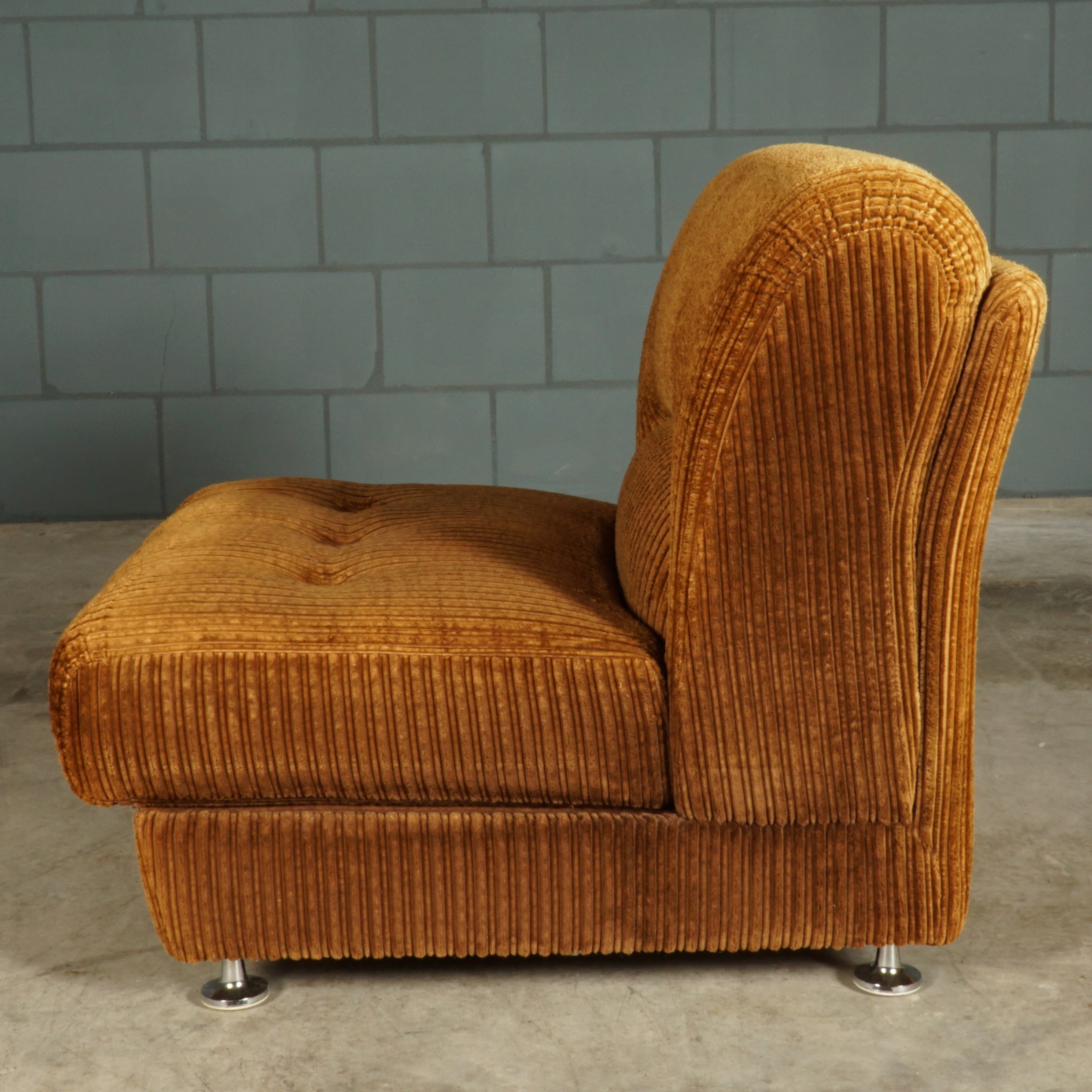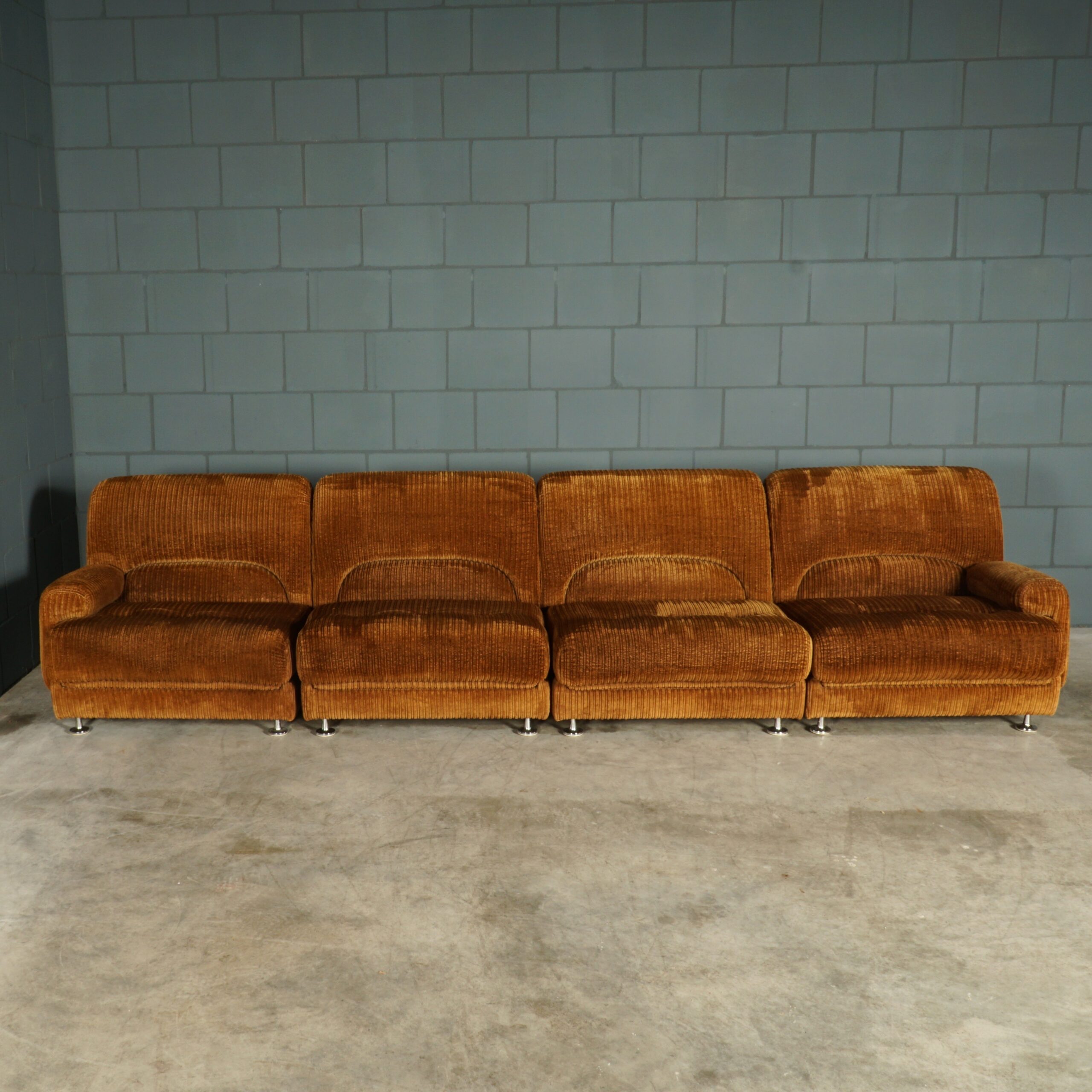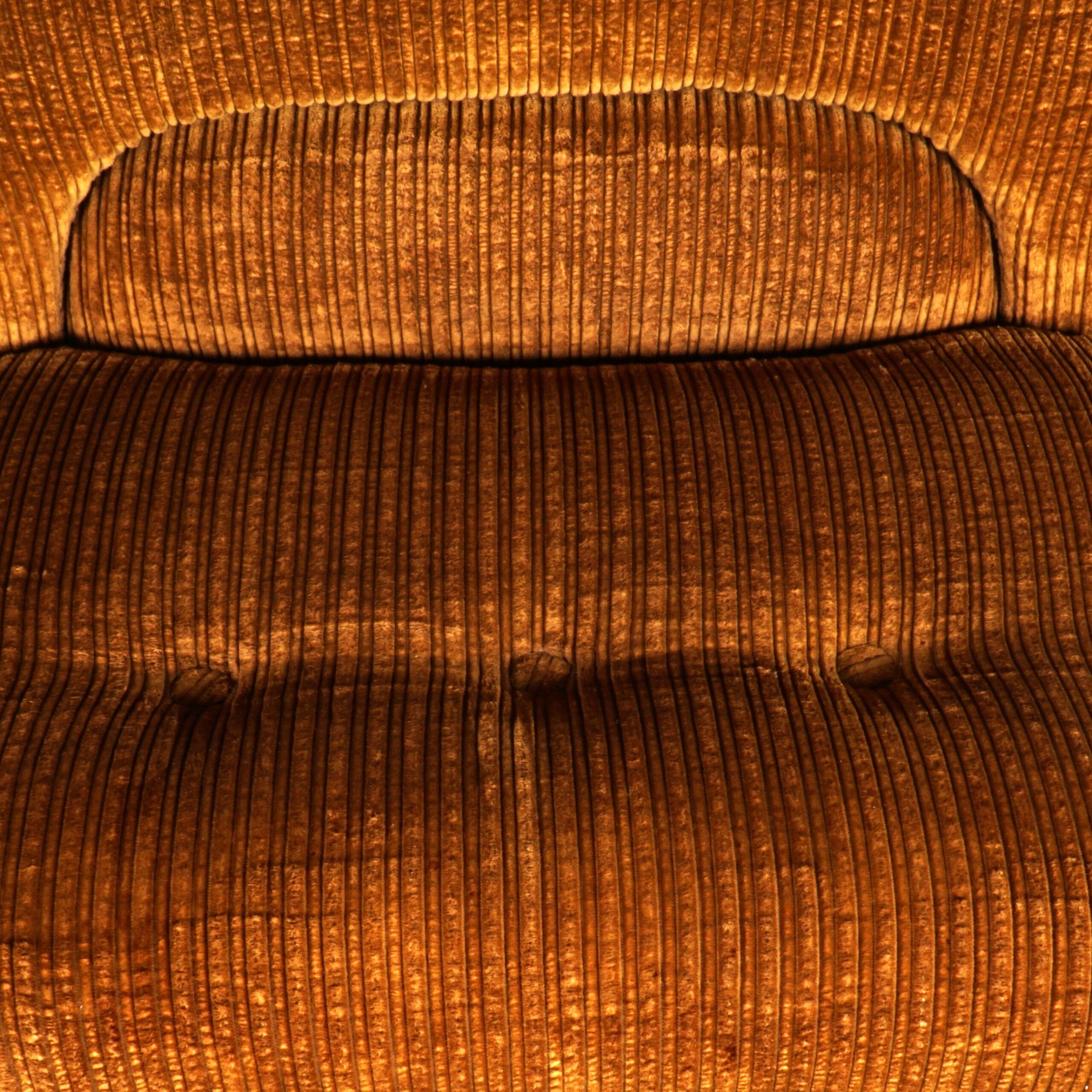 The ultimate seventies couch! Deze prachtige grote loungebank uit de jaren 70, bestaande uit maar liefst vijf elementen, waarvan twee met een armleuning! De bank is modulair, rondom gestoffeerd en naar wens in te delen! Deze vintage bank heeft nog de stijlvolle originele bruine ribstof. Deze bank is meteen bij binnenkomst een echte eye-catcher. Passend in een grote loft, woonkamer of hotel lobby! De bank zit fantastisch, de stof is lekker zacht en er is meer dan genoeg ruimte om er met meerdere personen op te chillen. De bank verkeert in een prachtstaat, zonder vlekken, gaten of vreemde geuren.