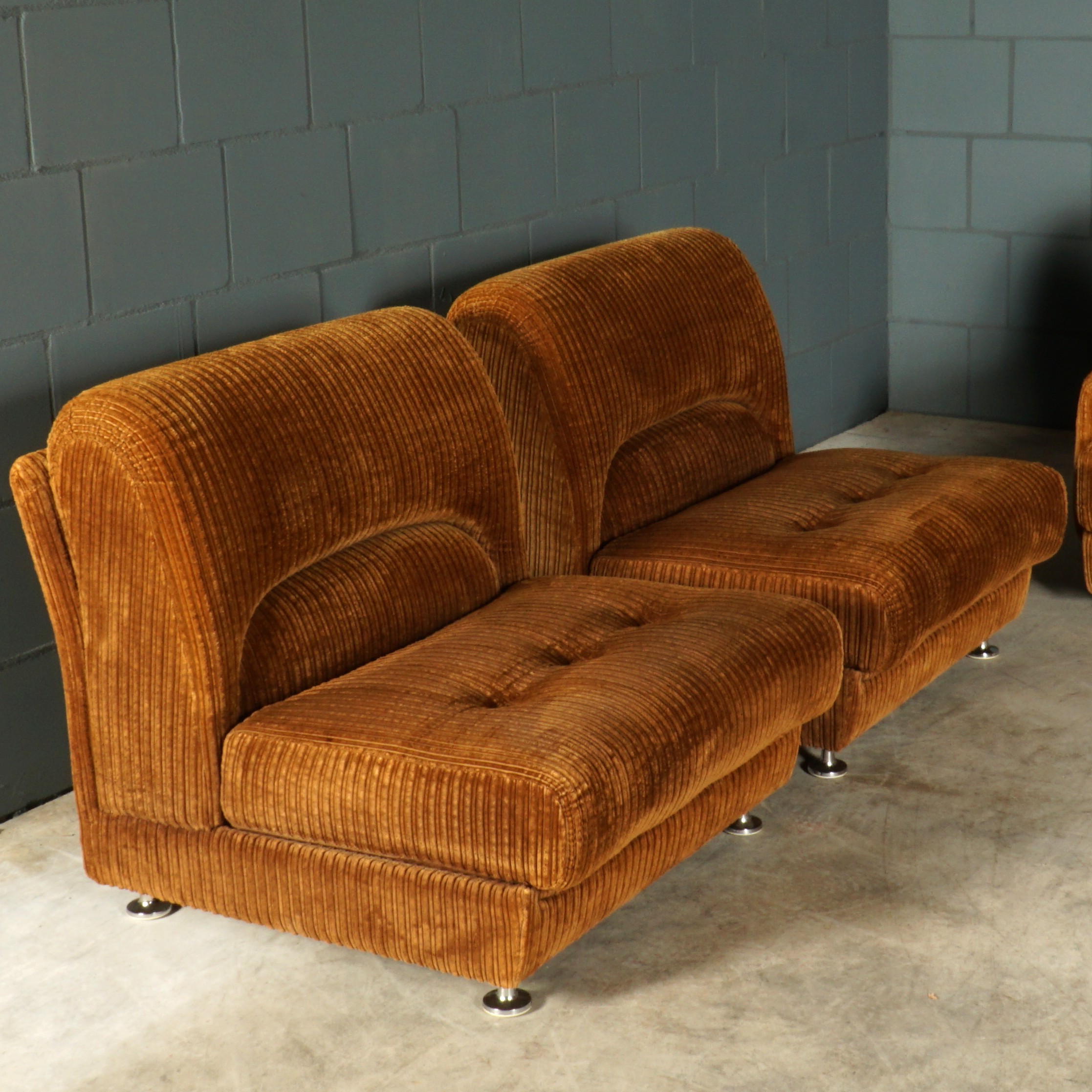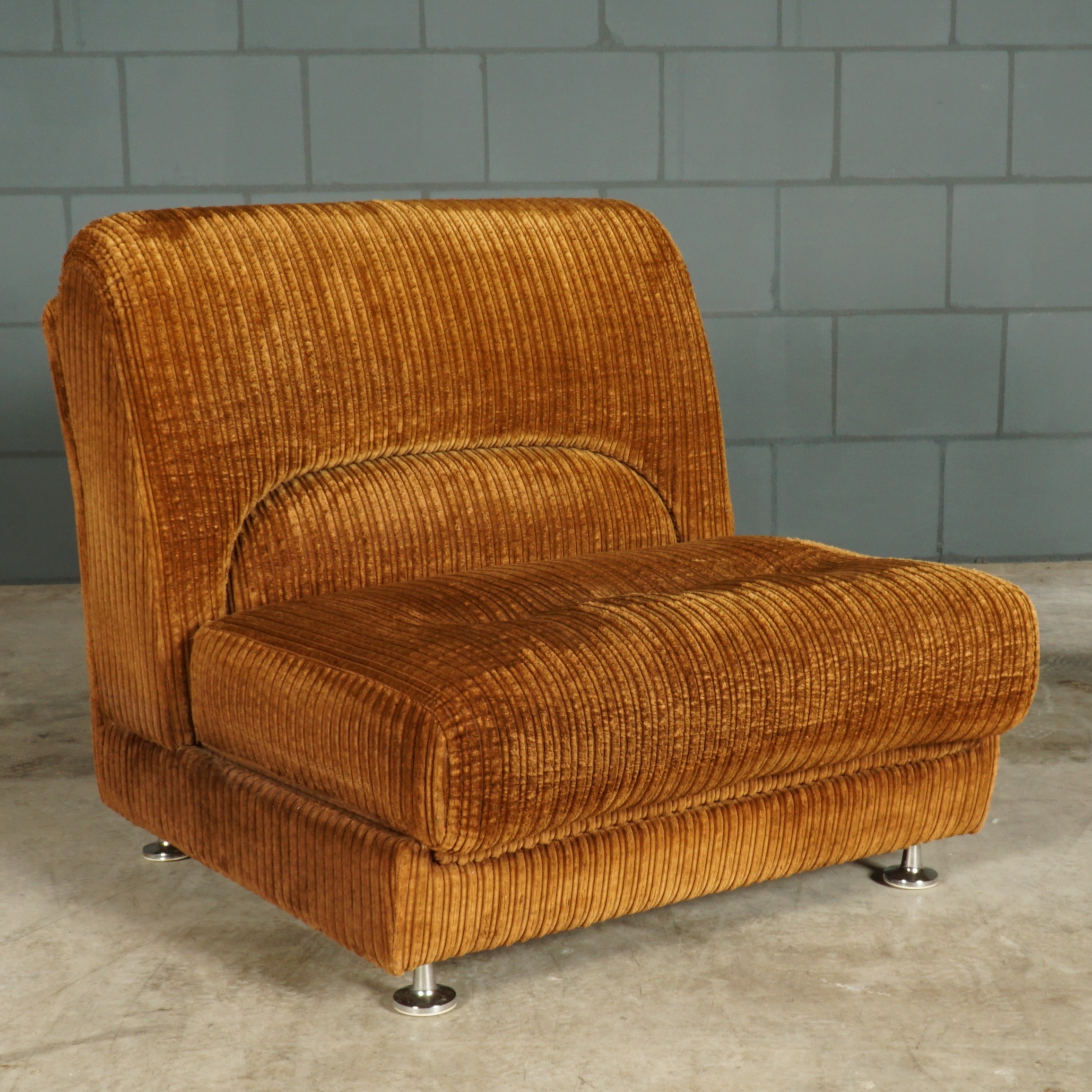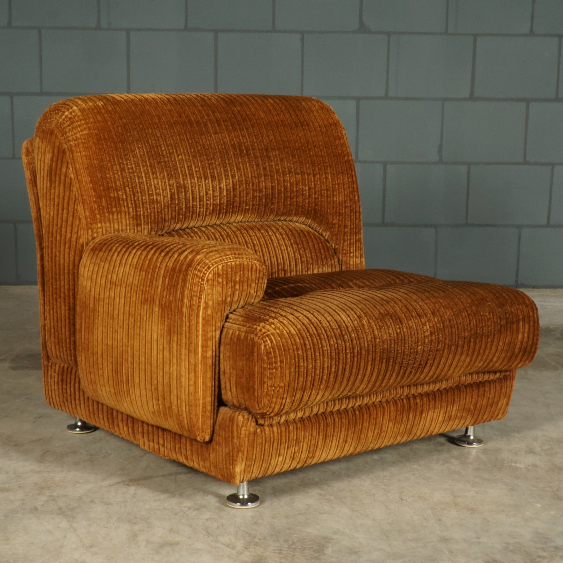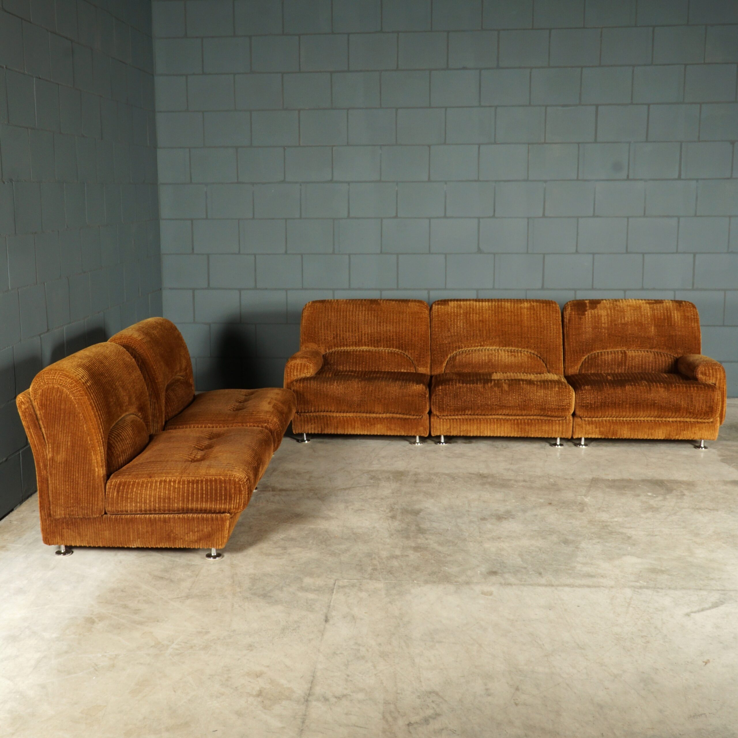 The ultimate seventies couch! Deze prachtige grote loungebank uit de jaren 70, bestaande uit maar liefst vijf elementen, waarvan twee met een armleuning! De bank is modulair, rondom gestoffeerd en naar wens in te delen! Deze vintage bank heeft nog de stijlvolle originele bruine ribstof. Deze bank is meteen bij binnenkomst een echte eye-catcher. Passend in een grote loft, woonkamer of hotel lobby! De bank zit fantastisch, de stof is lekker zacht en er is meer dan genoeg ruimte om er met meerdere personen op te chillen. De bank verkeert in een prachtstaat, zonder vlekken, gaten of vreemde geuren.