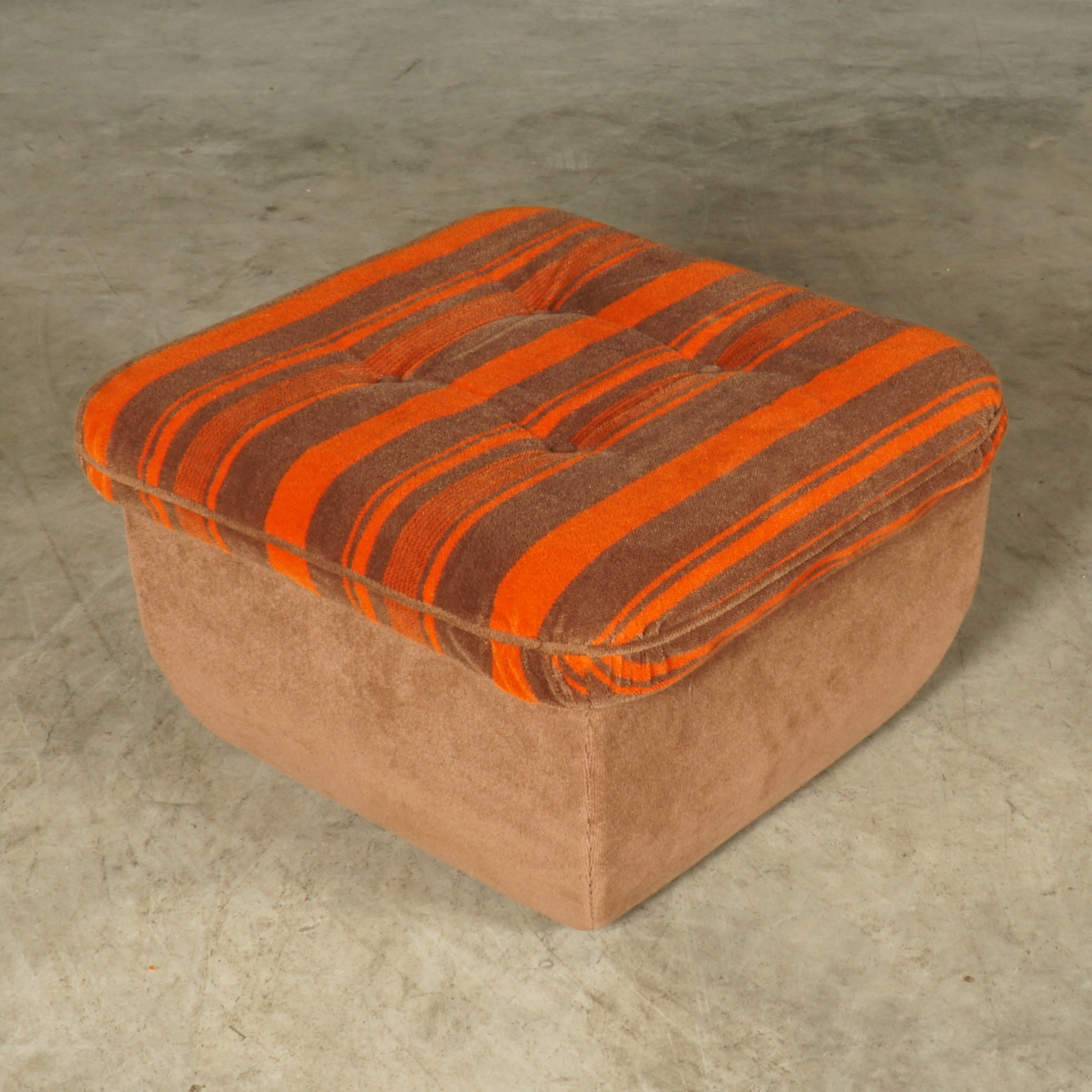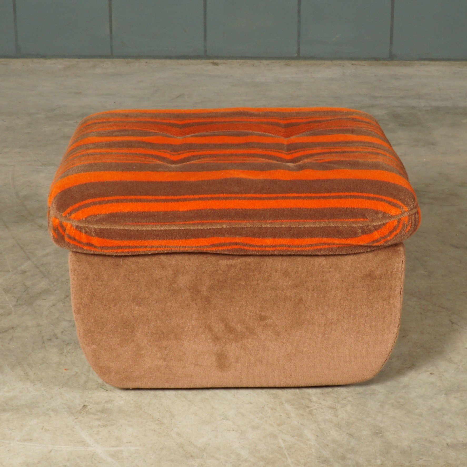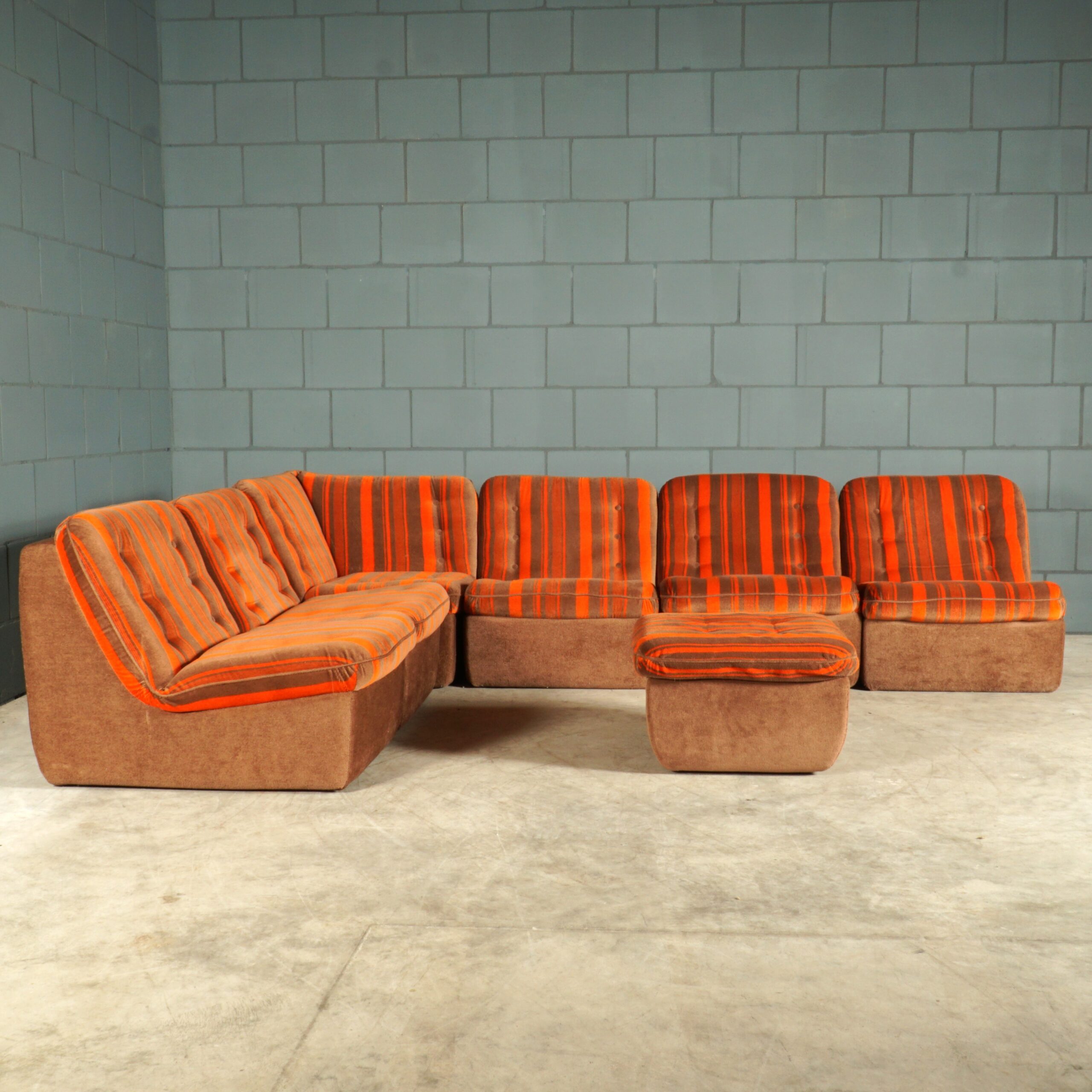 Back to the seventies met deze prachtige modulaire loungebank uit de jaren 70! De set is modulair, rondom gestoffeerd en is helemaal naar wens in te delen! Deze vintage zithoek bevat maar liefst zes zitelementen en een hocker. De set heeft nog de voor die tijd zo typerende veloursstof in bruin en oranje, welke zorgt voor de nodige kleur in je interieur. De set is meteen bij binnenkomst een echte eye-catcher. Passend in een grote loft, woonkamer, café of hotel lobby! De set zit fantastisch, de stof is lekker zacht en er is meer dan genoeg ruimte om er met meerdere personen op te chillen. De set verkeert in een absolute prachtstaat met maar enkele zeer lichte gebruikssporen. De set heeft een lichtgewicht binnenwerk, waardoor de elementen gemakkelijk zijn te tillen en te verschuiven.