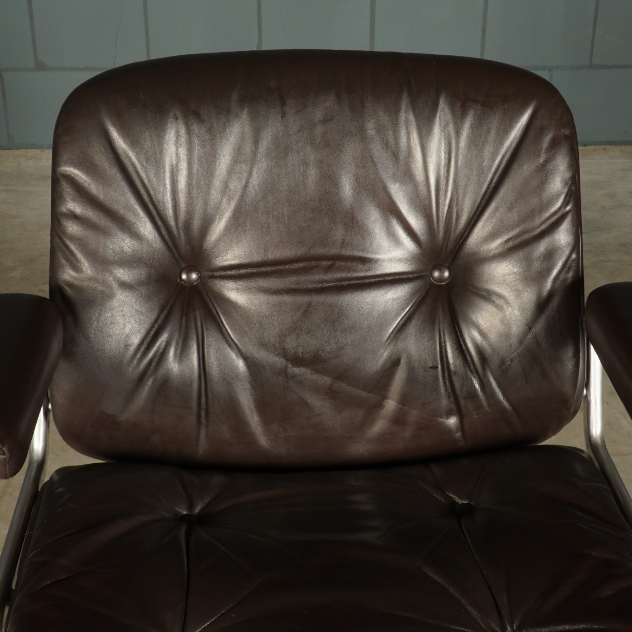 Deze bijzonder comfortabele bureaustoel is in de jaren zestig door productontwerper Karl Dittert voor Stoll Giroflex ontworpen en is uitgegroeid tot een klassieker. Ditter werkte als leraar, professor en oprichtend rector aan wat nu de Schwäbisch Gmünd University of Design is. Zijn werken zijn veelvuldig bekroond en worden internationaal getoond in gerenommeerde musea (o.a. MOMA/ New York, Design Center/Stuttgart). Stoll is een meubelfabrikant die zich sinds de jaren 1870 heeft gespecialiseerd in de productie van kantoormeubilair. De stoel heeft kussens van prachtig donkerbruin leder met tevens een rugleuning en zitschaal van bruin leder. De stoel is echt in prachtstaat met slechts zeer lichte gebruikssporen. Het draaimechanisme van de fauteuil werkt soepel evenals de rolletjes.