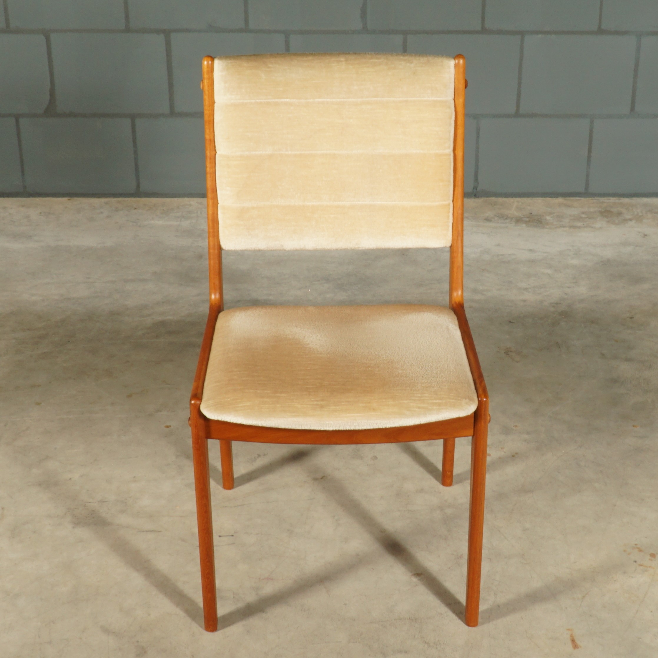 Een prachtige midcentury eetkamerset – Deense stijl – bestaande uit een rechthoekige tafel en vier bijpassende stoelen, gemaakt van massief teakhout. De vier prachtige stoelen zijn bekleed met een dikke kwalitatieve crèmekleurige velours stof. De zit is heel comfortabel, waardoor een avondje tafelen een waar genot is met deze set. Zowel de tafel als de stoelen zijn in uitmuntende staat met slechts enkele lichte gebruikssporen.