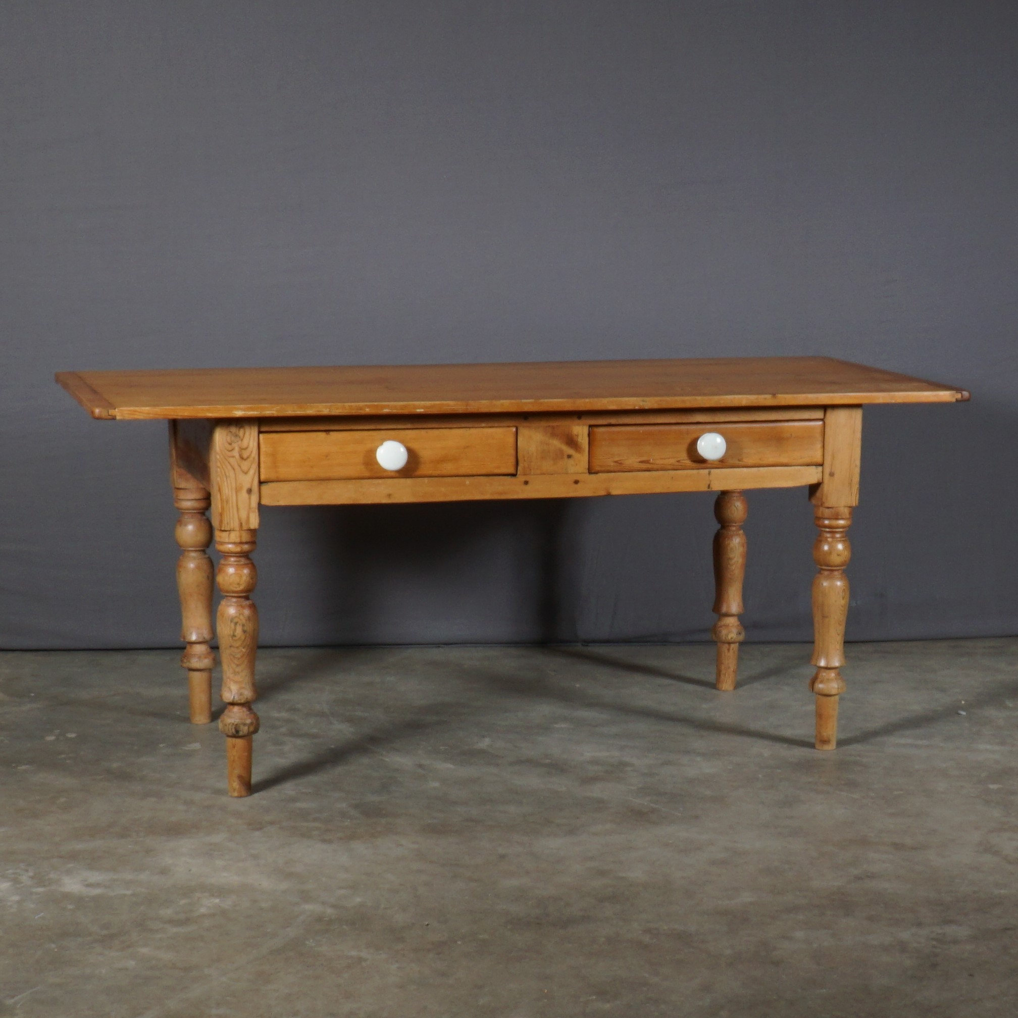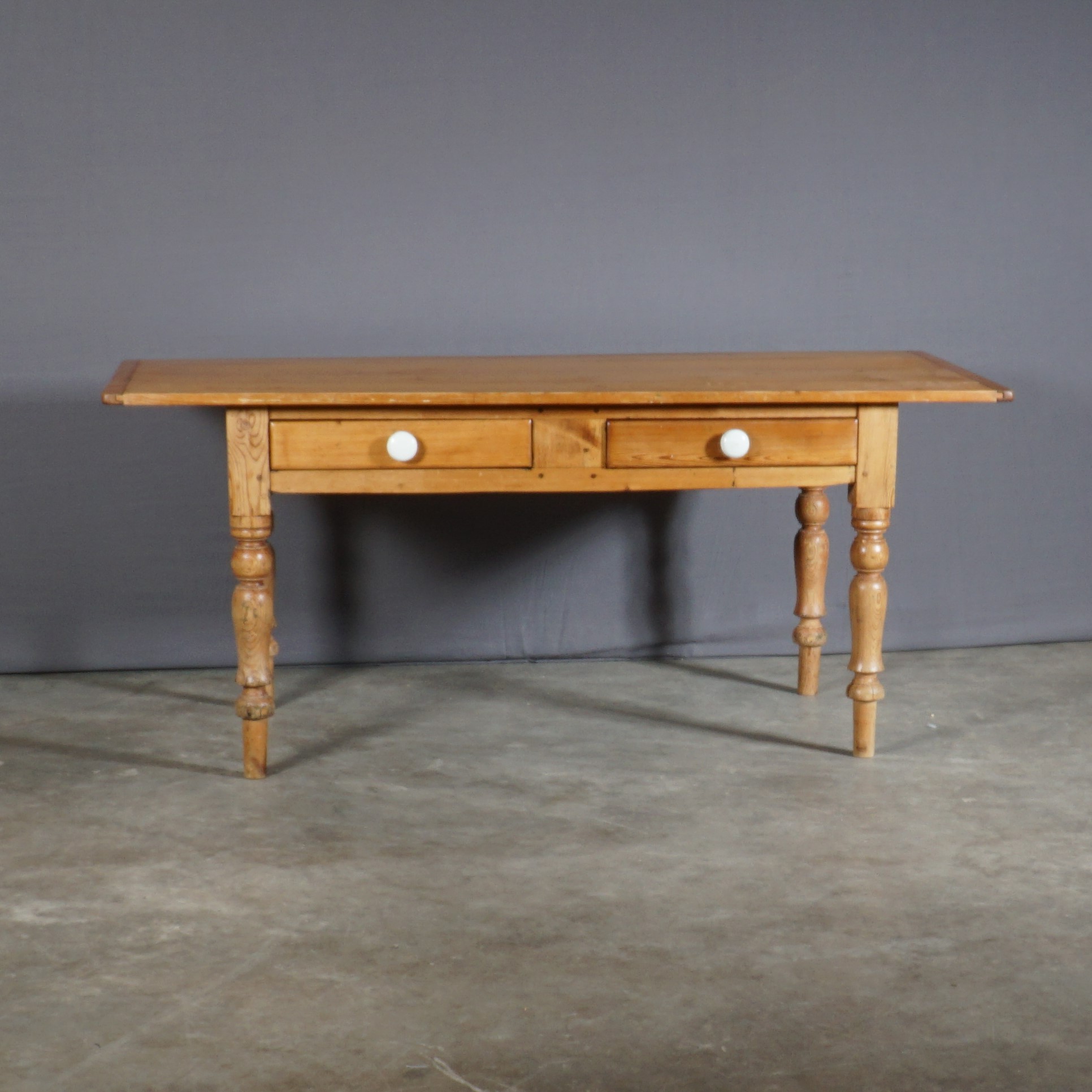 Een robuuste, stoere grenen eettafel uit omstreeks 1900, met twee lades aan de zijkant. Het ambachtelijke vakmanschap spat eraf bij deze tafel met zijn mooi afgewerkte ronde poten. De tafel heeft een stoere minimalistische uitstraling en combineert fantastisch met vele interieurstijlen.
