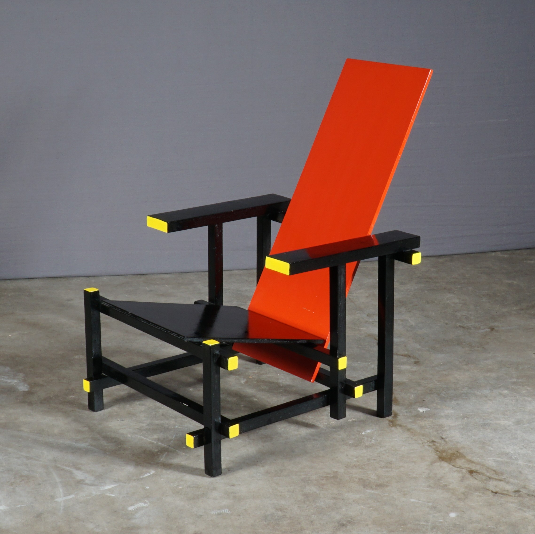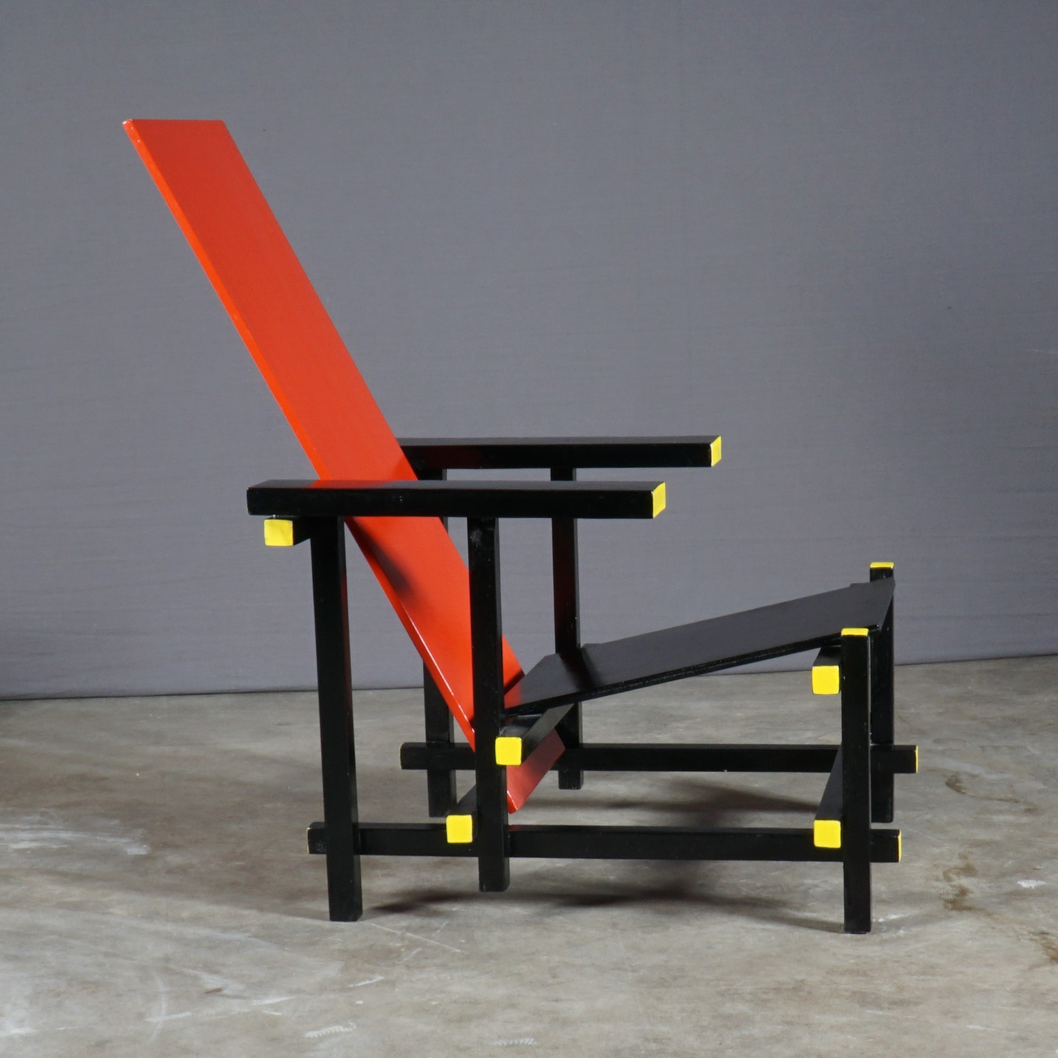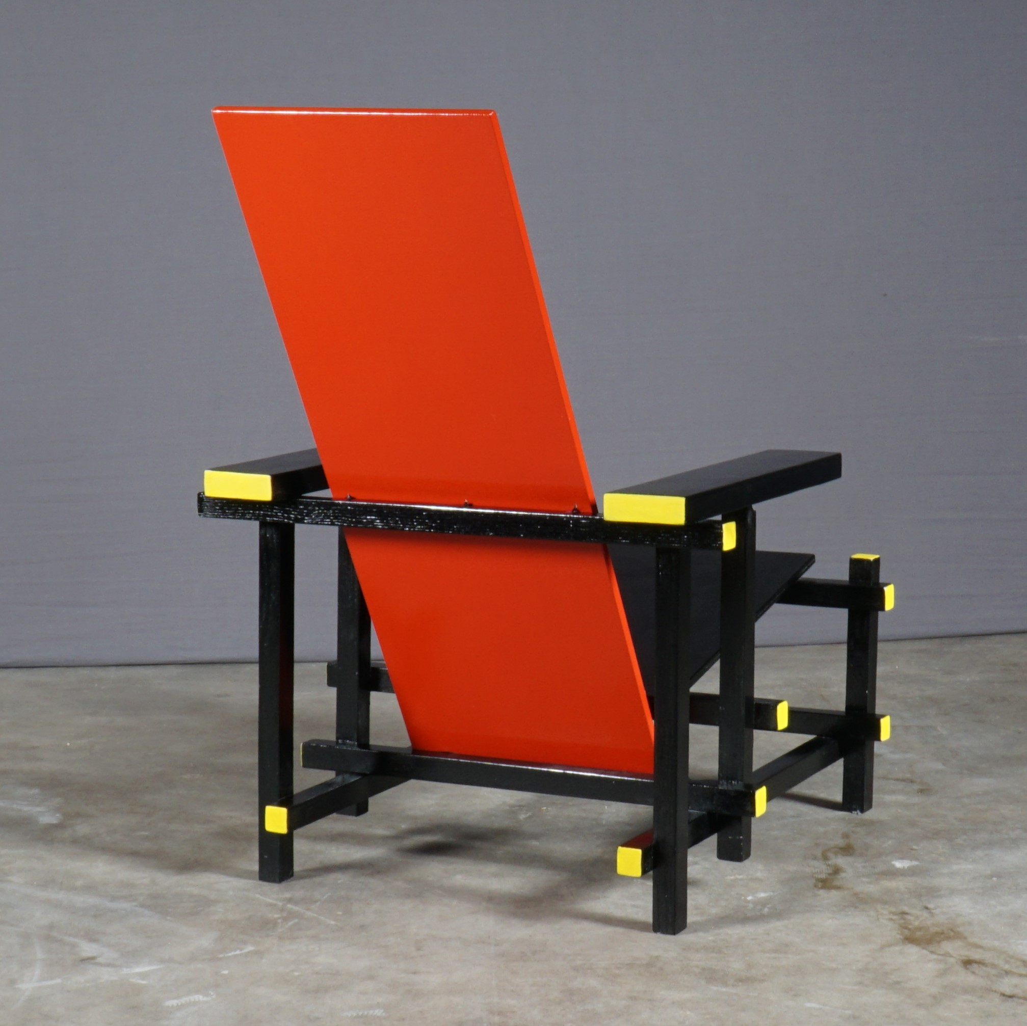 Deze stoel is Rietvelds bekendste meubel. Rietvelds eerste ontwerp van deze stoel dateert uit 1917 waarna hij het eerste prototype in 1918 maakte. Met deze leunstoel reduceerde Rietveld de traditionele armstoel tot 13 latten met een vierkant profiel, twee armleuningen met een rechthoekig profiel en twee rechthoekige panelen die de zitting en leuning vormen. Dit betreft een replica stoel in zeer nette vintage staat.