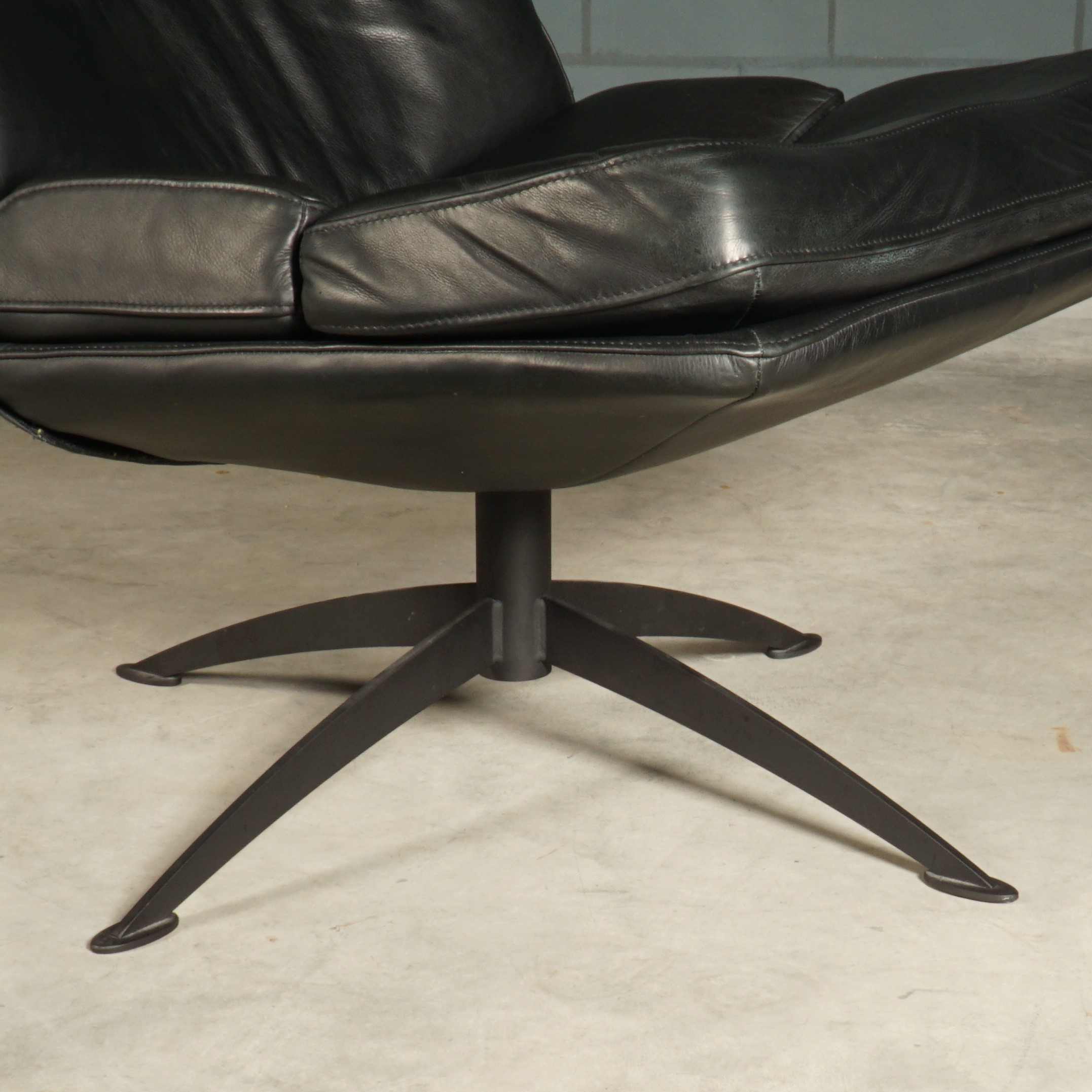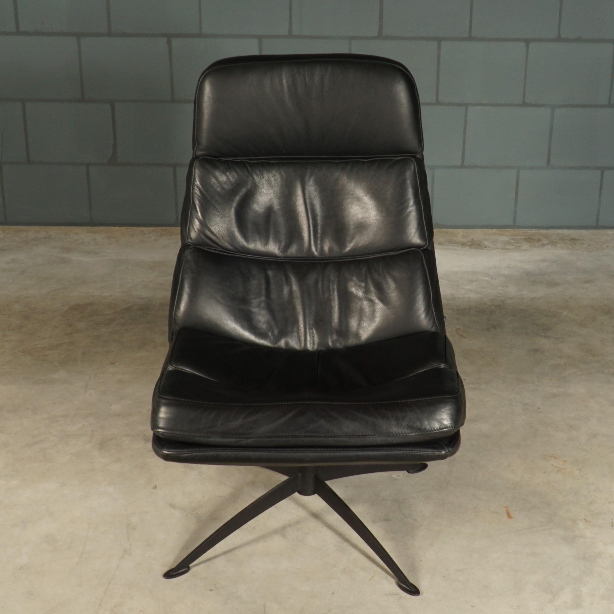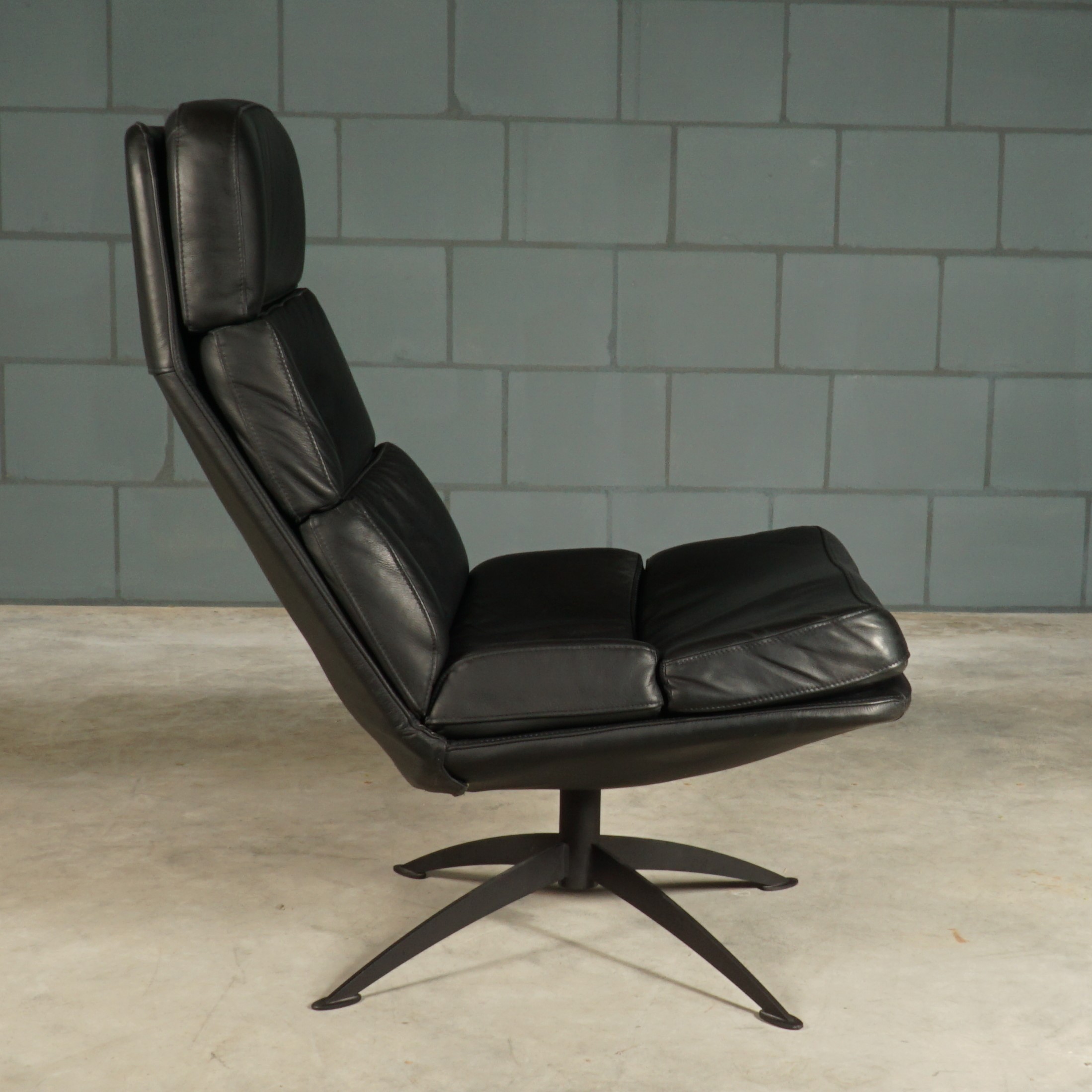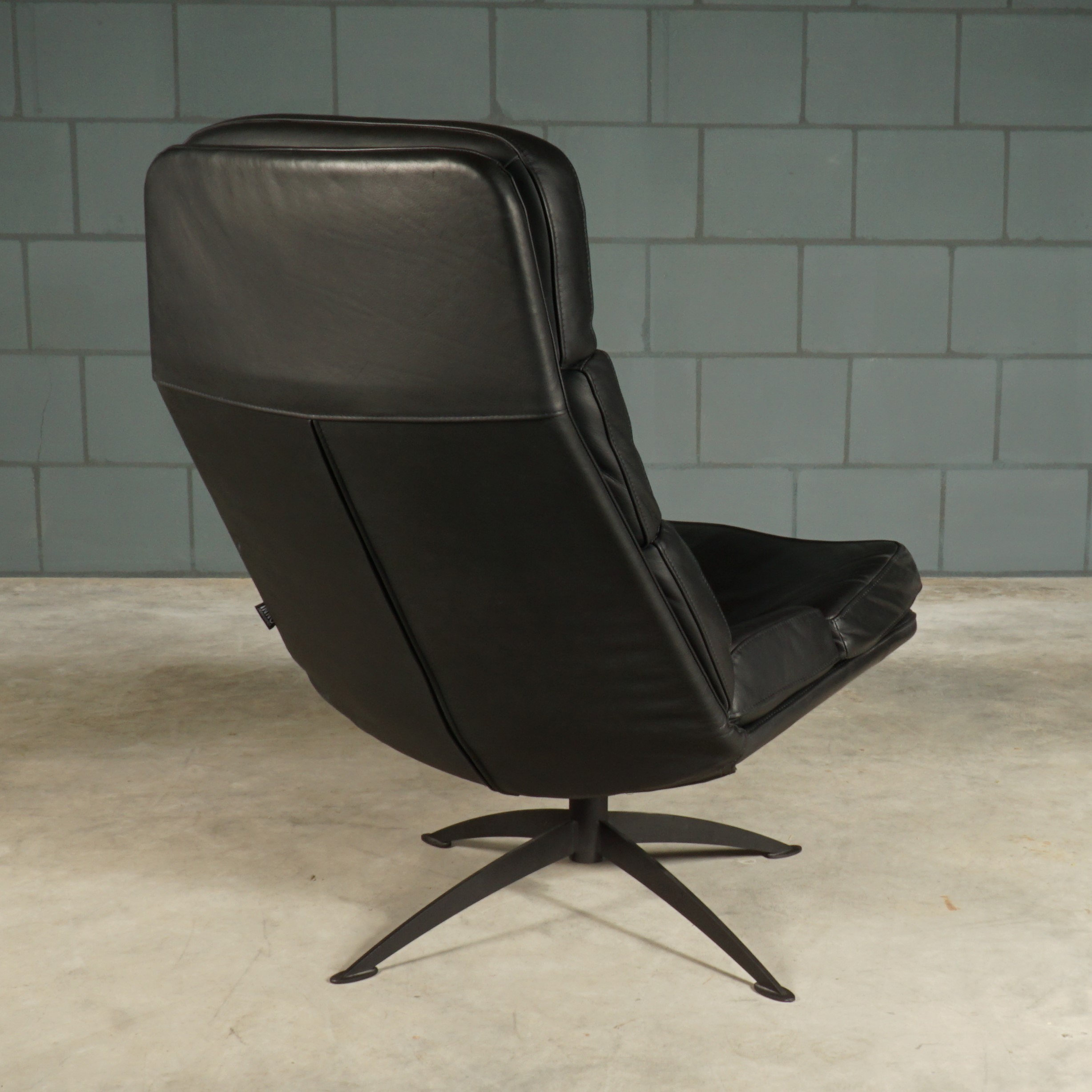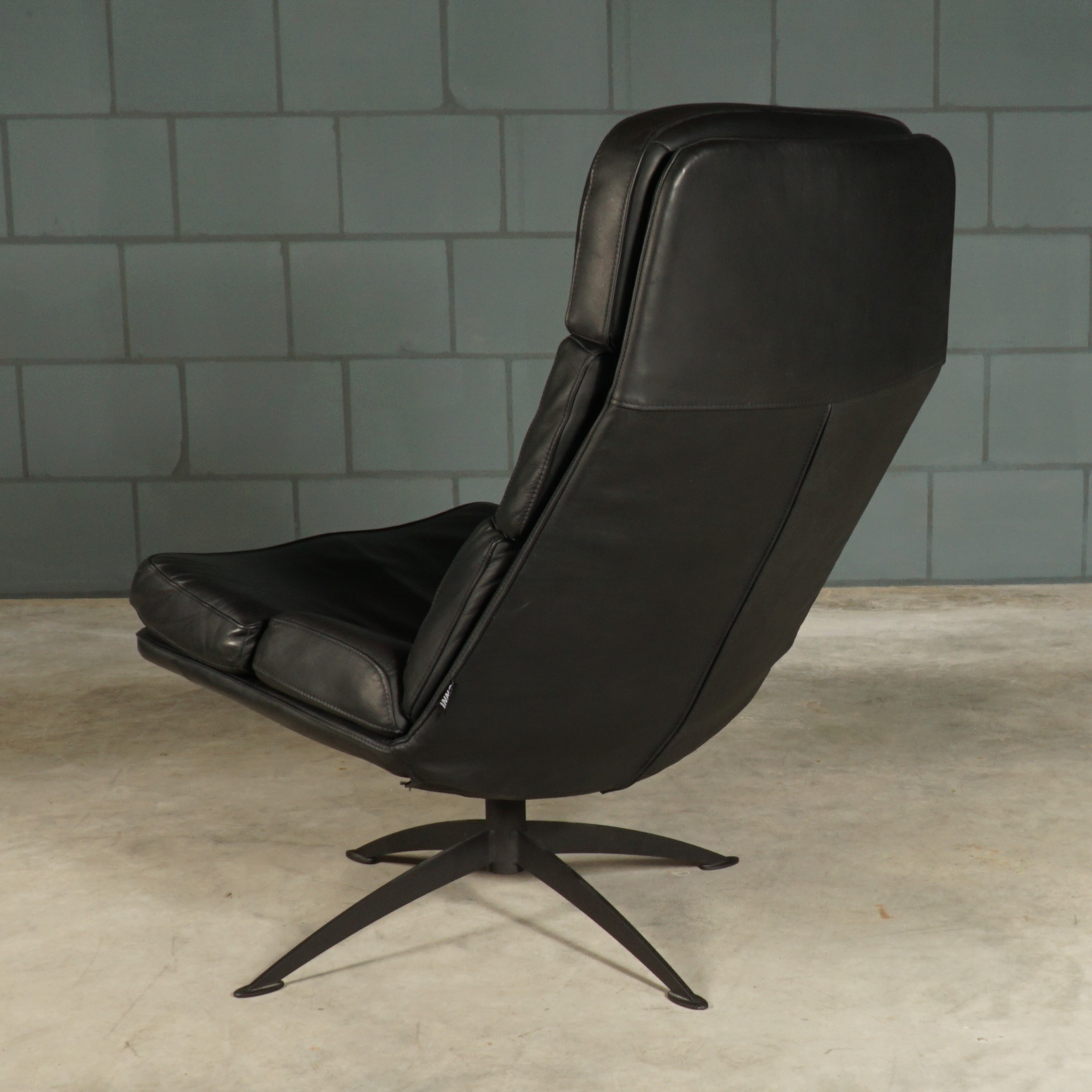 Deze zwart lederen draaifauteuil van Inno zitmeubelen is een industriële draaifauteuil waarbij het ontwerp gebaseerd is op invloeden uit de jaren zestig van de vorige eeuw. Met zijn comfortabele koudschuim zitvulling is dit een fauteuil waar je niet meer uit weg wilt. Zet deze mooie fauteuil dan ook op een plekje waar u lekker tot rust kan komen in een heerlijke relaxfauteuil. Door de hoge rugleuning geeft de fauteuil een extra stukje comfort. De fauteuil heeft een zwart metalen onderstel. De fauteuil is in prachtige staat met slechts enkele zeer lichte gebruikssporen.