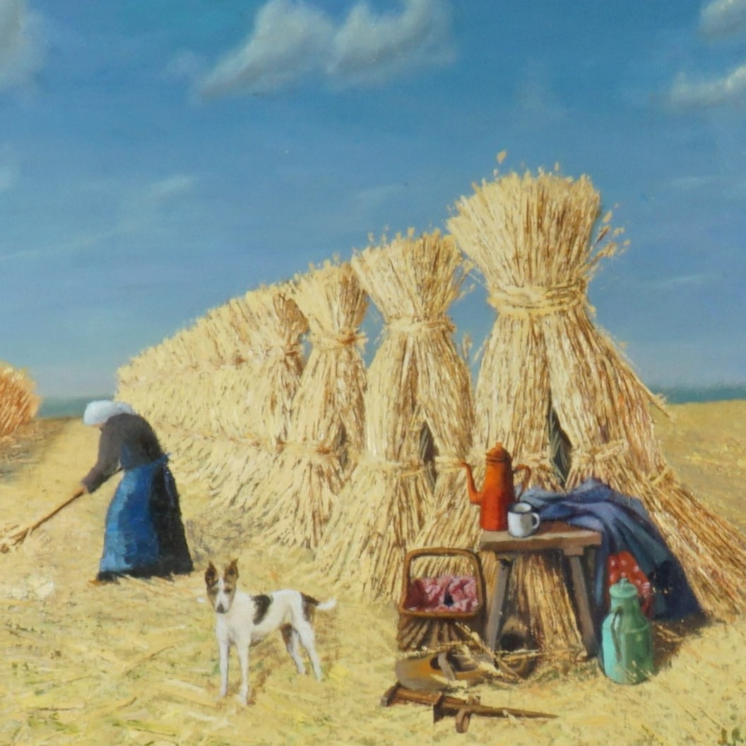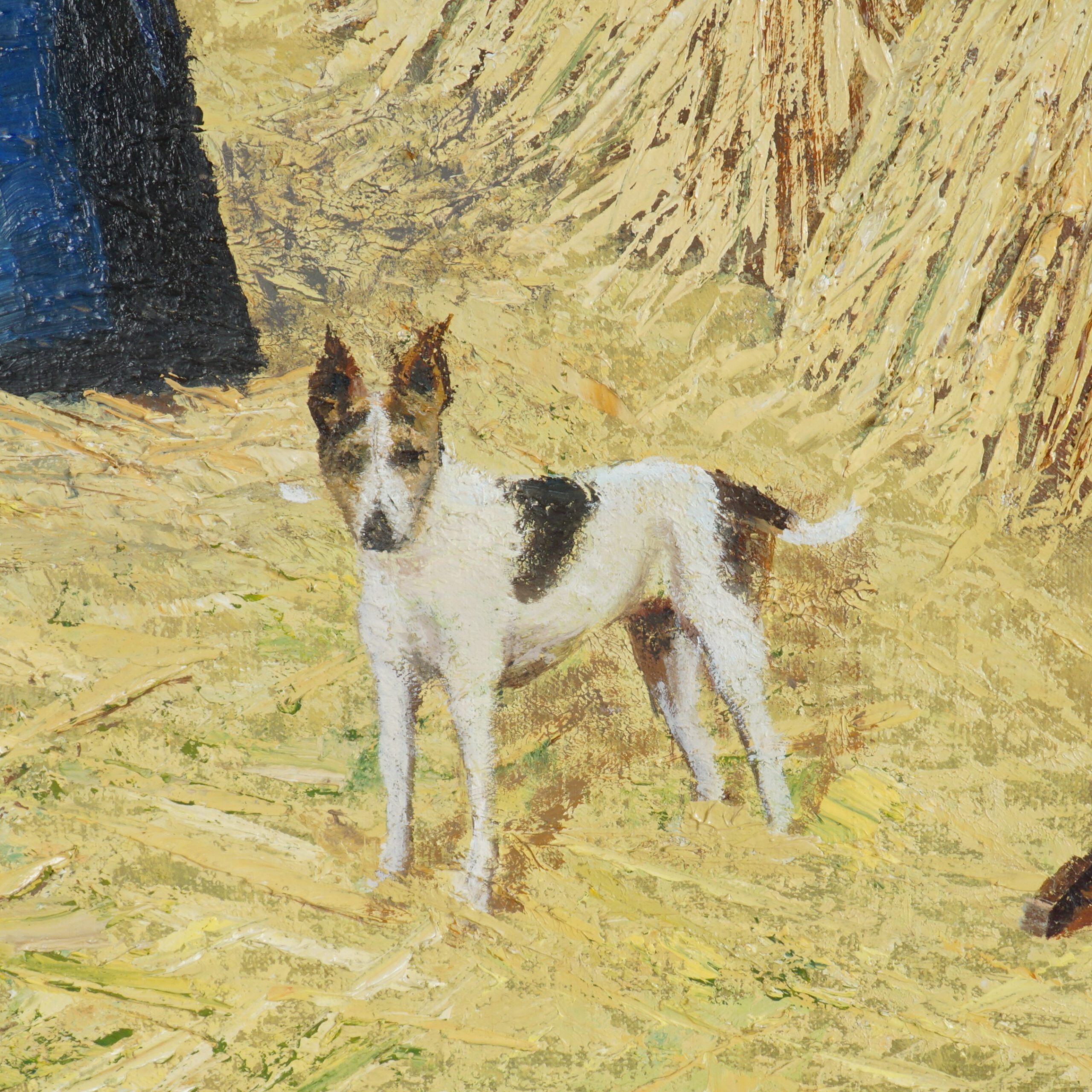 Prachtig olieverfschilderij van de Belgische schilder J. Renders. Een mooi kleurrijk schilderij met veel details. Voor de balen hooi is veel verf gebruikt, waardoor het schilderij veel reliëf heeft. Een fantastisch juweeltje voor aan de muur!