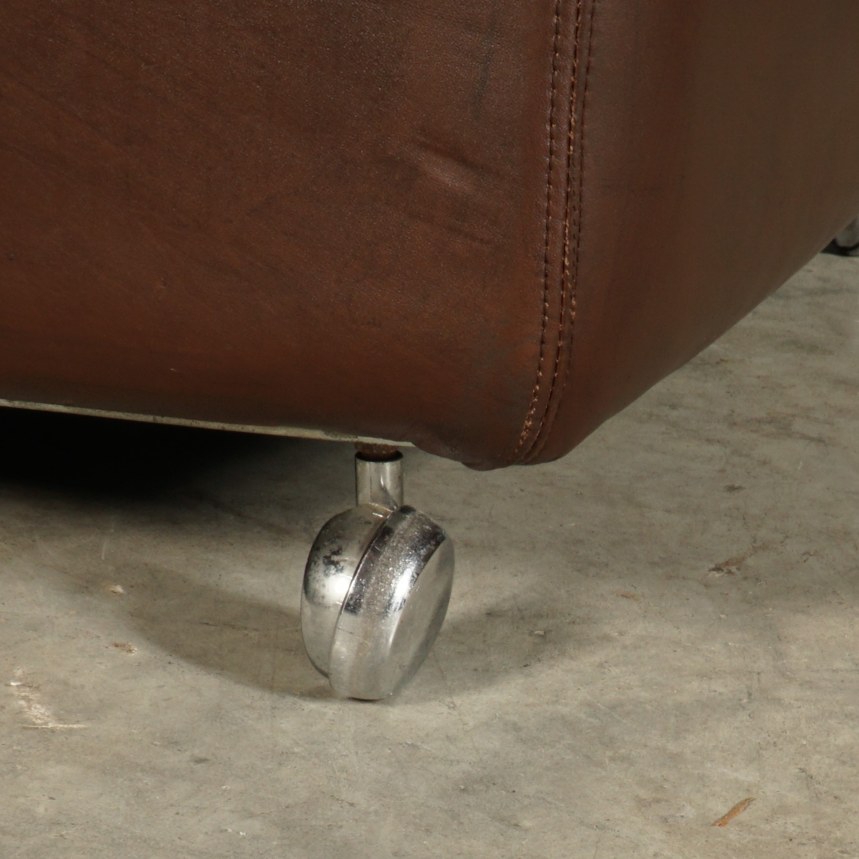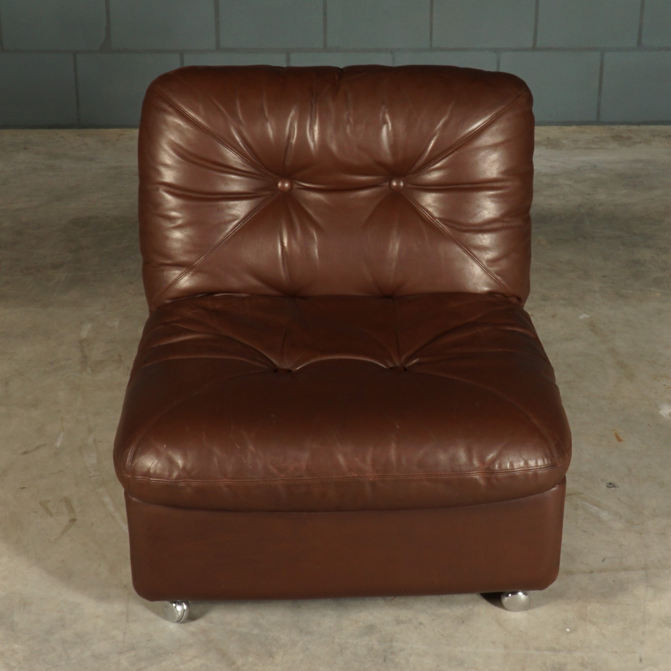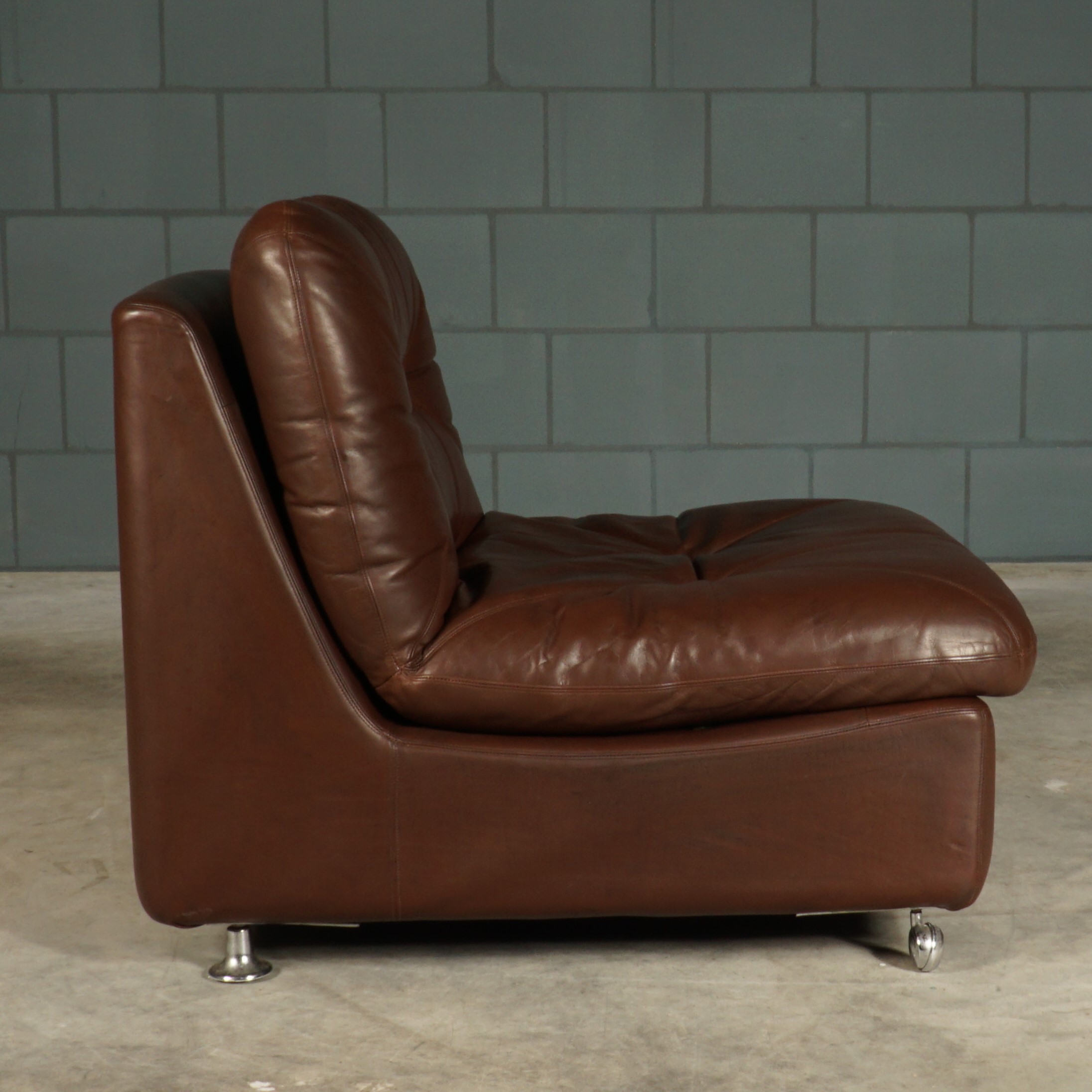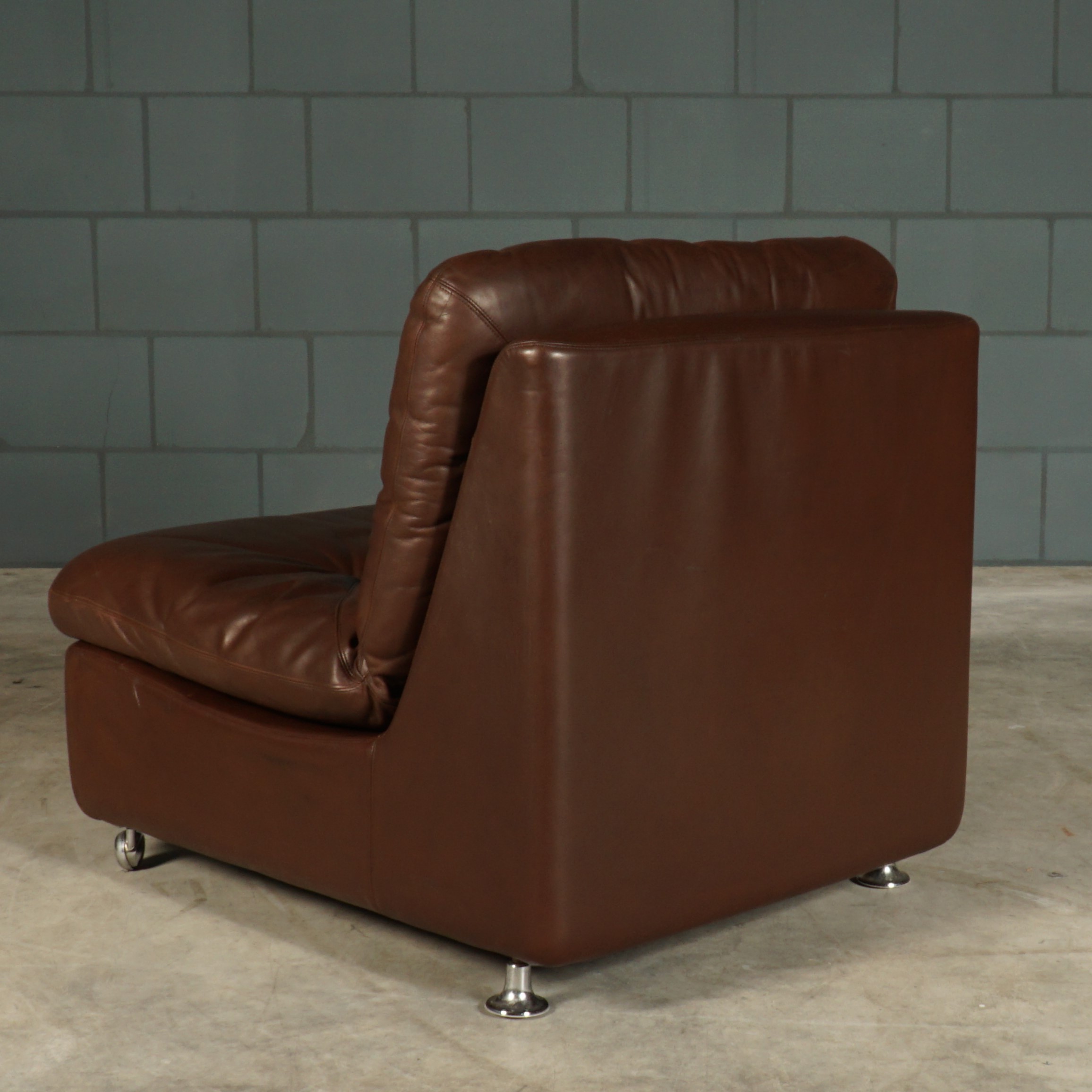 Deze toffe set van drie modulaire fauteuils, in donkerbruin leer, komt uit Duitsland en dateert uit de jaren 60. De fauteuils hebben een zeer goed zitcomfort. De modules kunnen worden gebruikt als afzonderlijke fauteuils of worden gekoppeld tot een driezitsbank. De fauteuils staan aan de voorkant op wieltjes, waardoor deze gemakkelijk te verzetten zijn. De fauteuils hebben dikke losse gecapitonneerde kussens De set is in hele mooie vintage staat met slechts lichte gebruikssporen.
