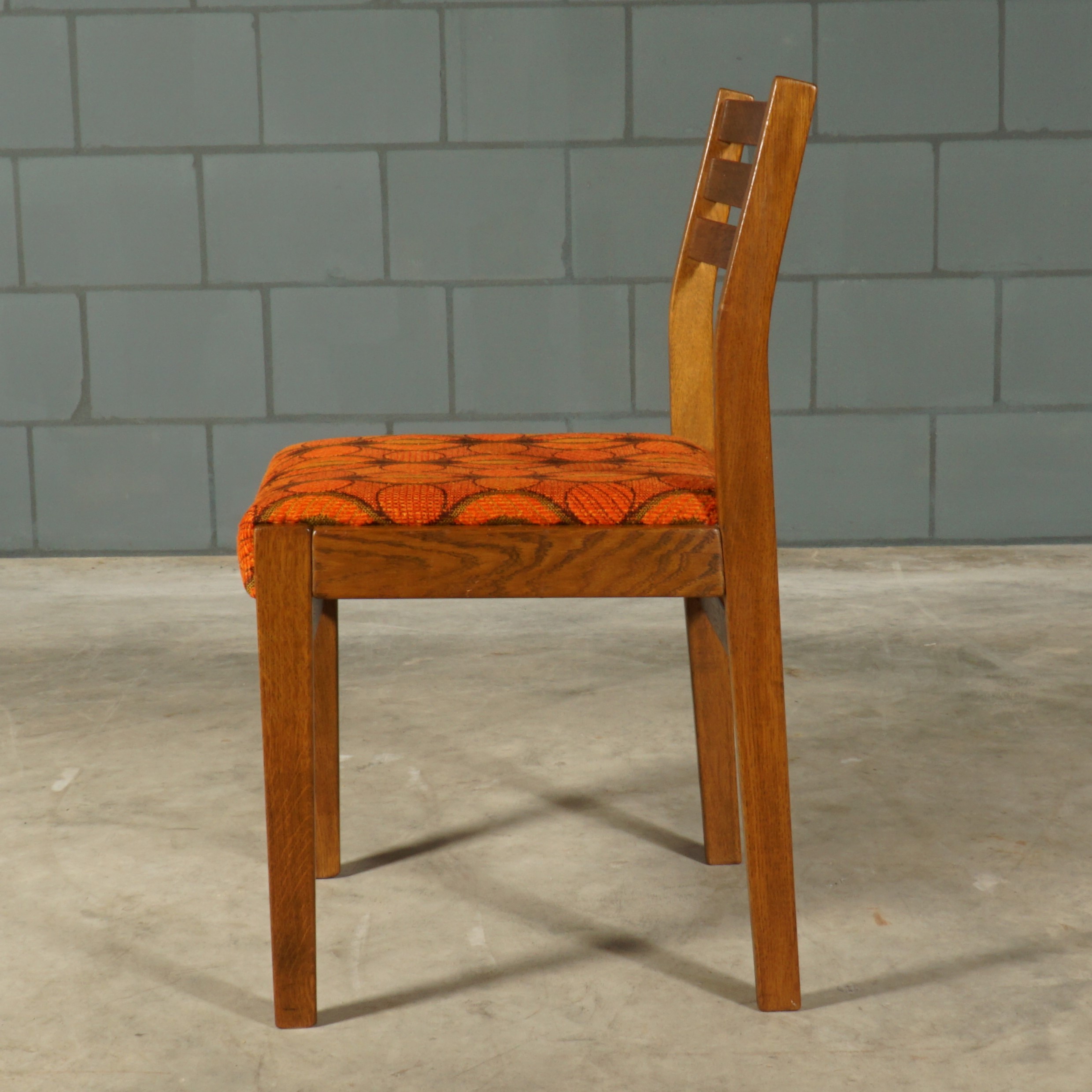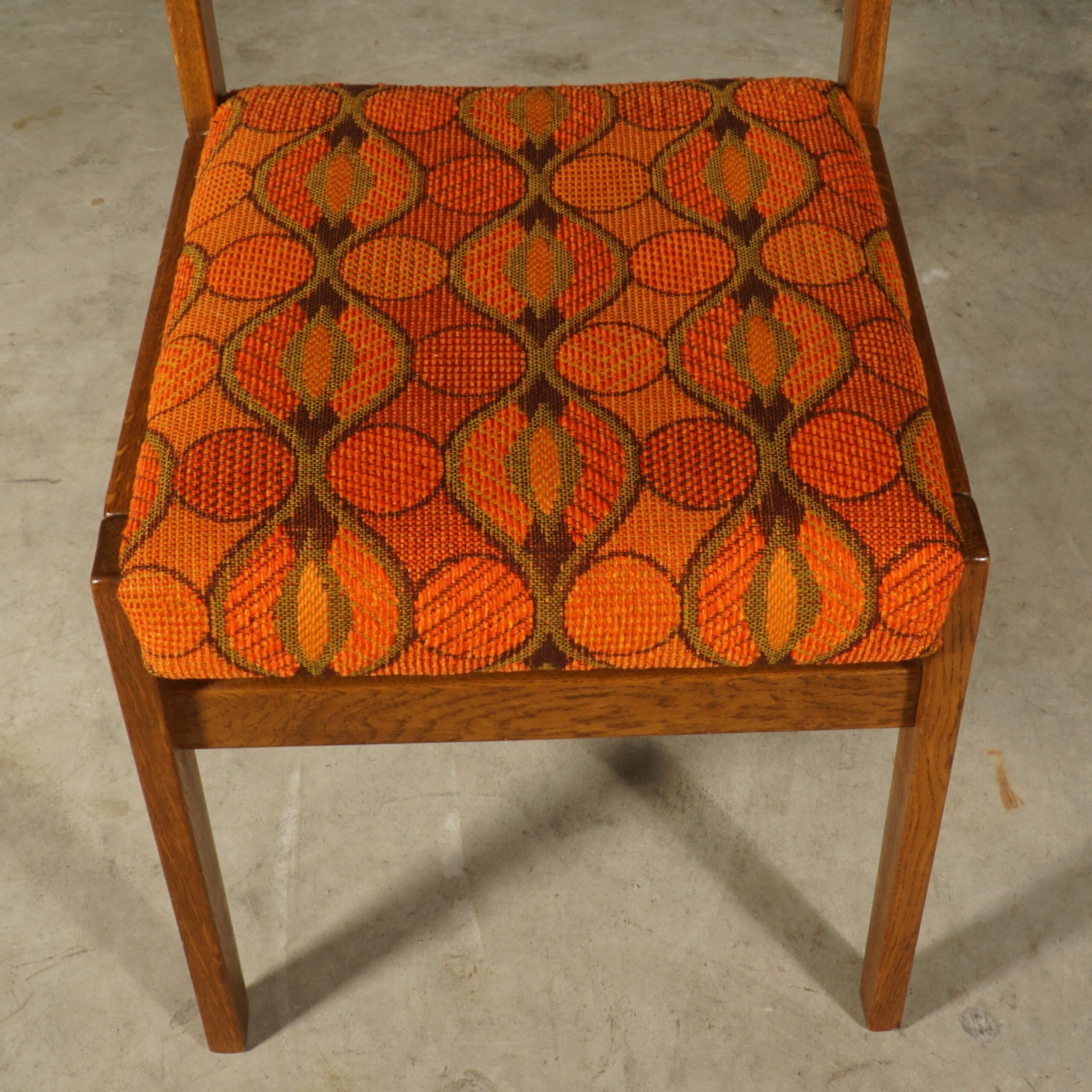 Meer “seventies” kun je het niet krijgen! Deze gave set van 4 eikenhouten eetkamerstoelen met een oranje-bruine stoffen bekleding, zo typisch voor de jaren 70. De stoelen komen uit Duitsland. Houd je van een kleurrijk interieur en een fijn zitcomfort aan de eettafel, zoek dan niet meer verder! Gelet op de leeftijd, nog in hele mooie staat met amper gebruikssporen.