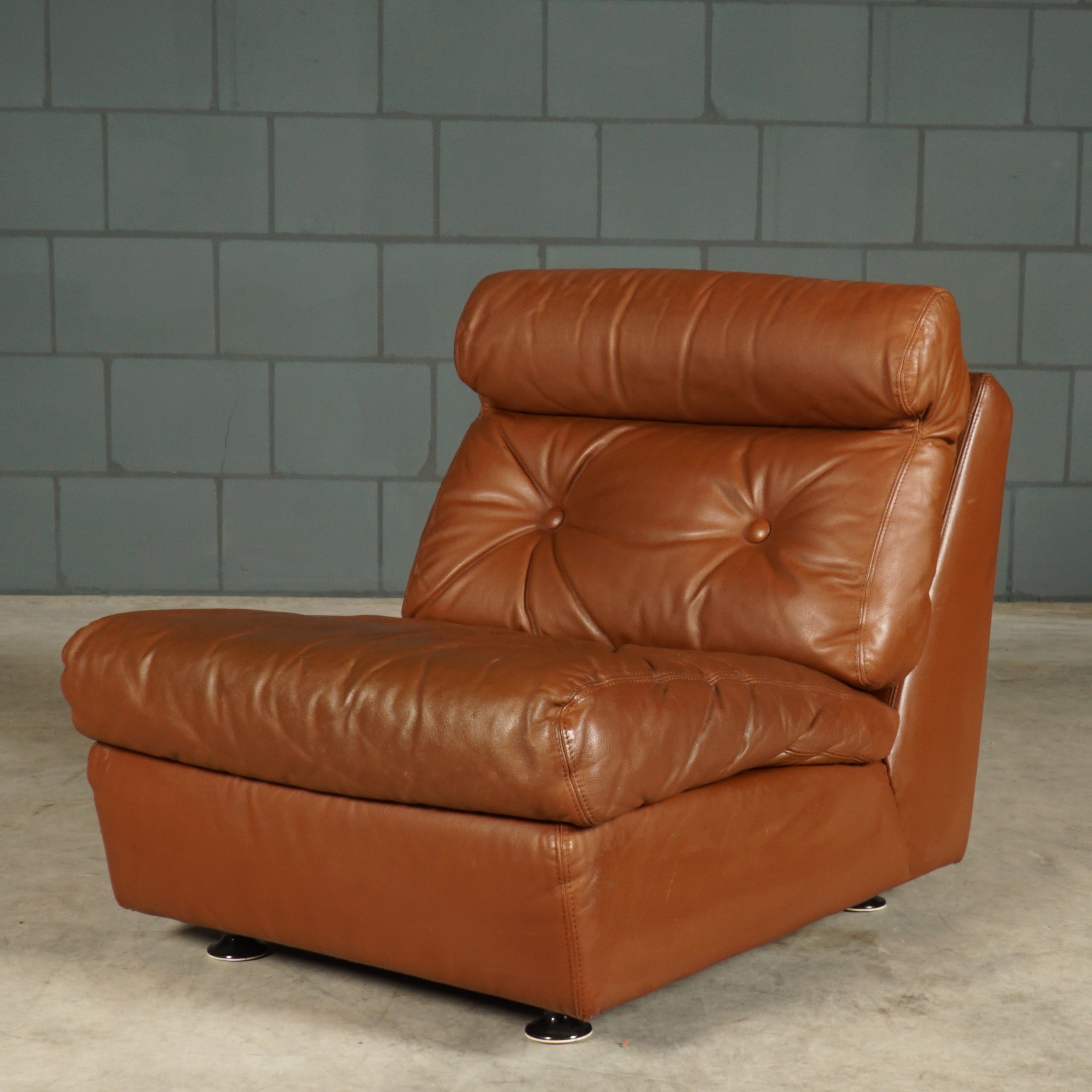 Deze toffe set van vier modulaire fauteuils, in donkerbruin leer, komt uit Duitsland en dateert uit de jaren 60. De fauteuils hebben een zeer goed zitcomfort. De modules kunnen worden gebruikt als afzonderlijke fauteuils of worden gekoppeld tot een vierzitsbank. De fauteuils staan op 4 metalen pootjes. De set is in hele mooie vintage staat met slechts lichte gebruikssporen.