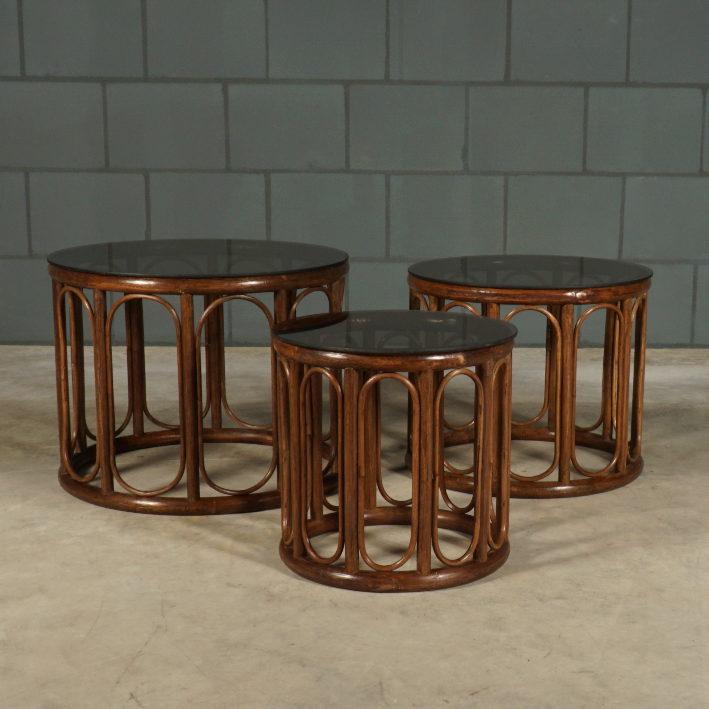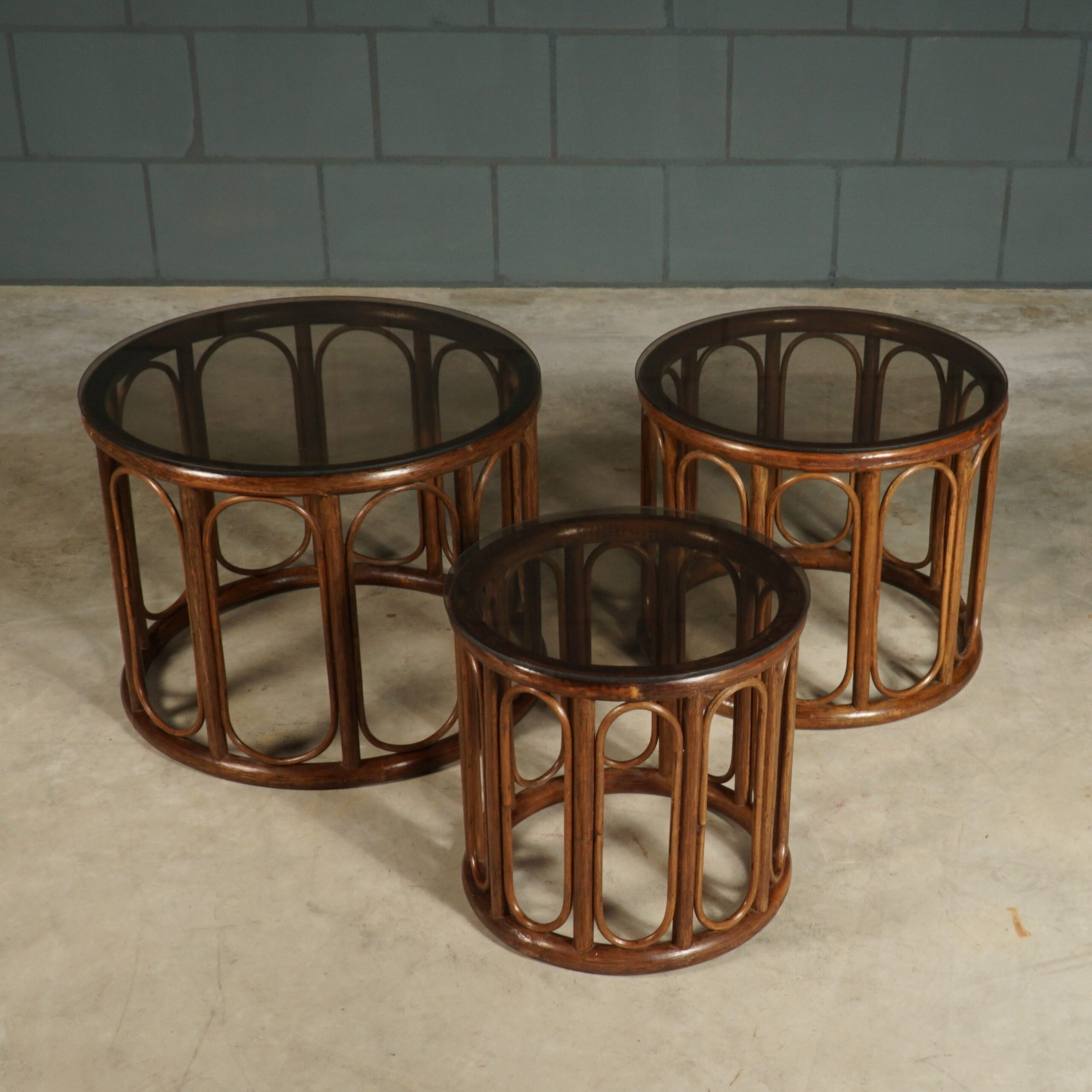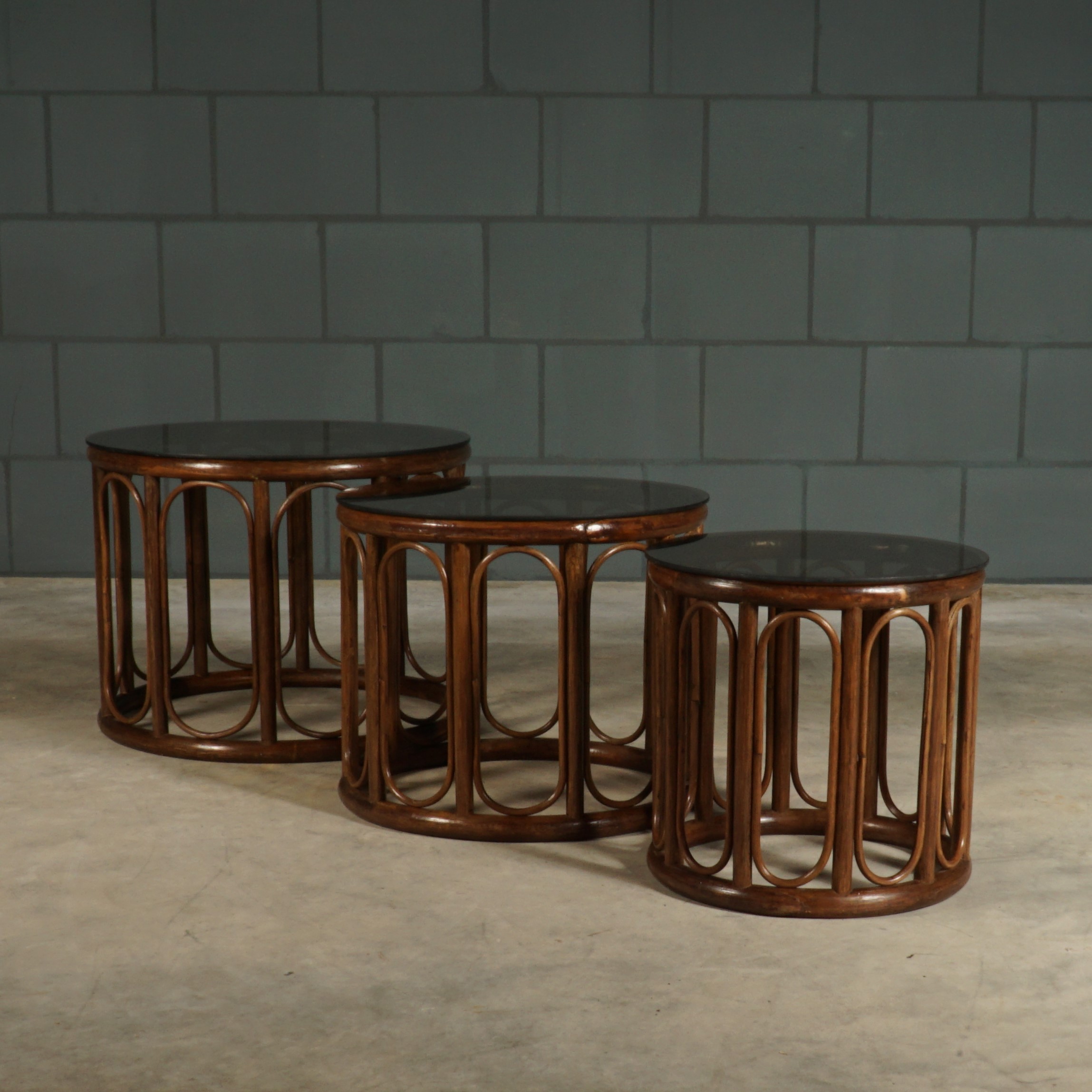 Altijd handig, tafeltjes die je zo even bij kunt schuiven! Dit vintage setje van 3 rotan/bamboe/manou tafeltjes met gerookt glazen blad is erg charmant. Het donkere manou geeft deze set een warme, natuurlijke uitstraling. Mooi voor in een boho interieur of als een natuurlijk detail in een wat strakkere inrichting. De tafeltjes zijn in hele goede staat, met amper gebruikssporen.