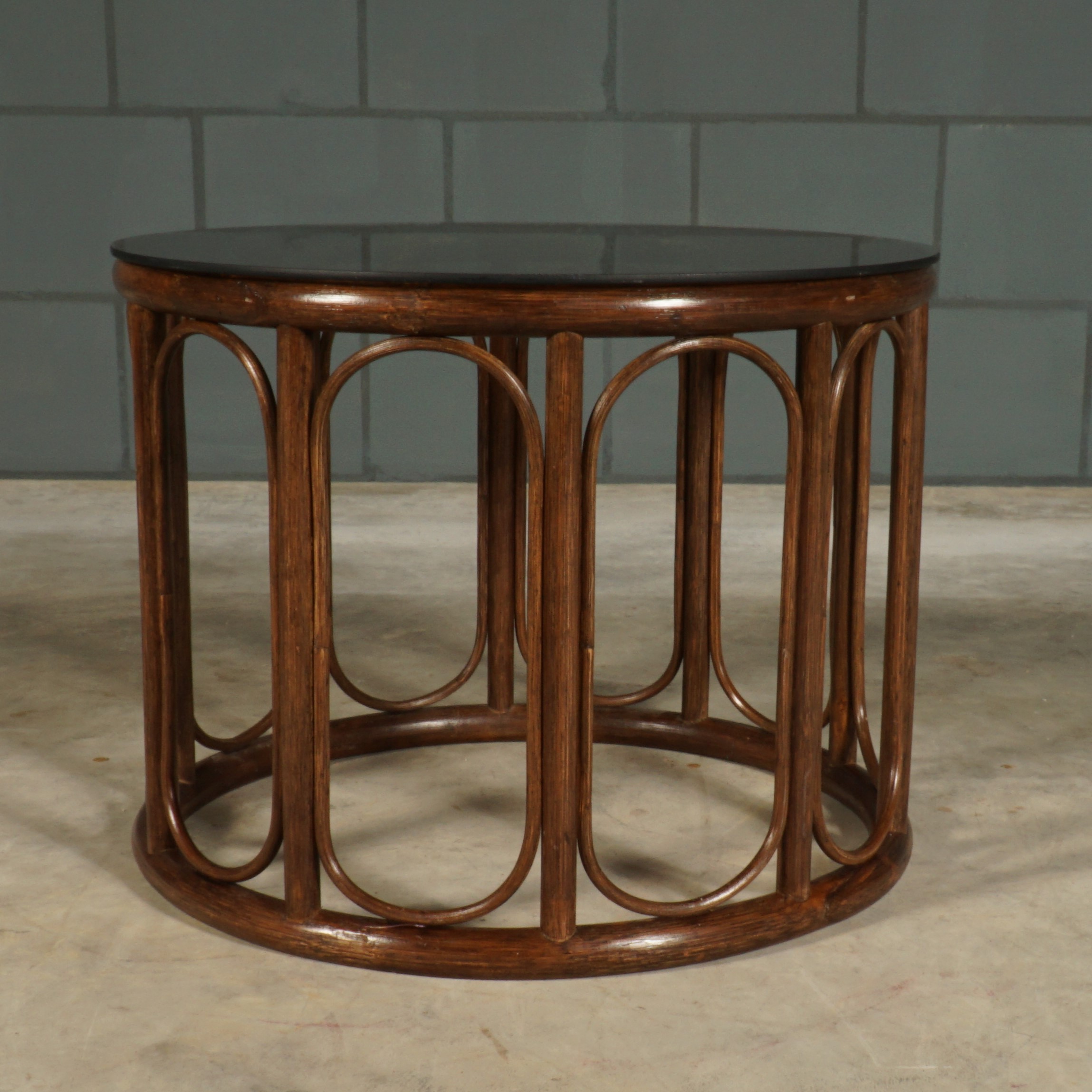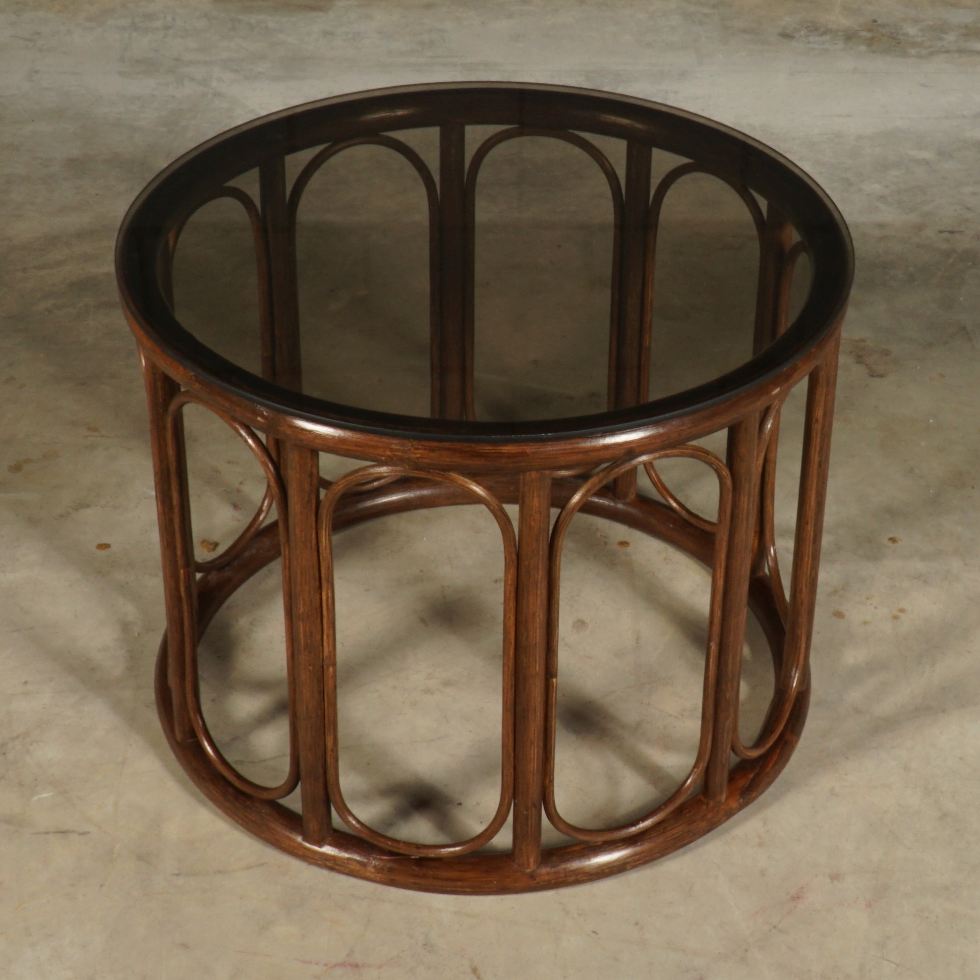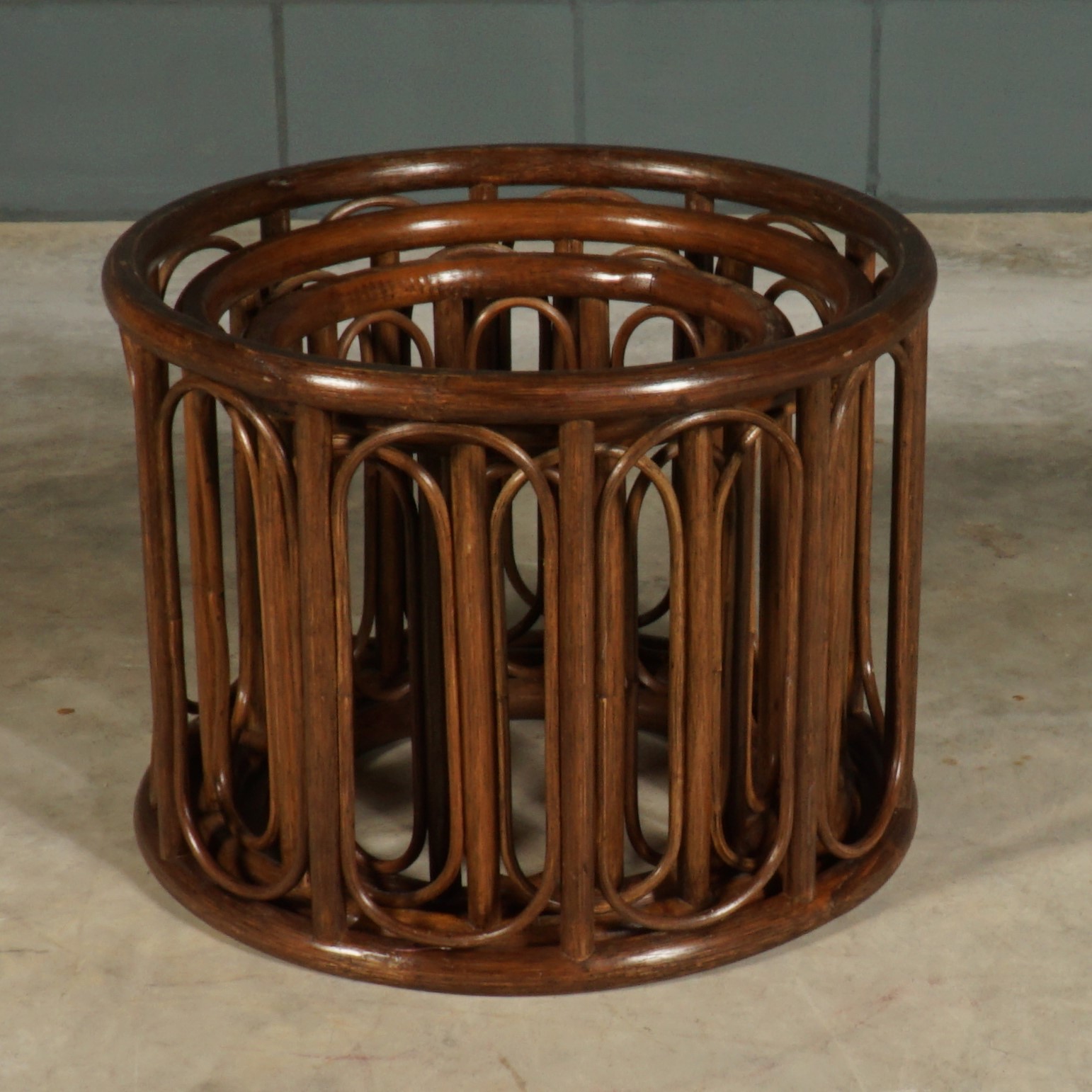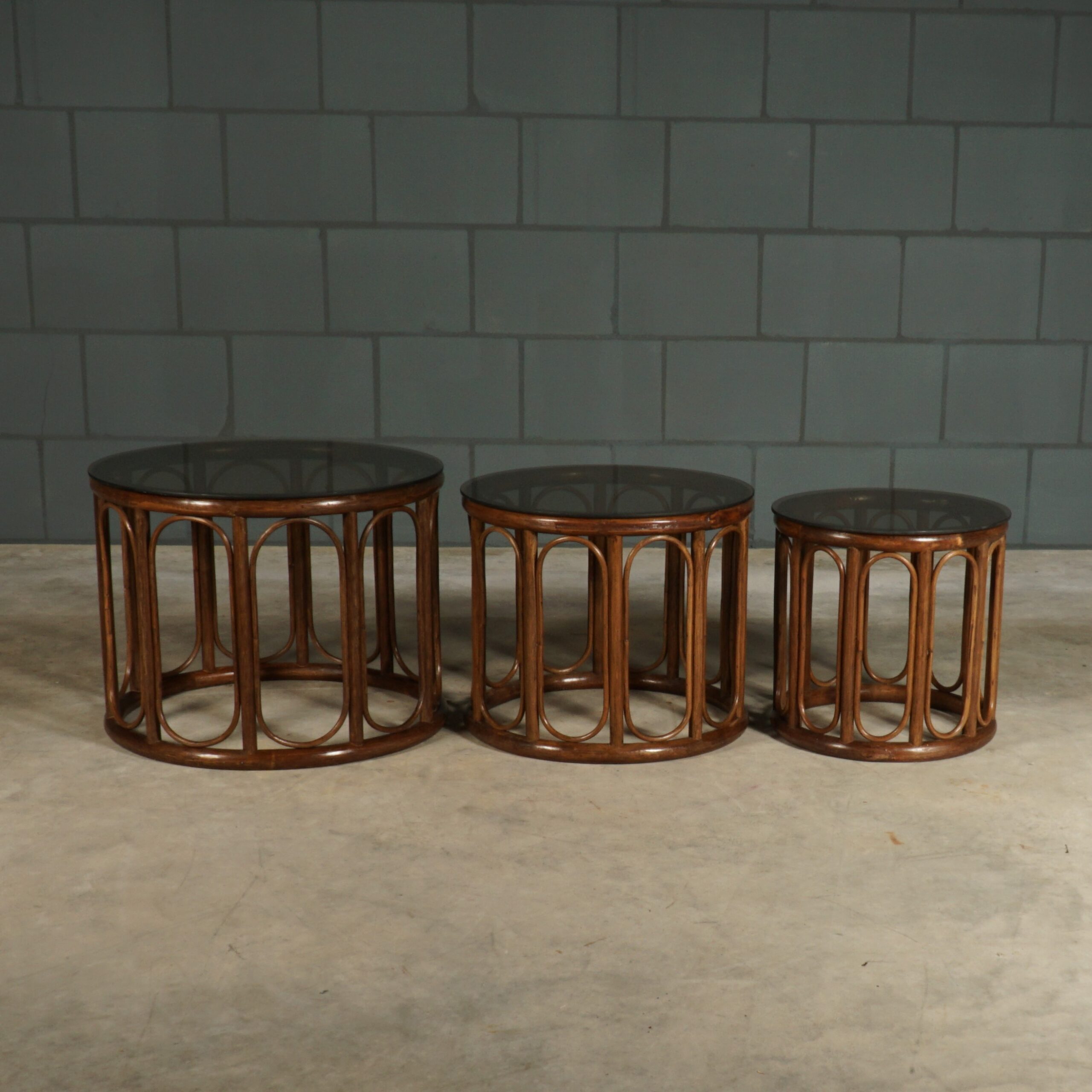 Altijd handig, tafeltjes die je zo even bij kunt schuiven! Dit vintage setje van 3 rotan/bamboe/manou tafeltjes met gerookt glazen blad is erg charmant. Het donkere manou geeft deze set een warme, natuurlijke uitstraling. Mooi voor in een boho interieur of als een natuurlijk detail in een wat strakkere inrichting. De tafeltjes zijn in hele goede staat, met amper gebruikssporen.