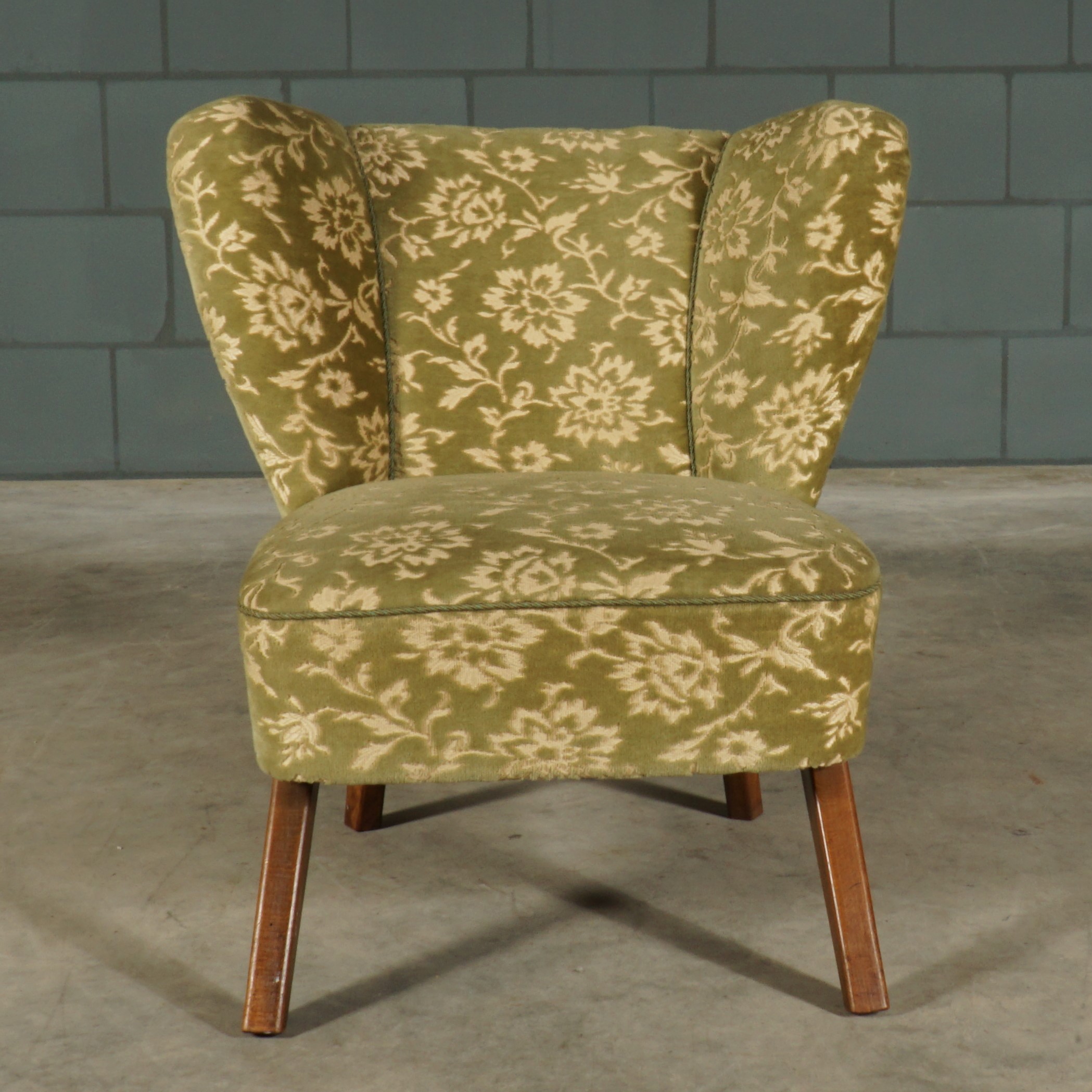 Deze prachtige cocktailfauteuils uit de jaren 60 zijn voorzien van een zachte groene velours stof met bloemmotief en hebben prachtige houten poten. Deze stoelen stralen stijl en elegantie uit! Deze schitterende fauteuils zijn een pronkstuk voor ieder interieur. Naast het prachtige ontwerp zitten de stoelen ook zeer comfortabel. De stoelen zijn, gelet op de leeftijd, in een bijzonder goede staat. De stoelen hebben nog de originele bekleding, welke nergens is beschadigd of gevlekt.