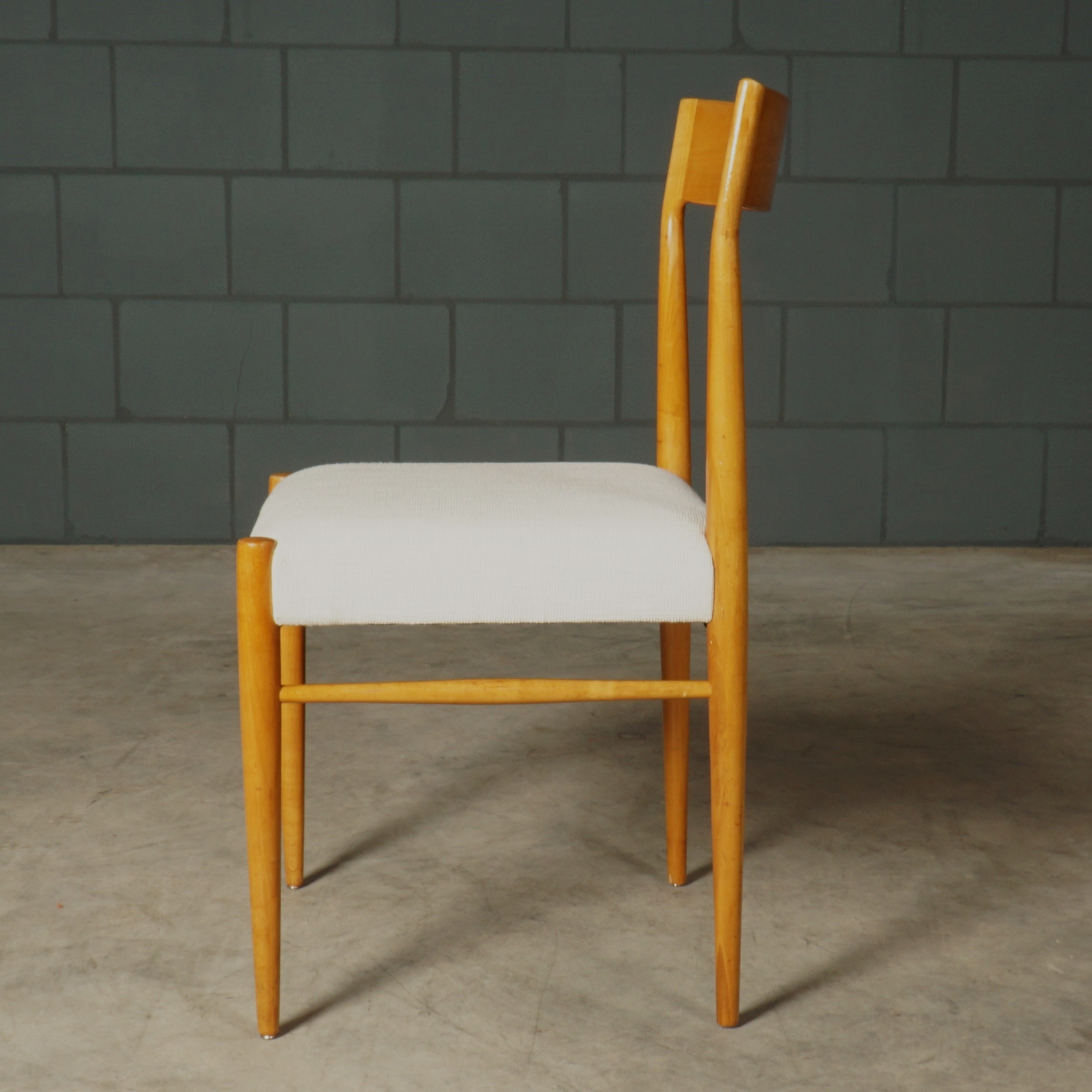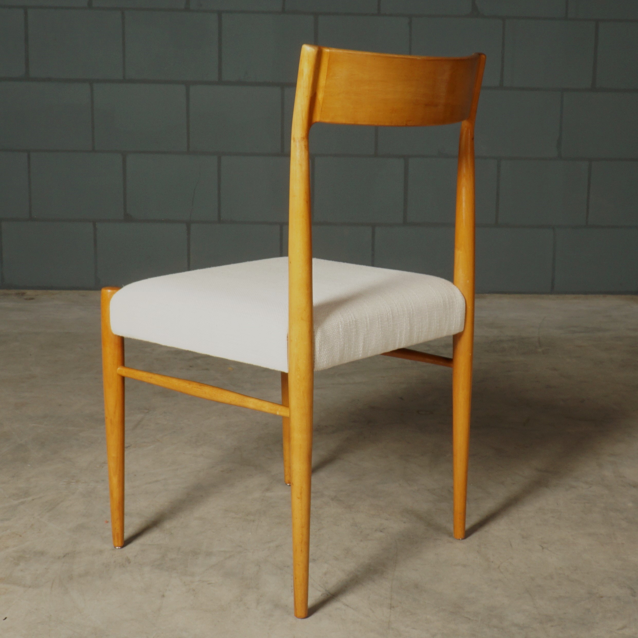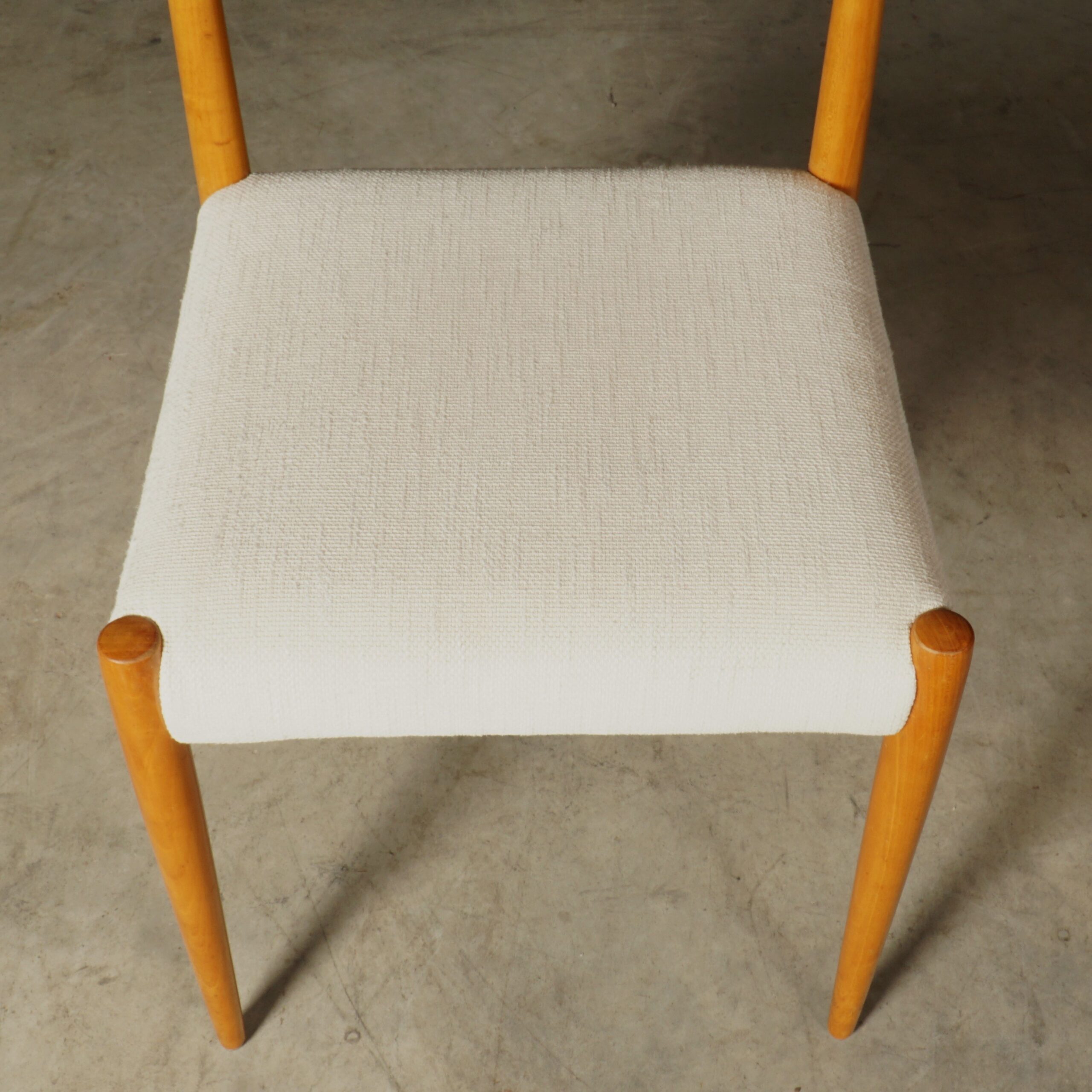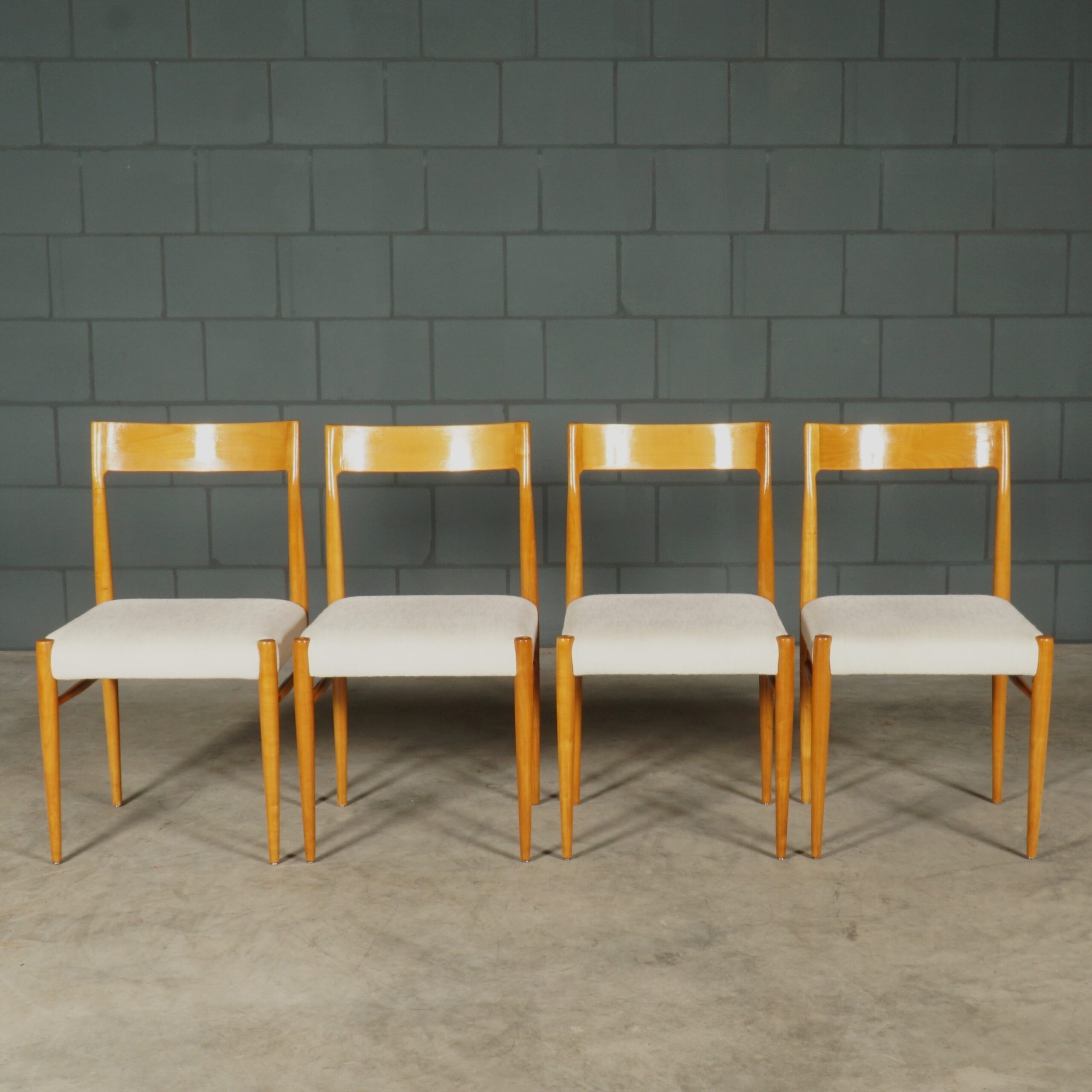 Deze prachtige set van vier notenhouten eetkamerstoelen heeft zijn oorpsrong in Scandinavië en dateert uit de jaren 60. De ontwerper of fabrikant zijn helaas onbekend, maar het kan niet anders dan dat er een goede ontwerper achter zit! Wat een design en wat een kwaliteit! De stoelen hebben een zeer elegante uitstraling waarbij de frames zijn gemaakt van notenhout en de zittingen zijn opnieuw bekleed met een mooie kwaliteit stof in een warme wittint. De stoelen hebben een zeer prettig zitcomfort. Ware eye-catchers voor zowel in een modern als in een vintage interieur. De stoelen zijn in zeer mooie staat met amper gebruikssporen.