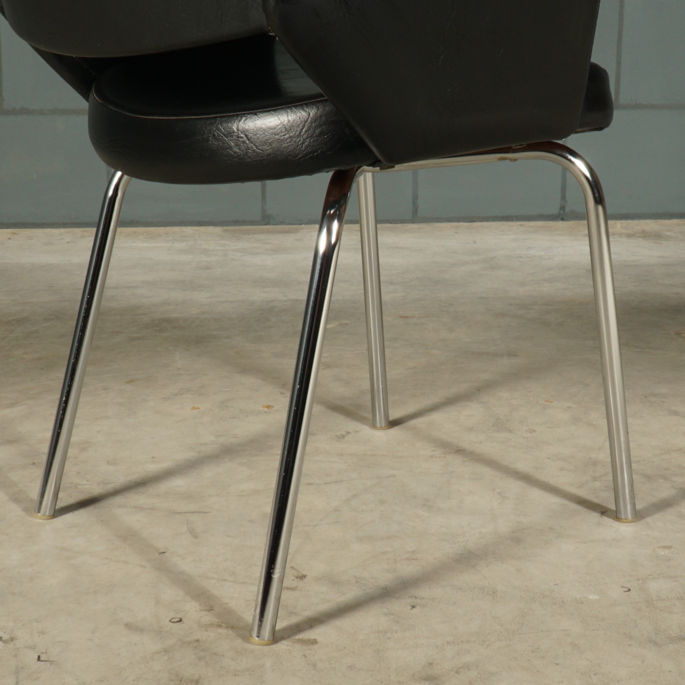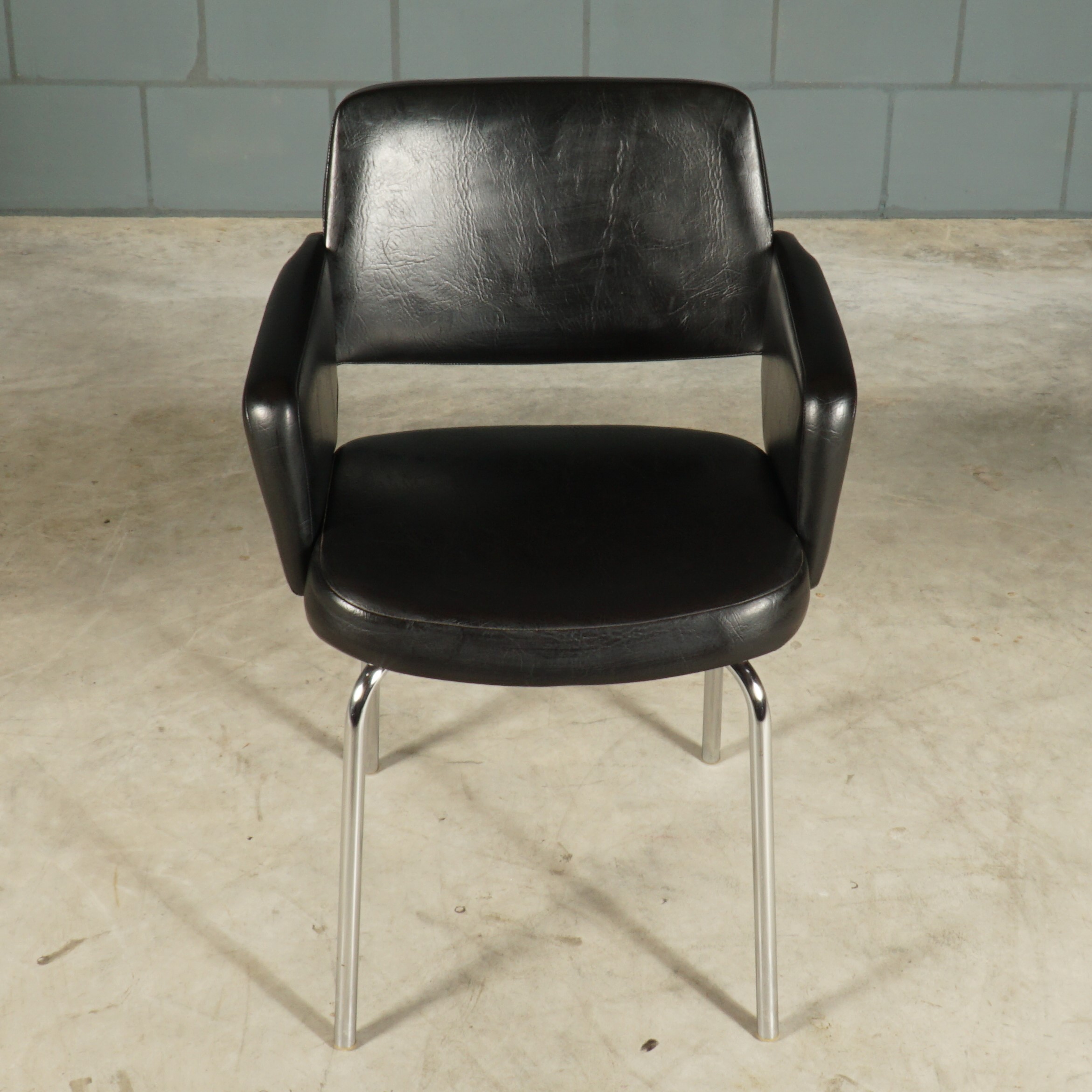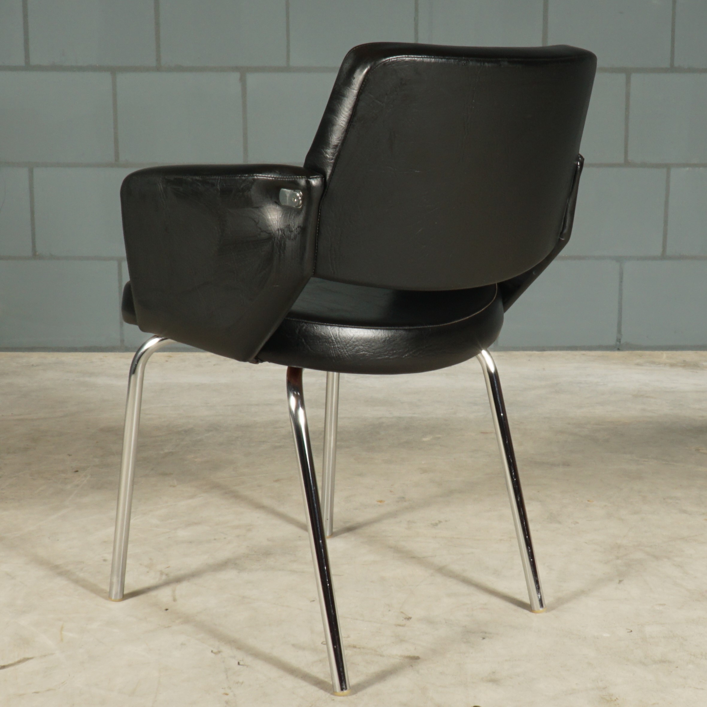 Meer “seventies” kun je het niet krijgen! Deze zwarte fauteuils in skaileder hebben een prachtig design met mooie rondingen, typisch voor de jaren 70. Het skaileder heeft een lichte structuur en de stoelen zijn afgewerkt met ronde chromen poten. Deze stoelen kunnen, gelet op de zithoogte, ook gebruikt worden als eetkamerstoelen. Of gemakkelijk bij te zetten bij een zithoek. Een ding is zeker, het zijn echte eye-catchers met een heerlijk zitcomfort en ook nog eens in hele mooie staat met amper gebruissporen.