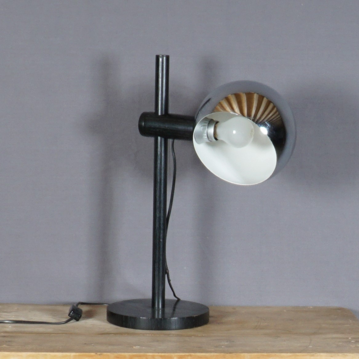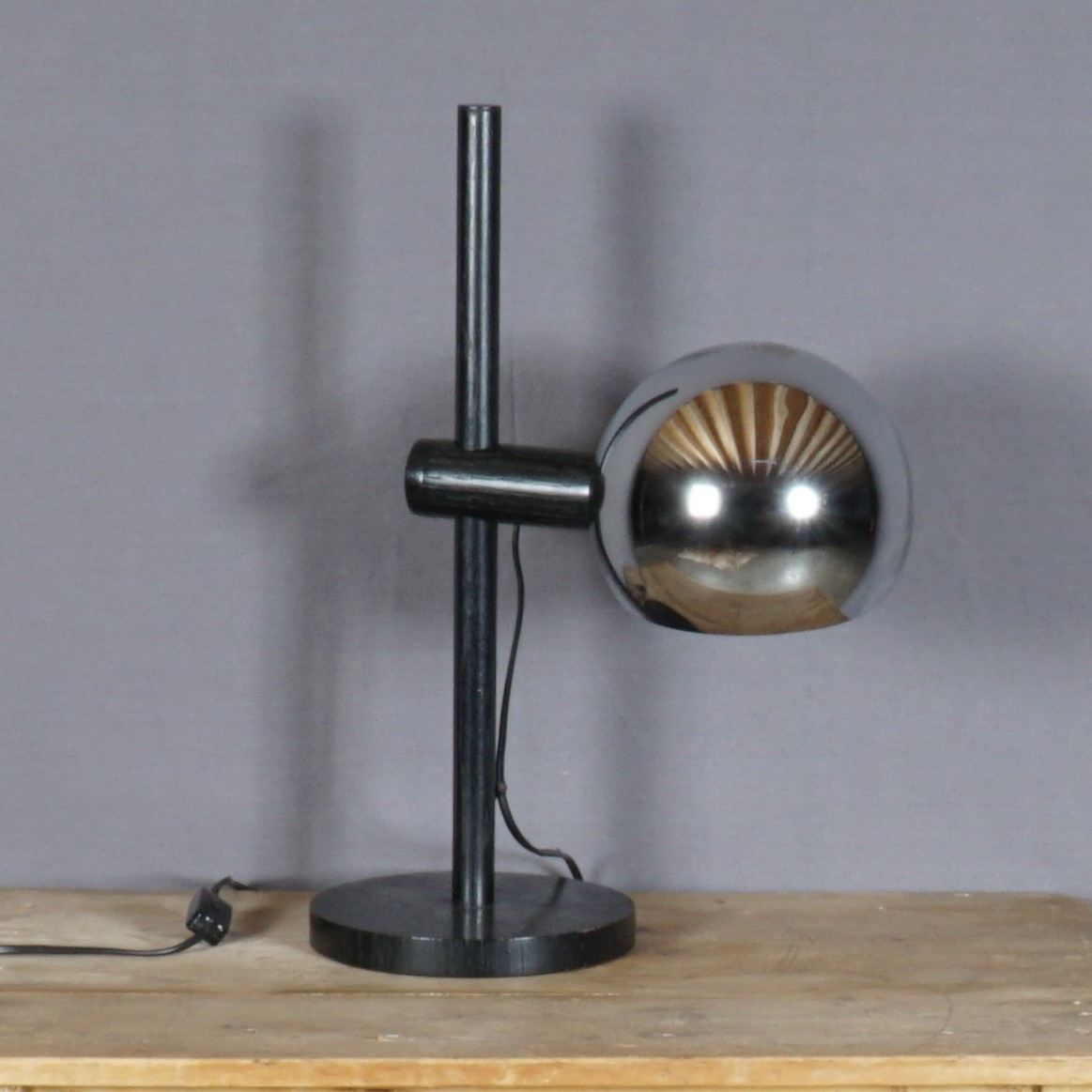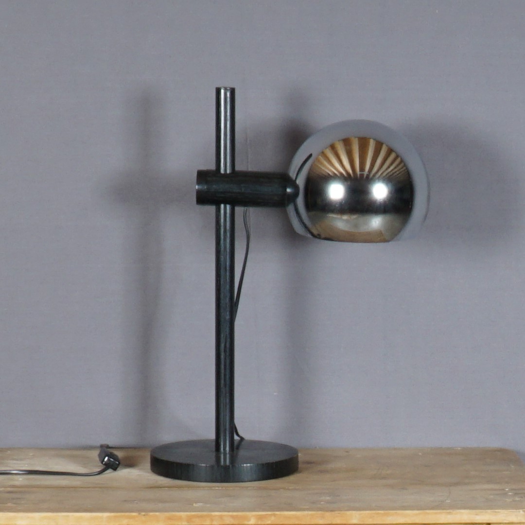 Een originele armatuur uit de jaren ’70 gemaakt door het prestigieuze label Temde AG, een Duits-Zwitserse fabrikant. Deze prachtige lamp is gemaakt van eikenhout en metaal. De lamp heeft een mast op een ronde basis. De arm die het lichtpunt ondersteunt schuift omhoog en omlaag, waardoor de hoogte naar wens kan variëren. De lamp is in mooie vintage staat, met enkel wat lichte krasjes op de chromen bol. De lamp functioneert naar behoren.