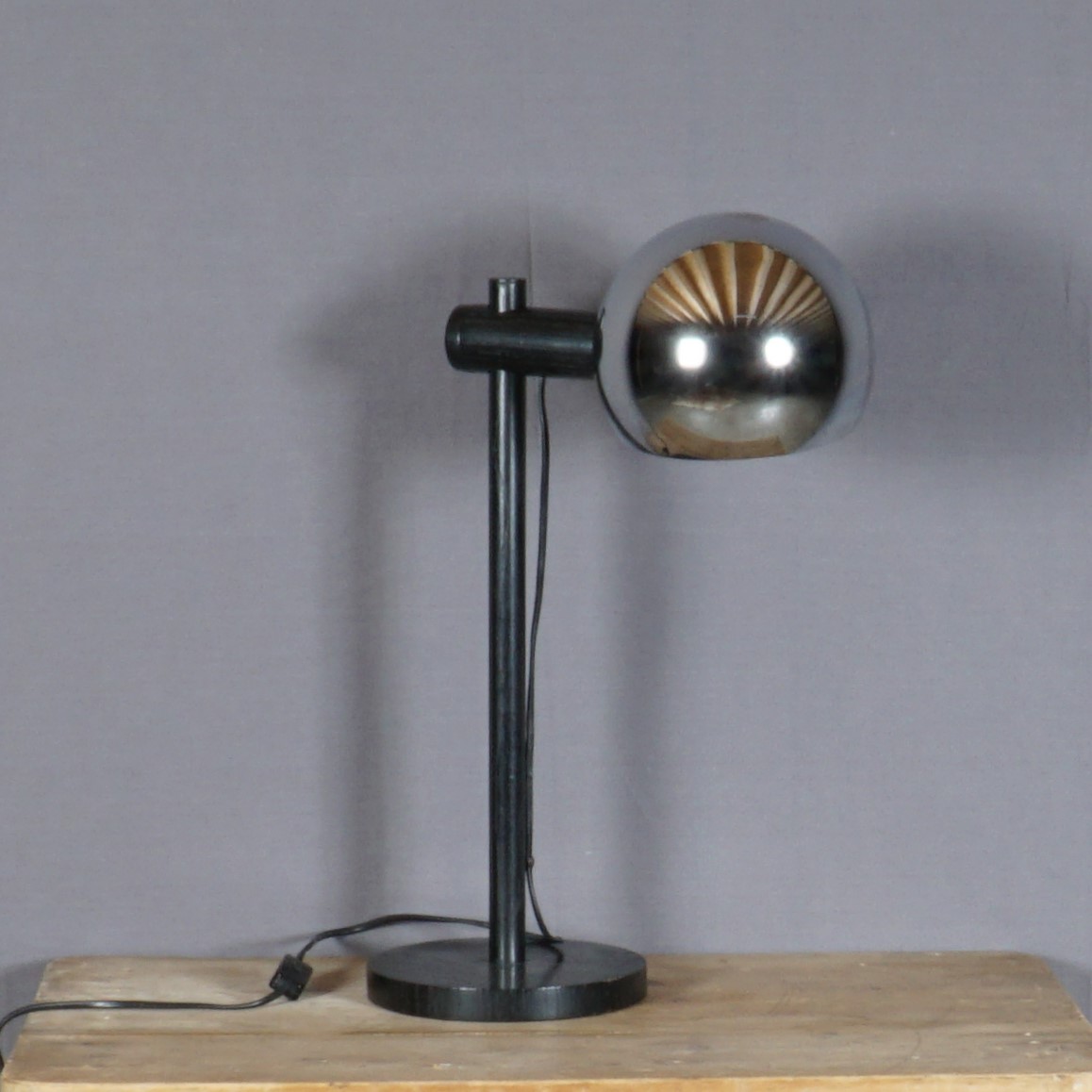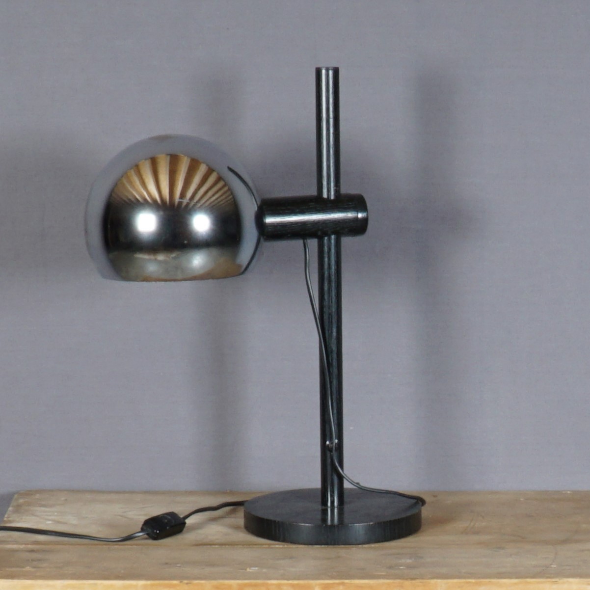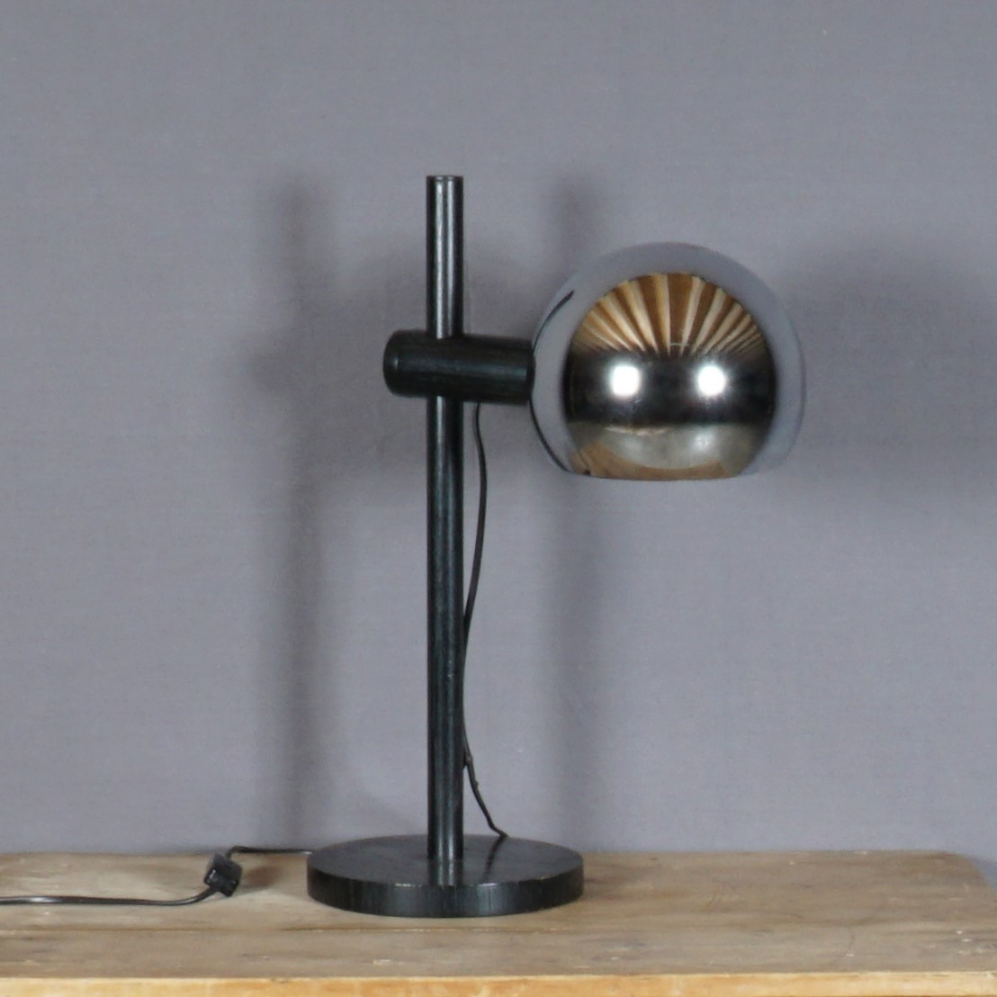 Een originele armatuur uit de jaren ’70 gemaakt door het prestigieuze label Temde AG, een Duits-Zwitserse fabrikant. Deze prachtige lamp is gemaakt van eikenhout en metaal. De lamp heeft een mast op een ronde basis. De arm die het lichtpunt ondersteunt schuift omhoog en omlaag, waardoor de hoogte naar wens kan variëren. De lamp is in mooie vintage staat, met enkel wat lichte krasjes op de chromen bol. De lamp functioneert naar behoren.