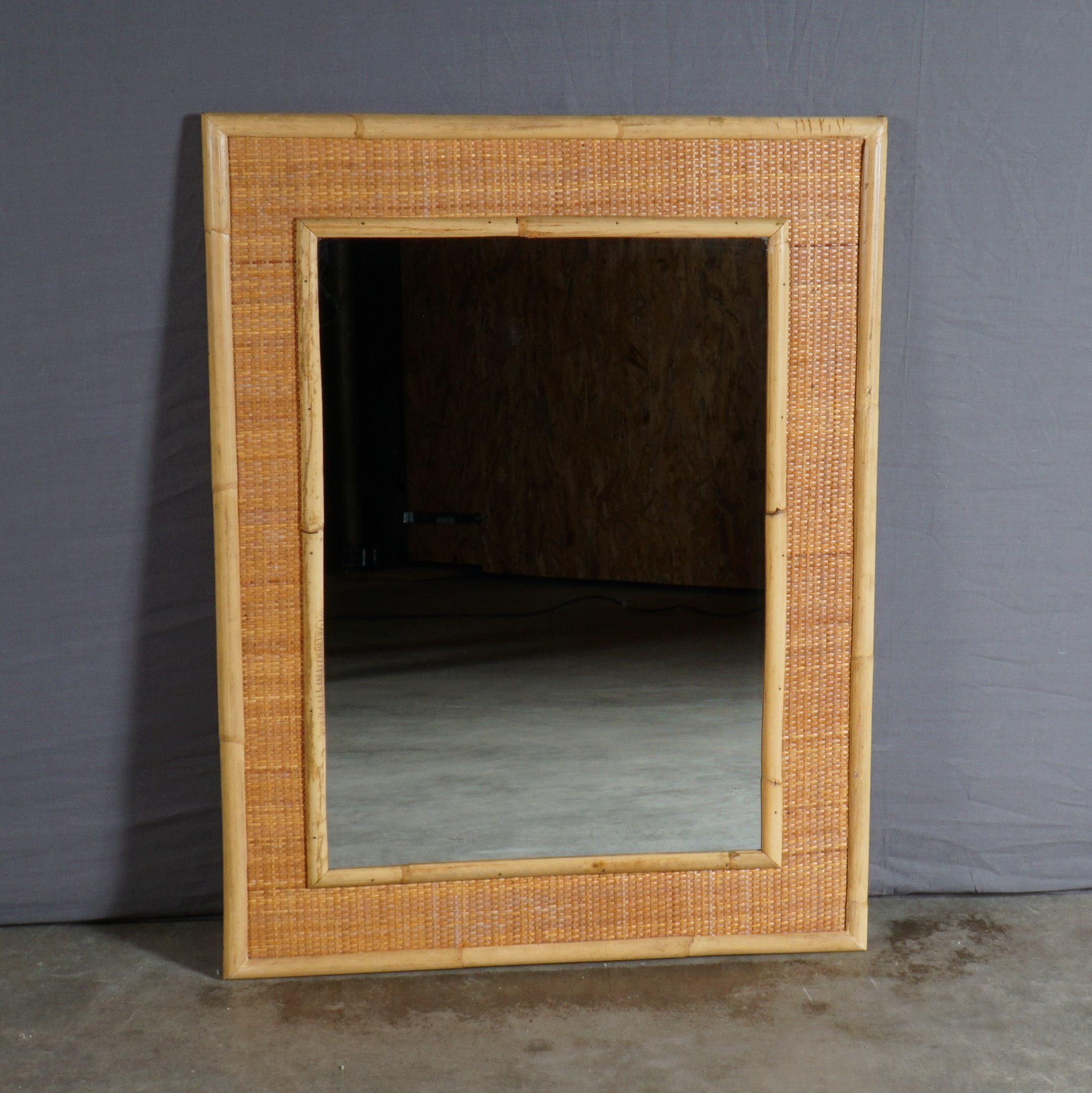 Grote rechthoekige spiegel uit de jaren 70, gemaakt van bamboe en rotan. Door de strakke vorm en de warme materialen, is deze spiegel geschikt voor zowel de moderne als de landelijke interieurs. De spiegel is in topconditie!