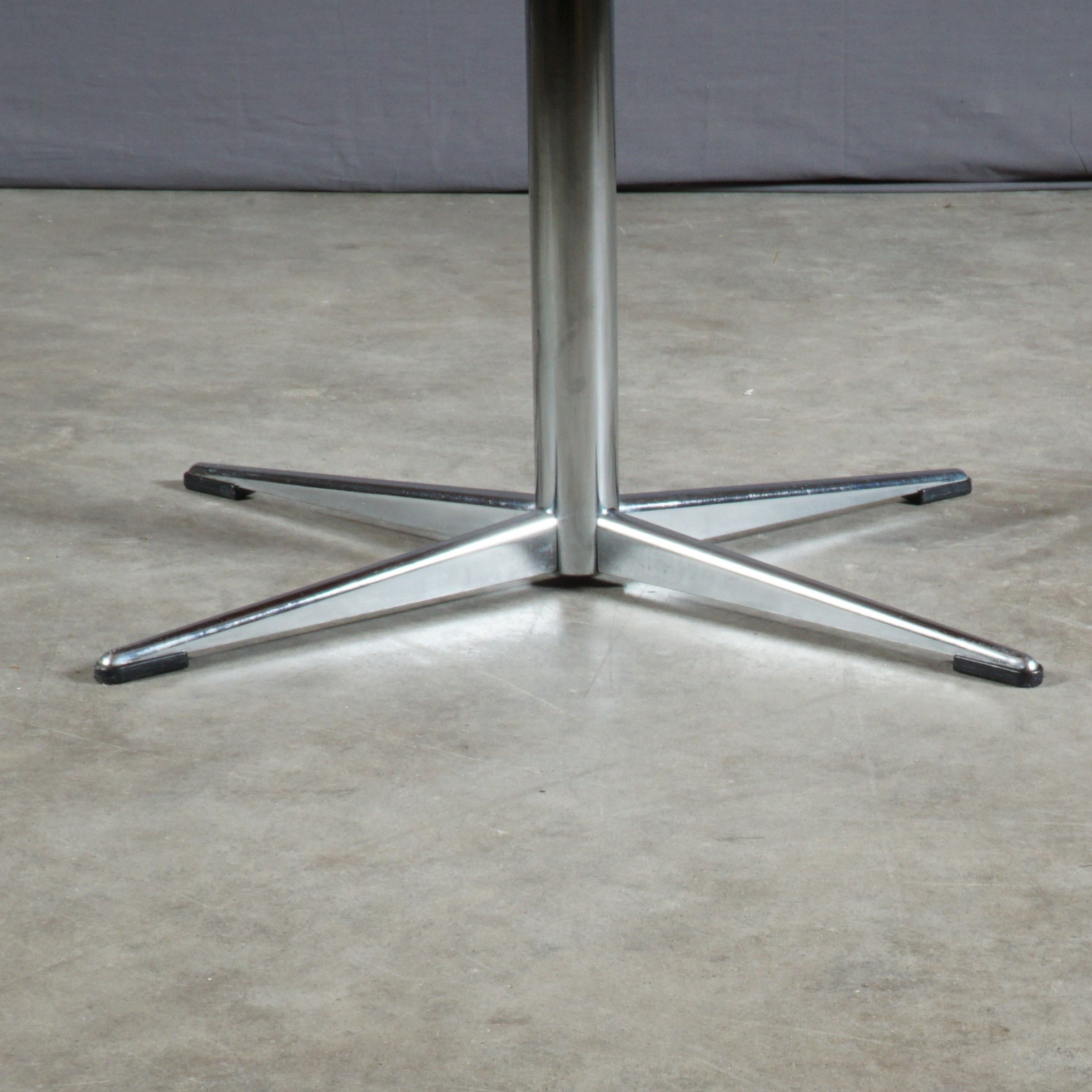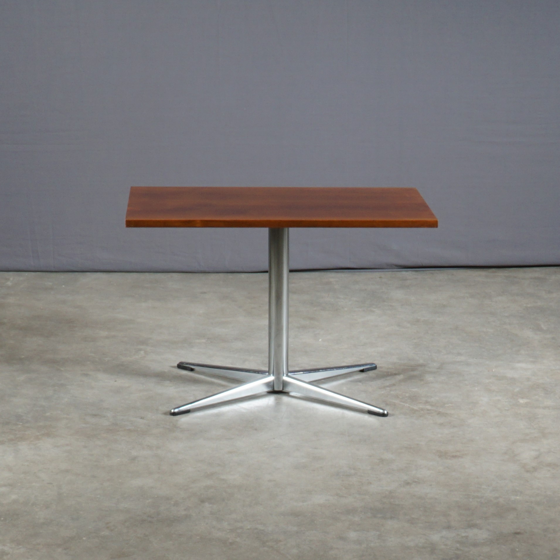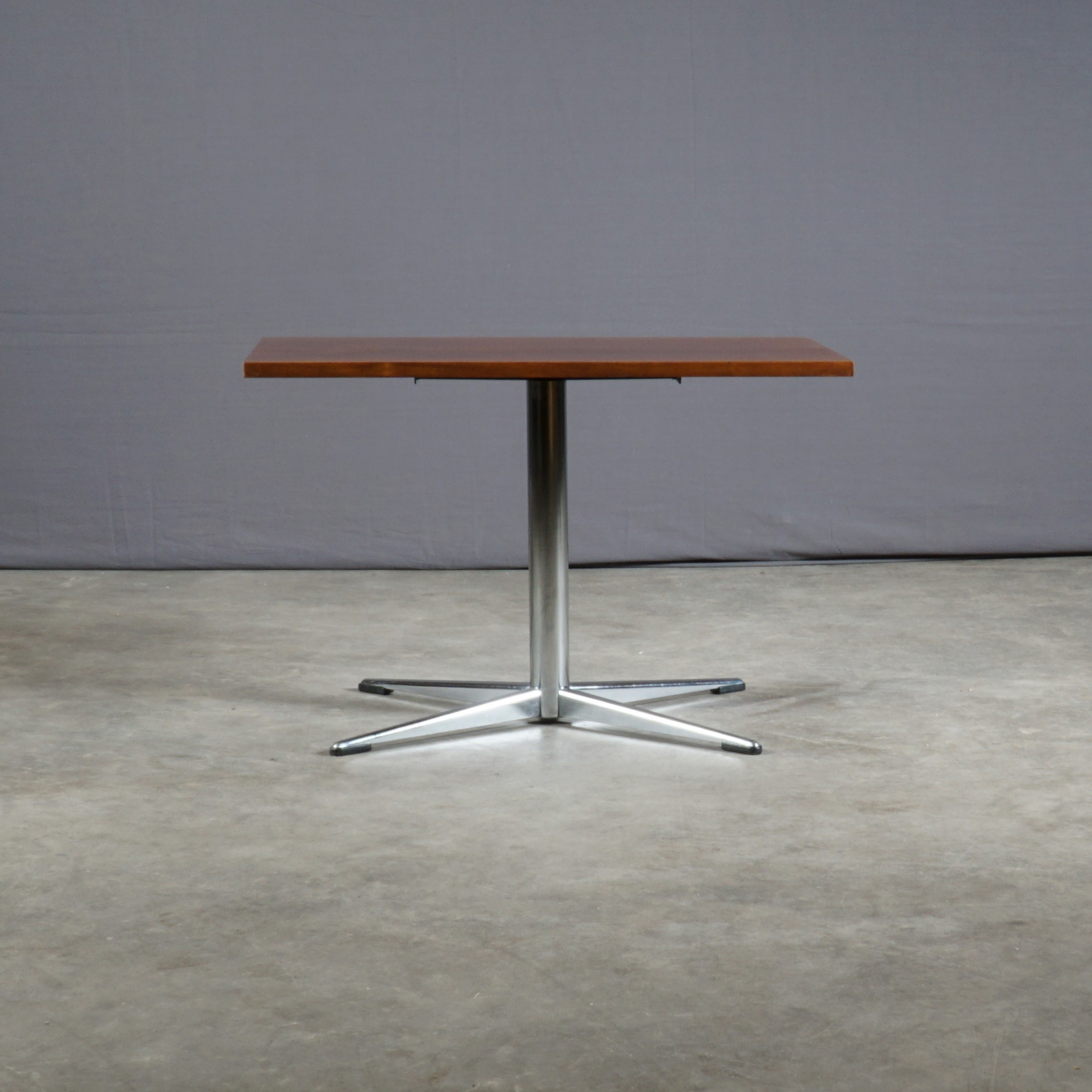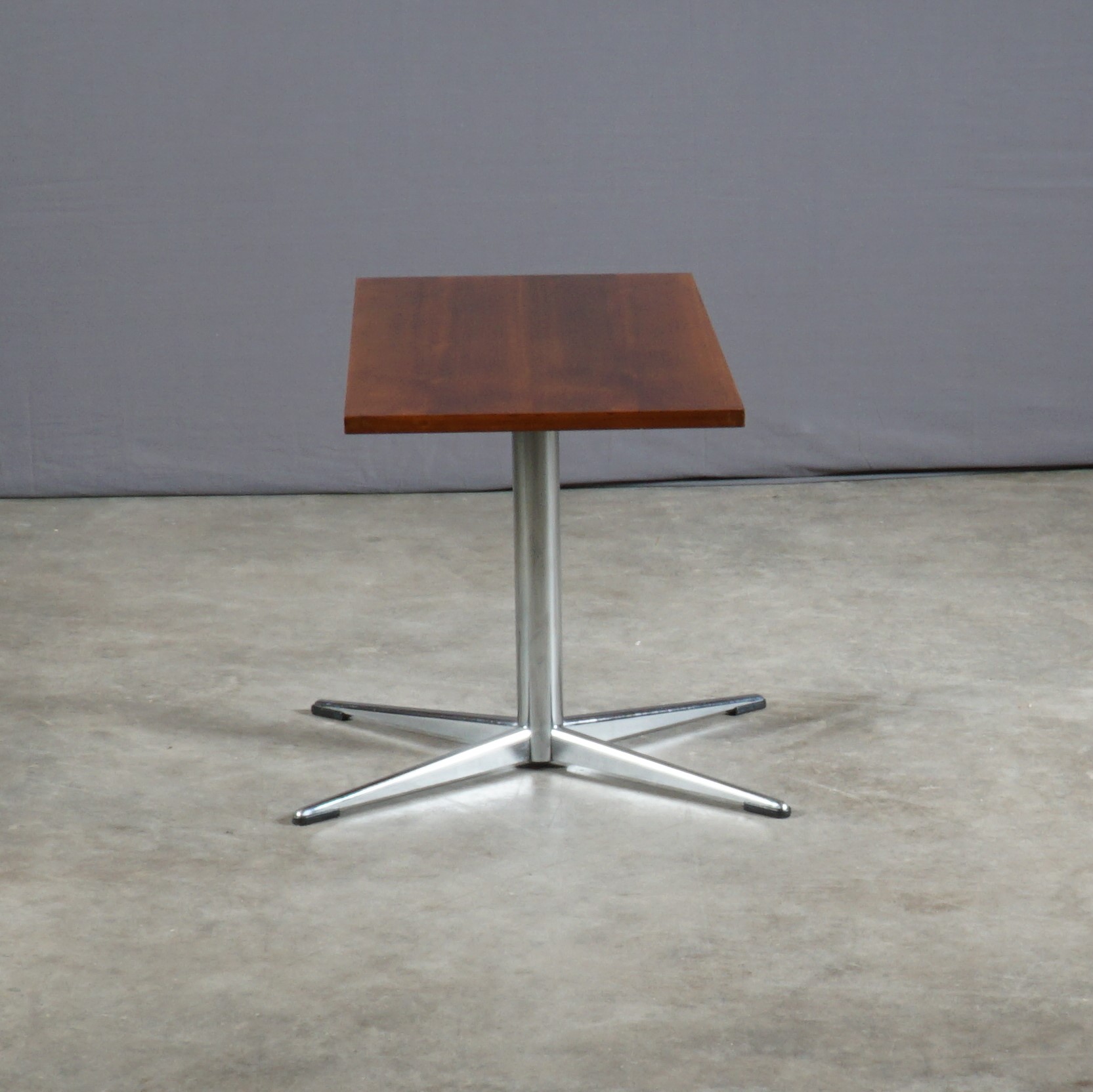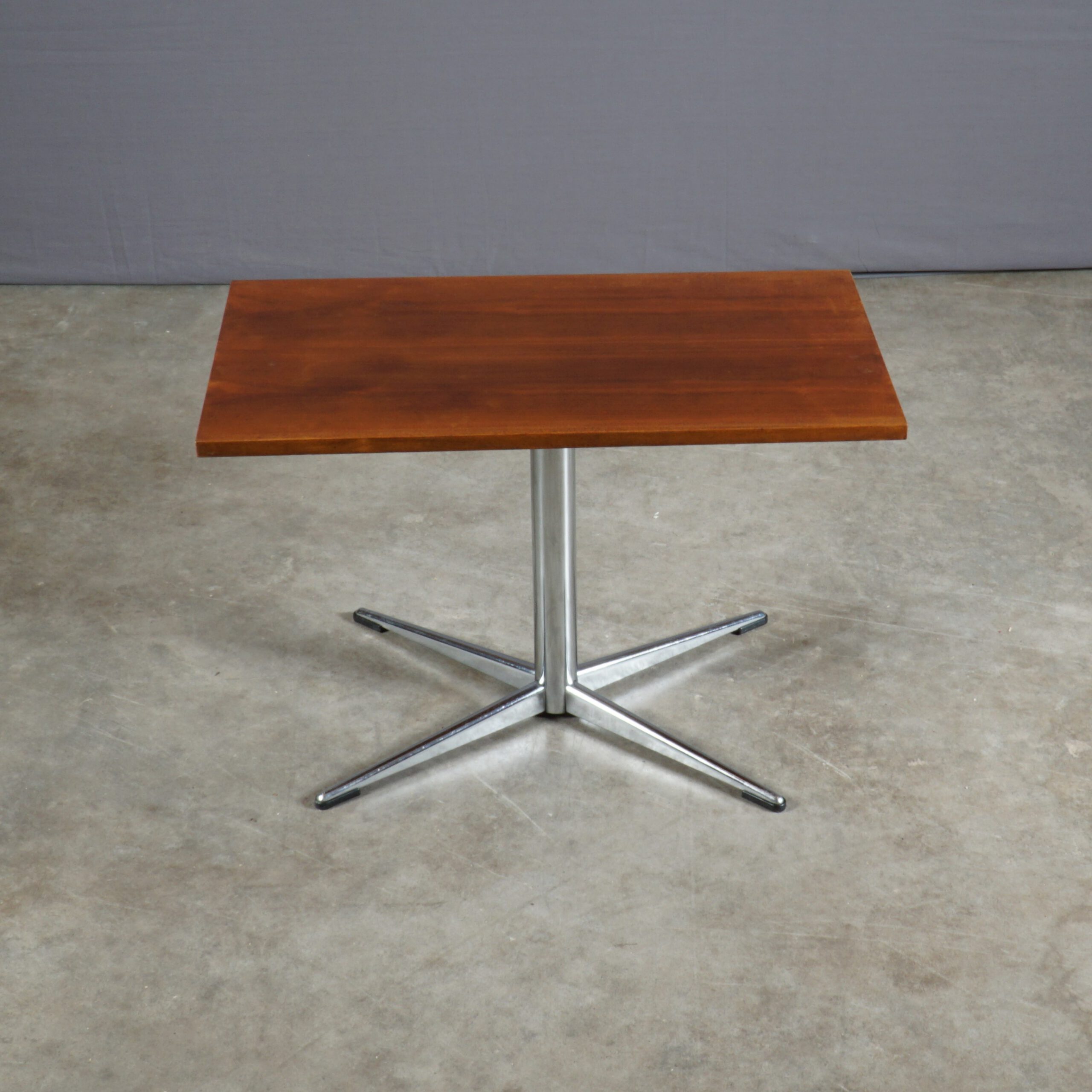 Een mooie bijzettafel in een strak minimalistisch design van het Duitse merk WK Möbel. Het tafelblad is gemaakt van teakhout en draait op een chromen kruisvoet. Het tafeltje heeft lichte gebruikssporen, zowel op het blad als op het onderstel.