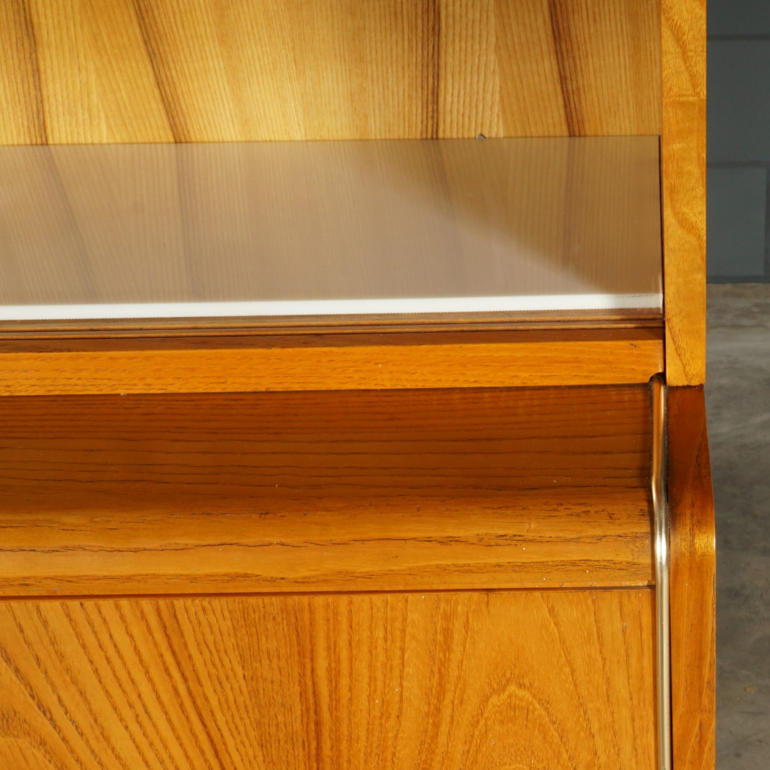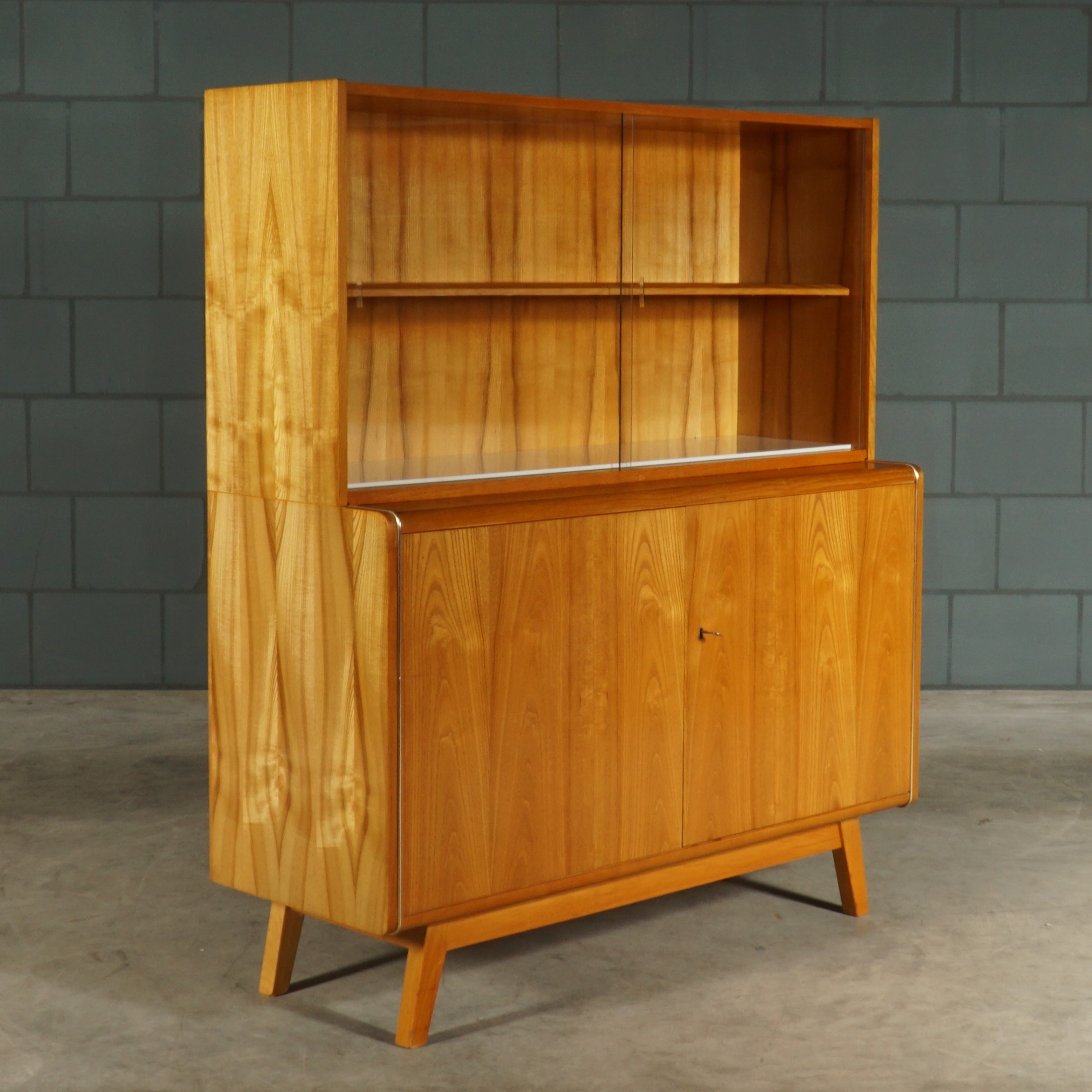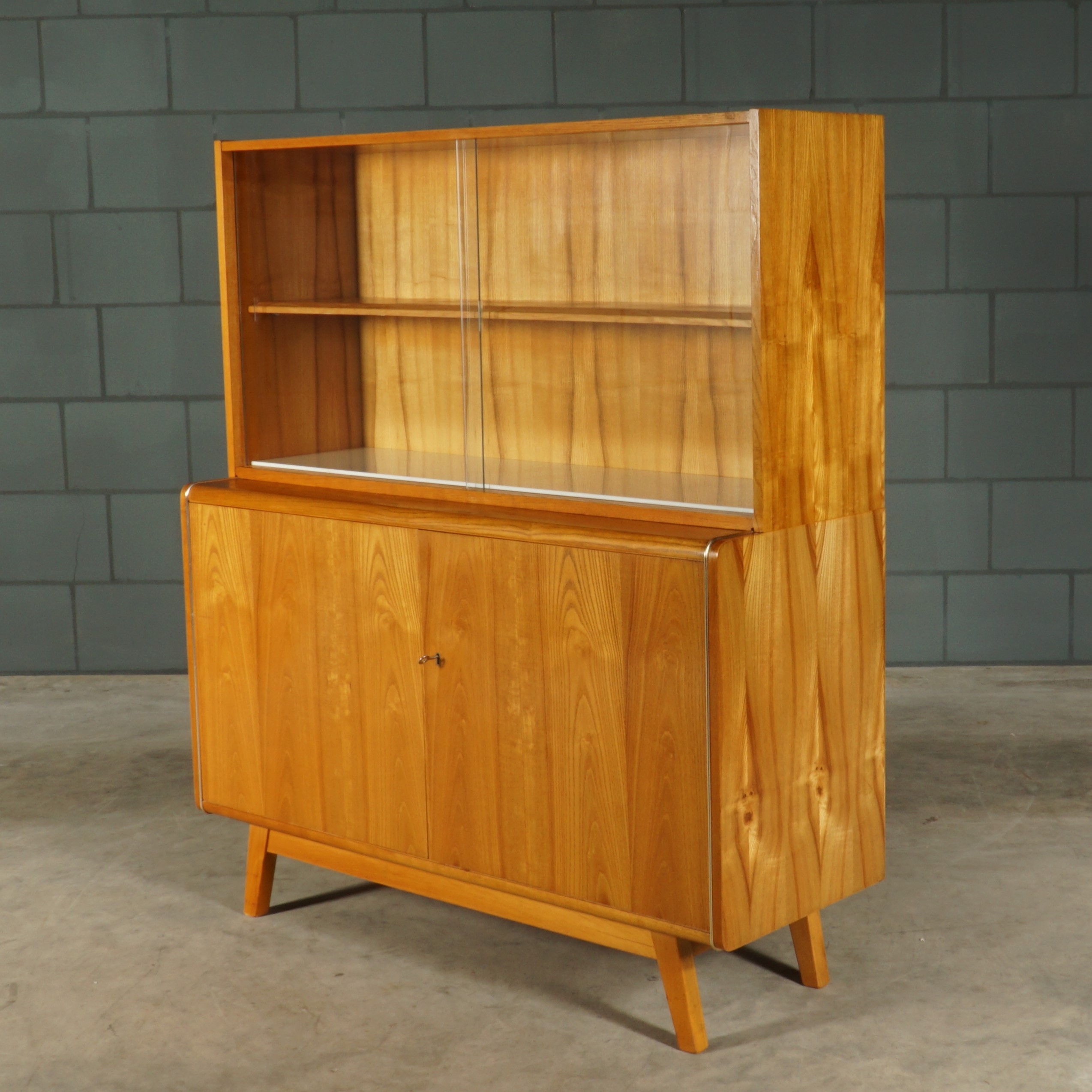 Vintage Czech design buffetkast, vitrinekast of barkast ontworpen door Bohumil Landsman voor Jitona. Geproduceerd in de jaren 60 in het voormalige Tsjechoslowakije. De kast is afgewerkt met een prachtige eikenfineer en heeft glazen elementen en schuine poten. De kast heeft boven twee glazen schuifdeuren met een uitneembare houten legplank en een witte glazen bodemplaat. Onderin heeft de kast twee openslaande deuren met aan beide kanten een uitneembare legplank. De rechterdeur heeft een slot met sleutel. In originele vintage staat met zeer geringe gebruikerssporen. Echt een Tsjechisch juweeltje!