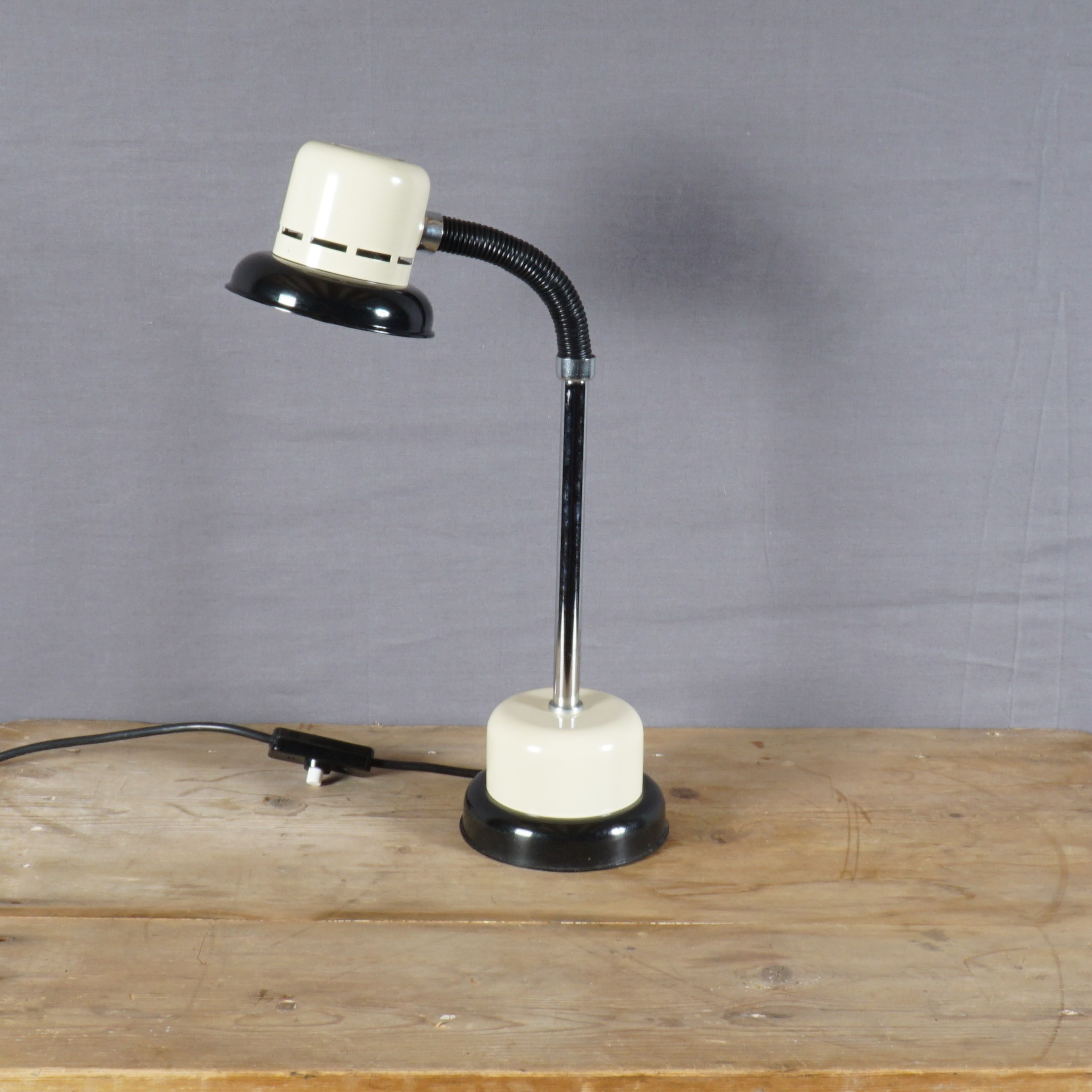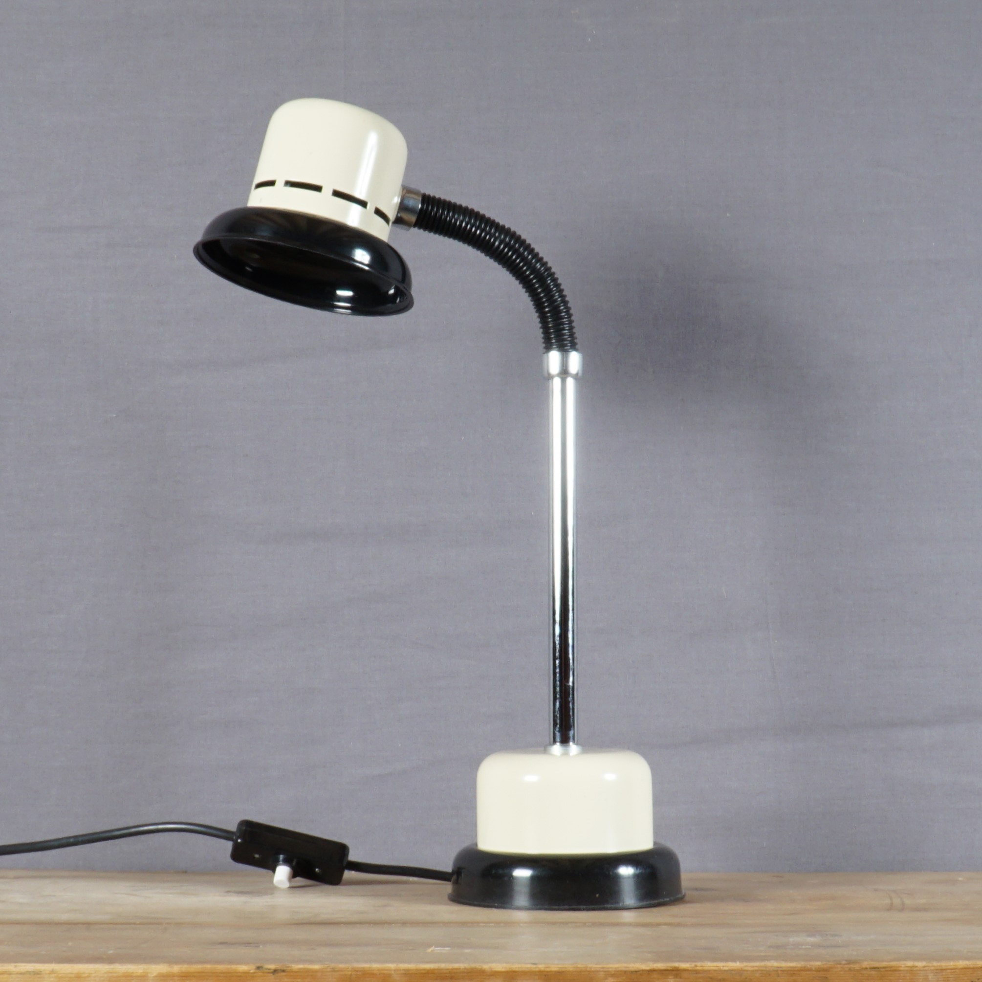 Deze unieke vintage jaren 60 bureaulamp is gemaakt door VEB Narva. Dit was de centrale fabrikant van lampen, vooral gloeilampen, in de Duitse Democratische Republiek. Deze lamp is een blikvanger op uw werktafel en/of bureau. De lamp is van metaal in de kleur (room)wit en heeft een chromen stang, die halverwege overgaat in een zwarte spiraalstang. Daardoor kan de lamp in allerlei posities worden gebogen. De vintage lamp heeft nauwelijks gebruikssporen en functioneert naar behoren. De lamp is in de hoogste stand ongeveer 50 cm hoog.