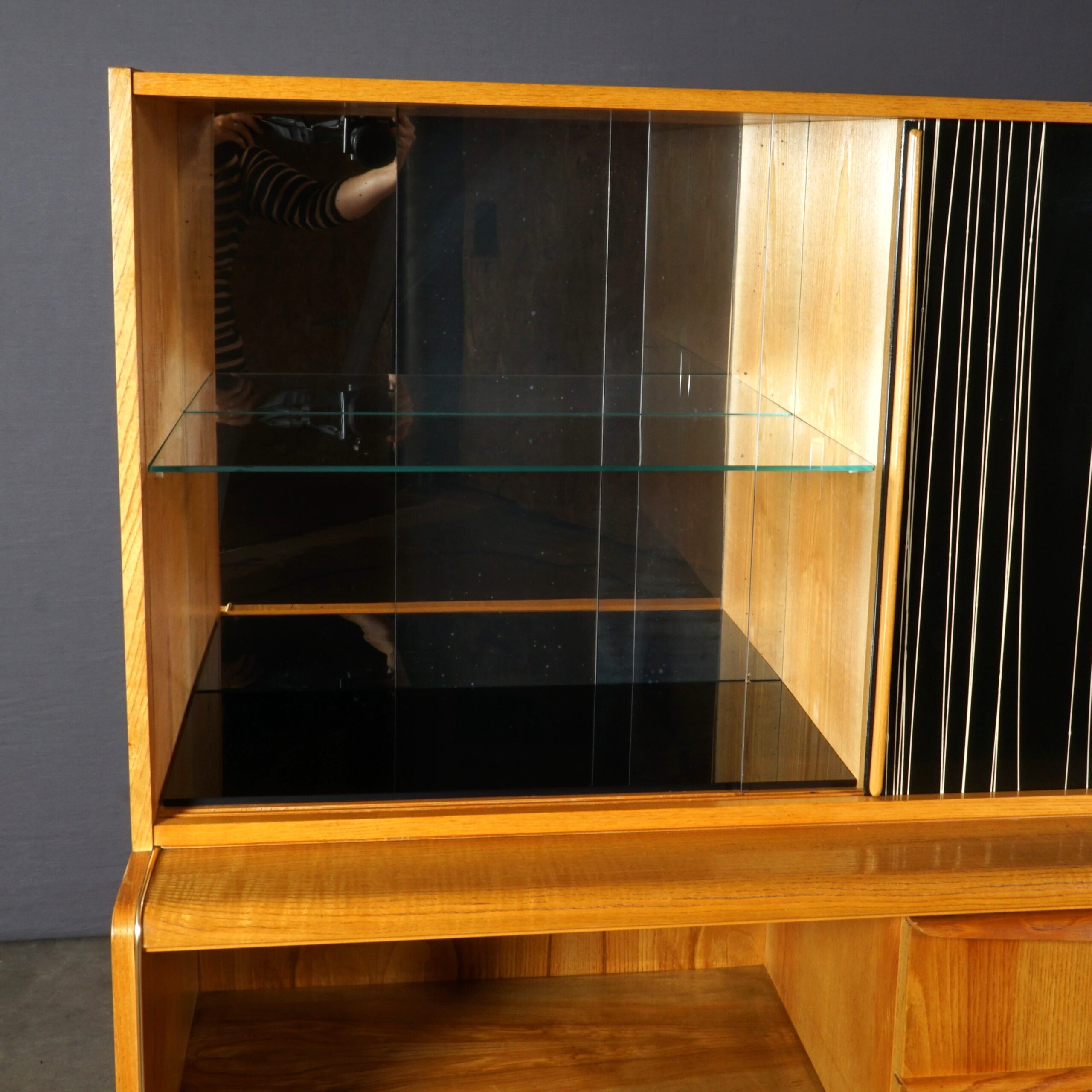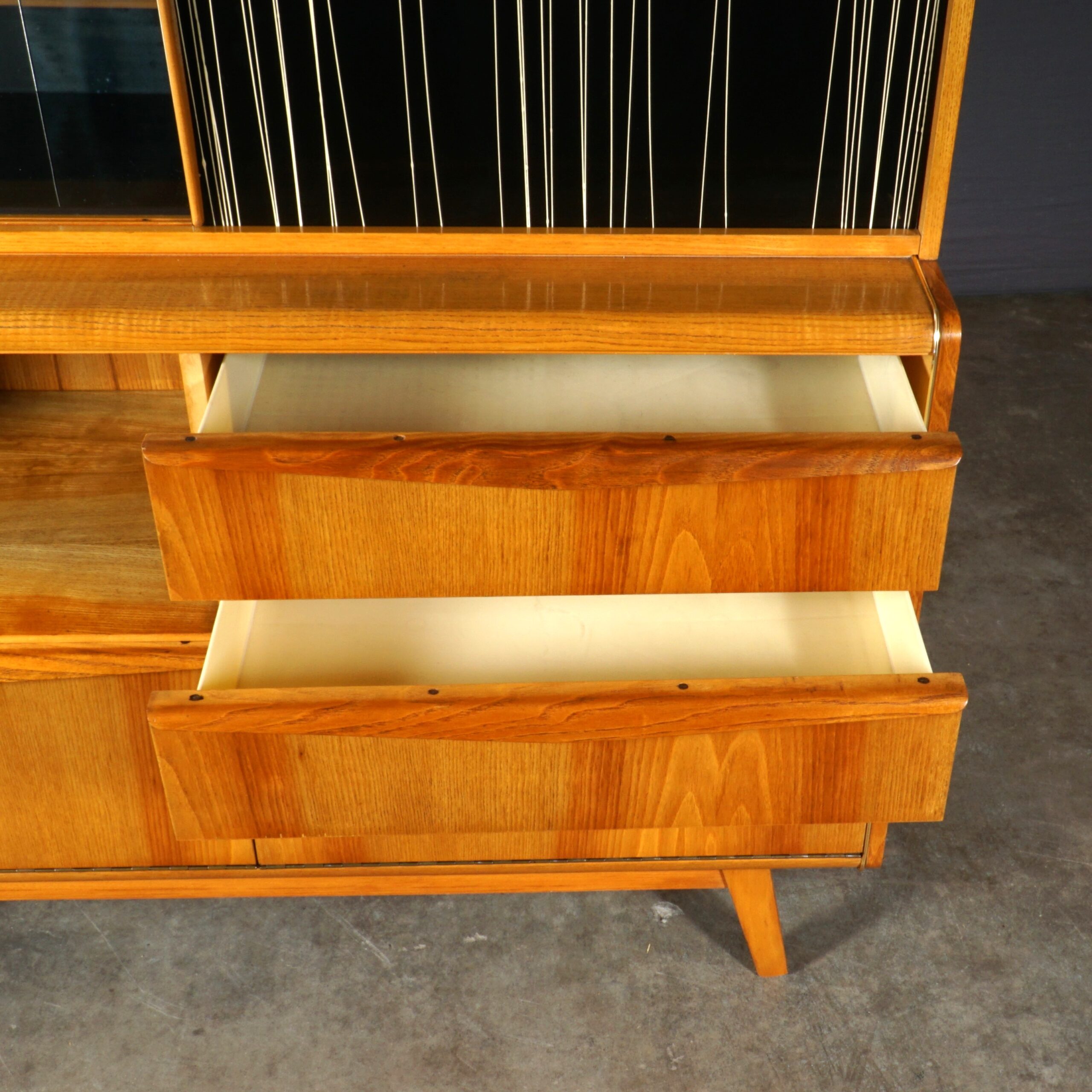 Vintage Czech design cocktail barkast met vitrine ontworpen door Bohumil Landsman voor Jitona. Geproduceerd in de jaren 60 in het voormalige Tsjechoslowakije. De cocktail barkast is voorzien van twee lades aan de rechterzijde en twee klepdeuren aan de onderzijde. Ideaal om je flessen drank & glaswerk in op te bergen. De vitrine en cocktailbar zijn voorzien van spiegels en een zwarte glasplaat, wat zorgt voor een extra luxueus effect. De zwarte schuifdeur is mooi gedetailleerd met een speels patroon. Achter deze schuifdeur zit een zeer bijzondere cocktailbar, opgebouwd met glasplaten. De cocktail barkast is een prachtig Tsjechisch juweeltje! De kast verkeert in hele mooie conditie, met slechts geringe gebruikssporen.