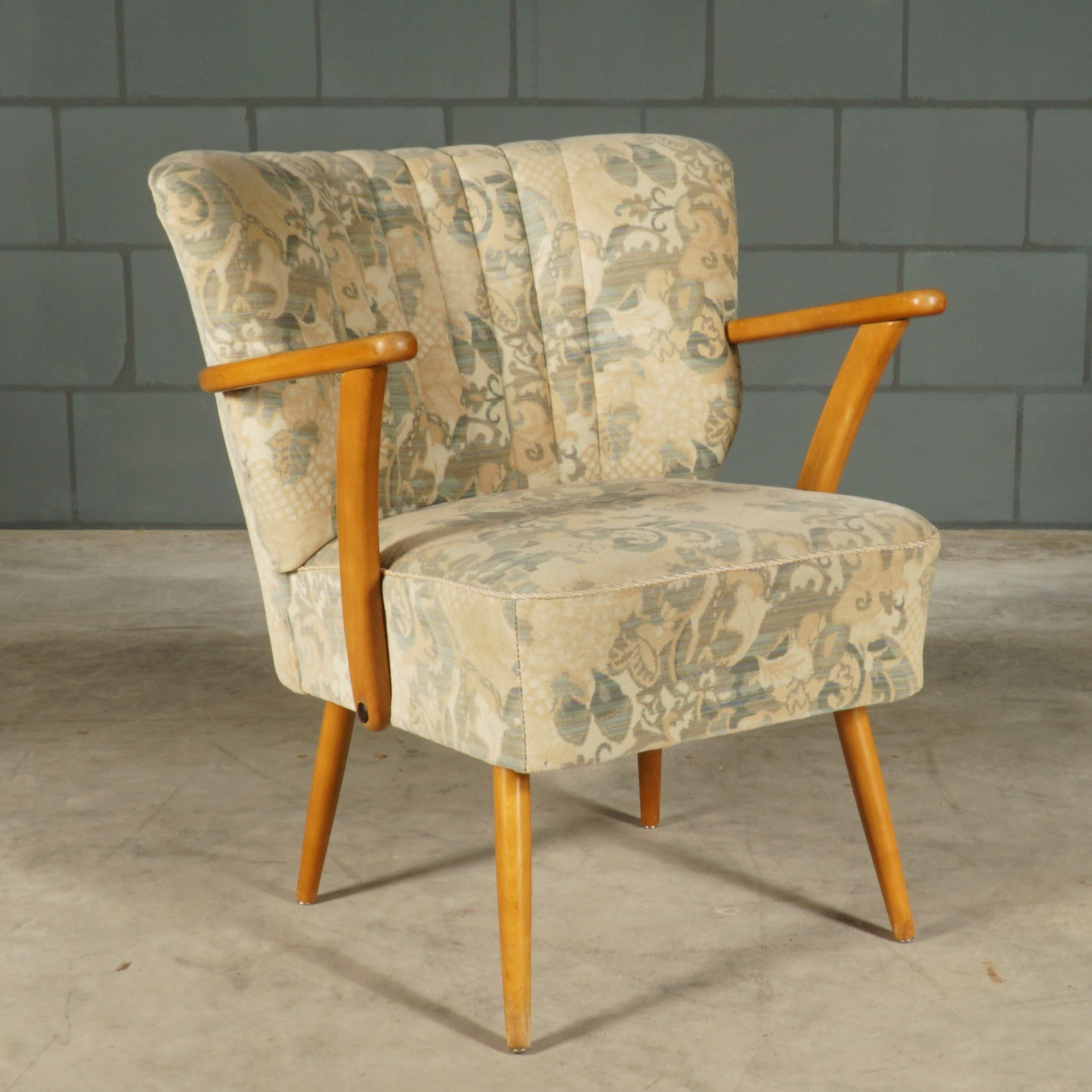 Dit geweldig leuke fauteuiltje dateert uit de jaren 60. De fauteuil is uitgevoerd in een prachtige dikke velours stof met speels motief. De armleuningen en poten zijn gemaakt van notenhout. Dit geeft een mooi contrast met de warme bekleding. Naast het mooie ontwerp zit de fauteuil ook zeer comfortabel. De fauteuil is, gelet op de leeftijd, in een bijzonder goede staat. De fauteuil heeft nog de originele bekleding, welke nergens is beschadigd of gevlekt. De zit is nog heel stevig.