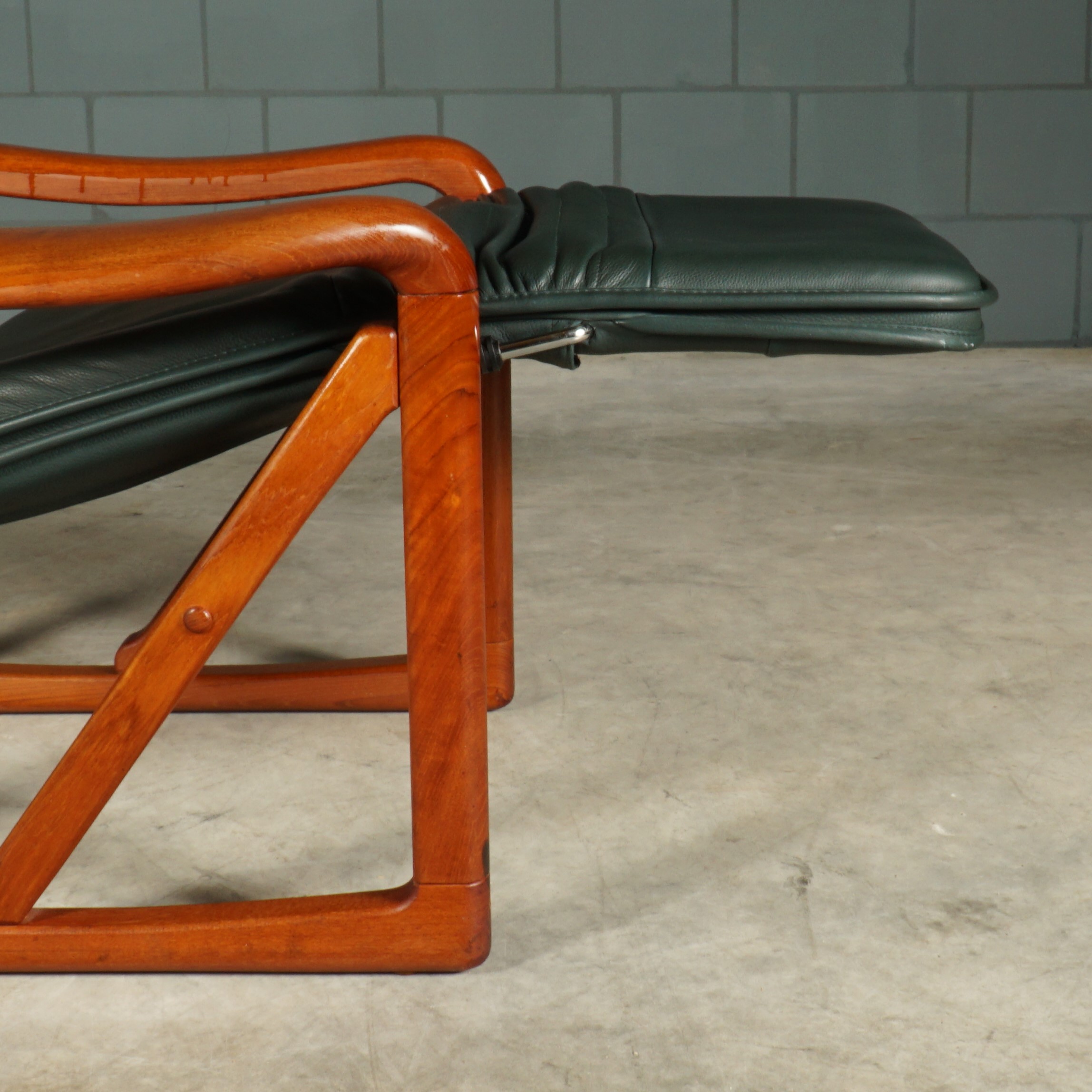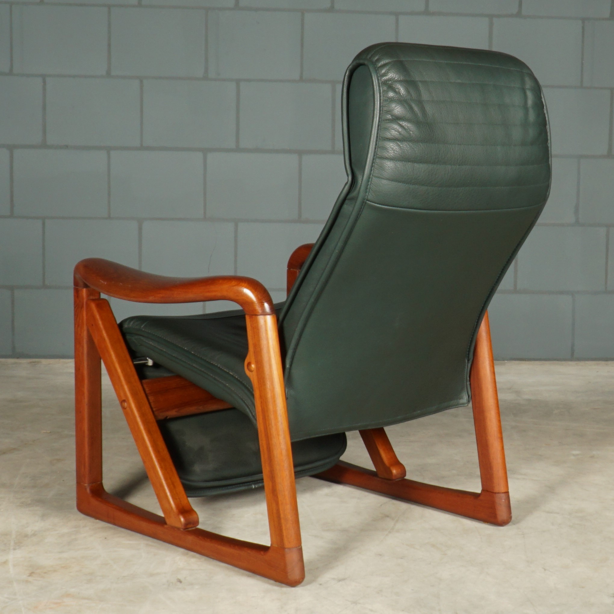 Deze Deense hoogwaardige donkergroene lederen relaxfauteuil is ontworpen door het Scandinavische AP Design & Comfort. De fauteuil dateert uit eind jaren 90 en is in prachtstaat met weinig gebruikssporen. Het leer is nog heel mooi en soepel. Het onderstel is gemaakt van massief teakhout, waardoor deze fauteuil wat zwaarder is en daardoor erg stabiel staat. Deze luxe relaxfauteuil is in één soepele beweging te veranderen in een ligstoel. De hoofdsteun is daarbij ook verstelbaar, zodat je deze in iedere gewenste positie kunt zetten voor een optimaal relaxte houding van rug en nek. Zo rust je lekker uit!