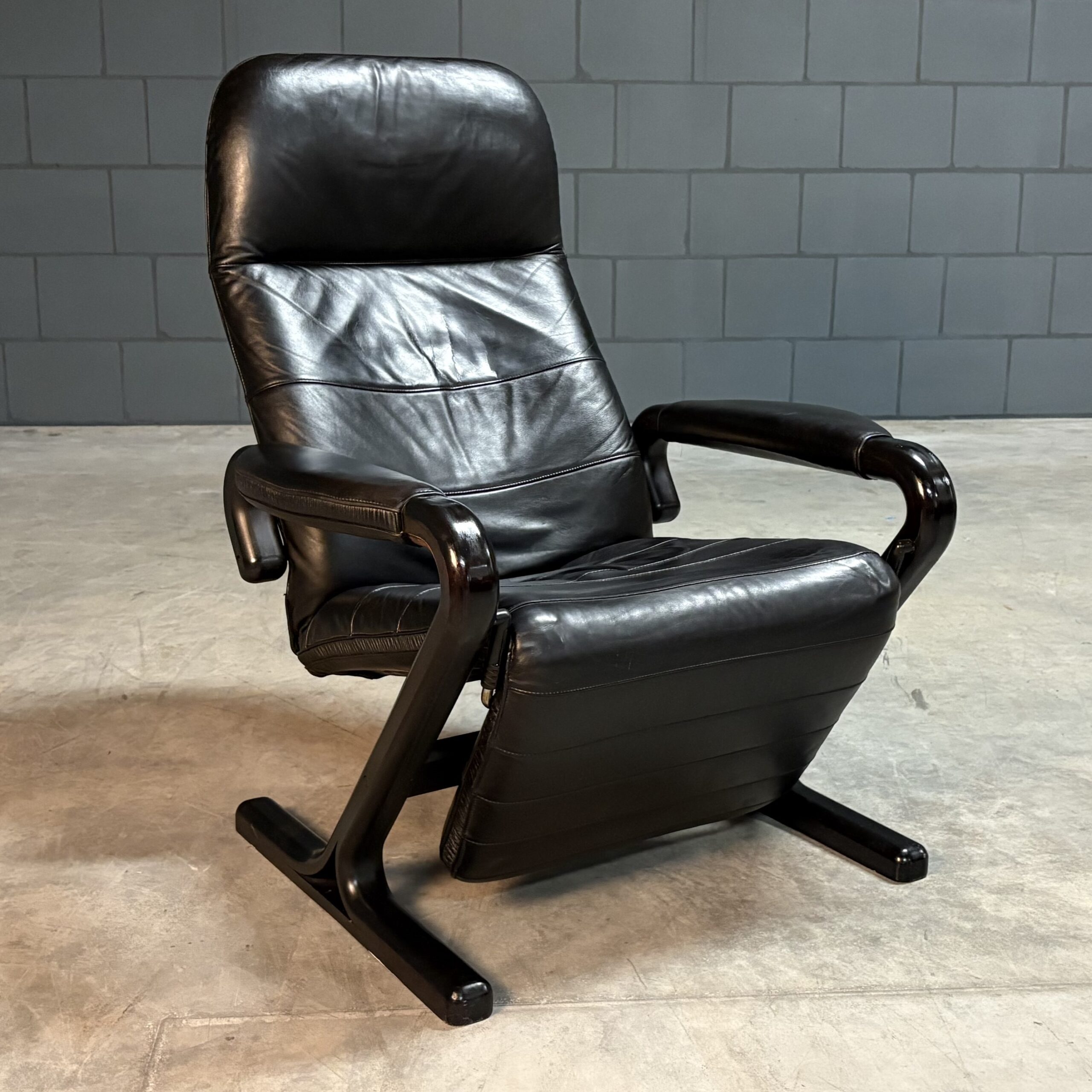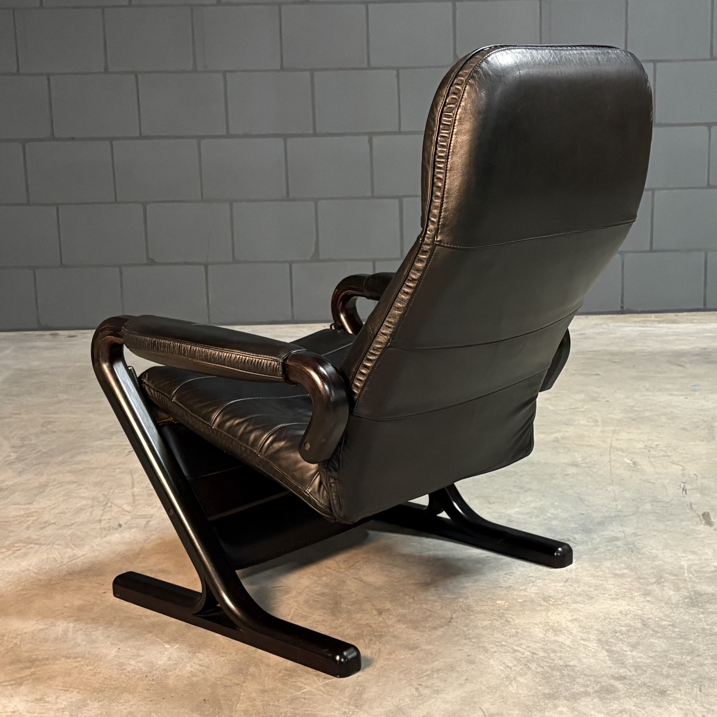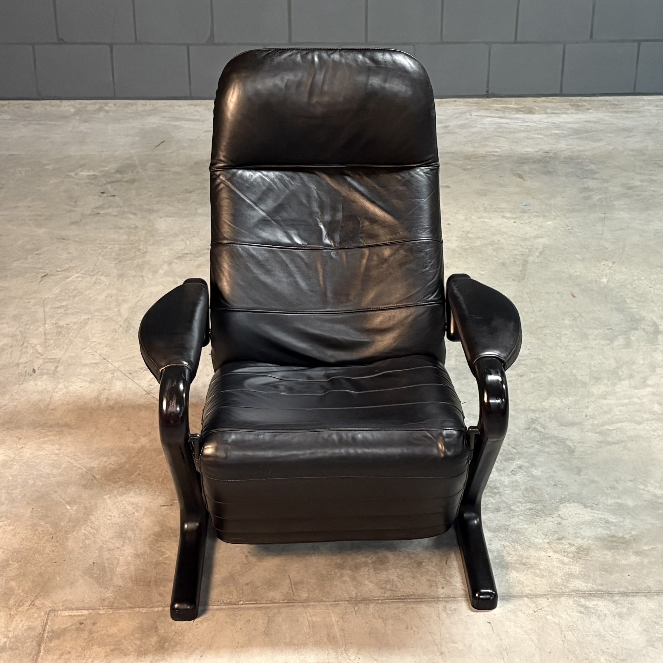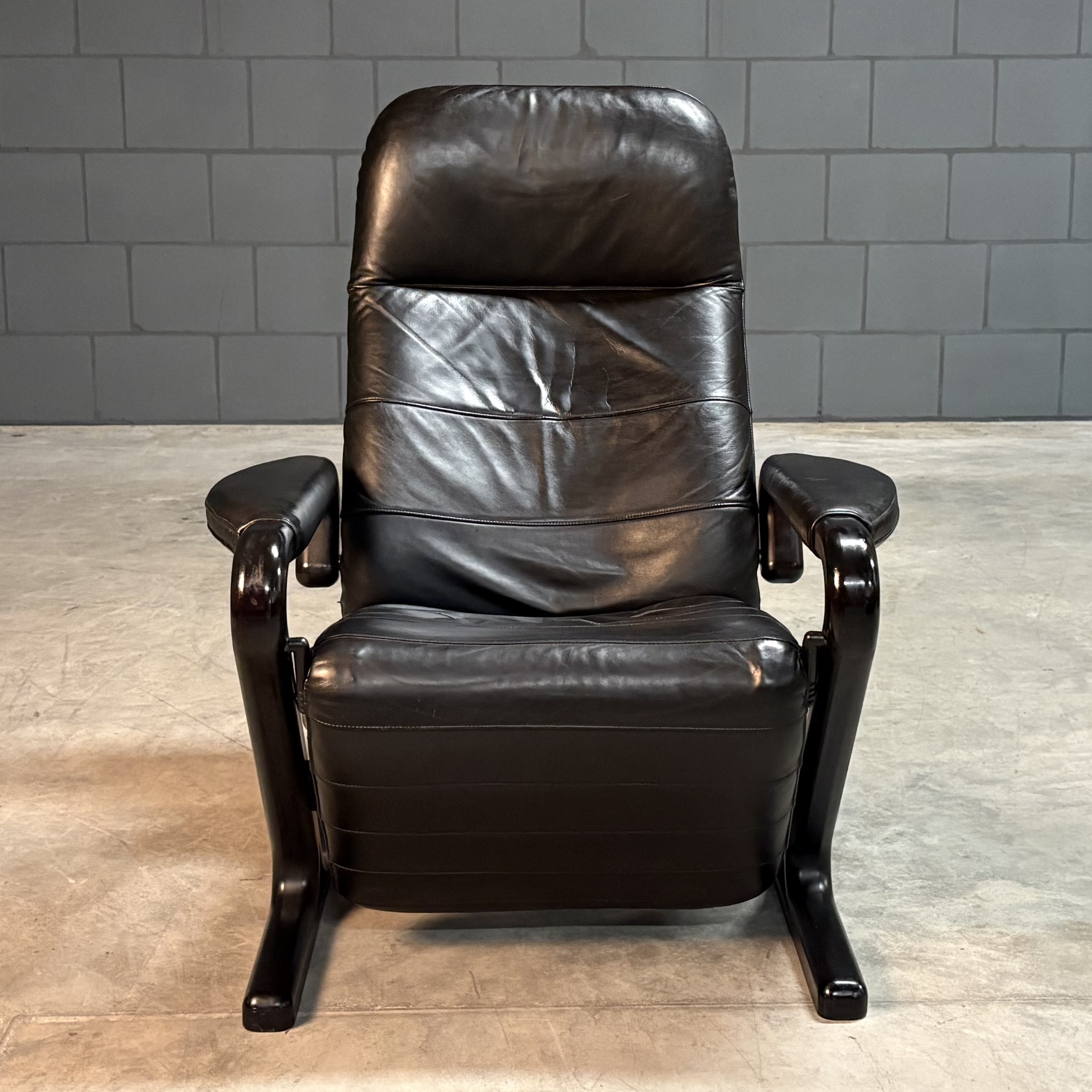 Deze Deense hoogwaardige zwart lederen relaxfauteuil dateert uit eind jaren 90 en is in prachtstaat met weinig gebruikssporen. Het leer is nog heel mooi en soepel. Het onderstel is gemaakt van massief hout, waardoor deze fauteuil wat zwaarder is en daardoor erg stabiel staat. Deze luxe relaxfauteuil is in één soepele beweging te veranderen in een ligstoel. De stoel heeft een fijne hoofdsteun voor een optimaal relaxte houding van rug en nek. Zo rust je lekker uit!