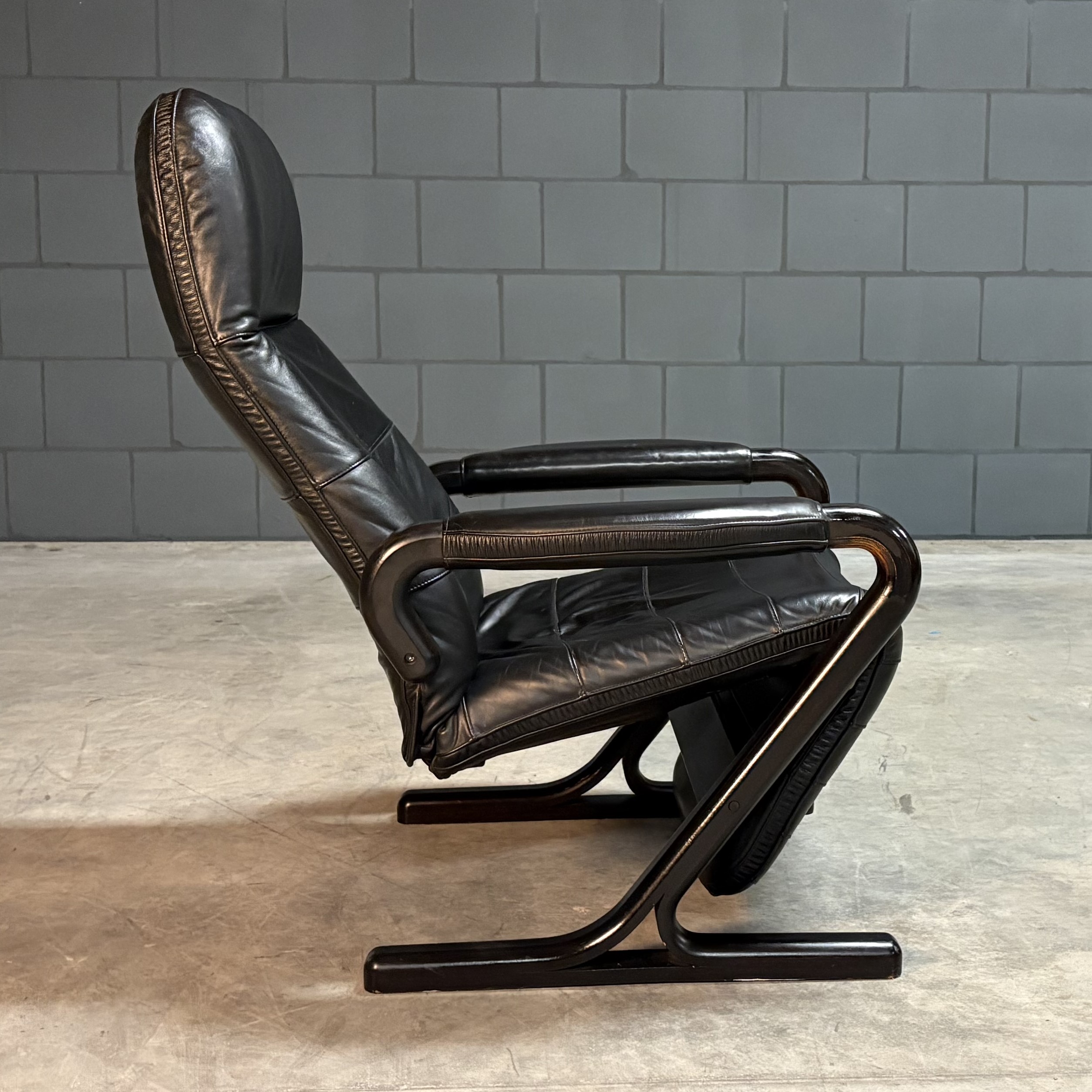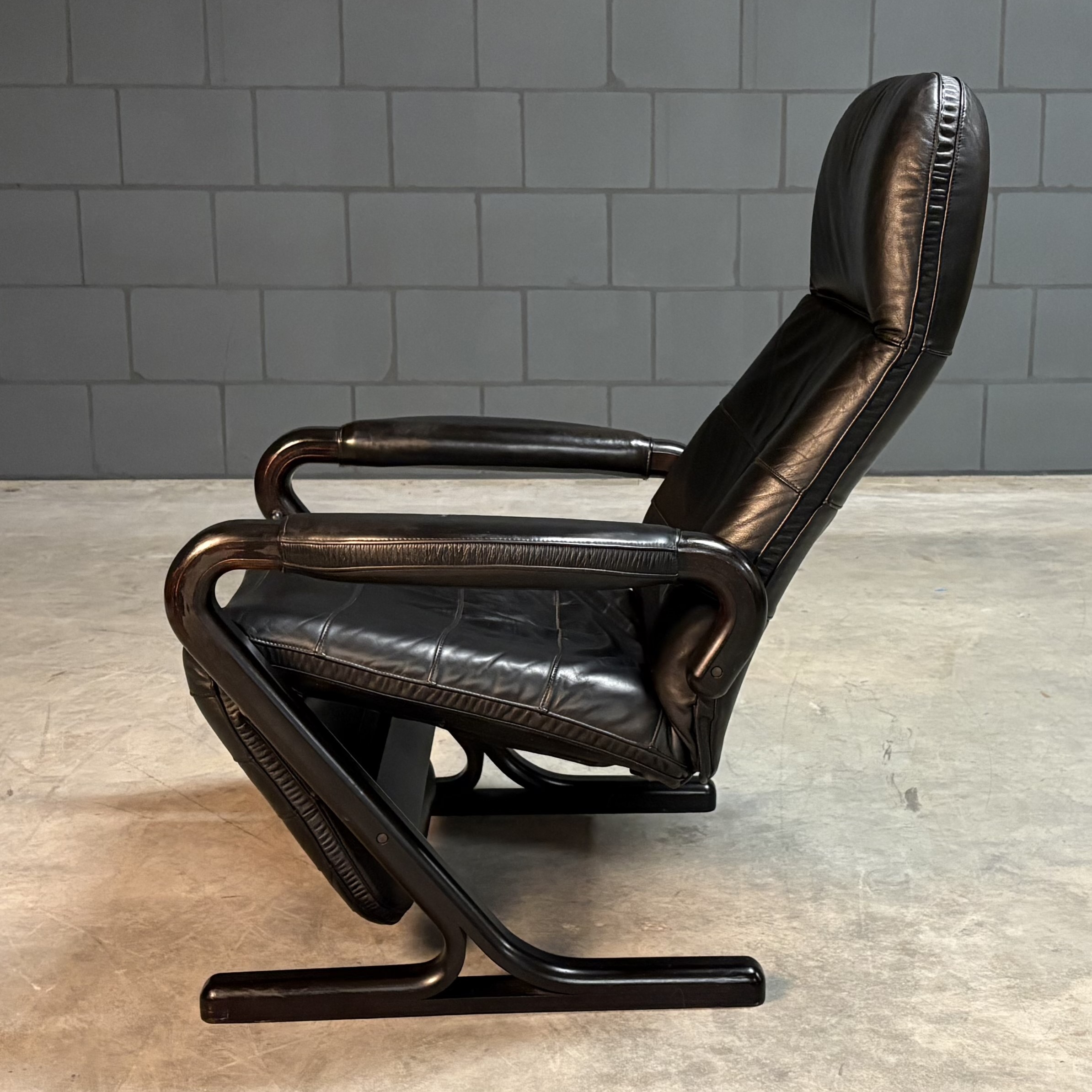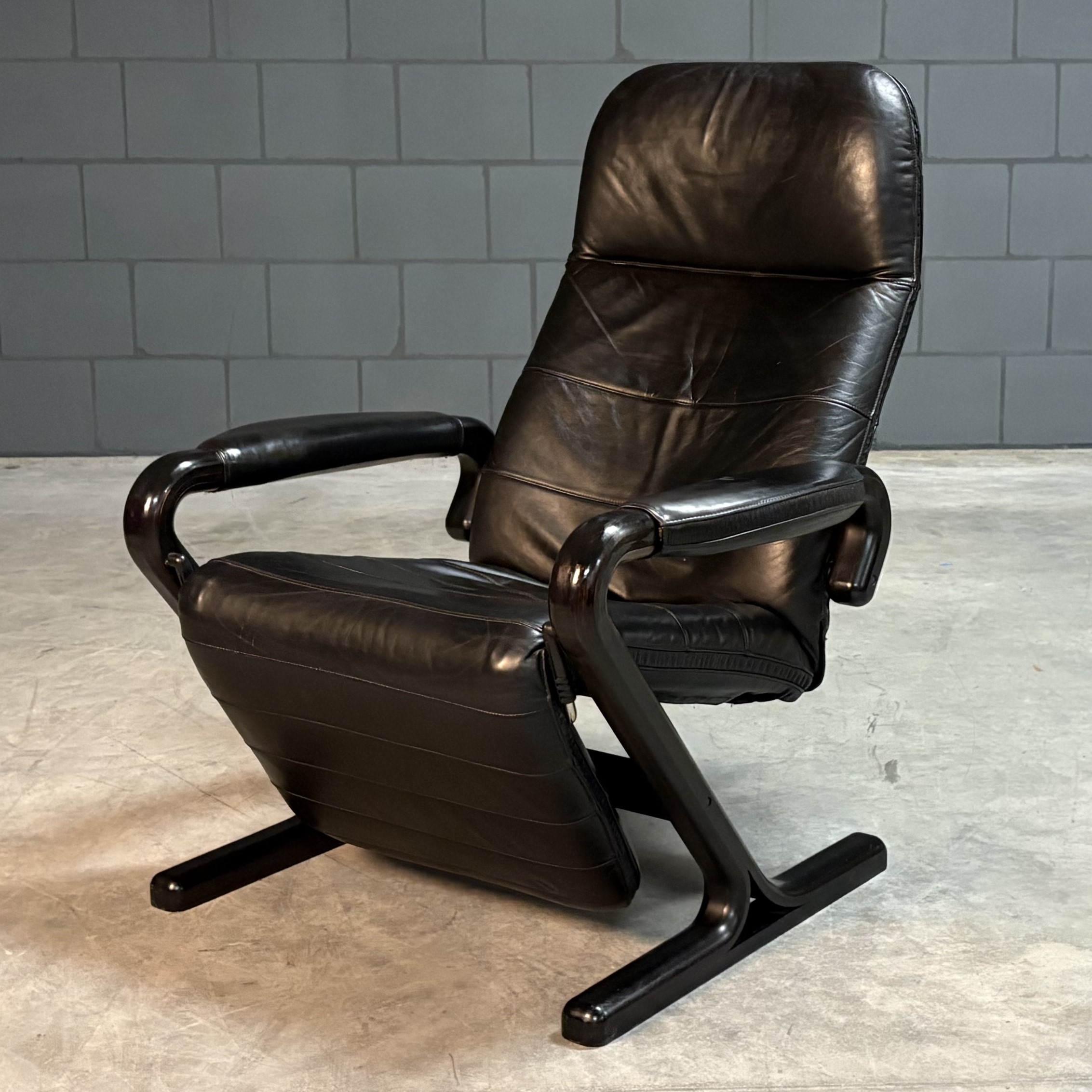 Deze Deense hoogwaardige zwart lederen relaxfauteuil dateert uit eind jaren 90 en is in prachtstaat met weinig gebruikssporen. Het leer is nog heel mooi en soepel. Het onderstel is gemaakt van massief hout, waardoor deze fauteuil wat zwaarder is en daardoor erg stabiel staat. Deze luxe relaxfauteuil is in één soepele beweging te veranderen in een ligstoel. De stoel heeft een fijne hoofdsteun voor een optimaal relaxte houding van rug en nek. Zo rust je lekker uit!