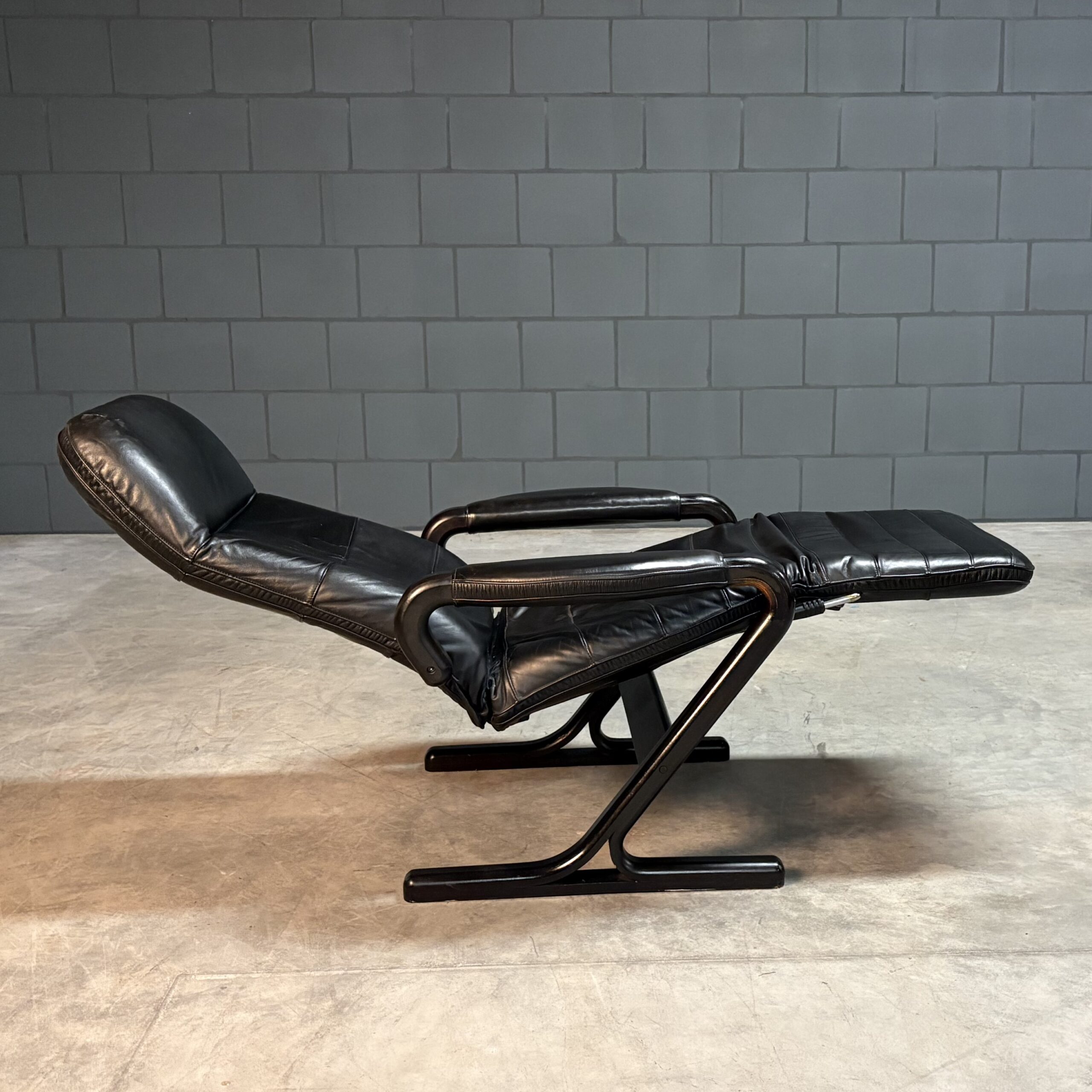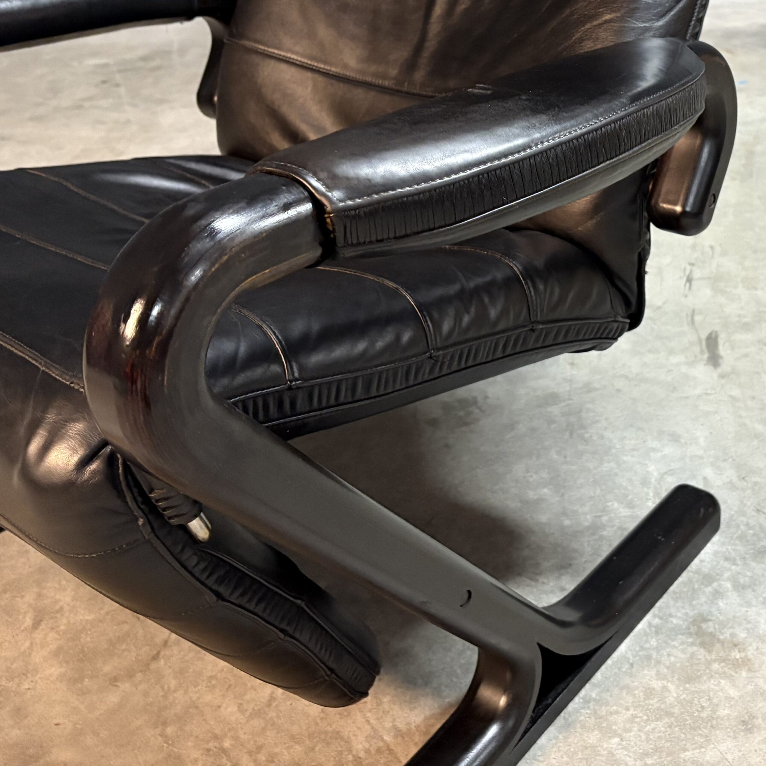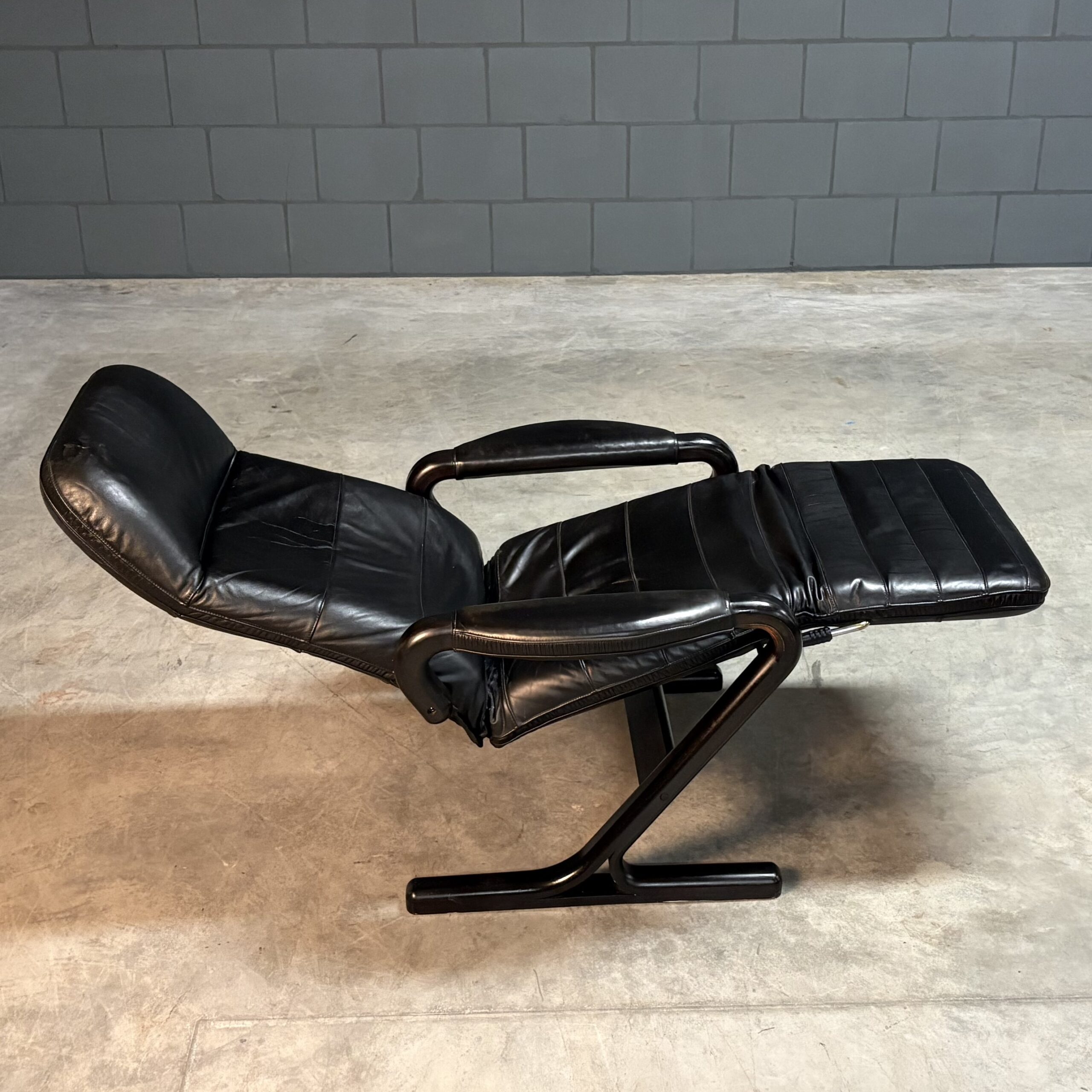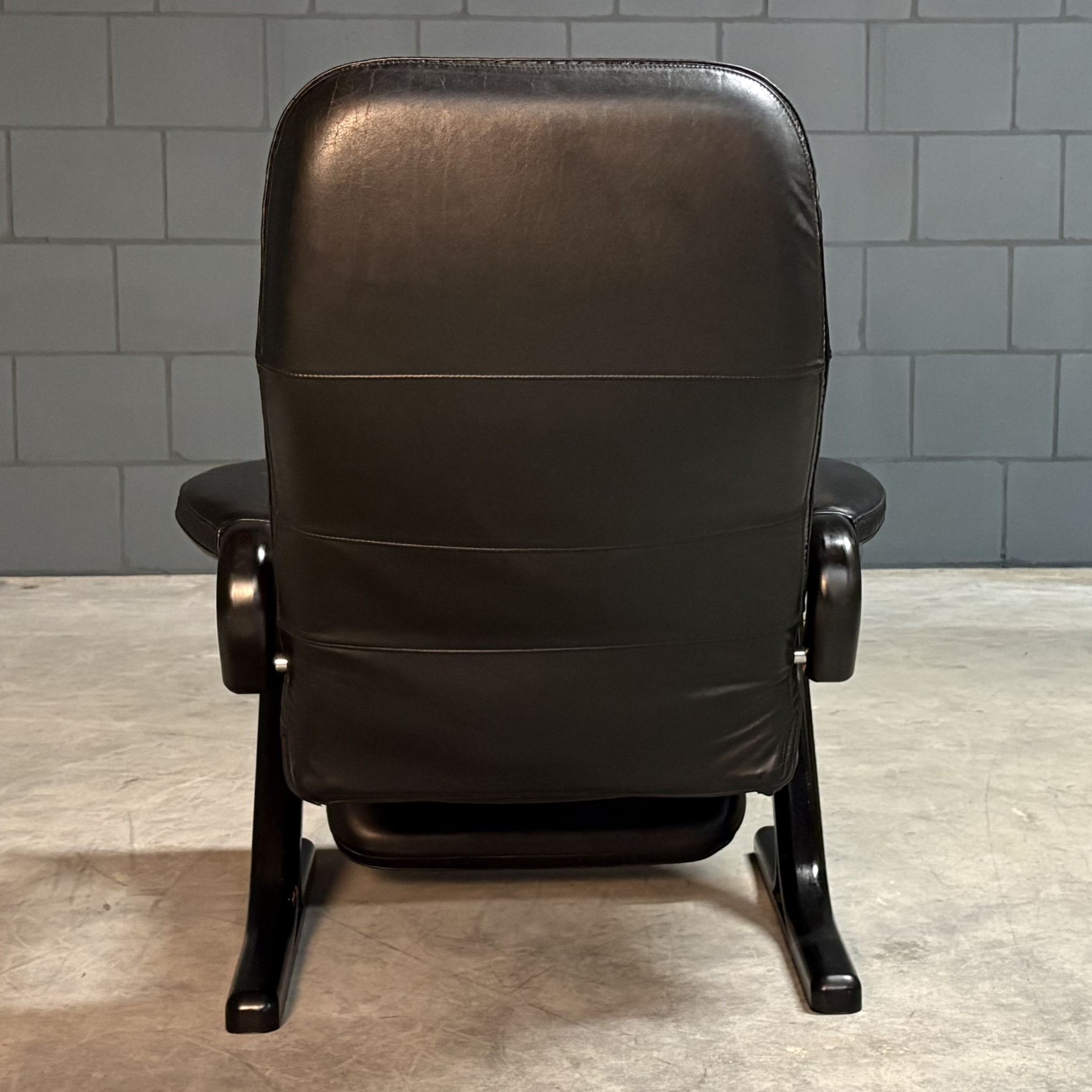 Deze Deense hoogwaardige zwart lederen relaxfauteuil dateert uit eind jaren 90 en is in prachtstaat met weinig gebruikssporen. Het leer is nog heel mooi en soepel. Het onderstel is gemaakt van massief hout, waardoor deze fauteuil wat zwaarder is en daardoor erg stabiel staat. Deze luxe relaxfauteuil is in één soepele beweging te veranderen in een ligstoel. De stoel heeft een fijne hoofdsteun voor een optimaal relaxte houding van rug en nek. Zo rust je lekker uit!