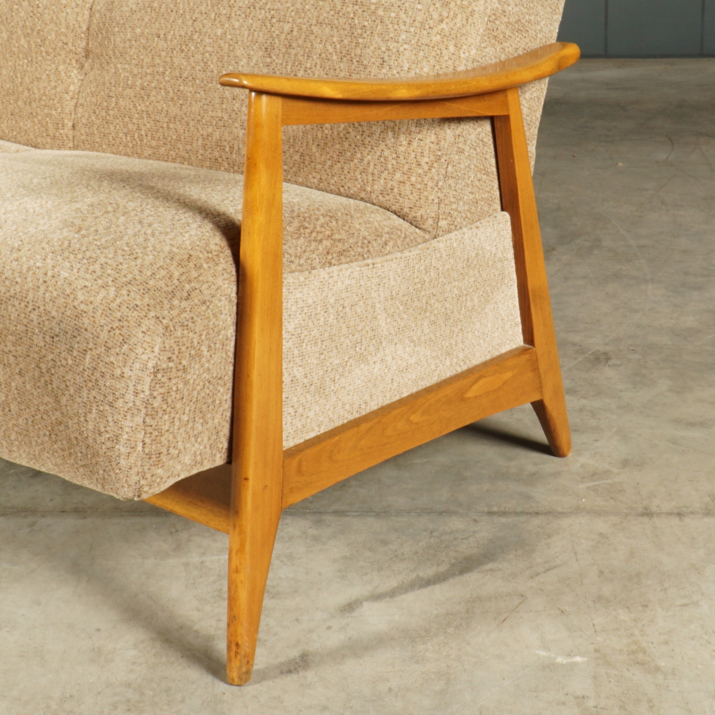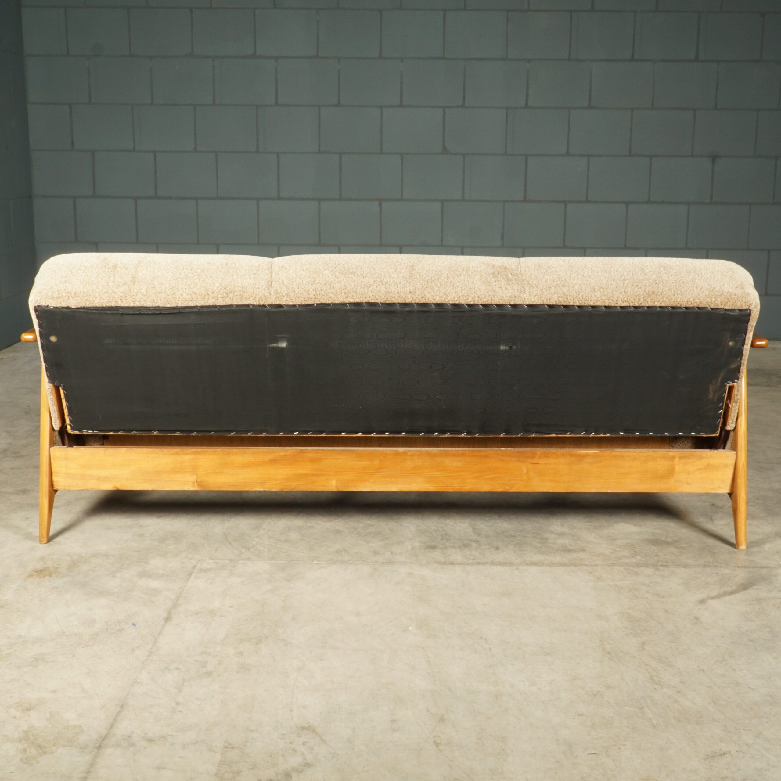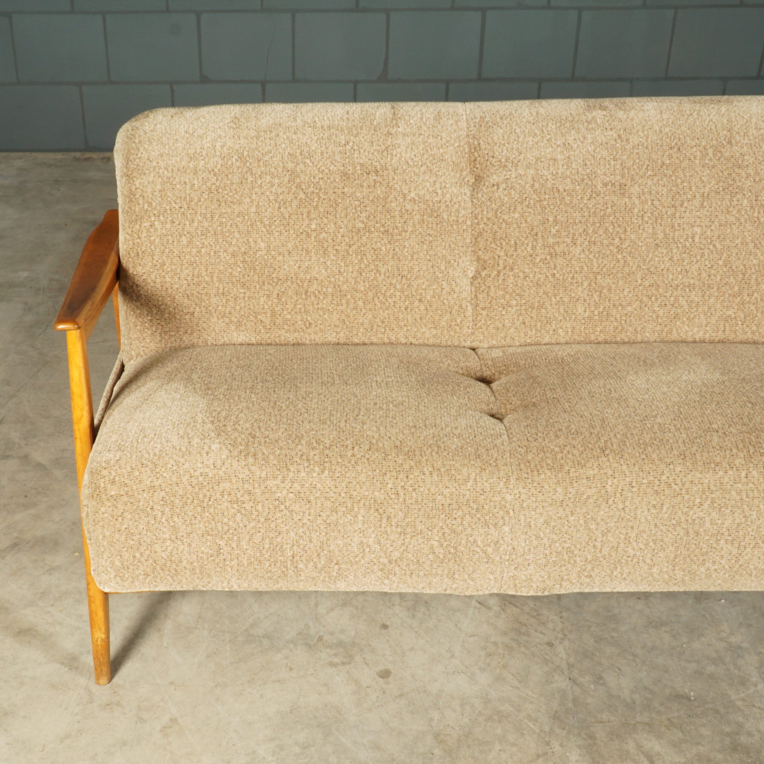 Deze topper onder de vintage slaapbanken komt uit Denemarken en is geproduceerd in de jaren 60. De designer is helaas onbekend, maar wat een design en wat een topkwaliteit! De bank heeft een zeer elegante uitstraling waarbij het frame is gemaakt van massief notenhout en de kussen zijn bekleed met een mooie kwalitatieve stof in een gemêleerde beigetint. Niet alleen heel fraai, maar ook nog eens super praktisch aangezien de bank in één simpele beweging uit te klappen is tot een slaapbank. De bank is in zeer mooie vintage staat en zit heerlijk comfortabel. Het houten frame heeft wat lichte gebruikssporen, maar de bekleding is als nieuw.