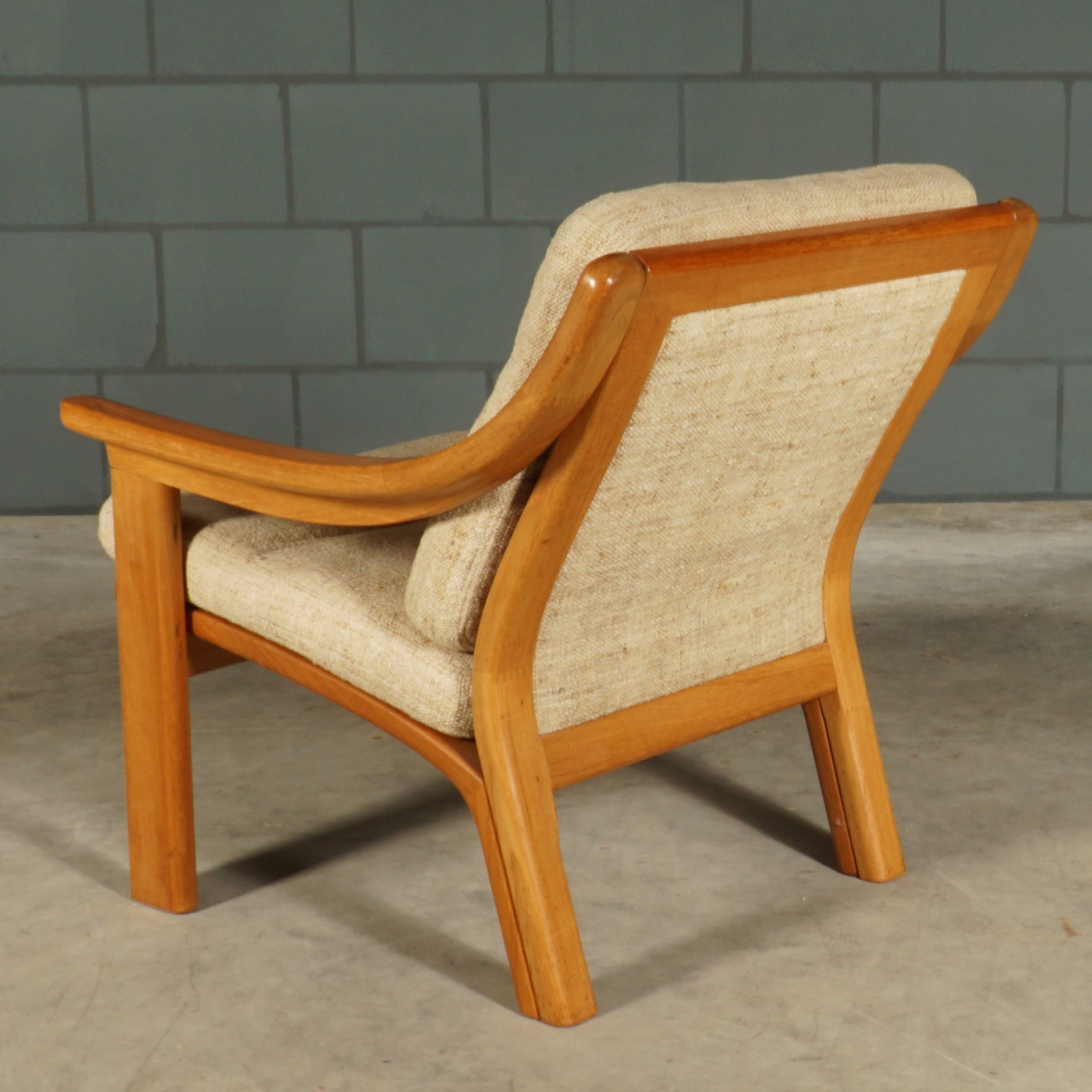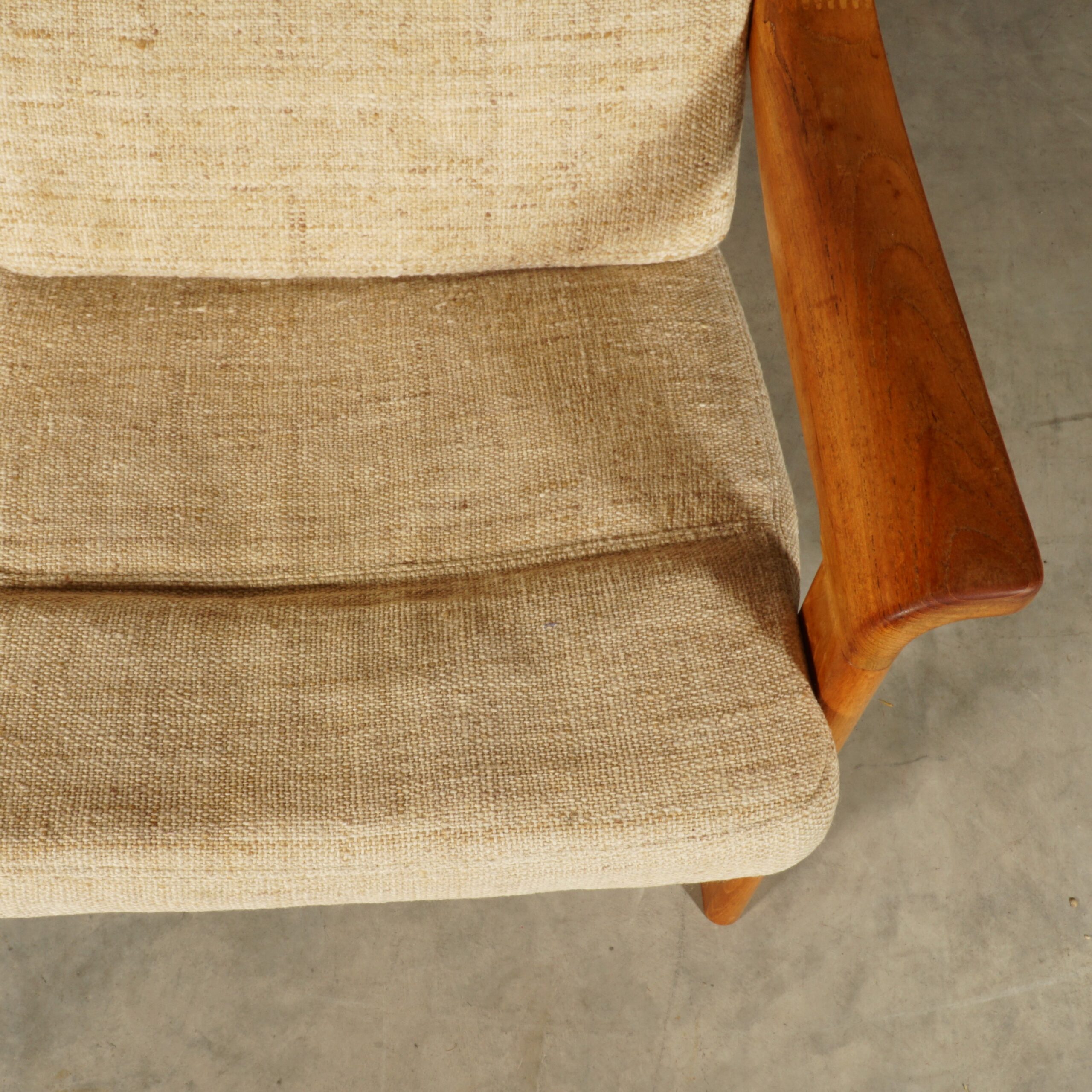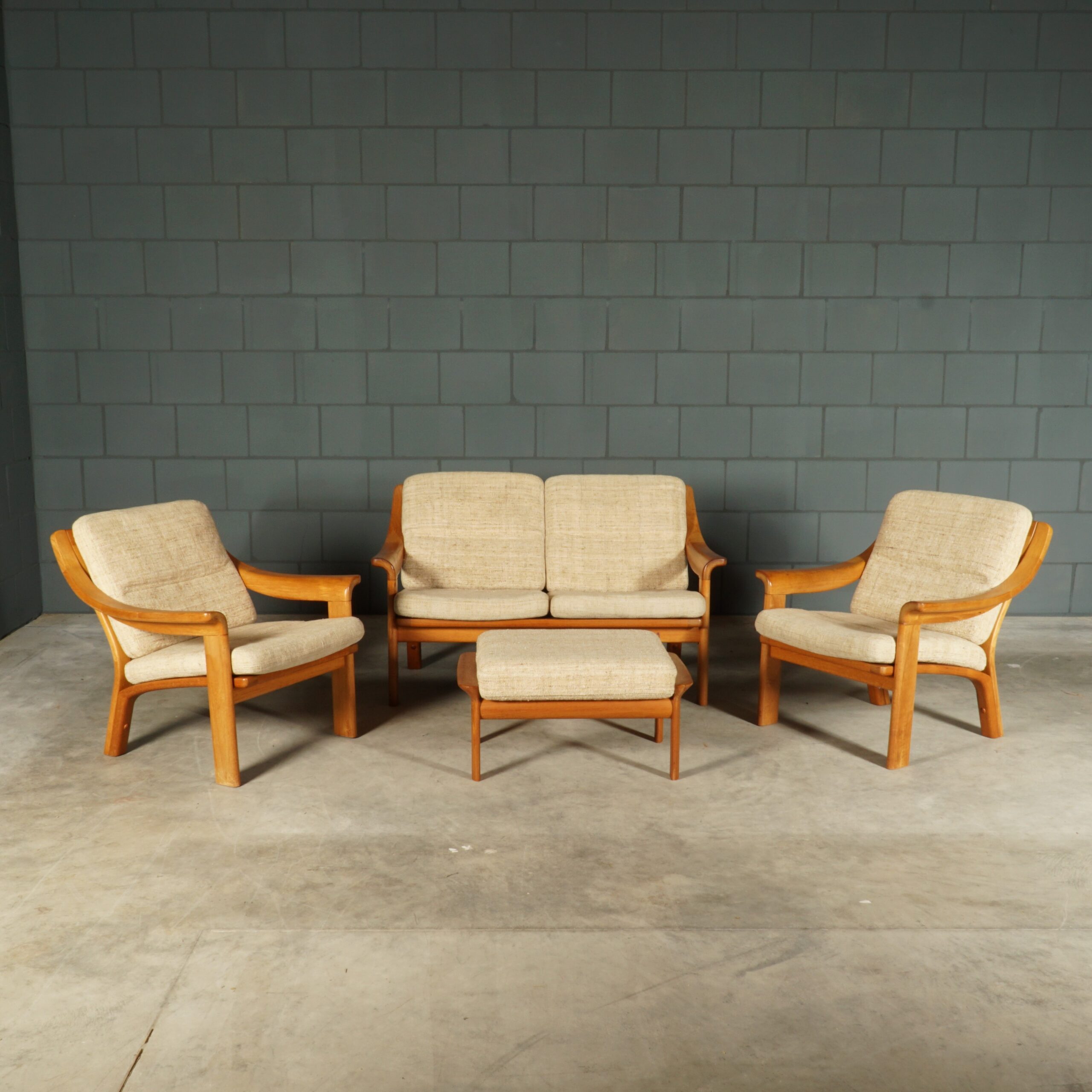 Deze prachtige Deense teakhouten zitgroep dateert uit de jaren 60 en bestaat uit een tweezits bank, twee fauteuils en een hocker. De ontwerper of fabrikant zijn helaas onbekend, maar het kan niet anders dan dat er een goede ontwerper achter zit! Wat een design en wat een kwaliteit! Zowel de bank als de fauteuils hebben een zeer elegante uitstraling waarbij de frames zijn gemaakt van teakhout en de kussens zijn bekleed met een mooie kwalitatieve stof in een gemêleerde crème/beige tint. Niet alleen heel fraai, maar ook nog eens super praktisch aangezien alle kussens los en afritsbaar zijn. De bank en fauteuils bieden een zeer prettig zitcomfort. Een ware eye-catcher zowel in uw woning als bedrijf! Het geheel is in zeer mooie vintage staat. Zowel het hout als de kussens hebben nauwelijks gebruikssporen.