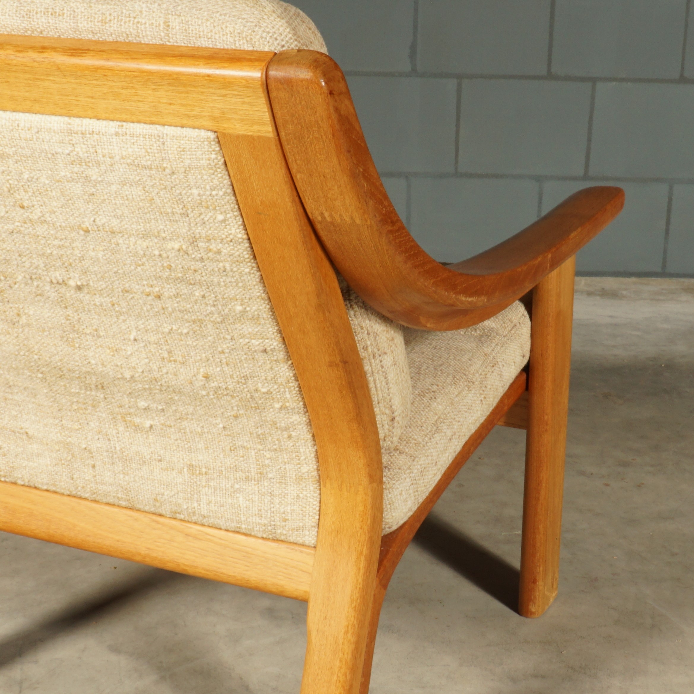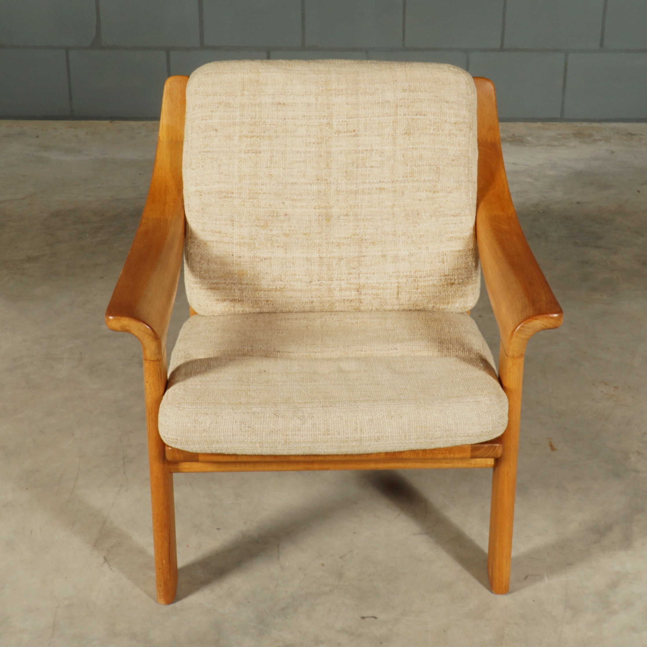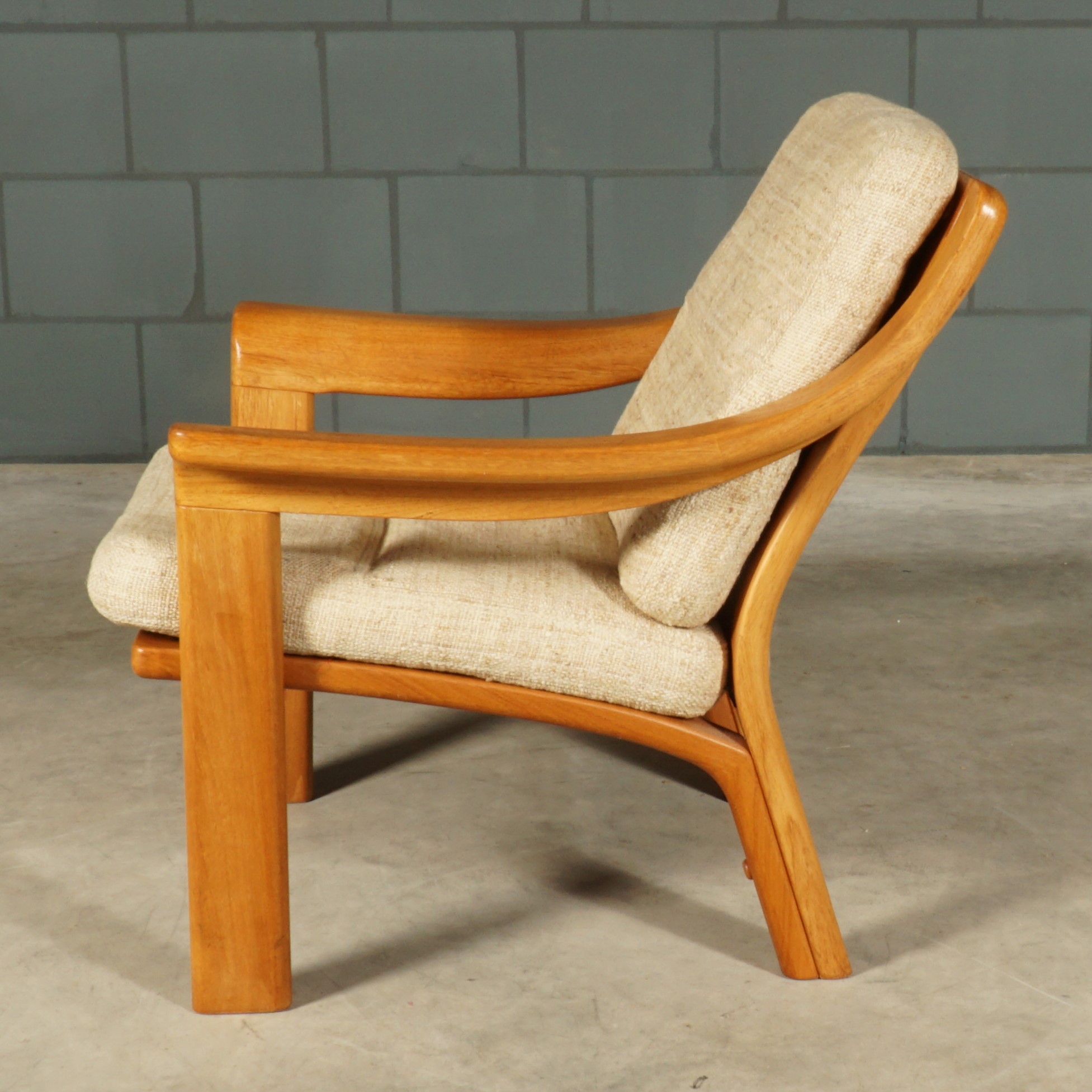 Deze prachtige Deense teakhouten zitgroep dateert uit de jaren 60 en bestaat uit een tweezits bank, twee fauteuils en een hocker. De ontwerper of fabrikant zijn helaas onbekend, maar het kan niet anders dan dat er een goede ontwerper achter zit! Wat een design en wat een kwaliteit! Zowel de bank als de fauteuils hebben een zeer elegante uitstraling waarbij de frames zijn gemaakt van teakhout en de kussens zijn bekleed met een mooie kwalitatieve stof in een gemêleerde crème/beige tint. Niet alleen heel fraai, maar ook nog eens super praktisch aangezien alle kussens los en afritsbaar zijn. De bank en fauteuils bieden een zeer prettig zitcomfort. Een ware eye-catcher zowel in uw woning als bedrijf! Het geheel is in zeer mooie vintage staat. Zowel het hout als de kussens hebben nauwelijks gebruikssporen.