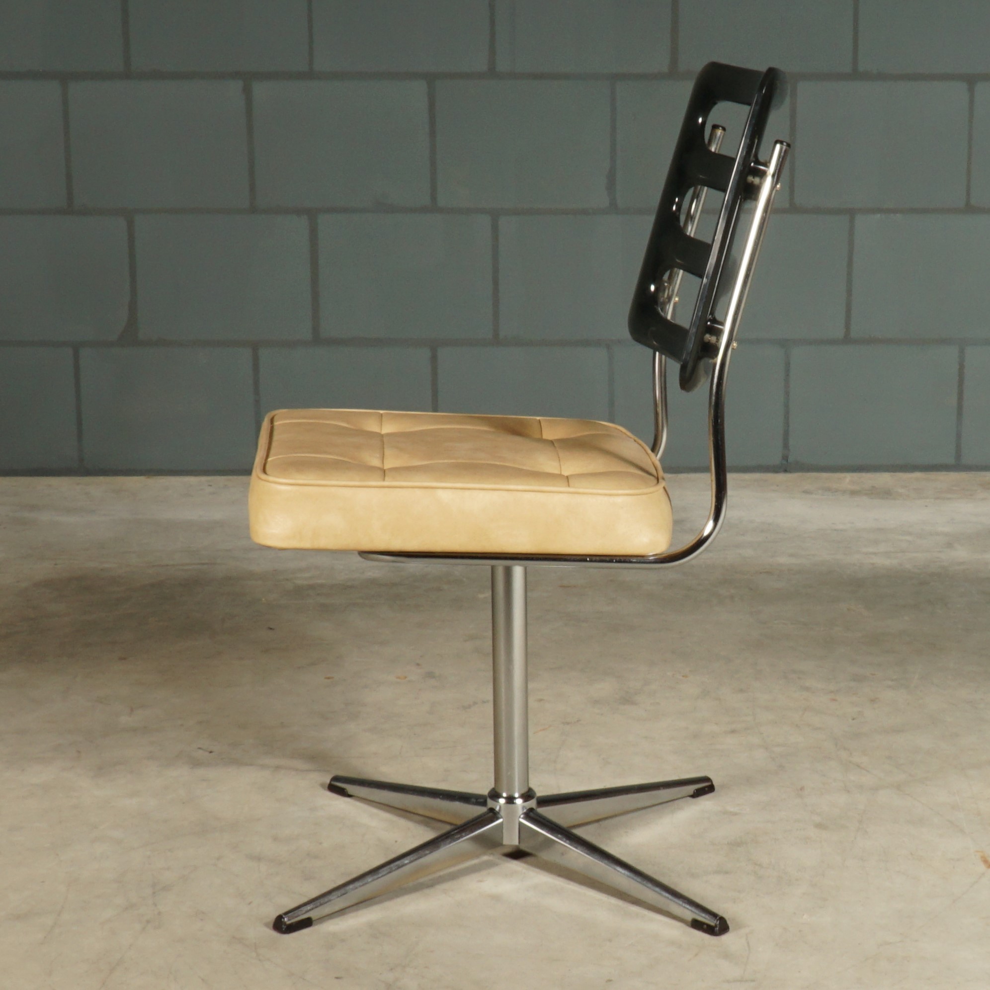 Super coole vintage eetkamerstoelen van Namco Australië uit de jaren 70. De opvallende rugleuningen zijn vervaardigd van het doorzichtige kunststof ‘Lucite genaamd. De zittingen zijn bekleed met een crèmekleurig skaileder. De stoelen hebben een verchroomde voet met rubberen voetjes. Deze stoelen kunnen dienst doen als super comfortabele bureaustoelen of natuurlijk als geweldige eetkamerstoelen. De stoelen zijn in mooie vintage staat met gebruikssporen. Voornamelijk de rugleuningen hebben her en der wat krassen en slijtage/beschadigingen. Bij één stoel ontbreekt er een knoop op de zitting. Hoe dan ook, het zijn nog steeds geweldige eye-catchers!