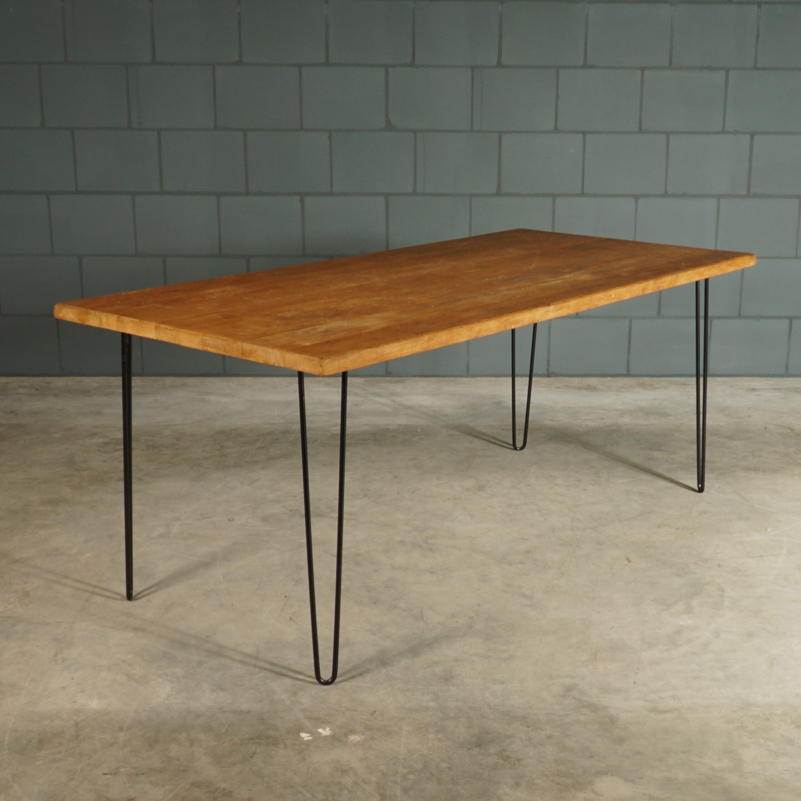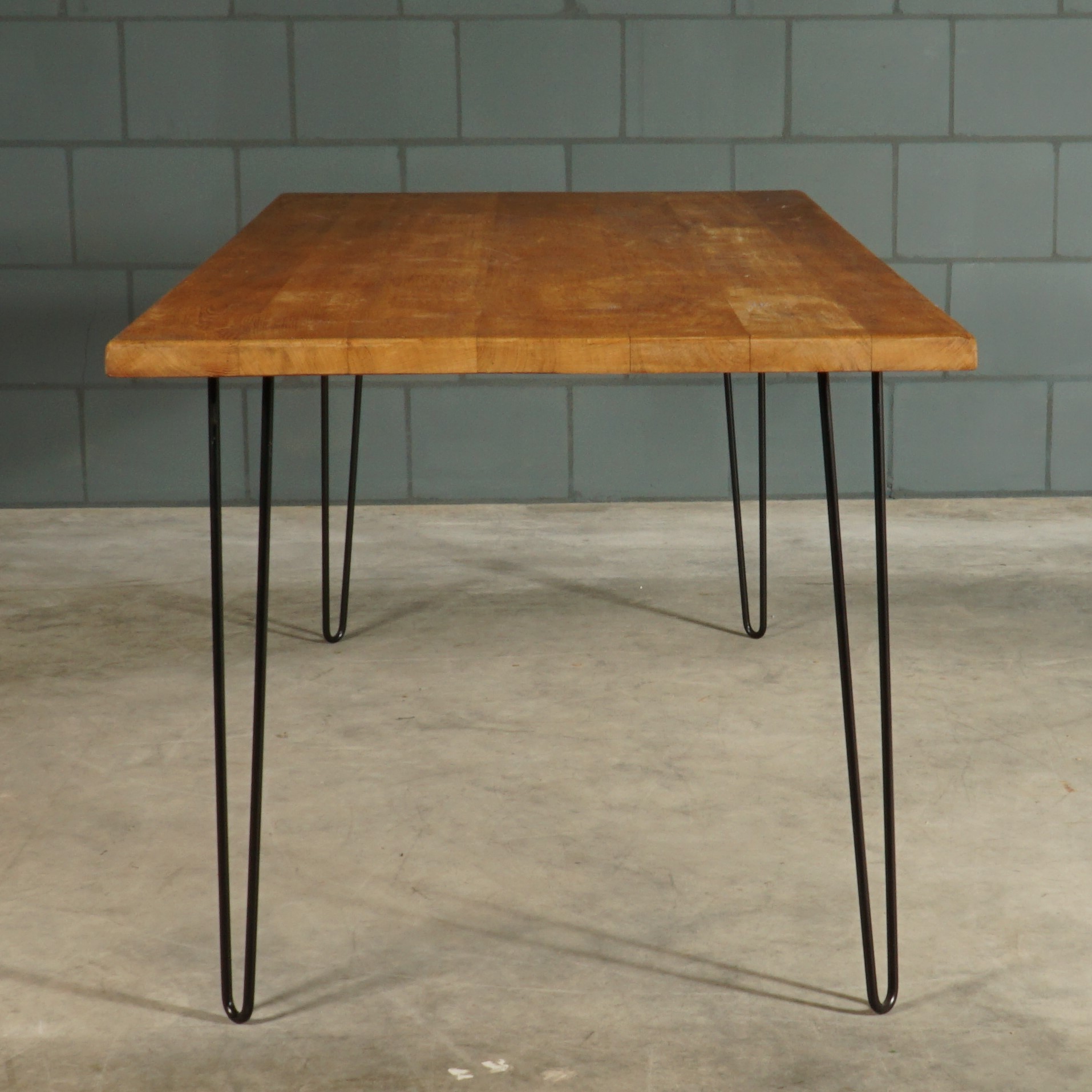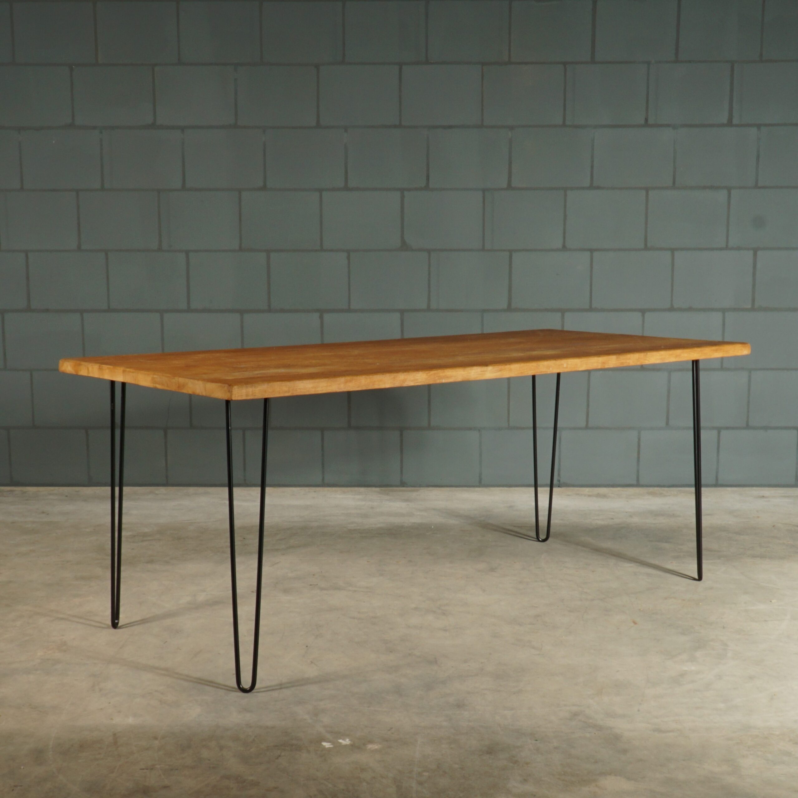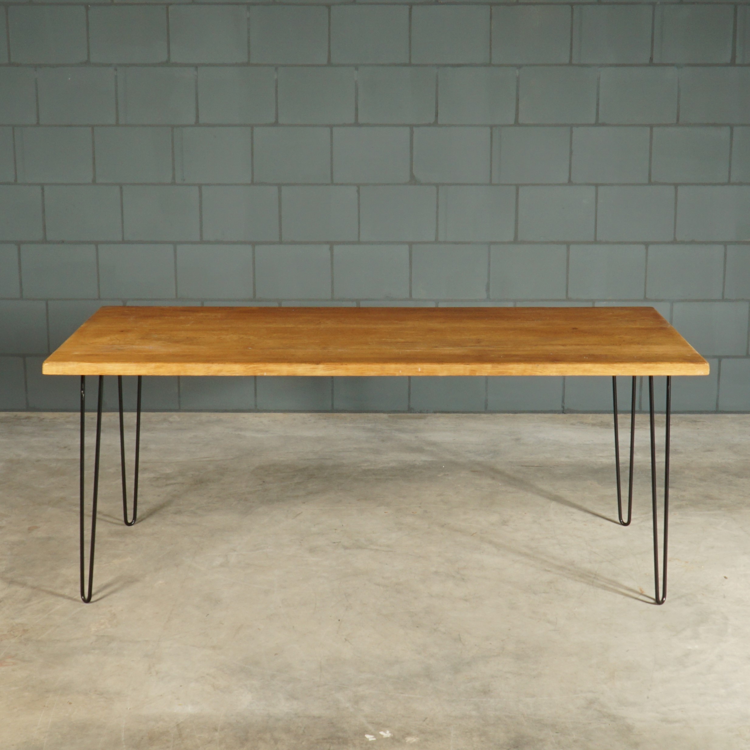 Deze fantastische eettafel is met het prachtige massief eiken blad en de opvallende hairpinpoten een echte eyecatcher in jouw eetkamer. De tafel past door de neutrale kleuren en het eenvoudige design binnen elk interieur. Er is genoeg ruimte om stoelen te combineren met deze tafel. Urenlang tafelen en gezelligheid met jouw familie en vrienden wordt met deze tafel geen enkel probleem! De tafel is in hele mooie staat.