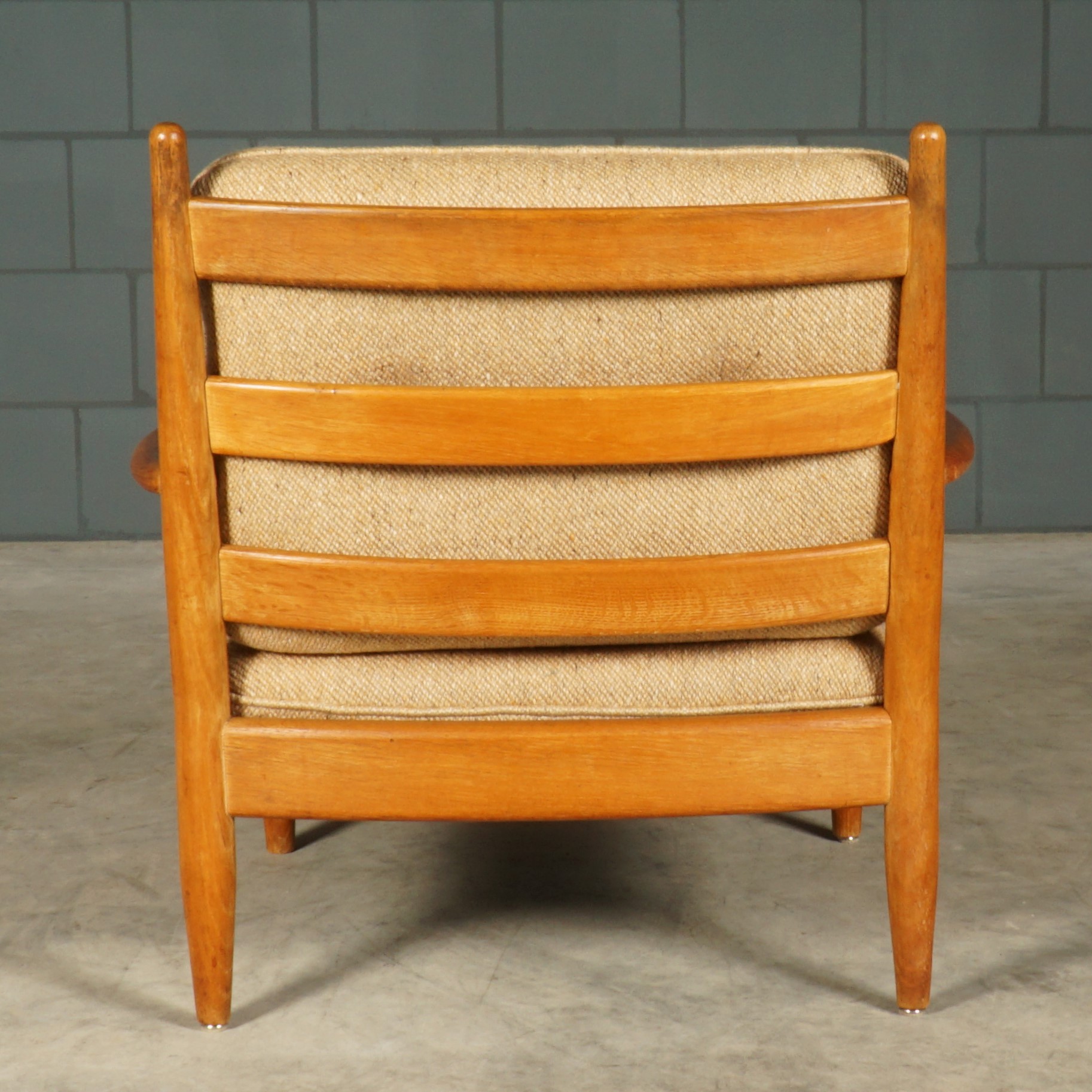 Deze prachtige Scandinavische fauteuil dateert uit de jaren 60. De ontwerper of fabrikant zijn helaas onbekend, maar het kan niet anders dan dat er een goede ontwerper achter zit! Wat een design en wat een kwaliteit! De fauteuil heeft een zeer elegante uitstraling waarbij het frame is gemaakt van massief eiken en de kussens zijn bekleed met een mooie kwalitateit geweven stof in een beige-bruin tint. De armleuningen hebben een heel bijzondere kromming. De fauteuil biedt een zeer prettig zitcomfort. Een ware eye-catcher voor zowel in een modern als in een vintage interieur. De fauteuil is in zeer mooie vintage staat. Zowel het hout als de kussens hebben weinig gebruikssporen.